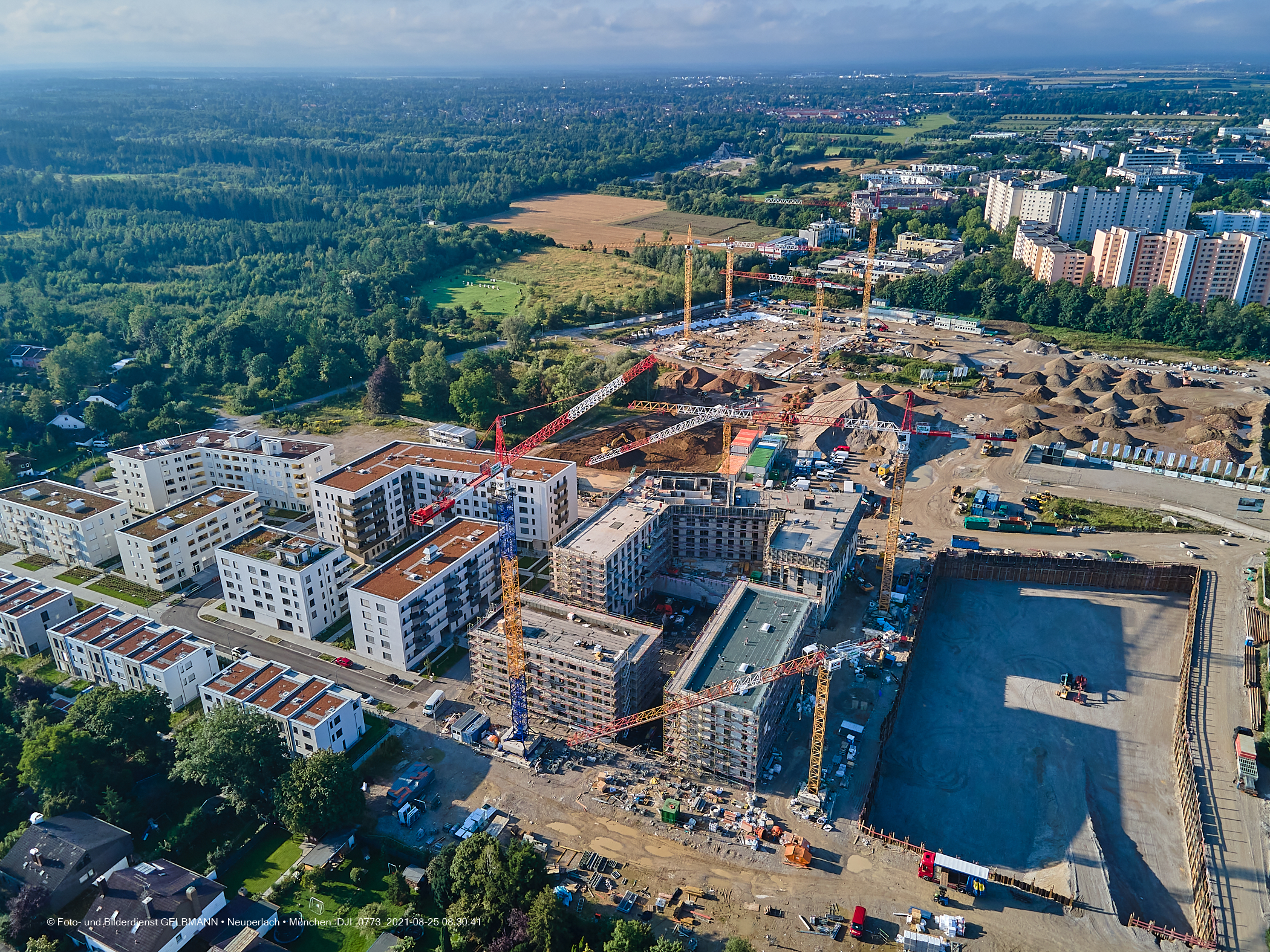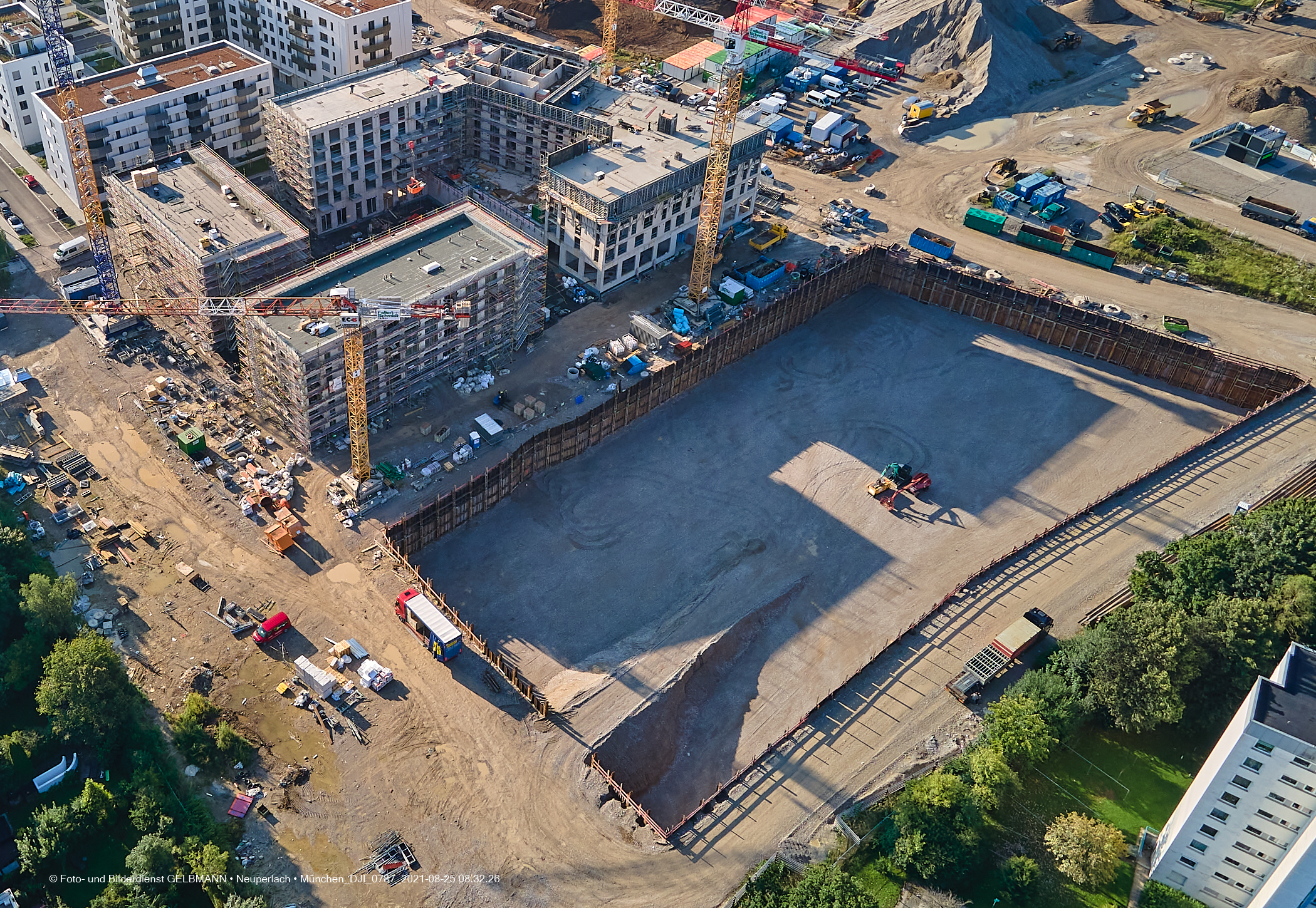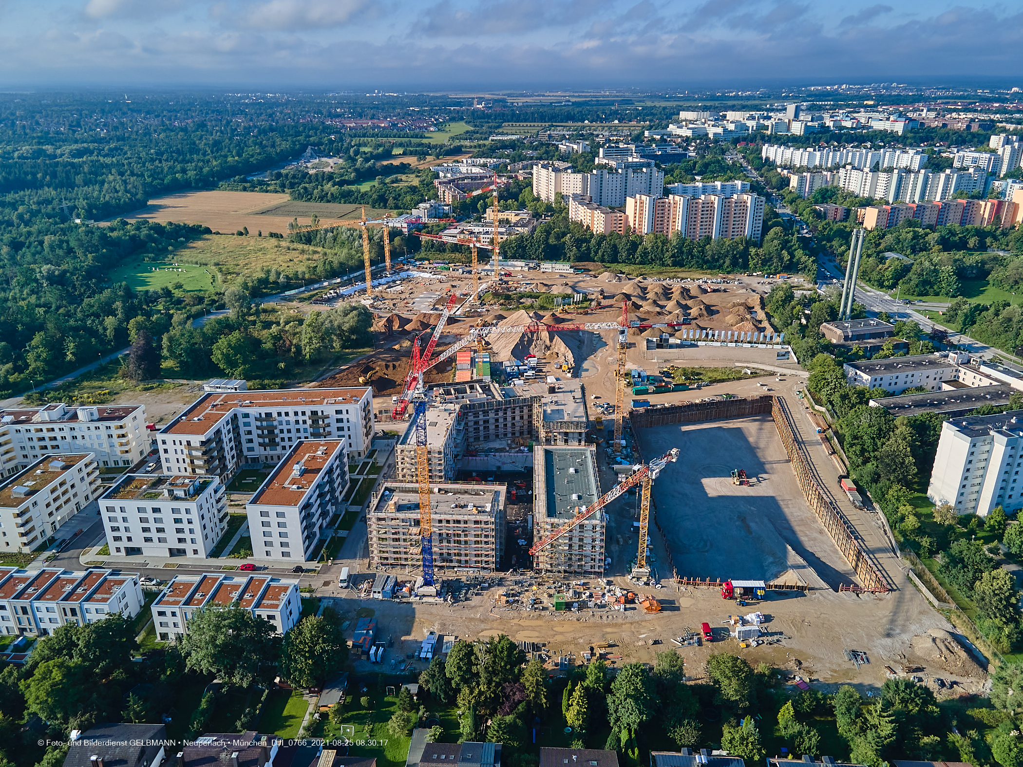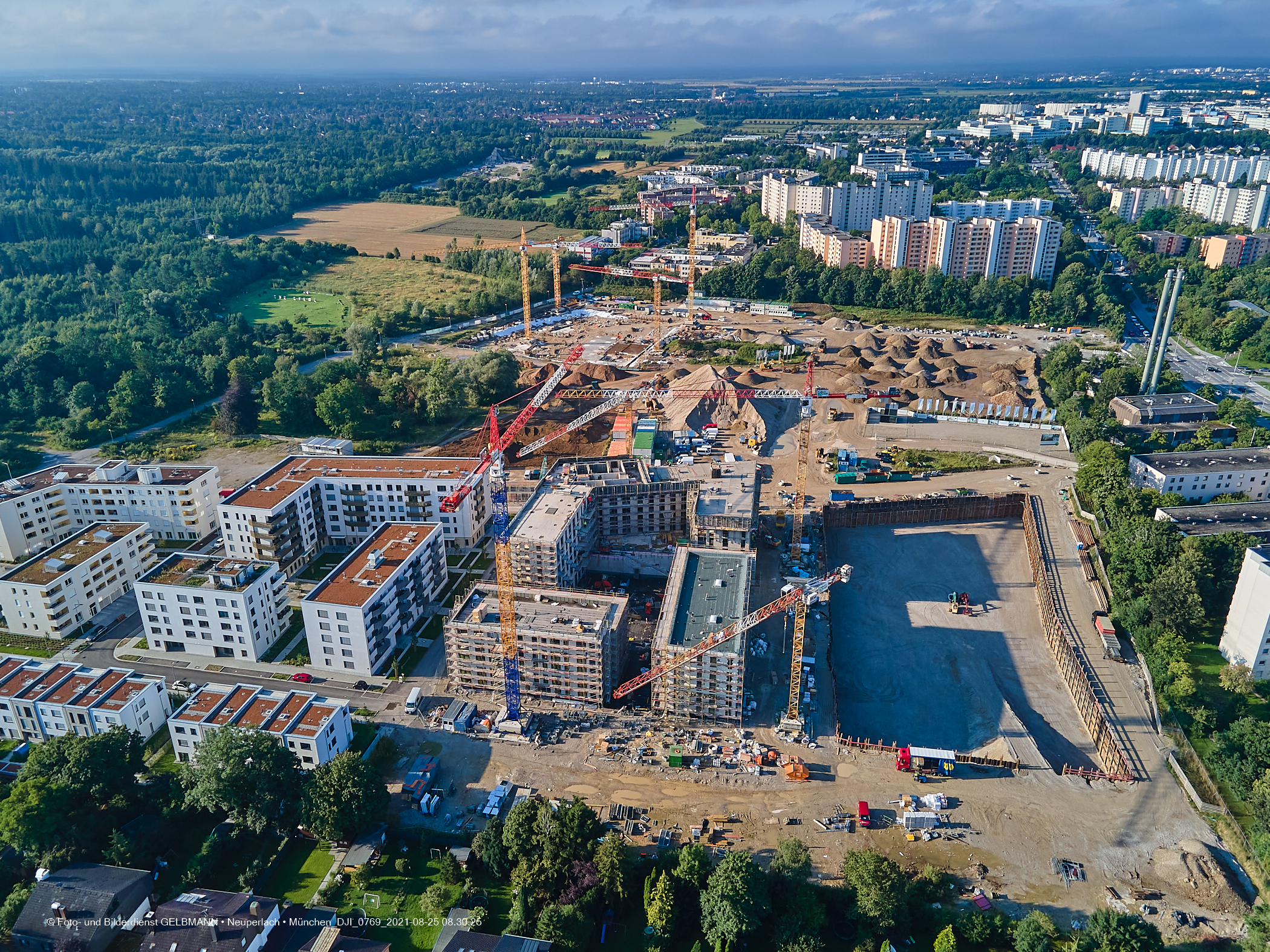 Die DEMOS-Baustelle und BayernHeim-Baustelle Alexisquartier in Neuperlach. Wie auf der Homepage des Bauträgers DEMOS zu lesen ist, wurden in den beiden Bauabschnitten „Häuser“ und „Wohnen am Truderinger Wald“ die Rohbauarbeiten fertiggestellt! Aus diesem Grund wurde am 27.08.2020, der größte Kran auf der Baustelle, abgebaut. Einige Fotoimpressionen vom heutigen Tag und eine yellow-fly.de Luftfoto, zeigen den aktuellen Stand der Neuperlacher Baustelle Alexisquartier.