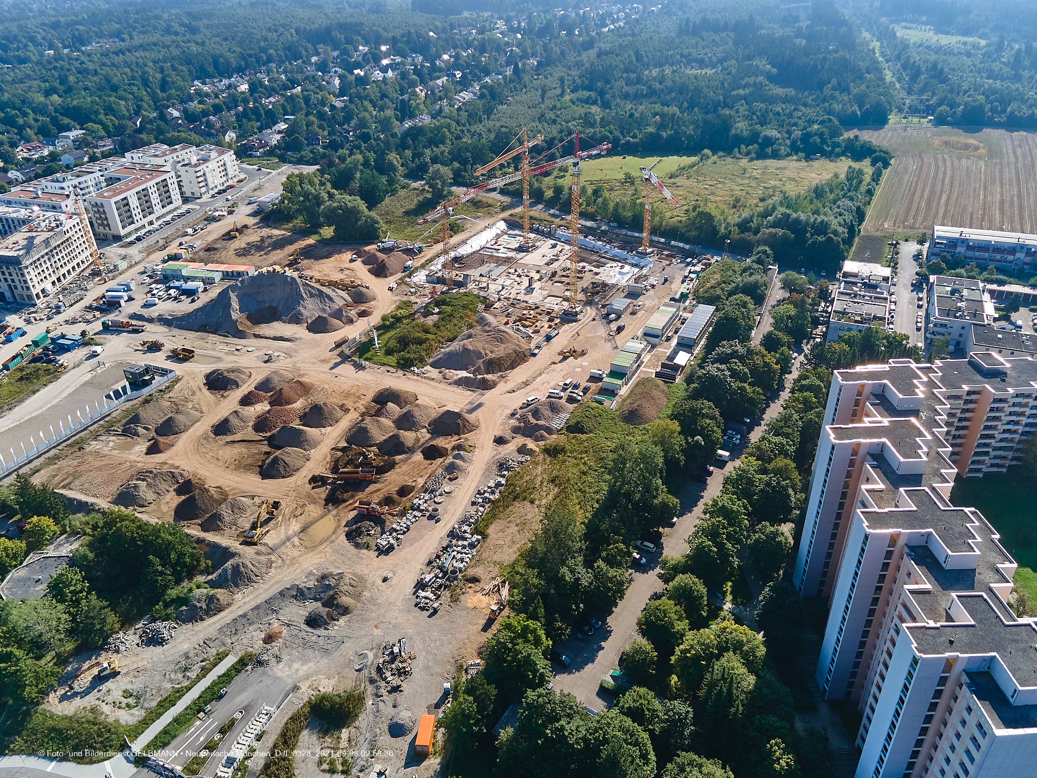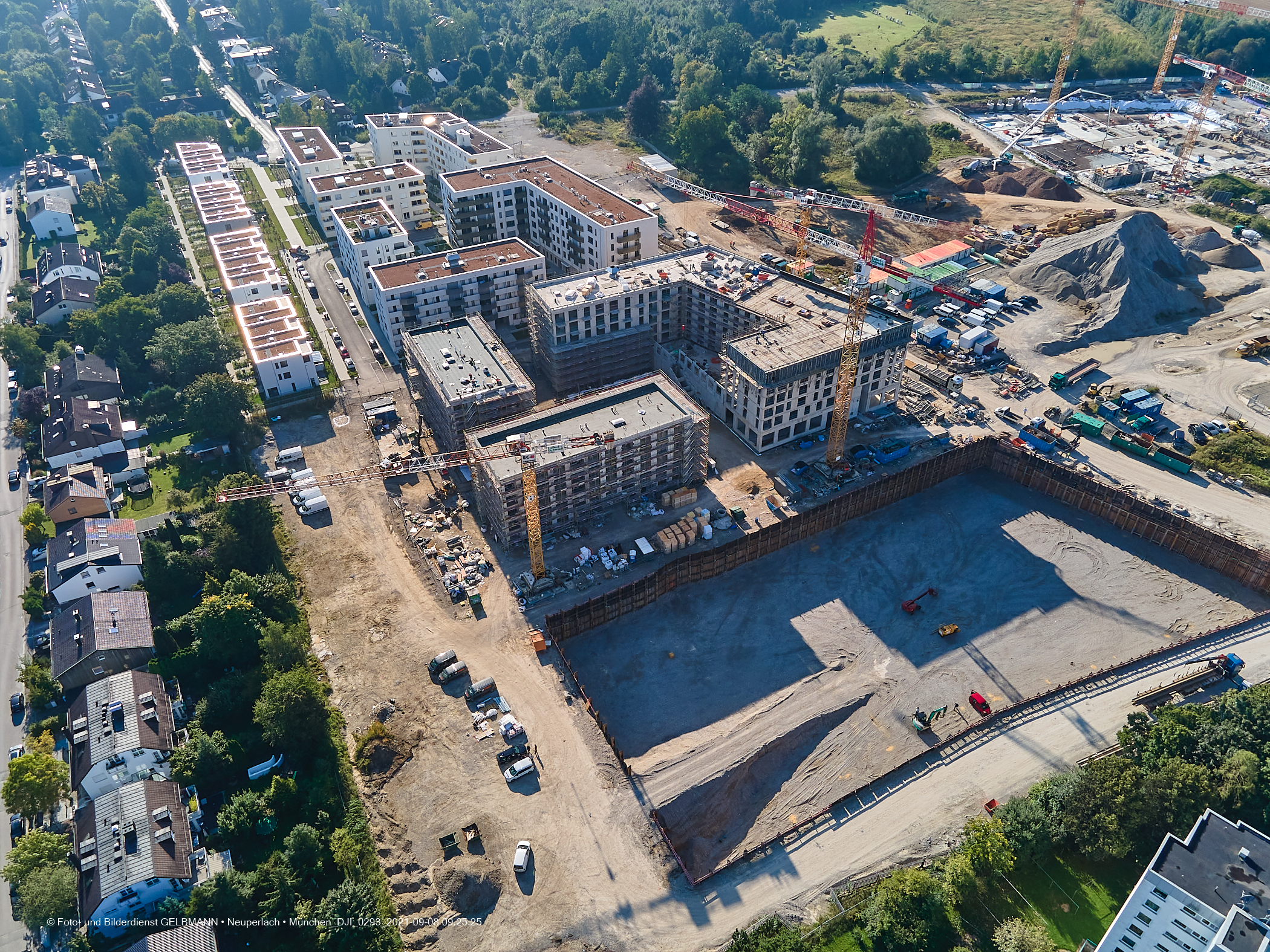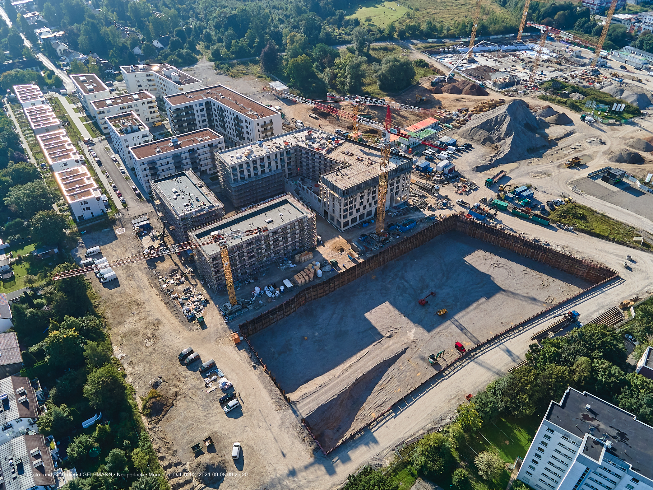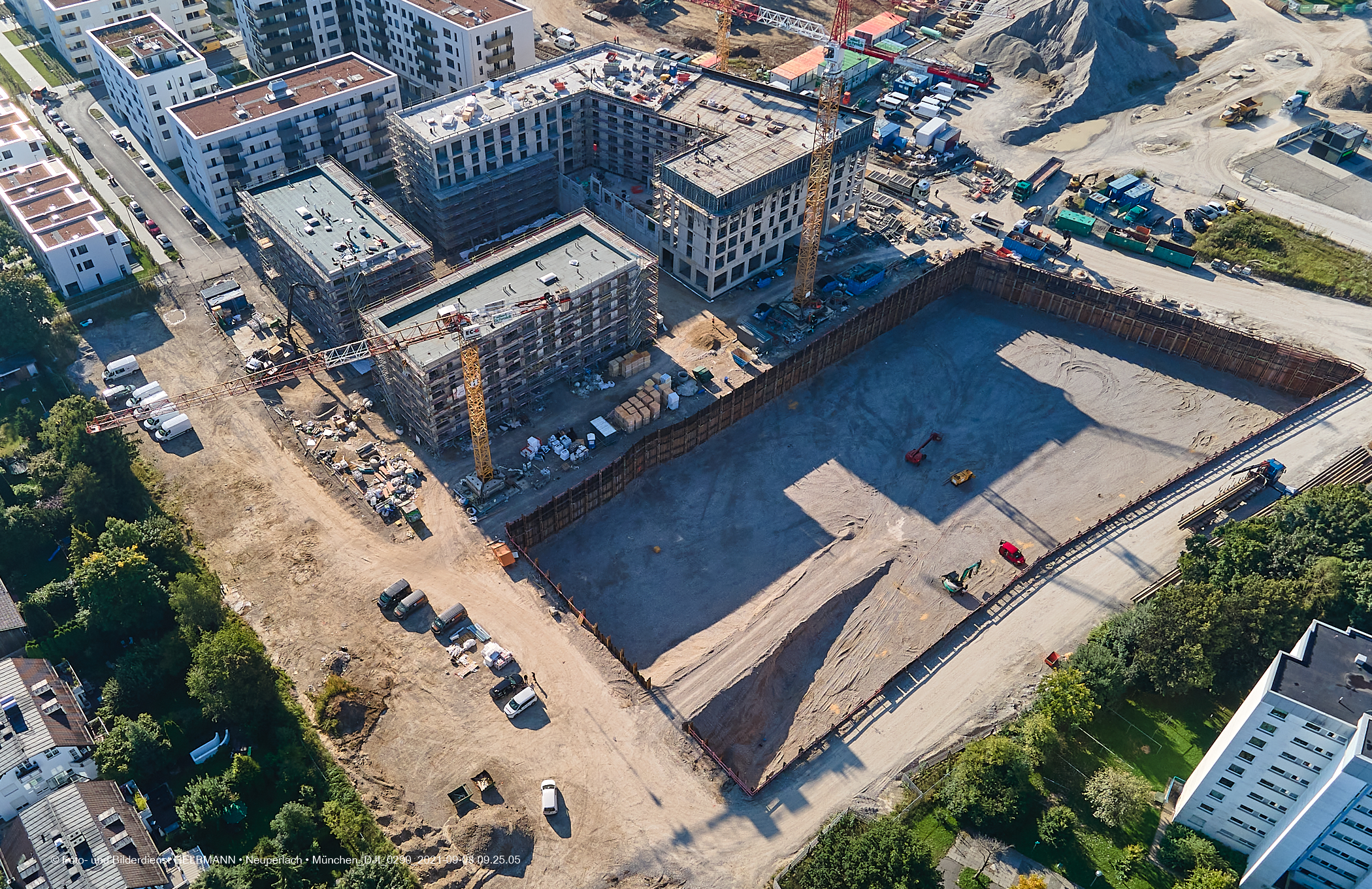 Die DEMOS-Baustelle und BayernHeim-Baustelle Alexisquartier in Neuperlach. Die Baugrube zur Wohneinheit „Das Duett” wartet auf den Startschuss, um die Bodenplatte zu gießen. Weitere Dacharbeiten finden am Block „Wohnen an der Allee” statt. Die Rohbauten sind fast abgeschlossen.