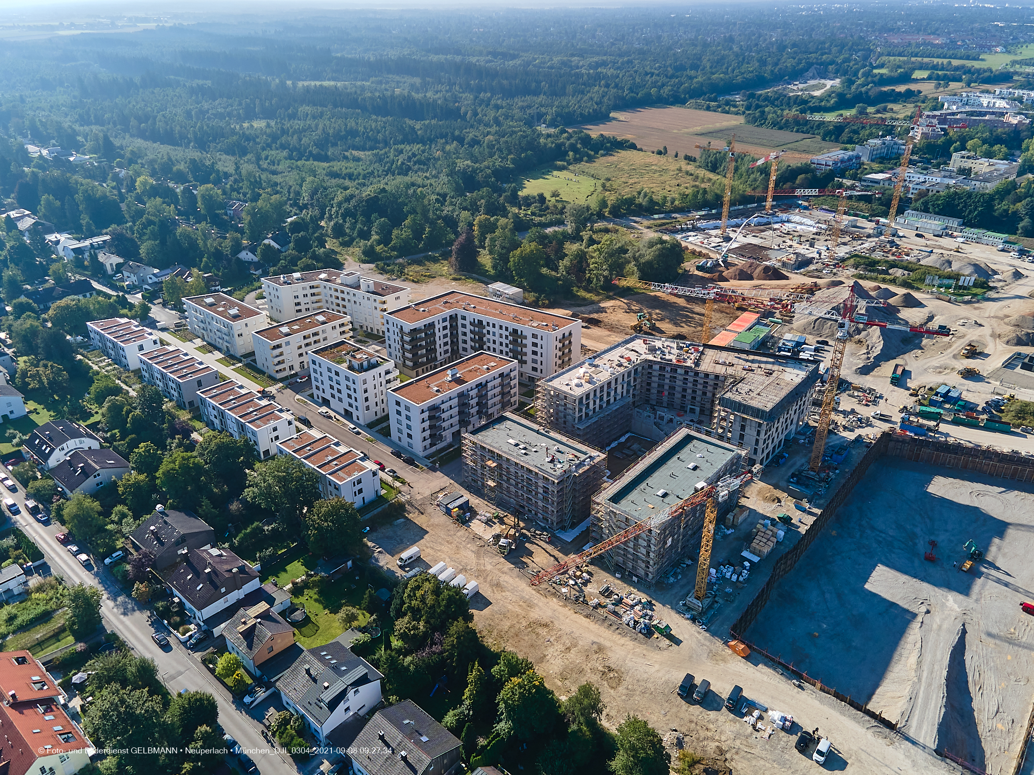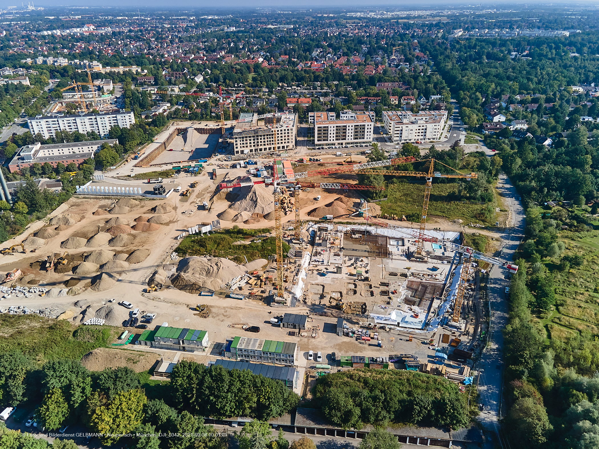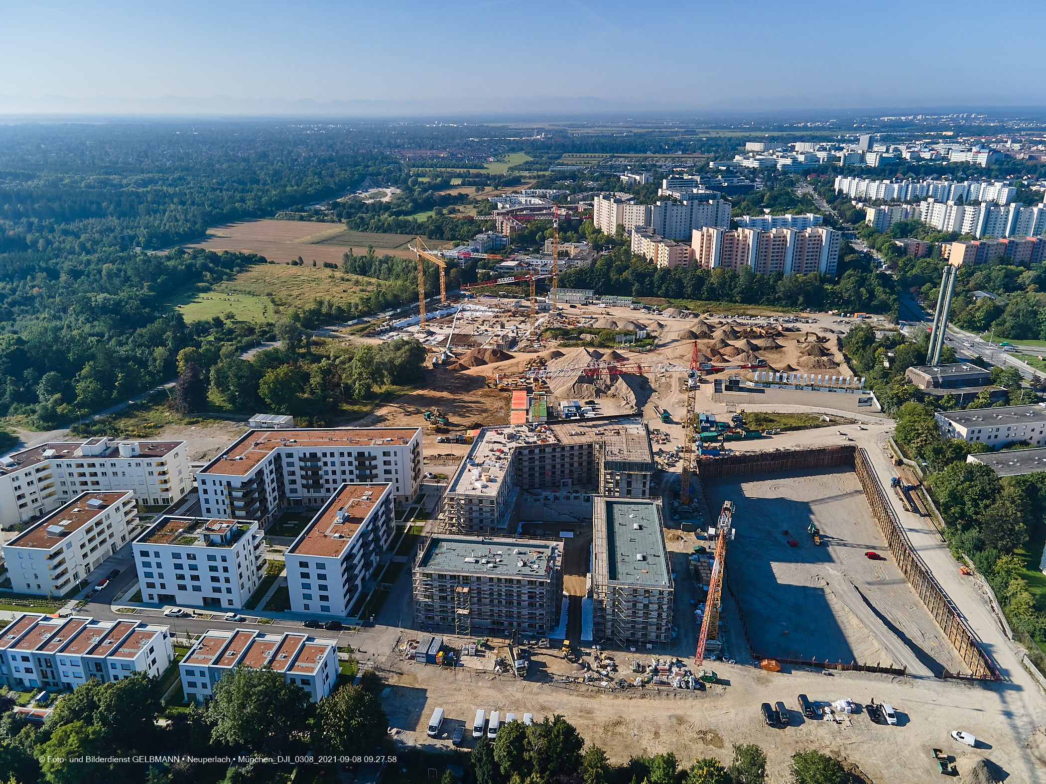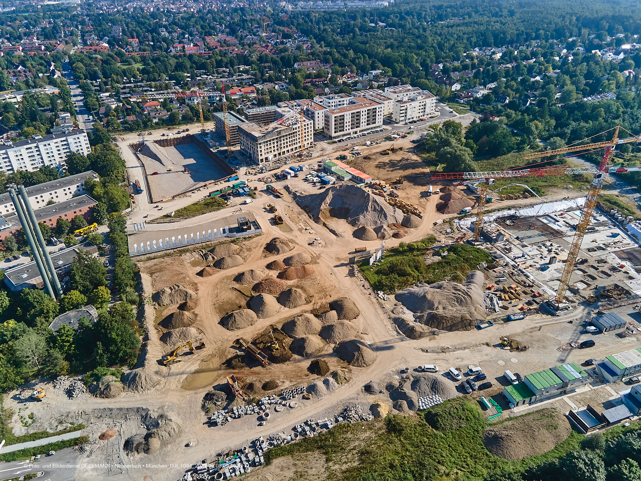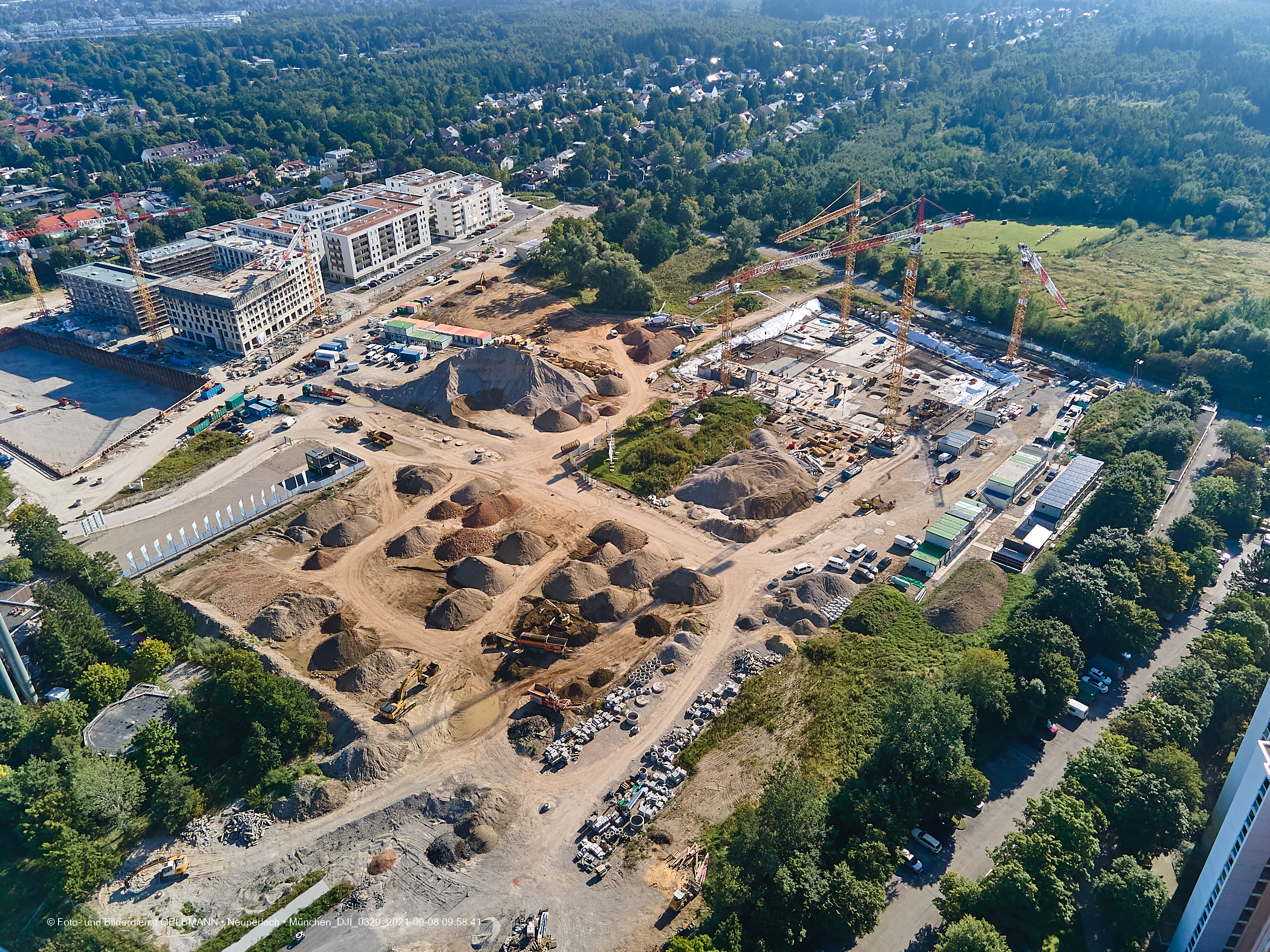 Die DEMOS-Baustelle und BayernHeim-Baustelle Alexisquartier in Neuperlach. Die Baugrube zur Wohneinheit „Das Duett” wartet auf den Startschuss, um die Bodenplatte zu gießen. Weitere Dacharbeiten finden am Block „Wohnen an der Allee” statt. Die Rohbauten sind fast abgeschlossen.