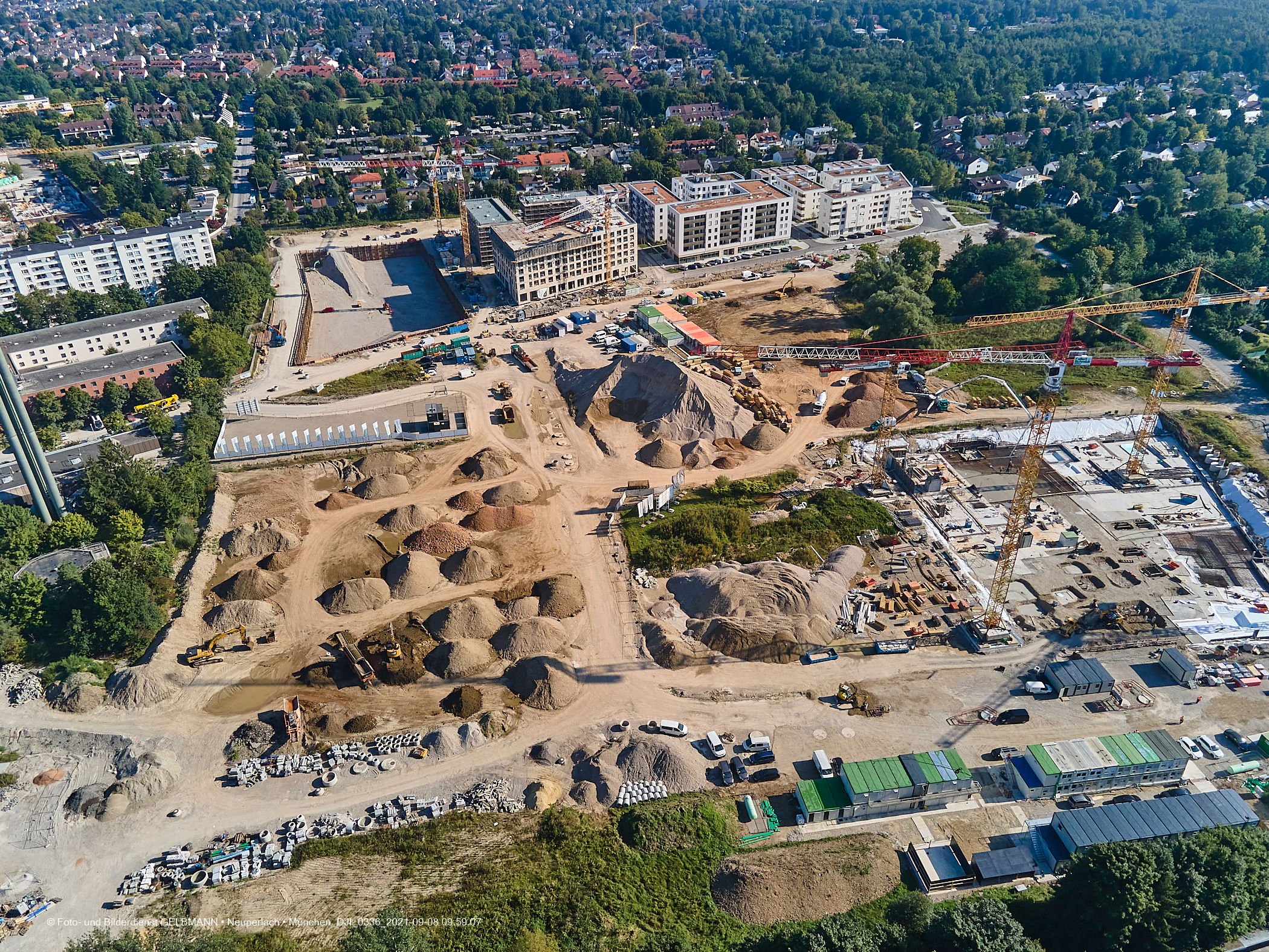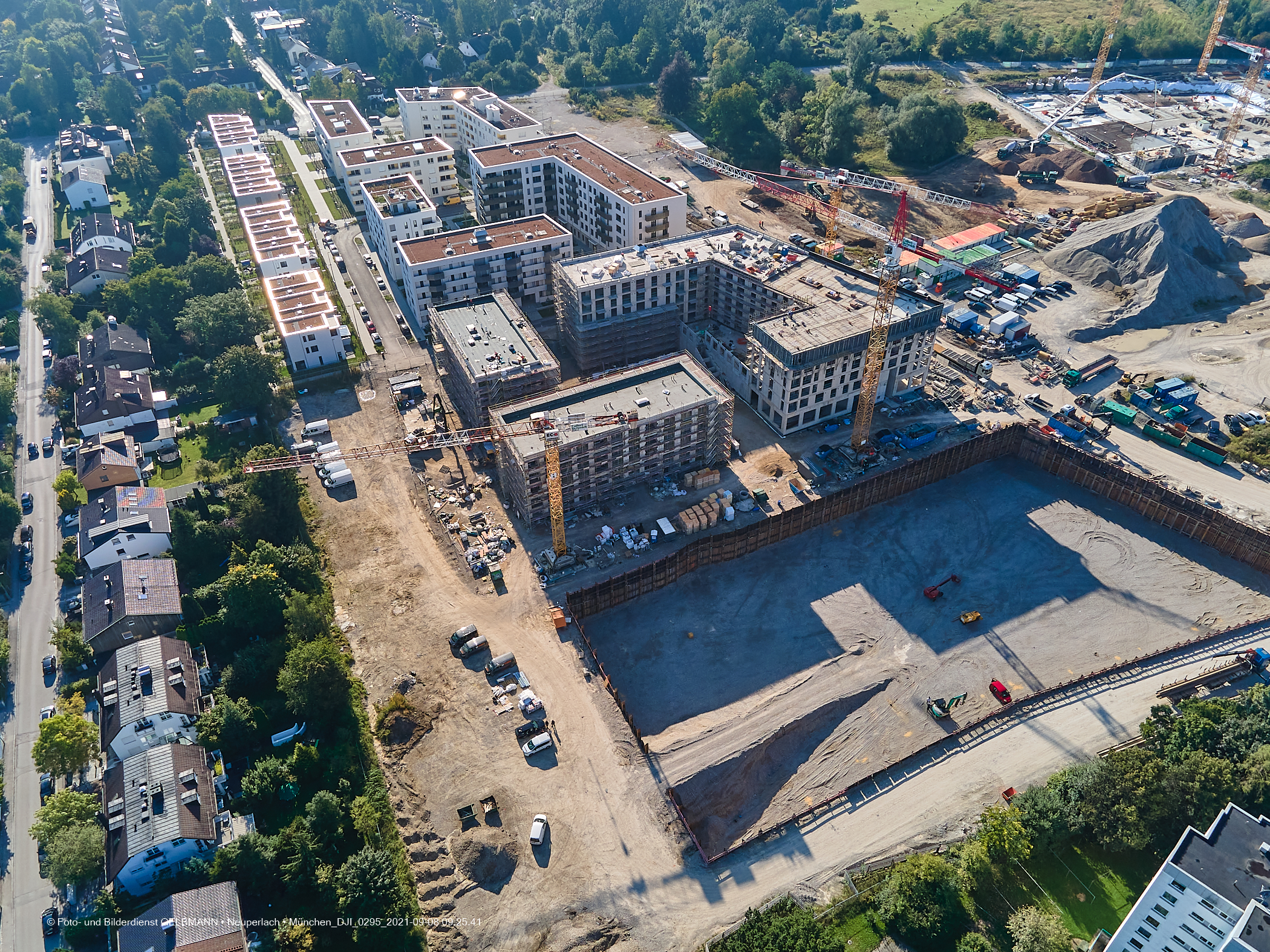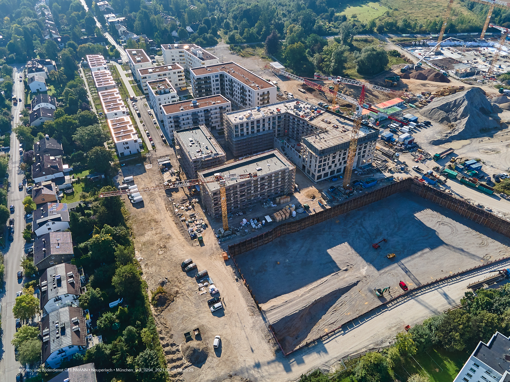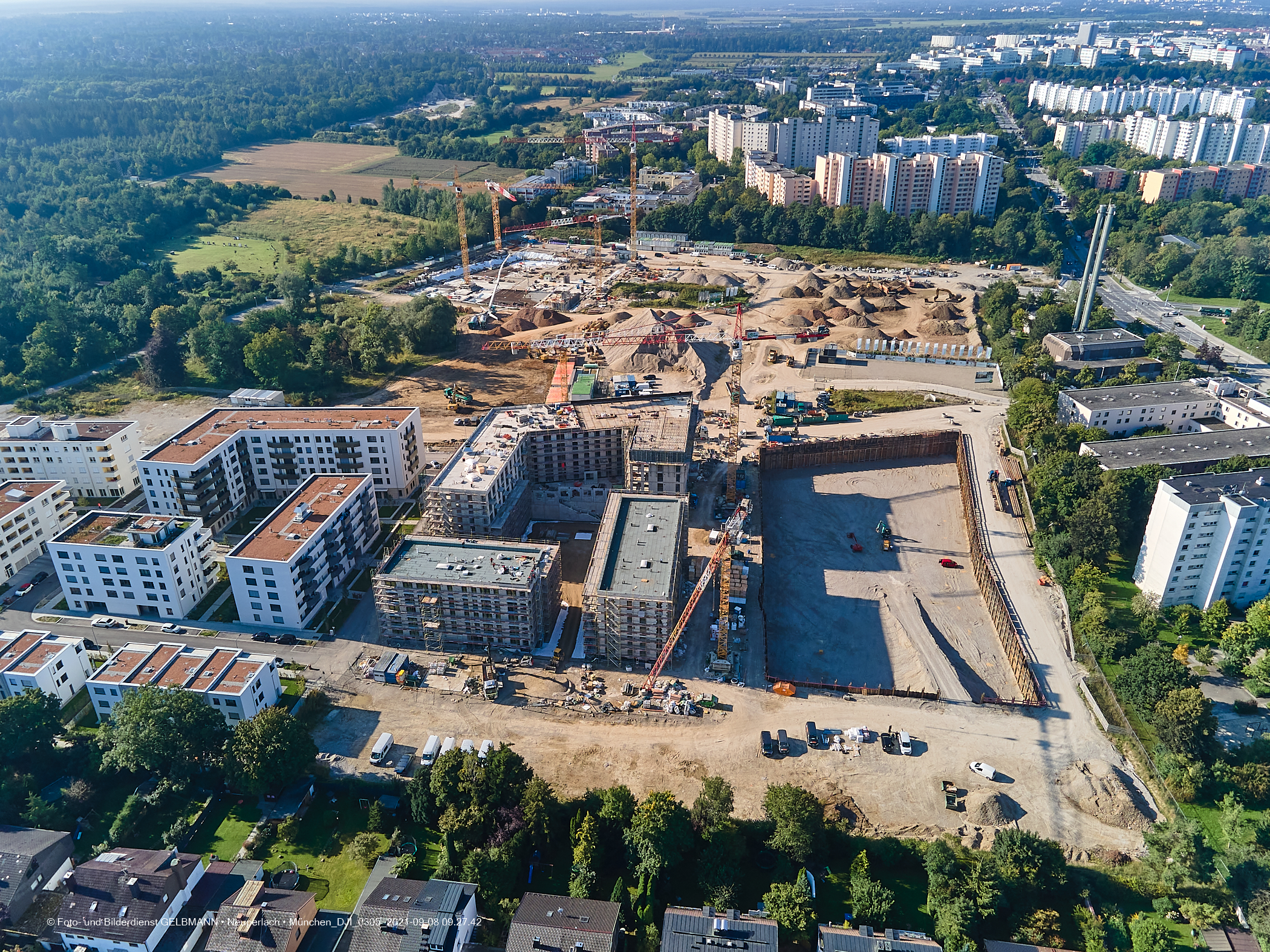 Die DEMOS-Baustelle und BayernHeim-Baustelle Alexisquartier in Neuperlach. Die Baugrube zur Wohneinheit „Das Duett” wartet auf den Startschuss, um die Bodenplatte zu gießen. Weitere Dacharbeiten finden am Block „Wohnen an der Allee” statt. Die Rohbauten sind fast abgeschlossen.