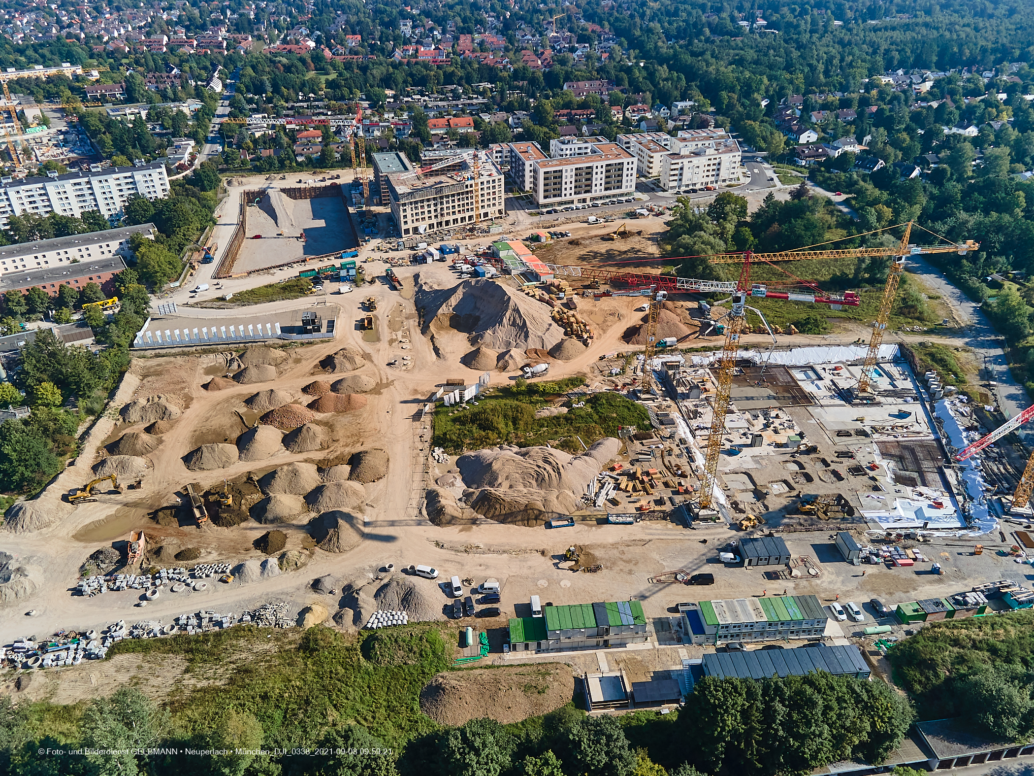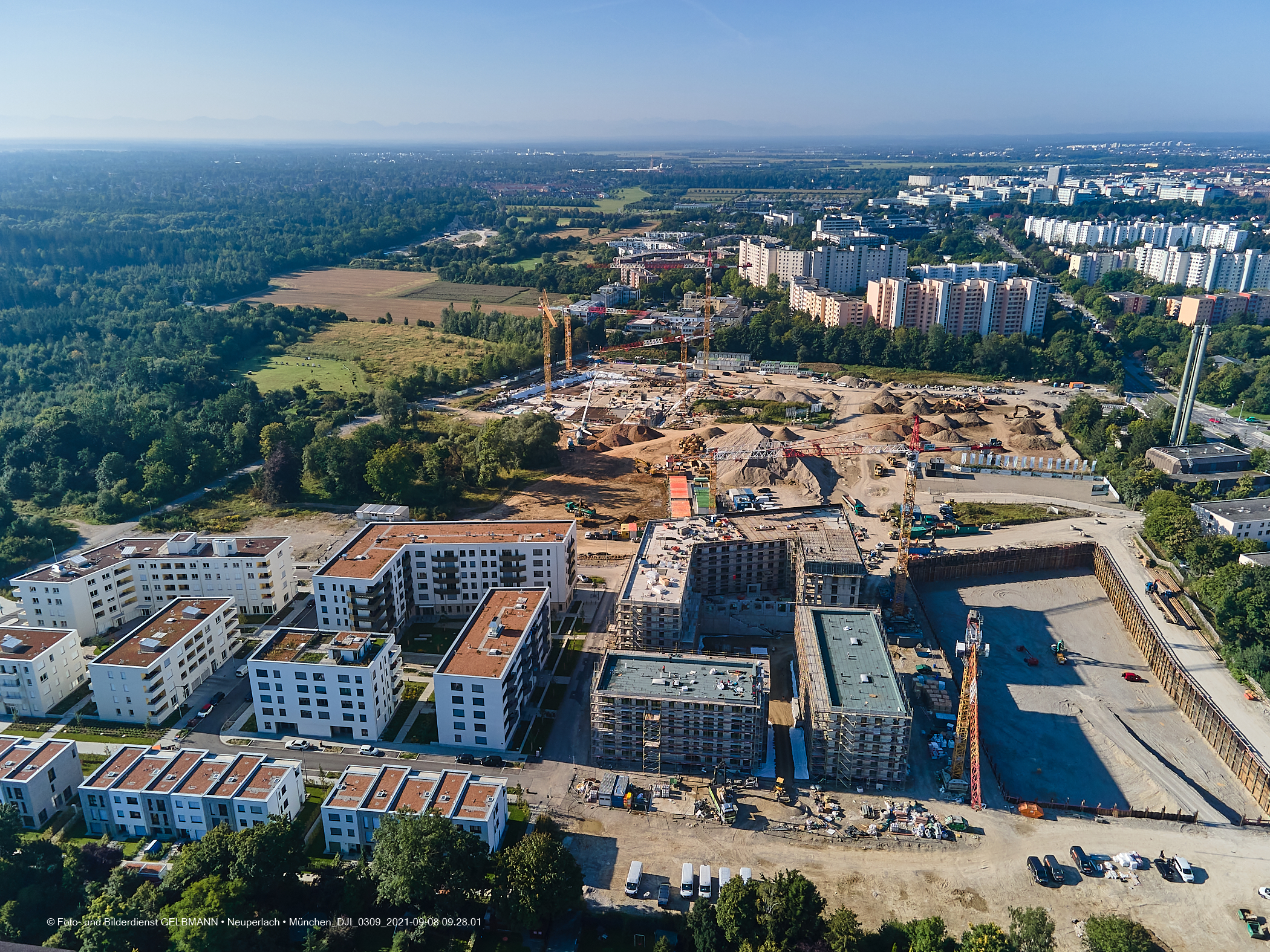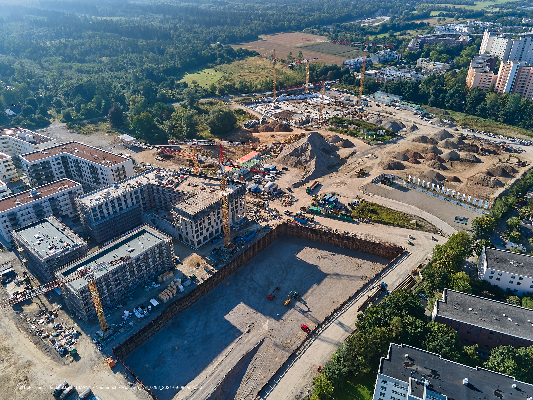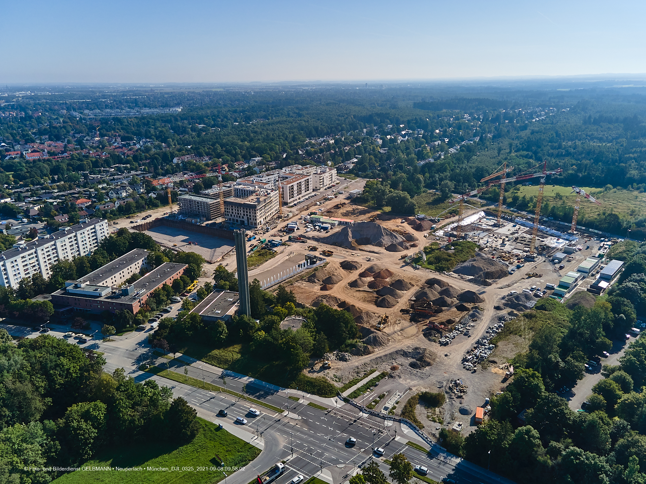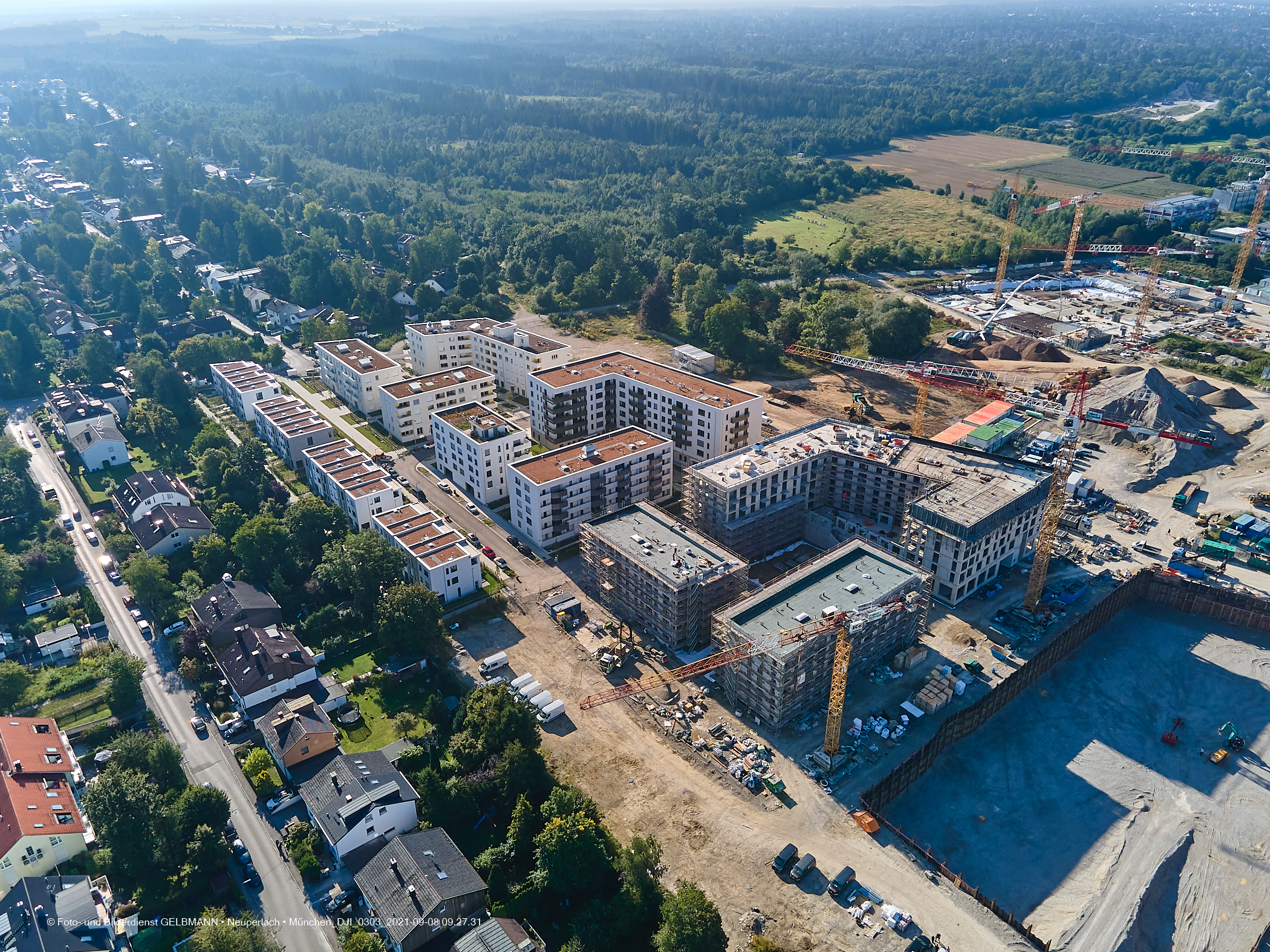 Die DEMOS-Baustelle und BayernHeim-Baustelle Alexisquartier in Neuperlach. Die Baugrube zur Wohneinheit „Das Duett” wartet auf den Startschuss, um die Bodenplatte zu gießen. Weitere Dacharbeiten finden am Block „Wohnen an der Allee” statt. Die Rohbauten sind fast abgeschlossen.