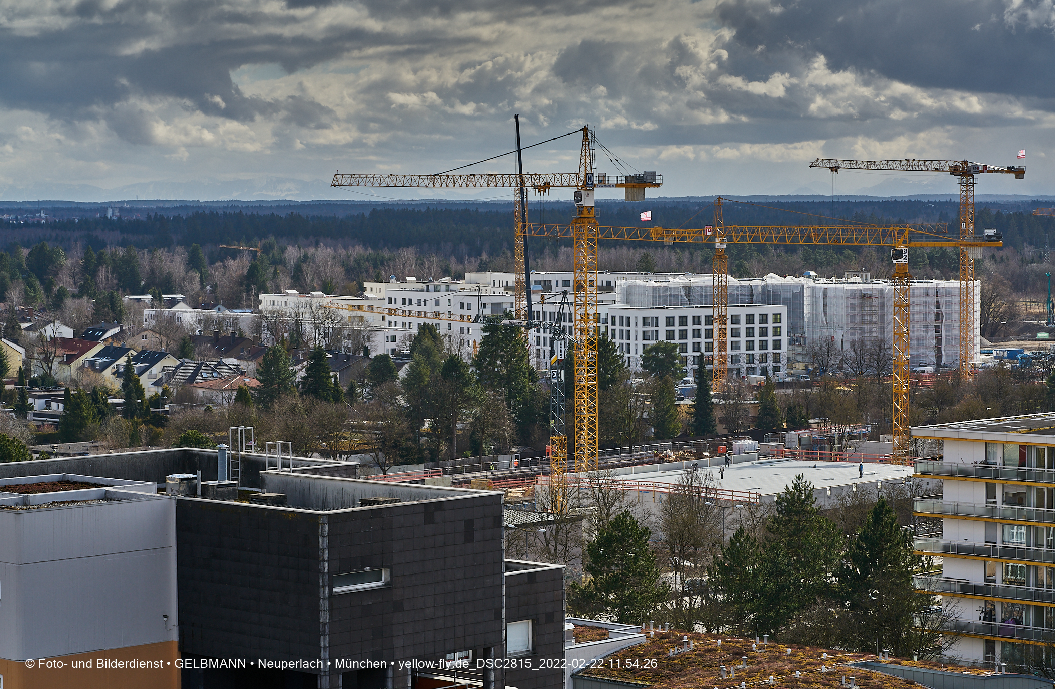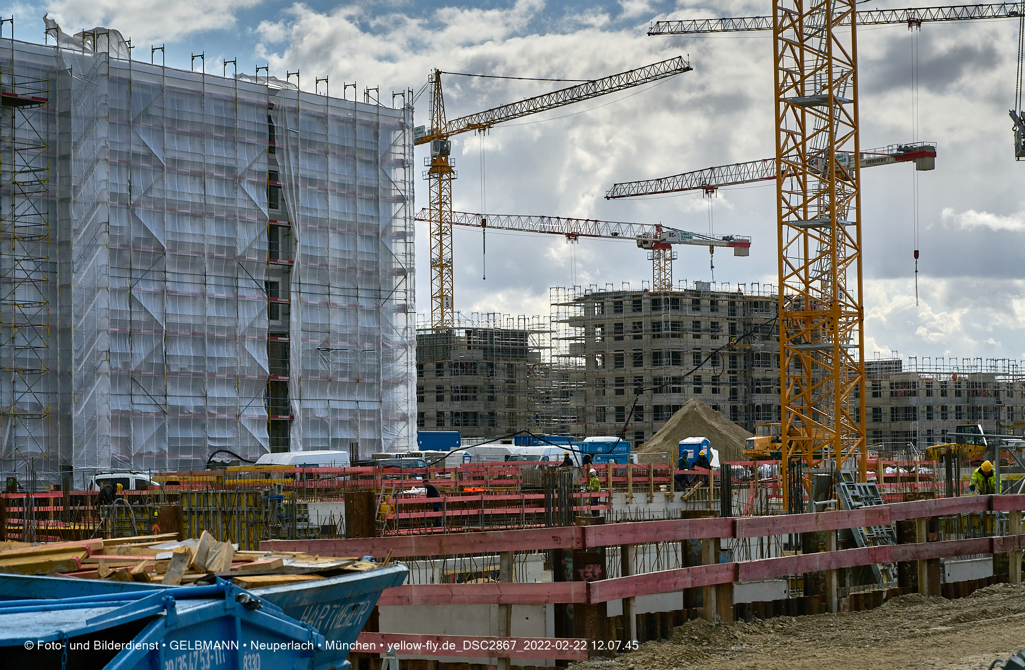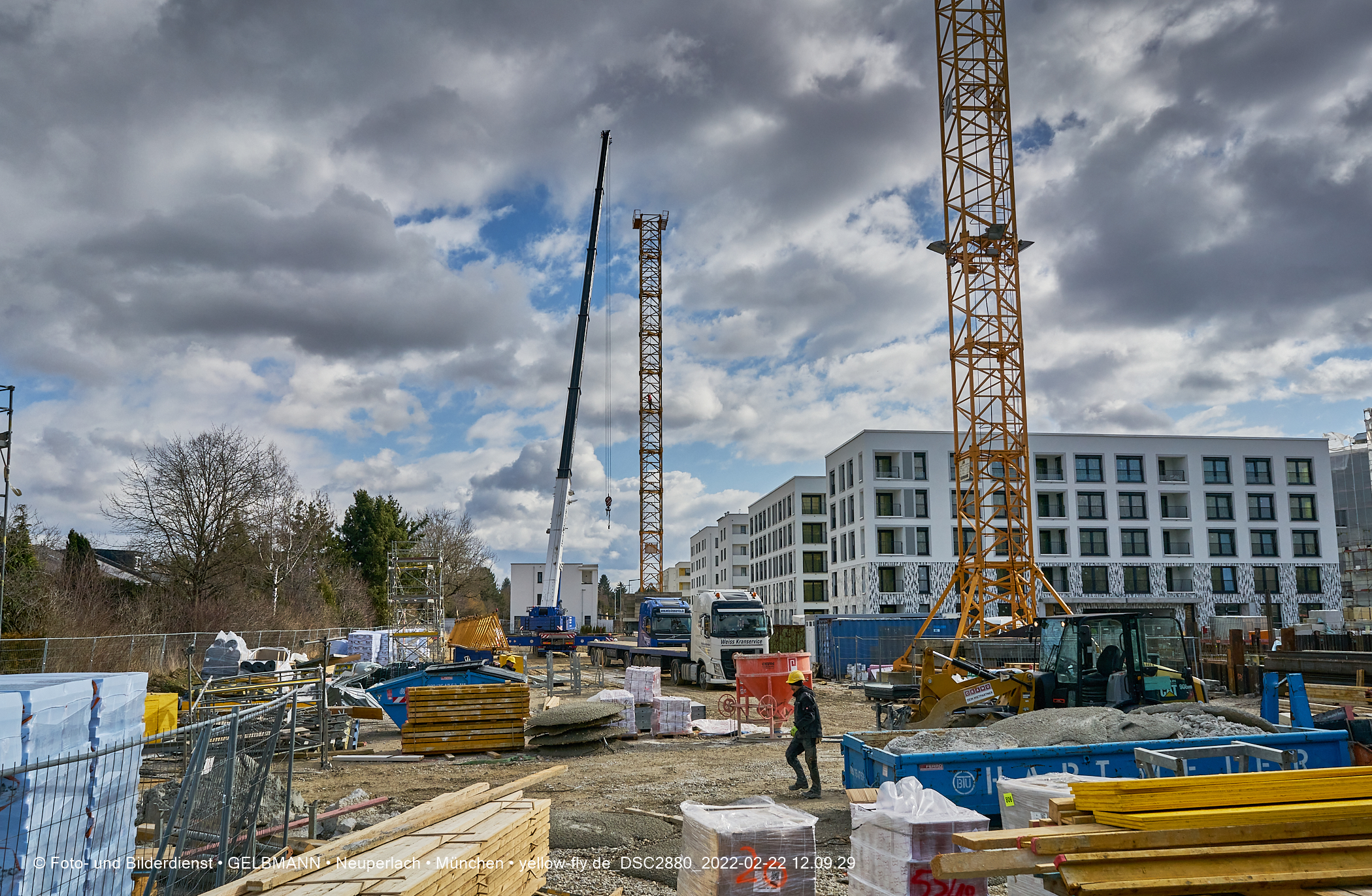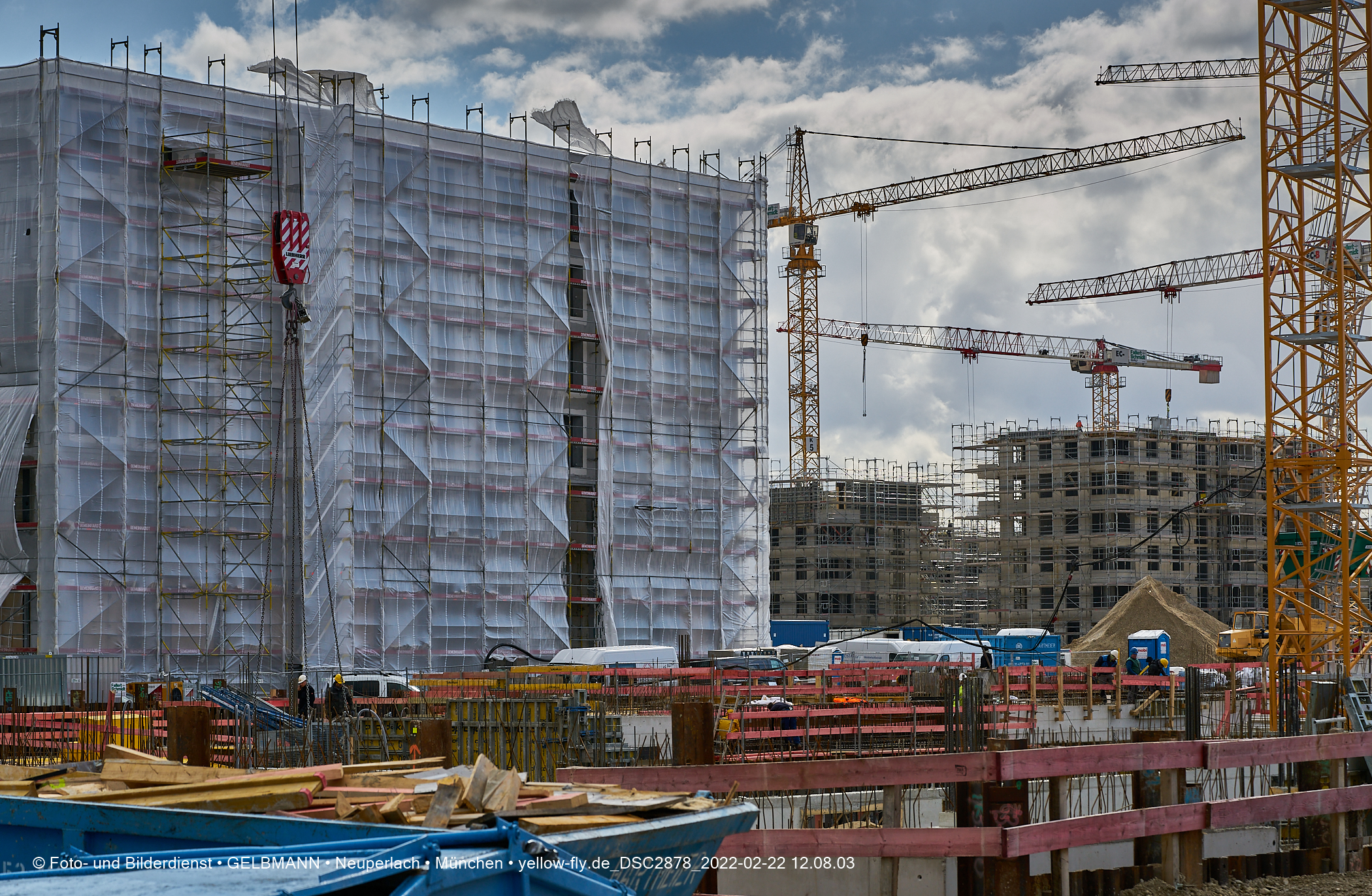 Im Vordergrund sieht man die schon weit fortgeschrittene DEMOS-Baustelle und BayernHeim-Baustelle Alexisquartier mit der Baugrube „Das Duett“.