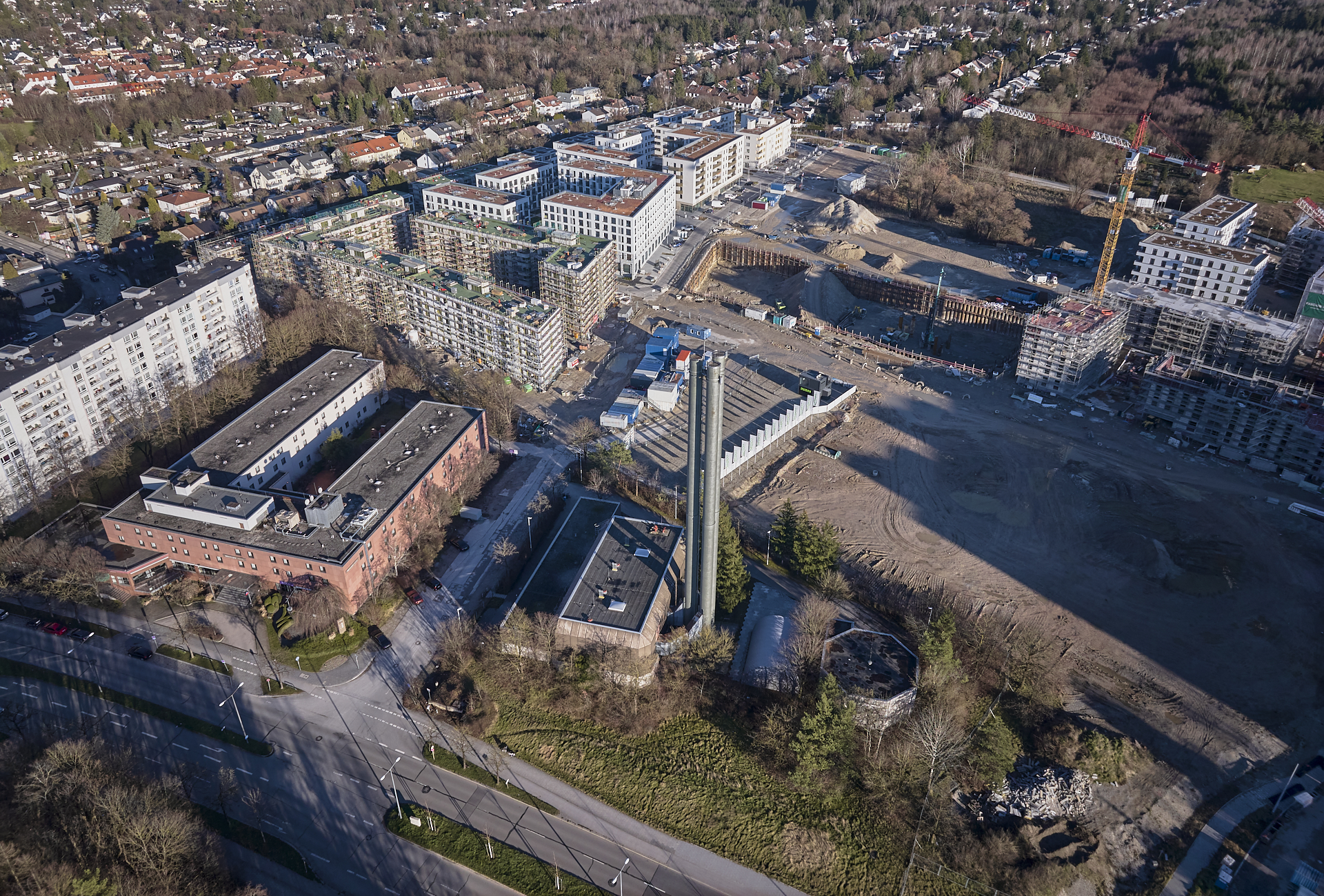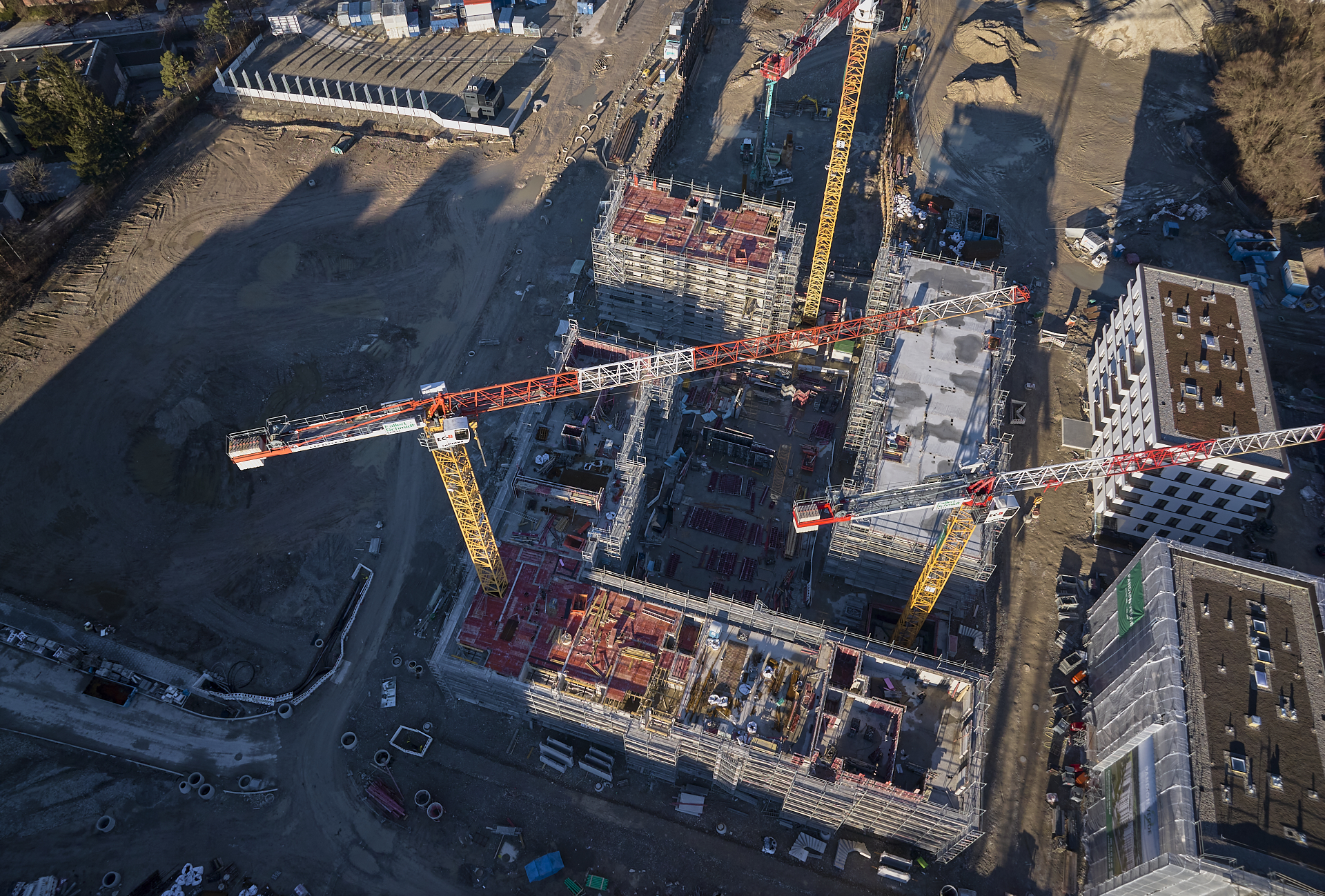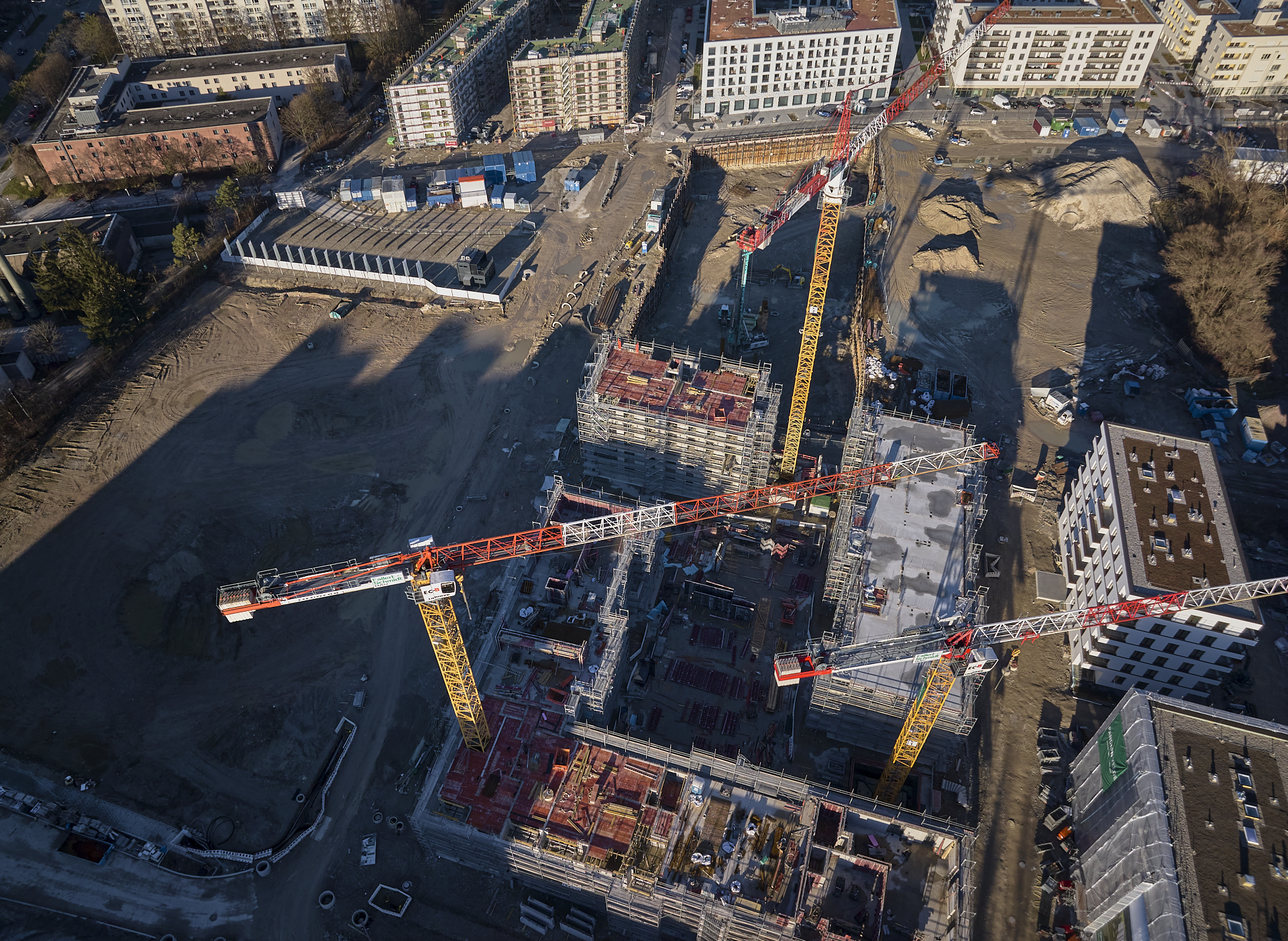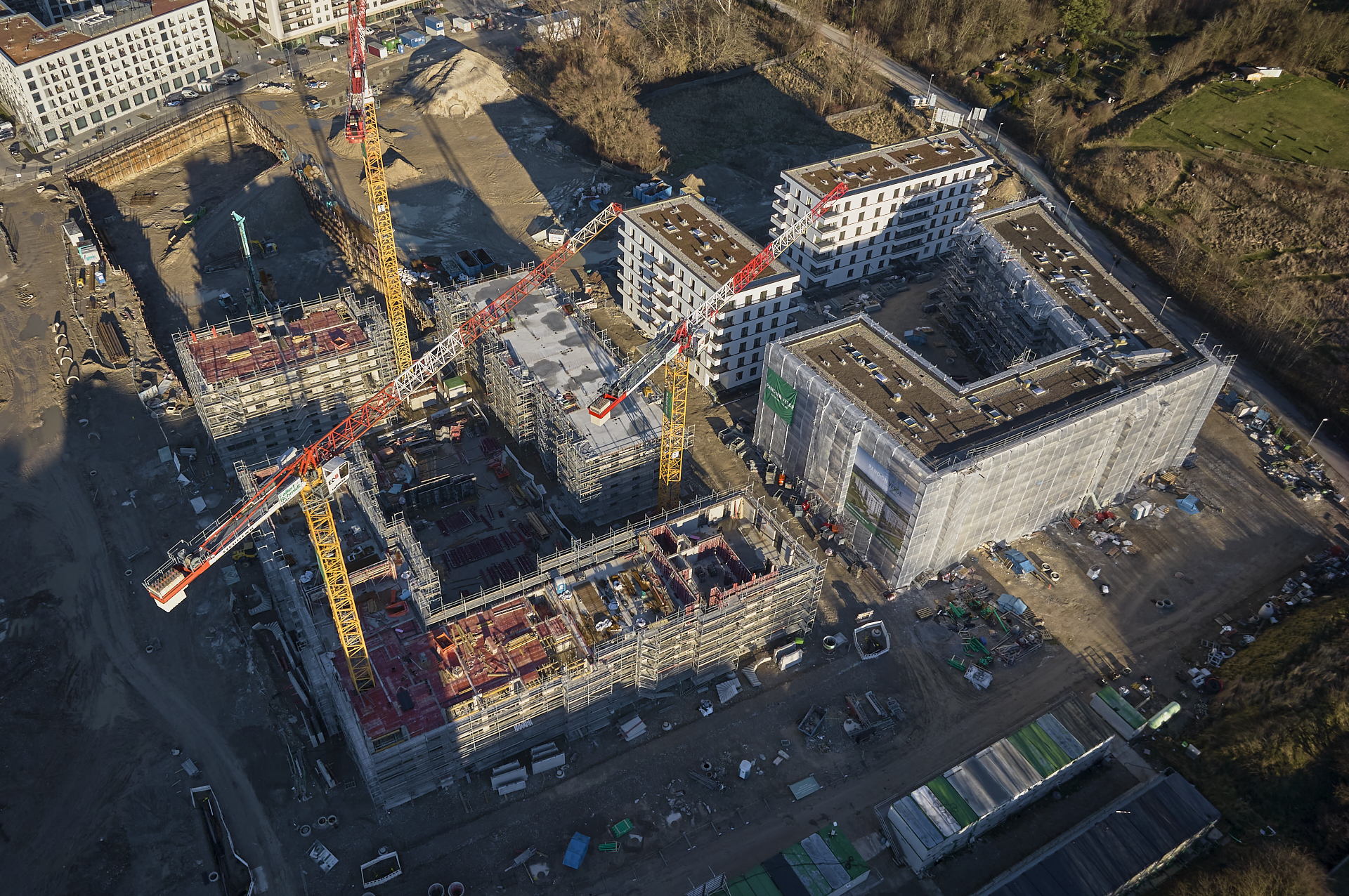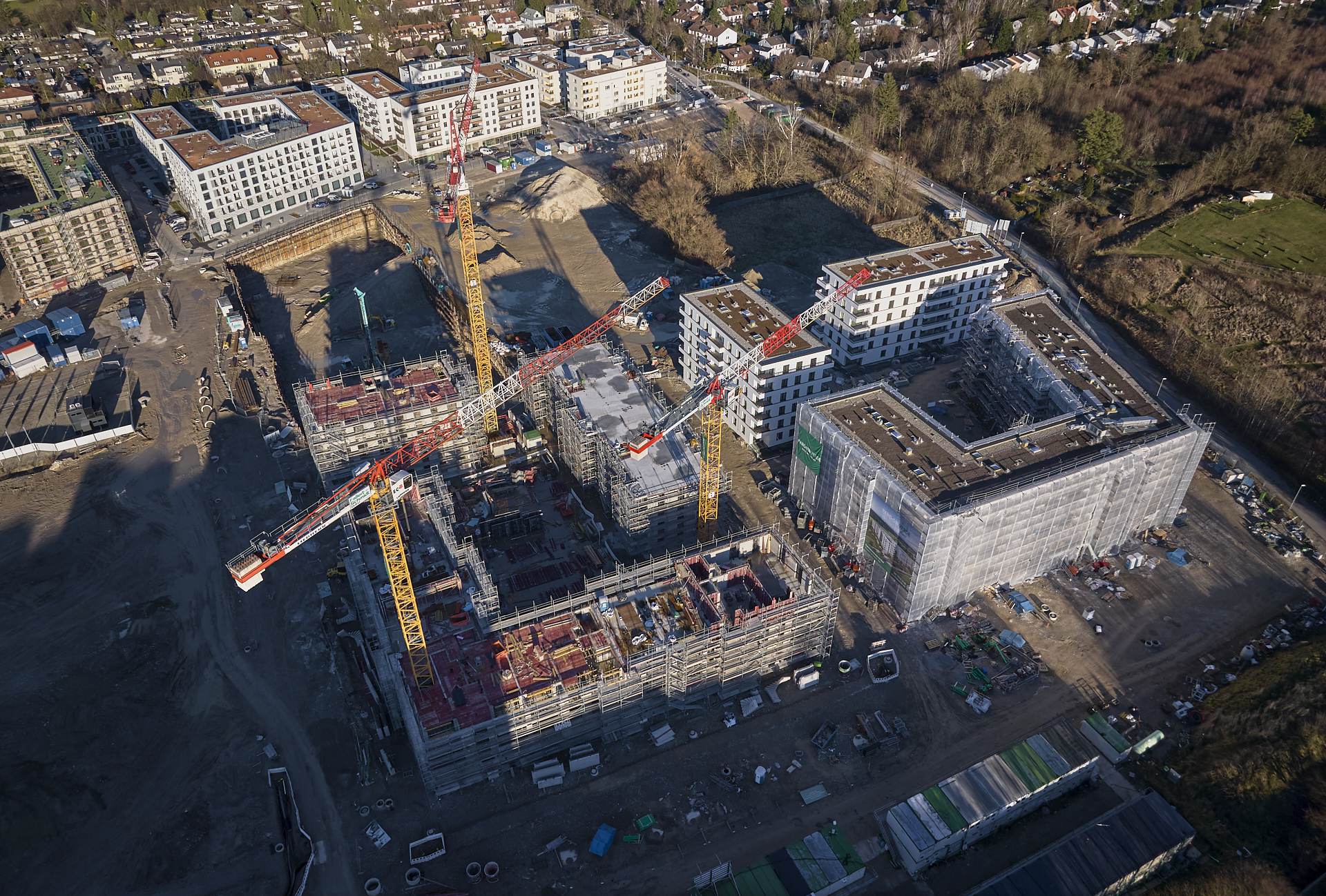 Ein weiterer Meilenstein ist erreicht. Wie man sehen kann, sind alle Bauten im Rohbau fertig. In der Baugrube zum Hochhaus “ParkSide”, wird noch gearbeitet.