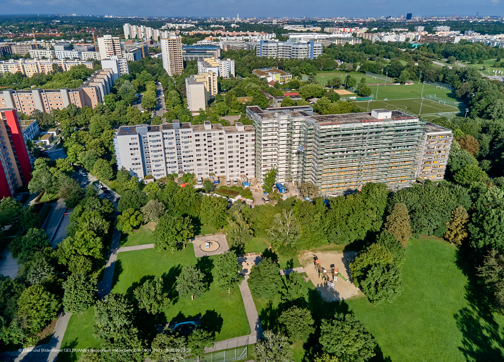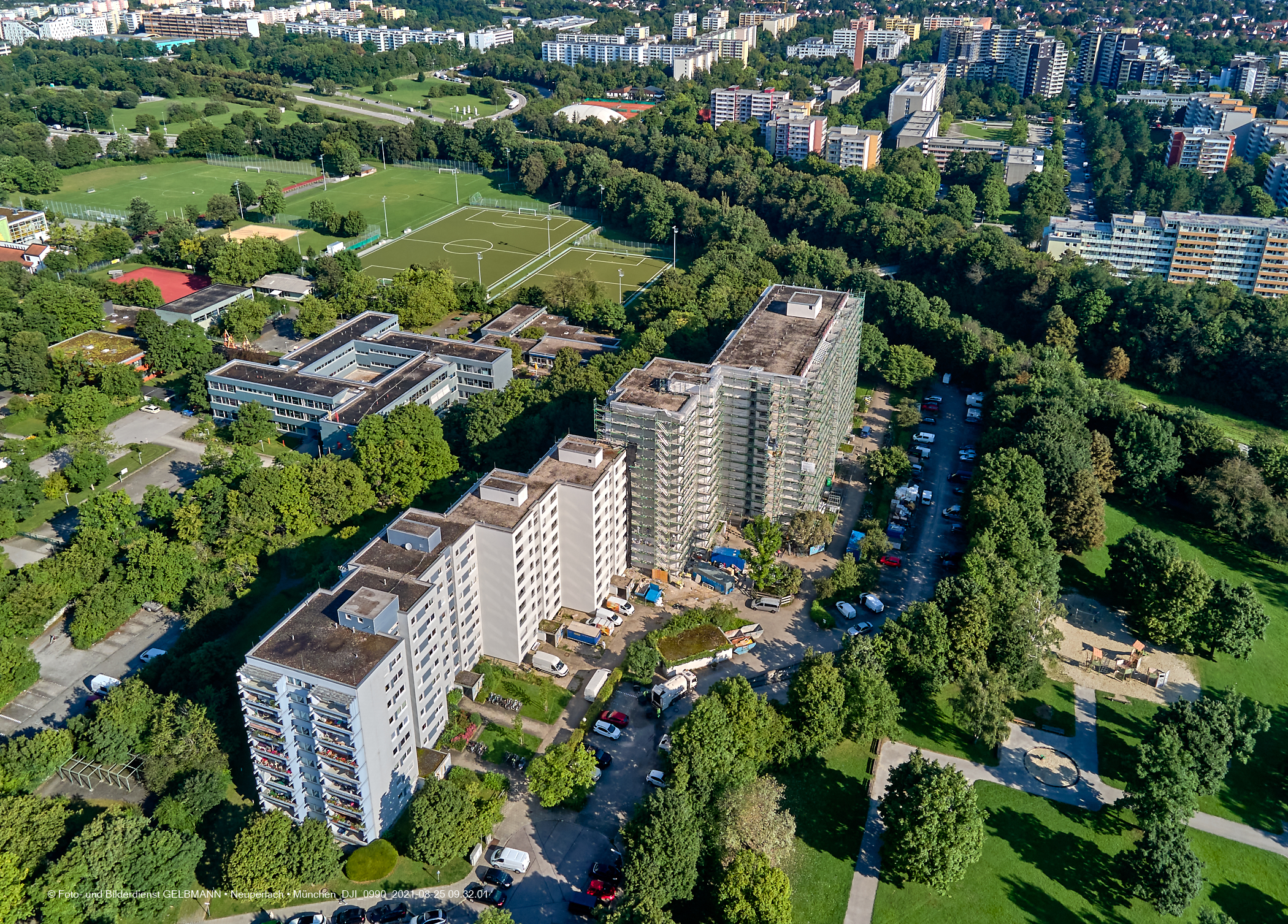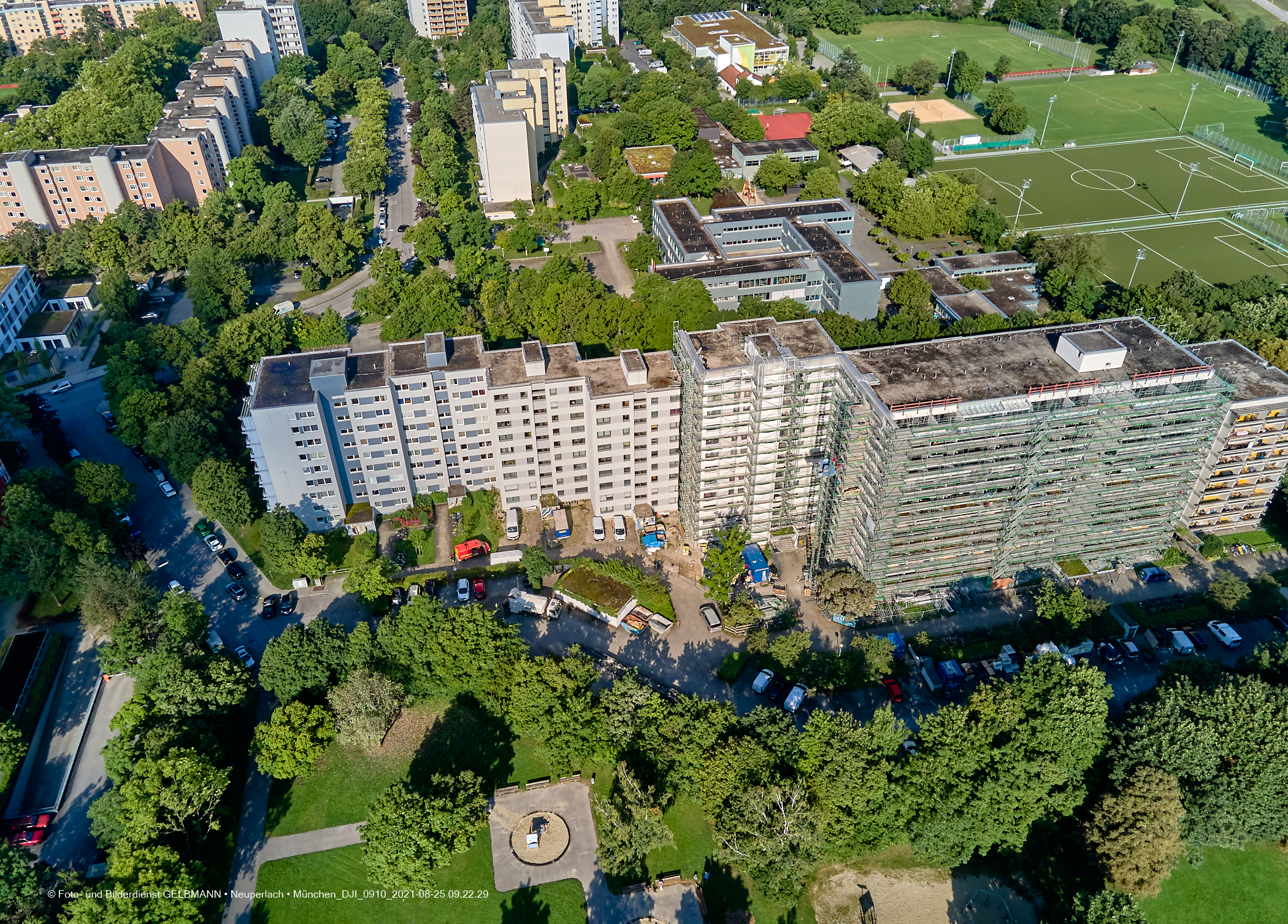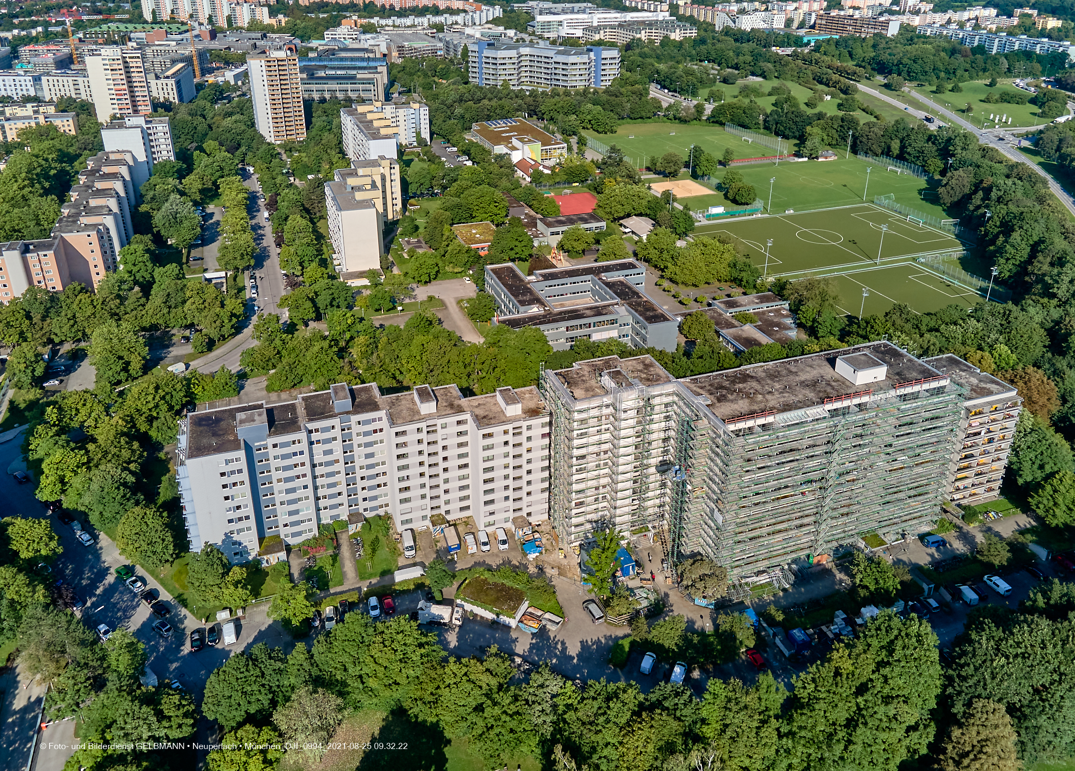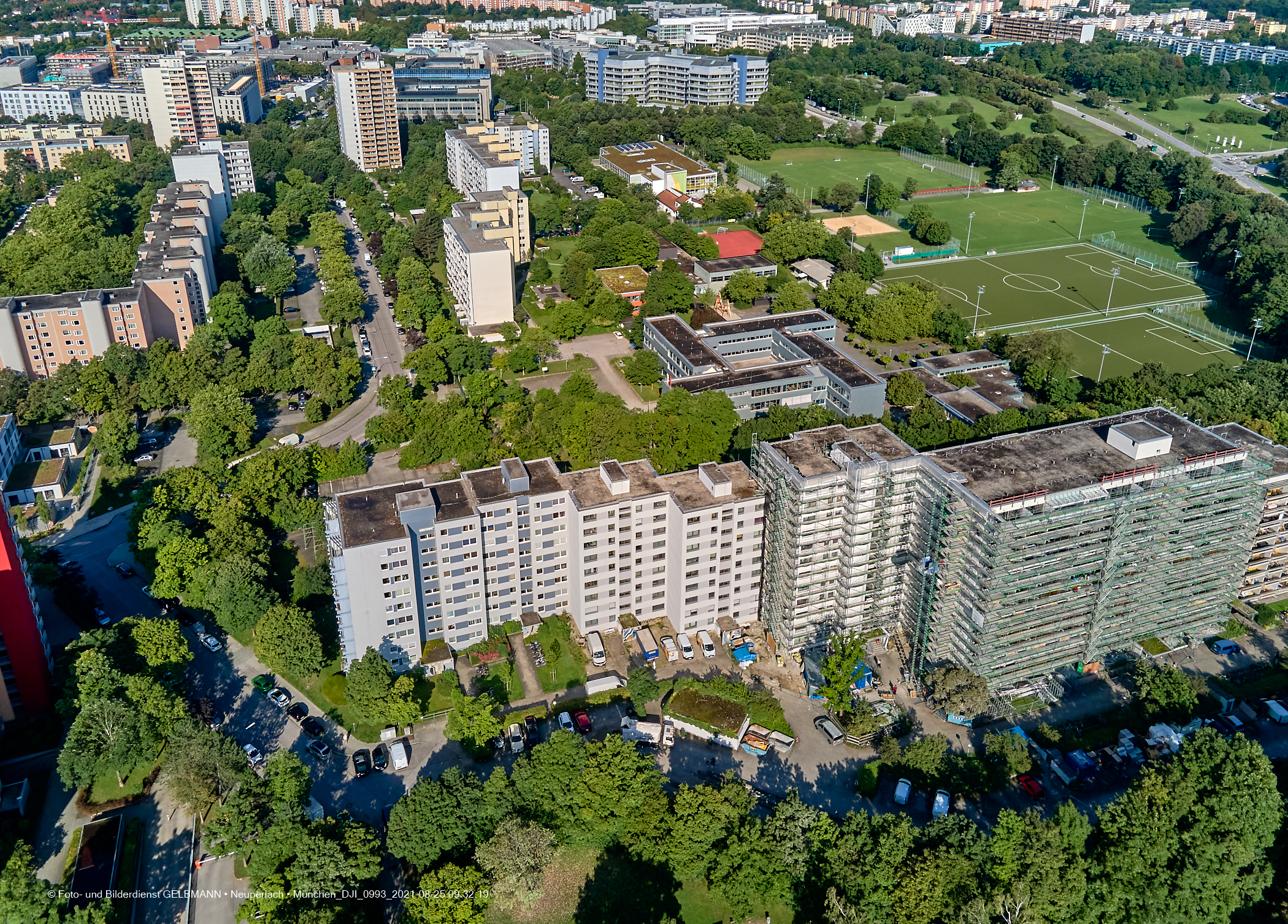 Zurzeit wird der große Wohnblock Annette-Kolb-Anger saniert. Teilweise sind schon Gerüstteile abgebaut und die Arbeiten gehen zu Ende.