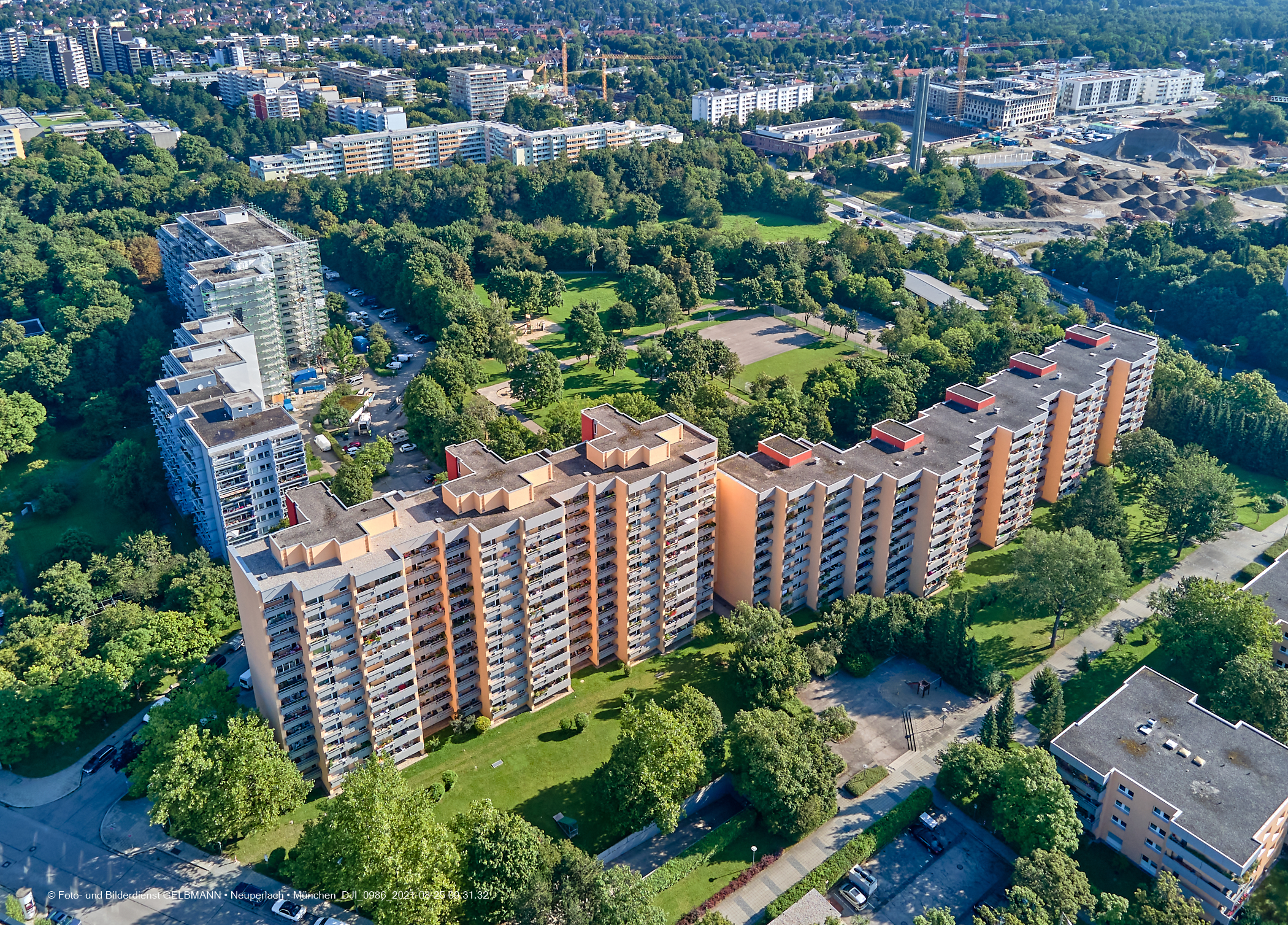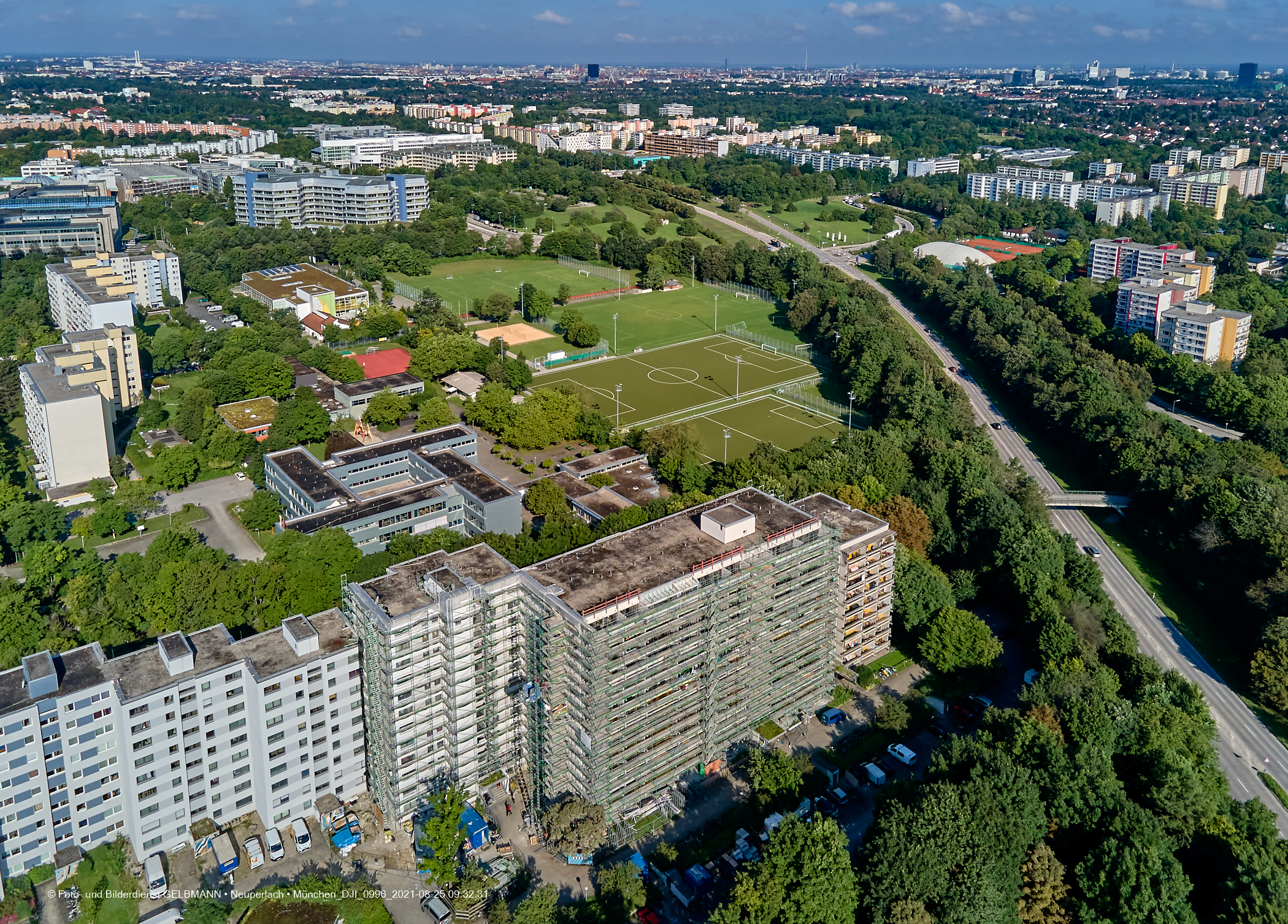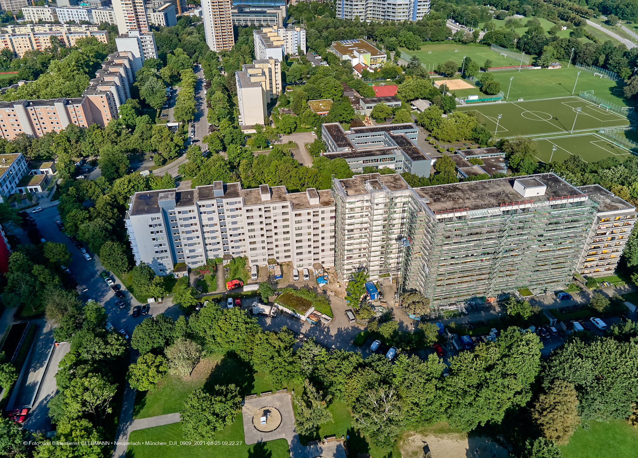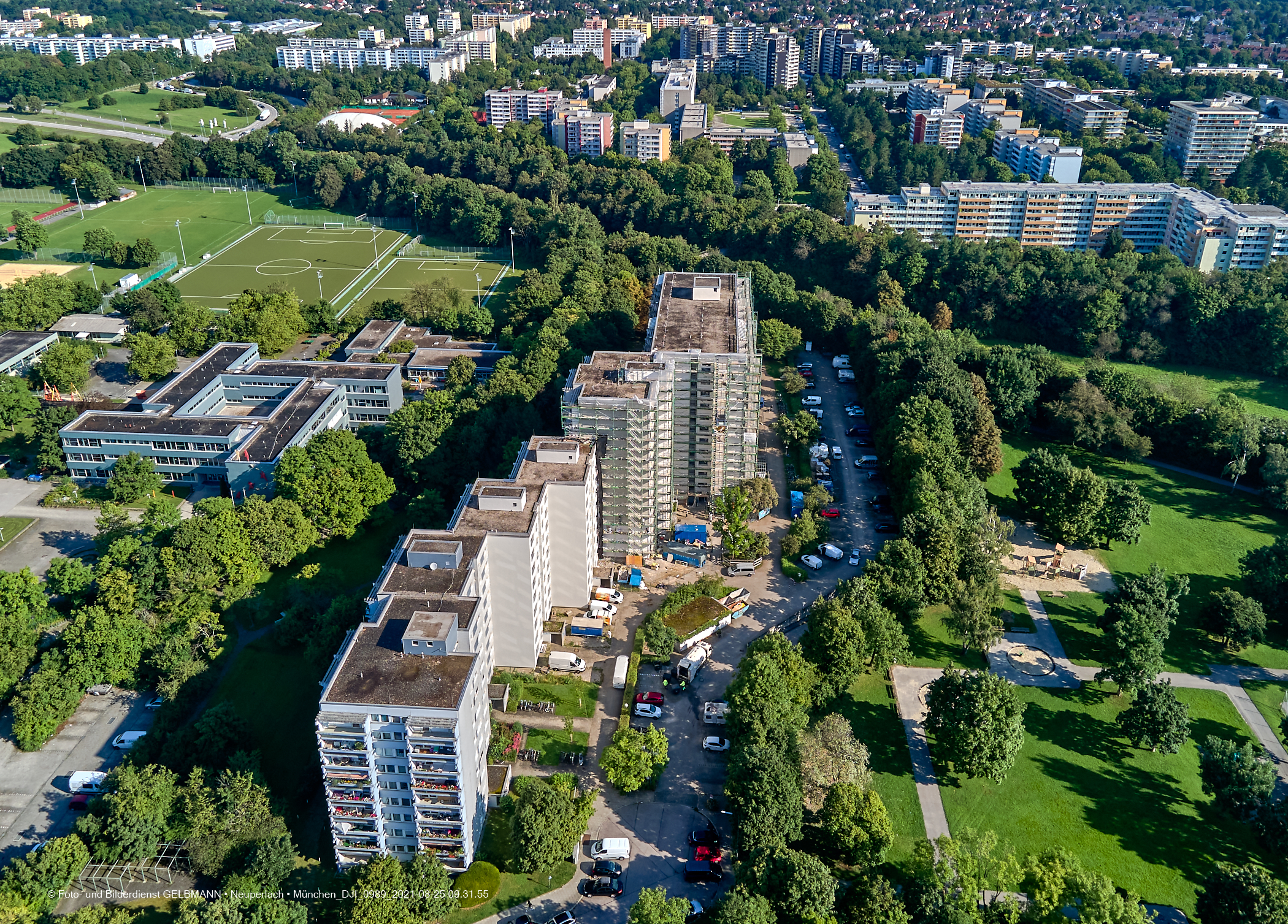 Zurzeit wird der große Wohnblock Annette-Kolb-Anger saniert. Teilweise sind schon Gerüstteile abgebaut und die Arbeiten gehen zu Ende.