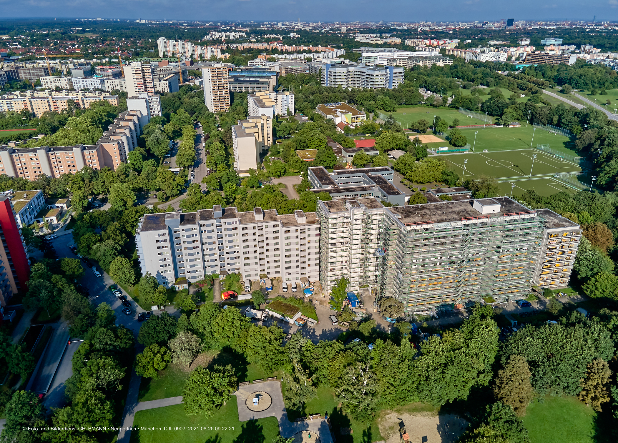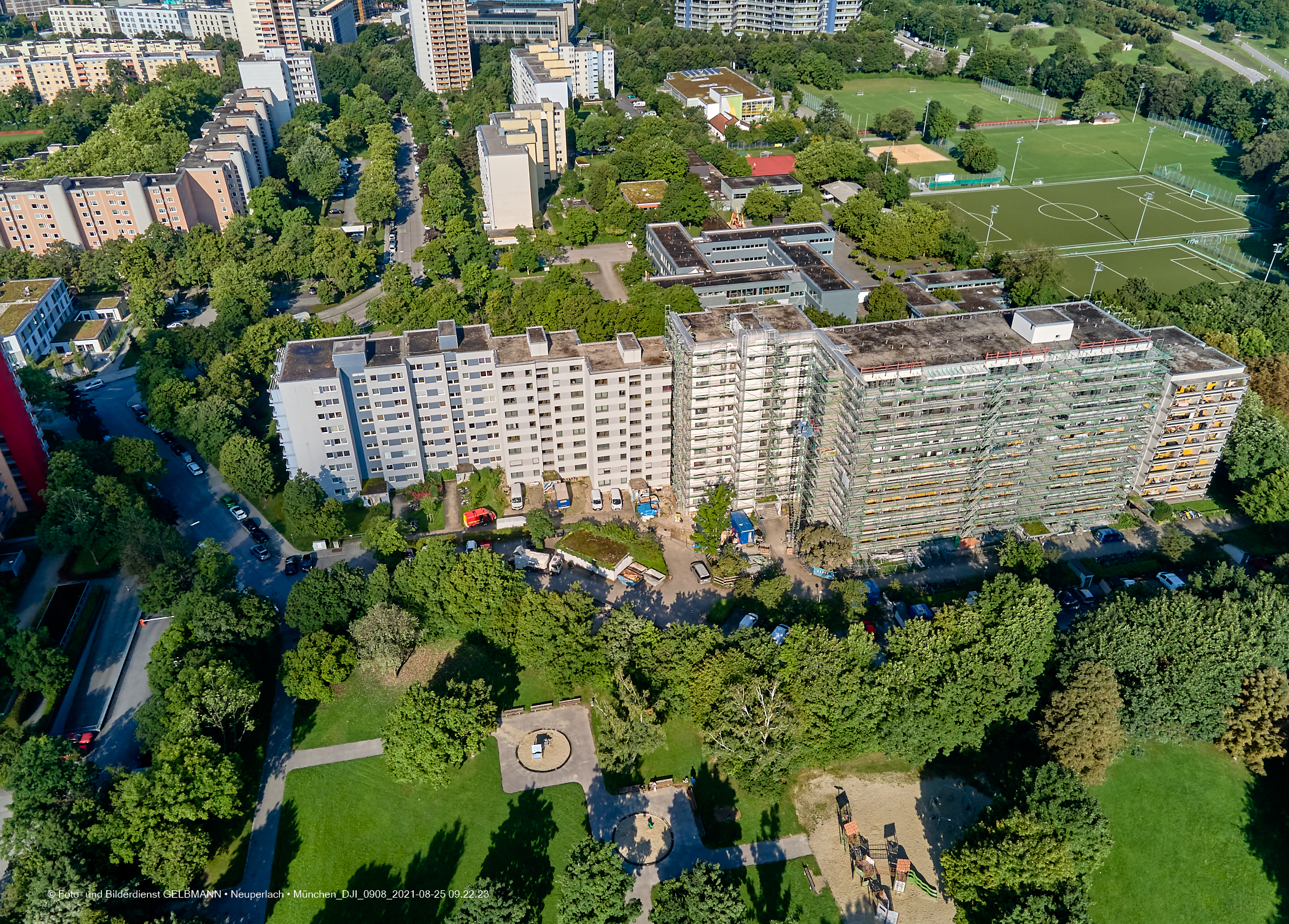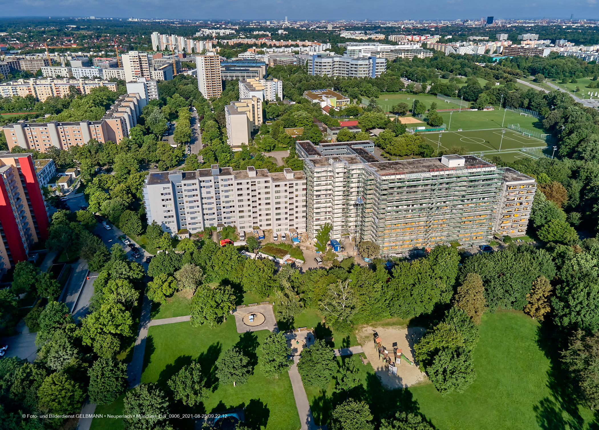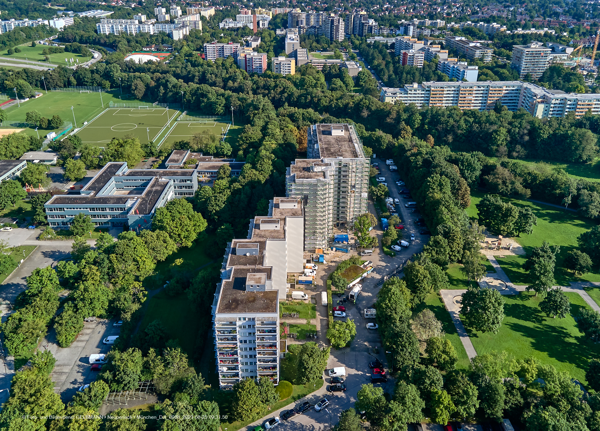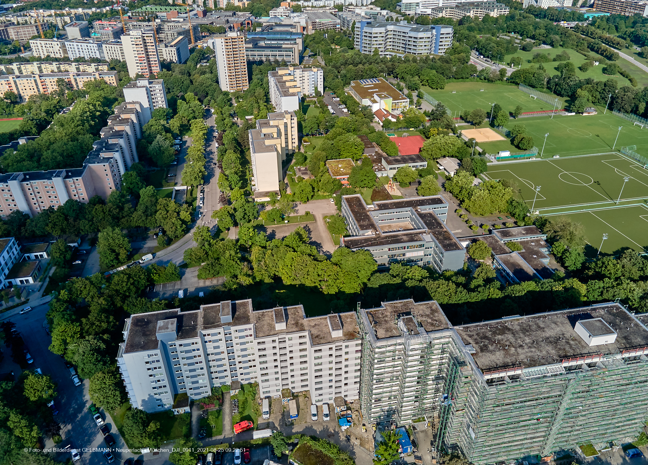 Zurzeit wird der große Wohnblock Annette-Kolb-Anger saniert. Teilweise sind schon Gerüstteile abgebaut und die Arbeiten gehen zu Ende.