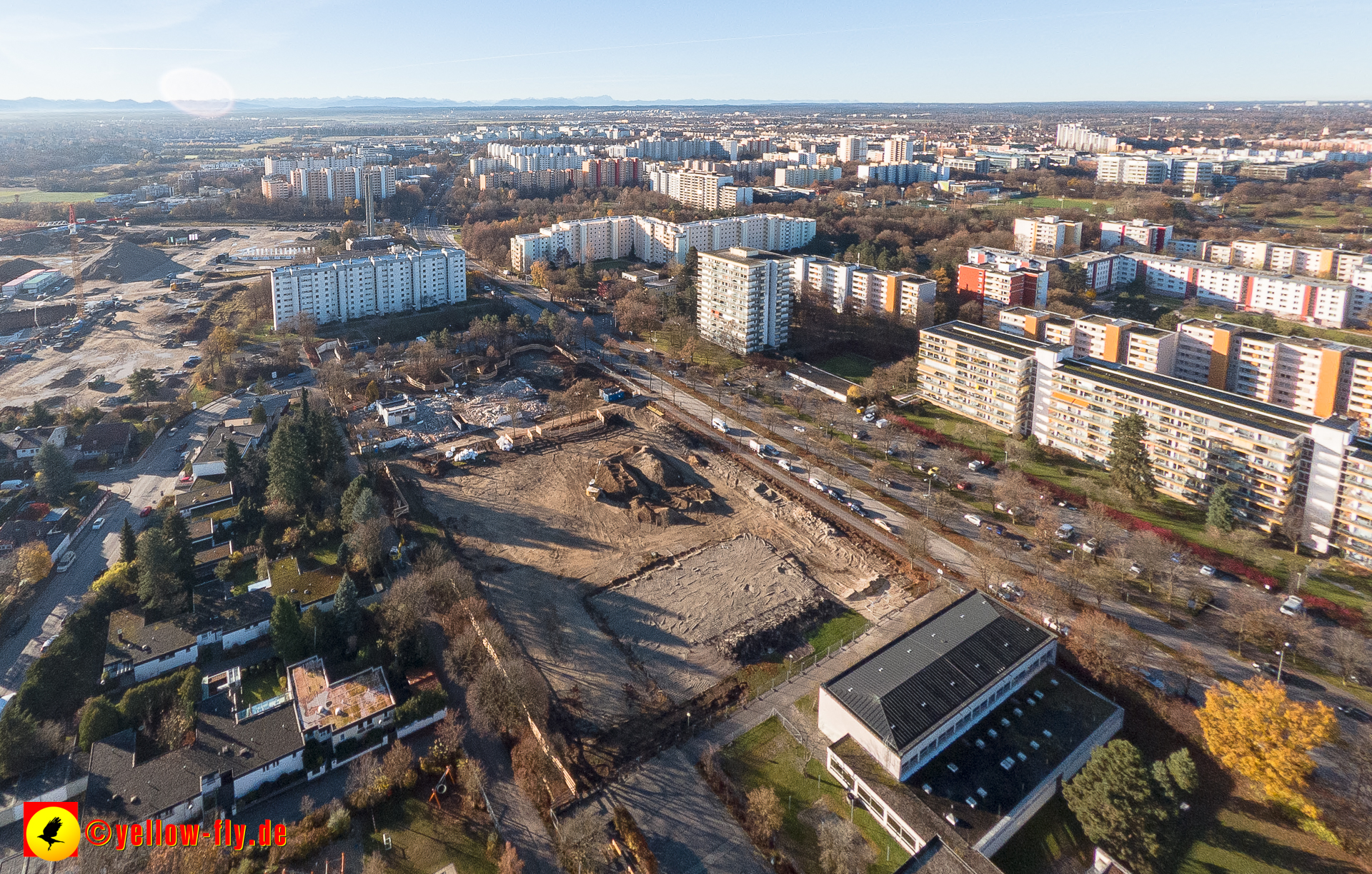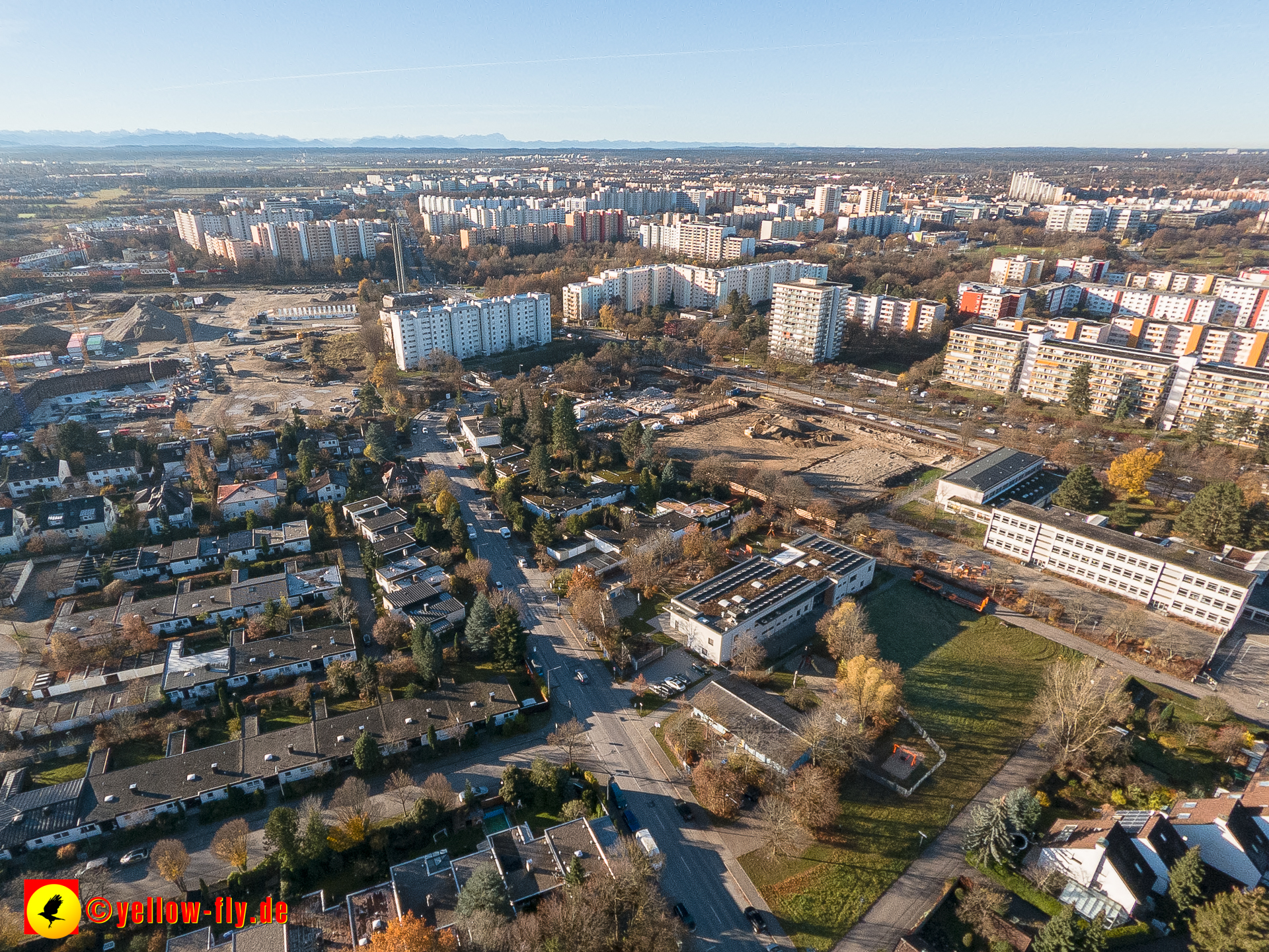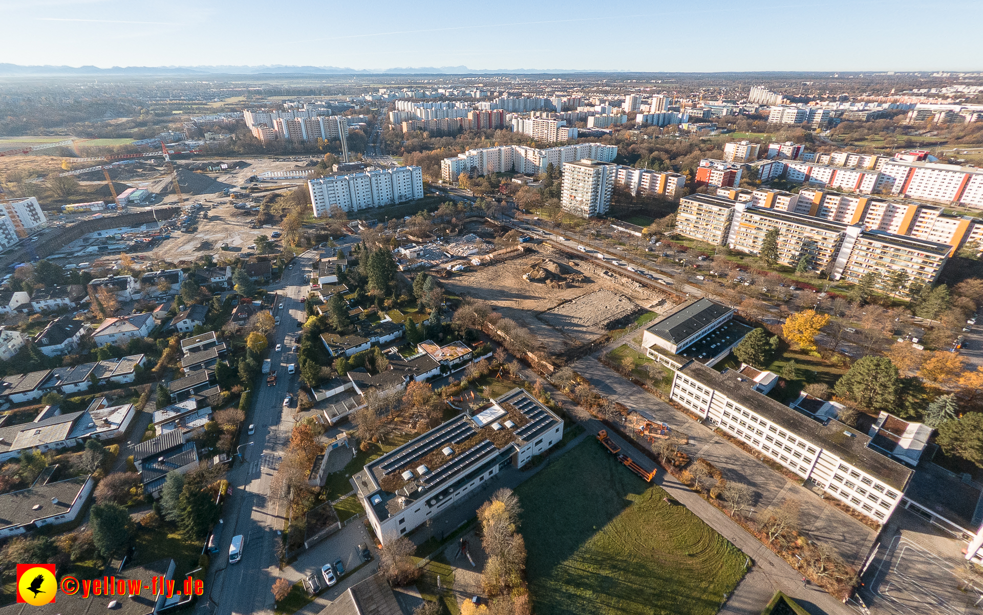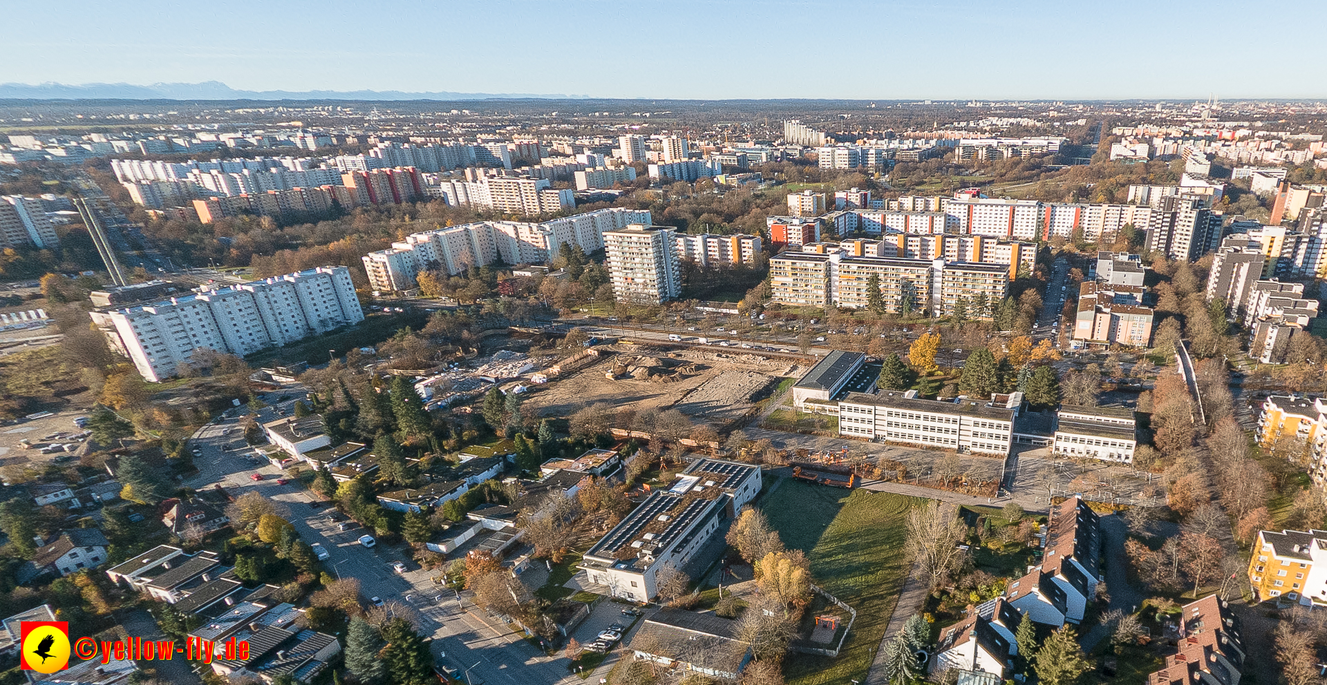 Aktuelle Luftbilder von der Baustelle zur Grundschule am Karl-Marx-Ring in Neuperlach. Immer wenigen Gerüstteile sind an dem Klinkerbau zu sehen.
