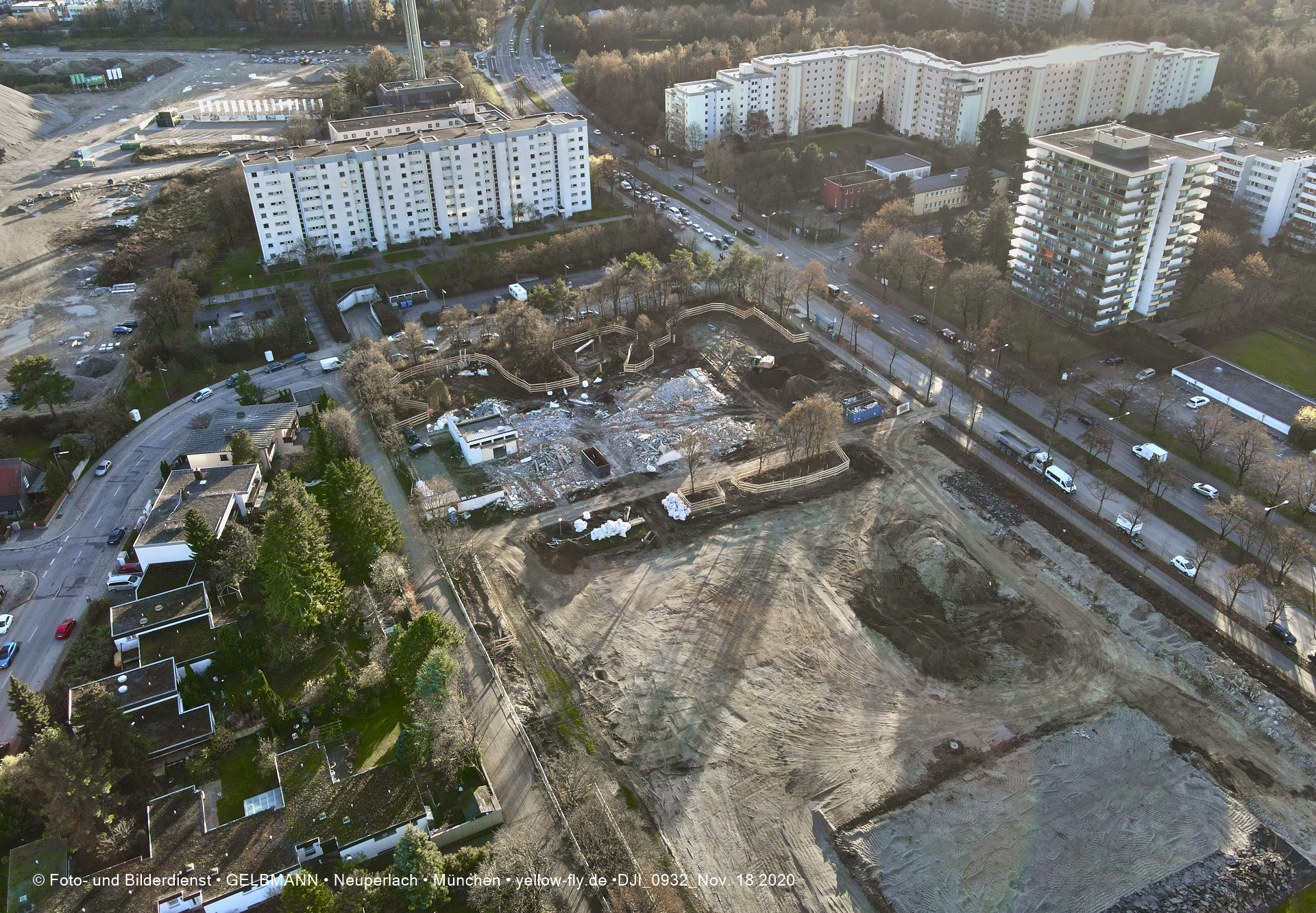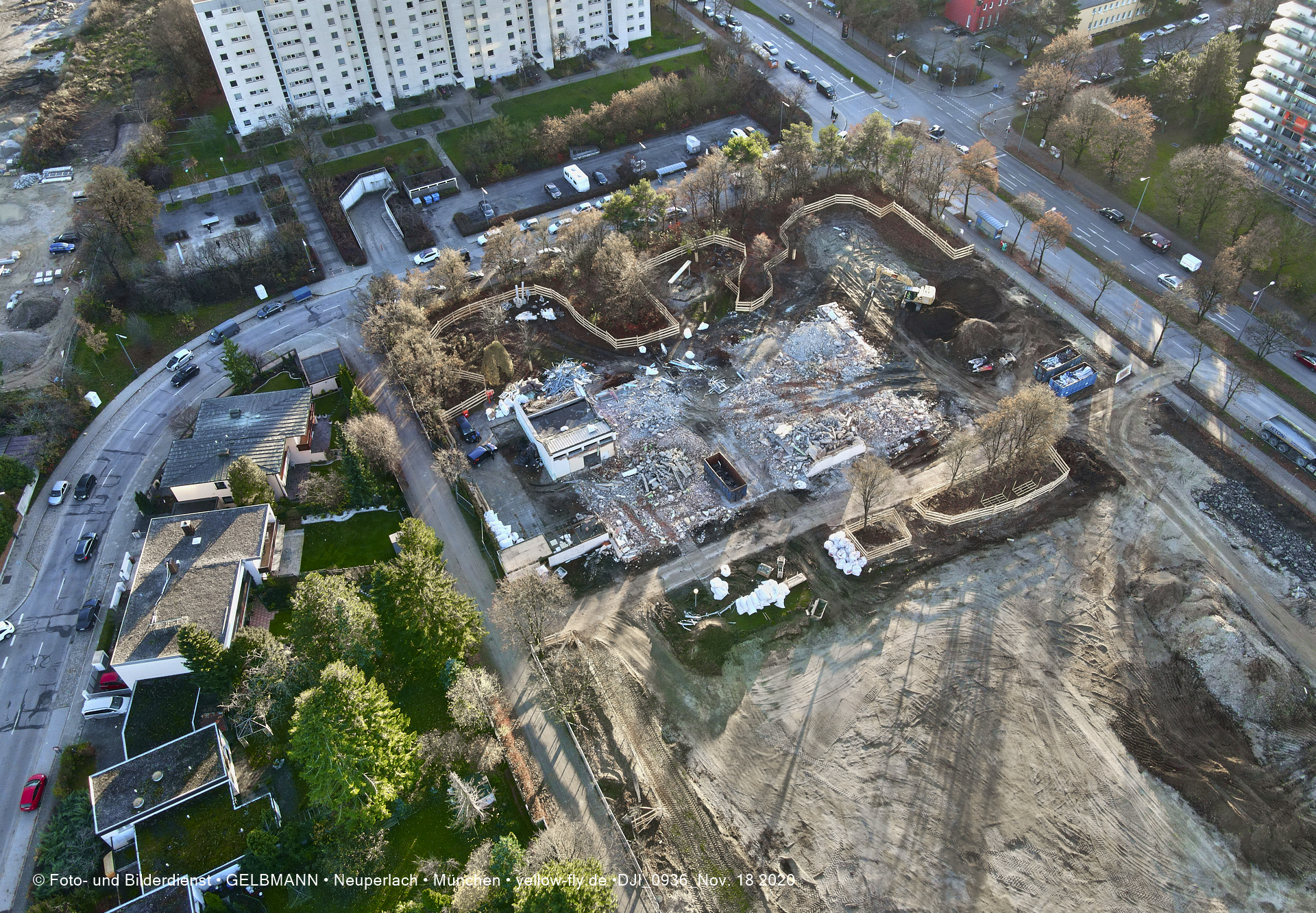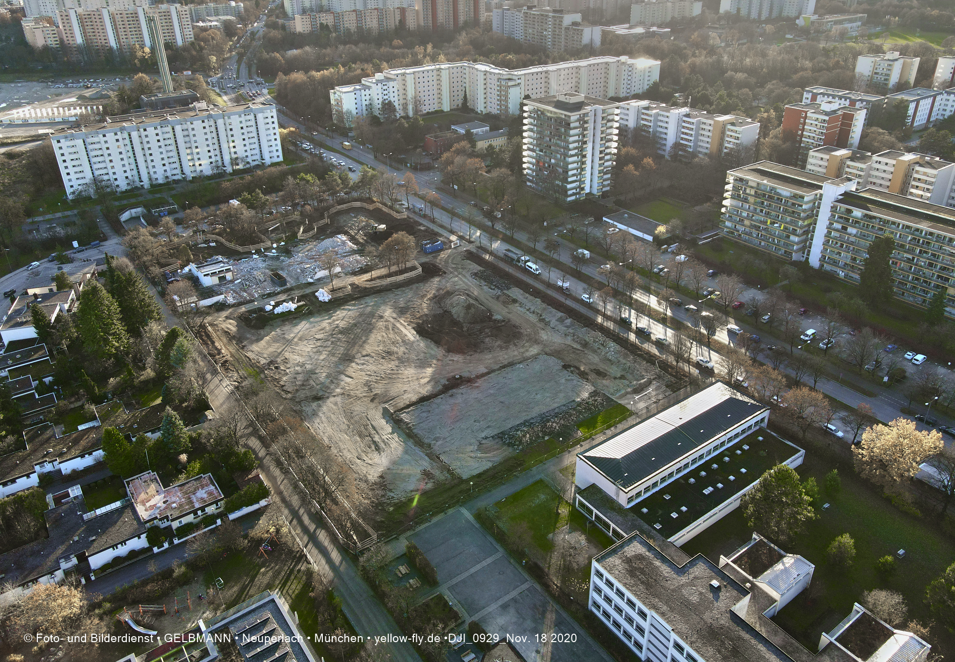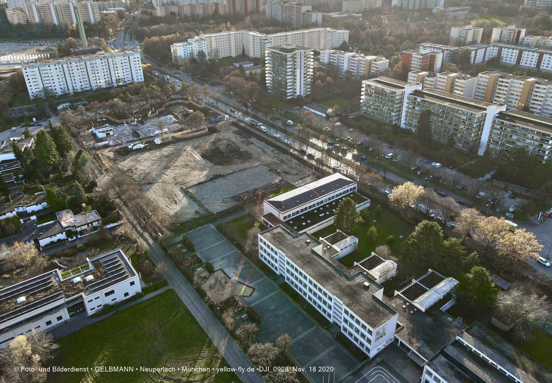Aktuelle Luftbilder von der Baustelle zur Grundschule am Karl-Marx-Ring in Neuperlach. Immer wenigen Gerüstteile sind an dem Klinkerbau zu sehen.