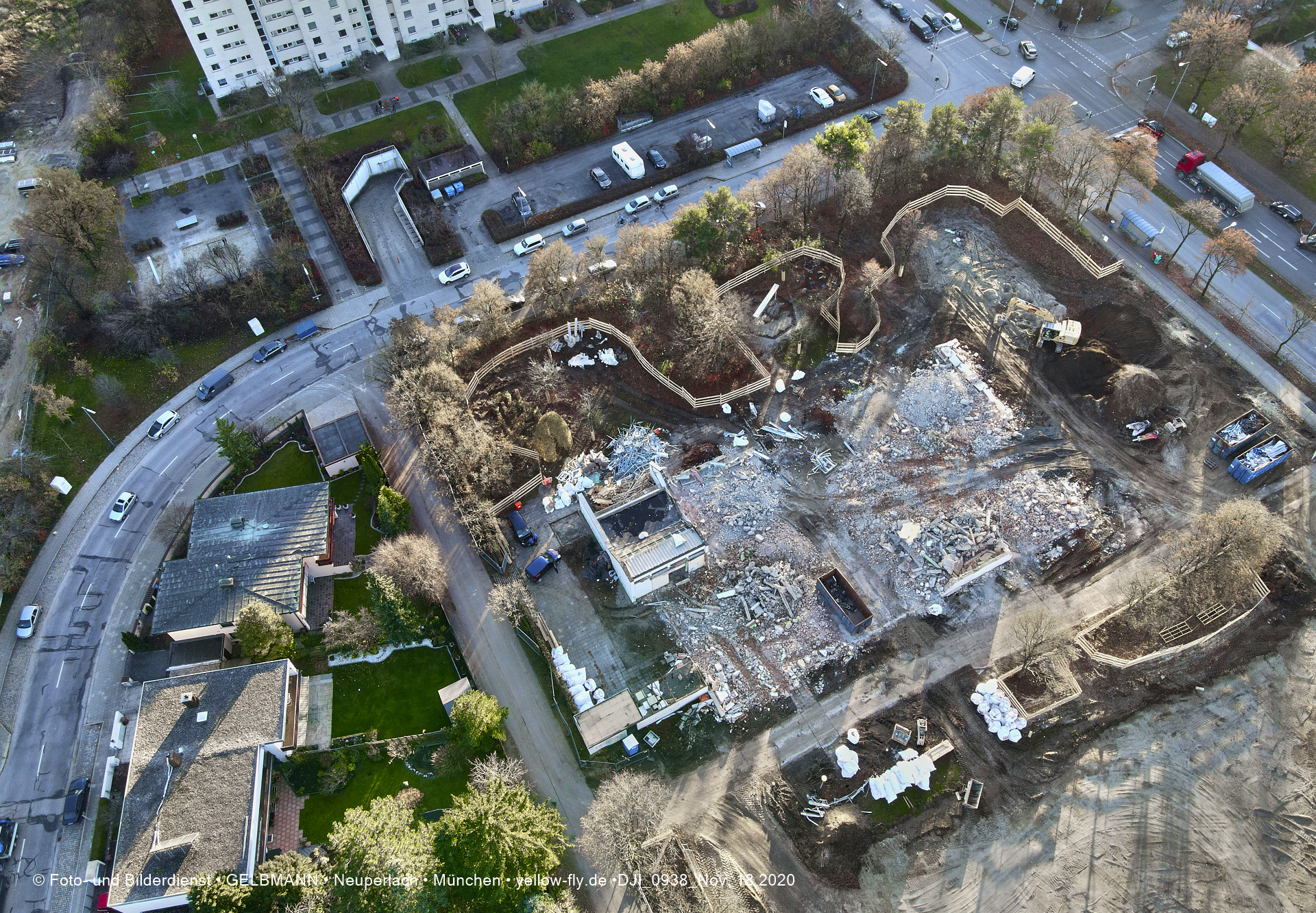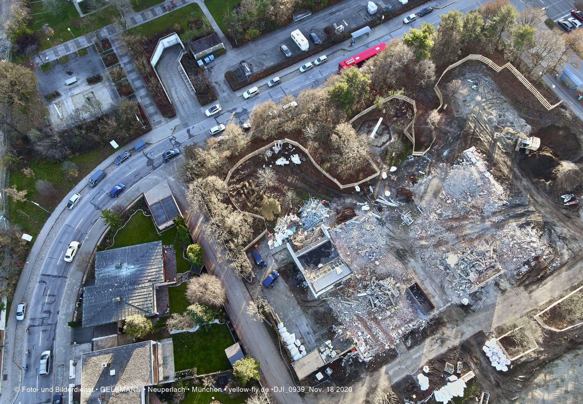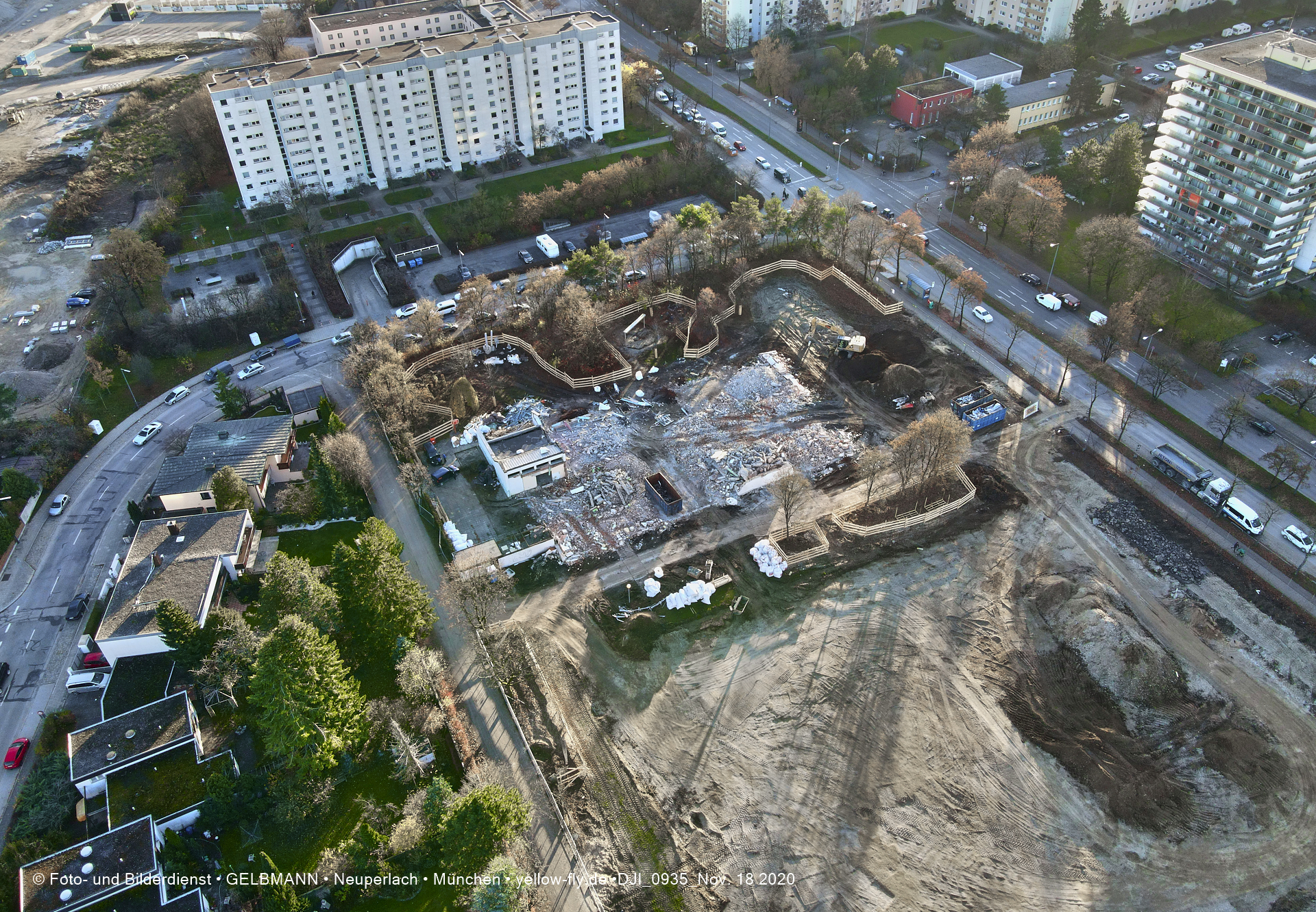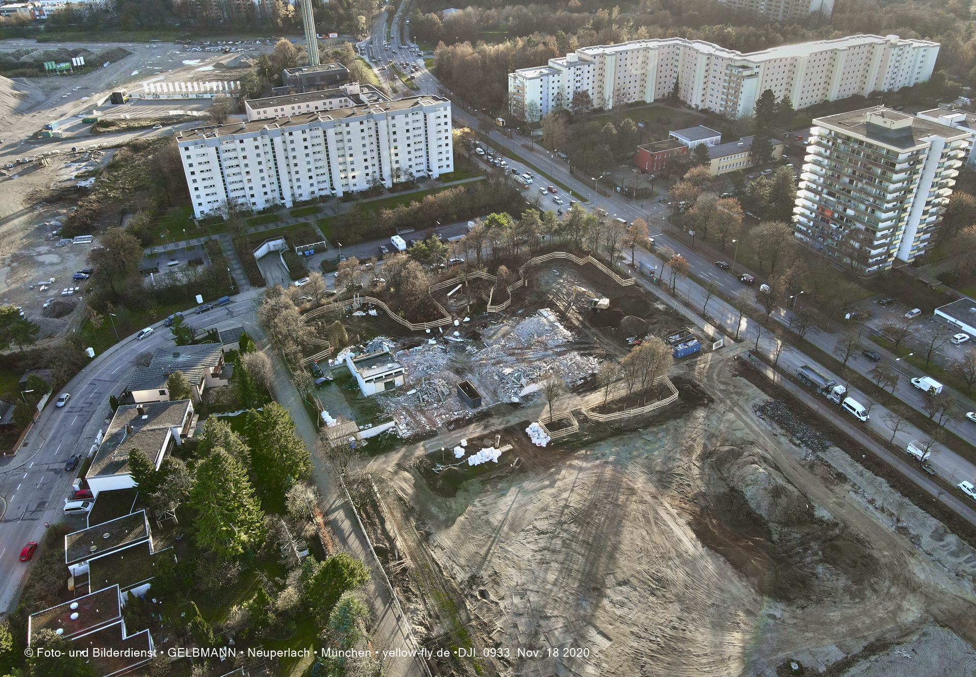 Aktuelle Luftbilder von der Baustelle zur Grundschule am Karl-Marx-Ring in Neuperlach. Immer wenigen Gerüstteile sind an dem Klinkerbau zu sehen.