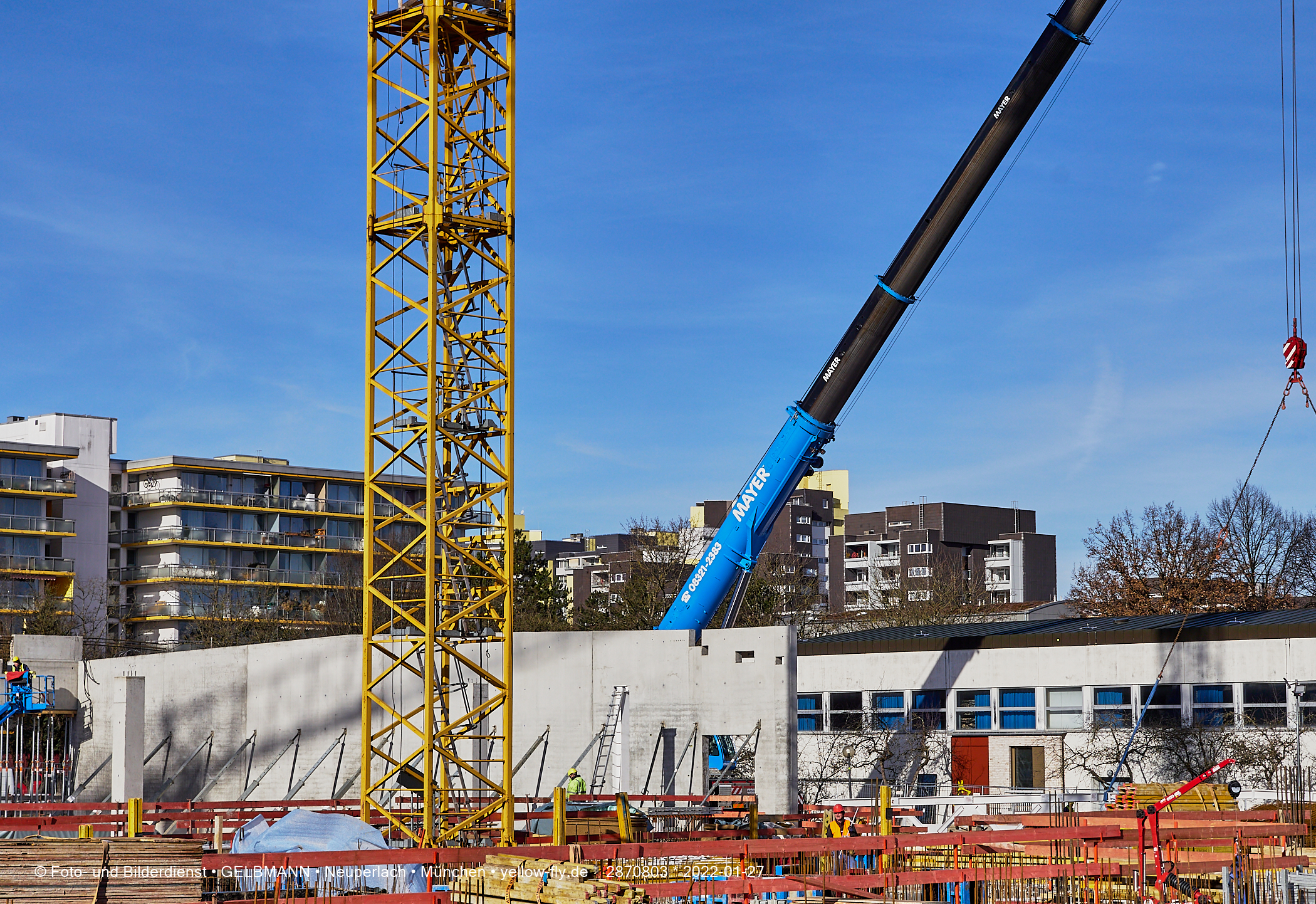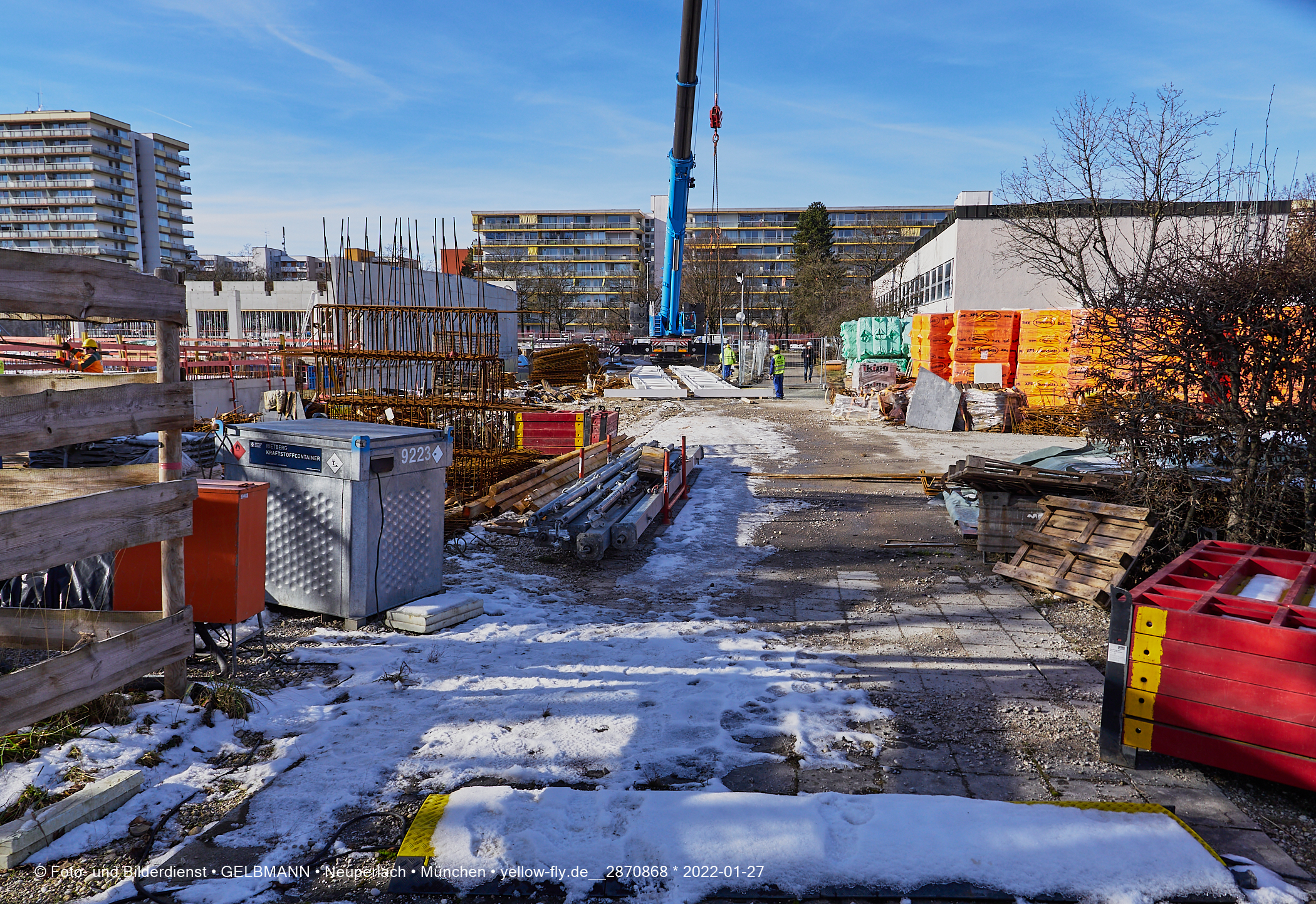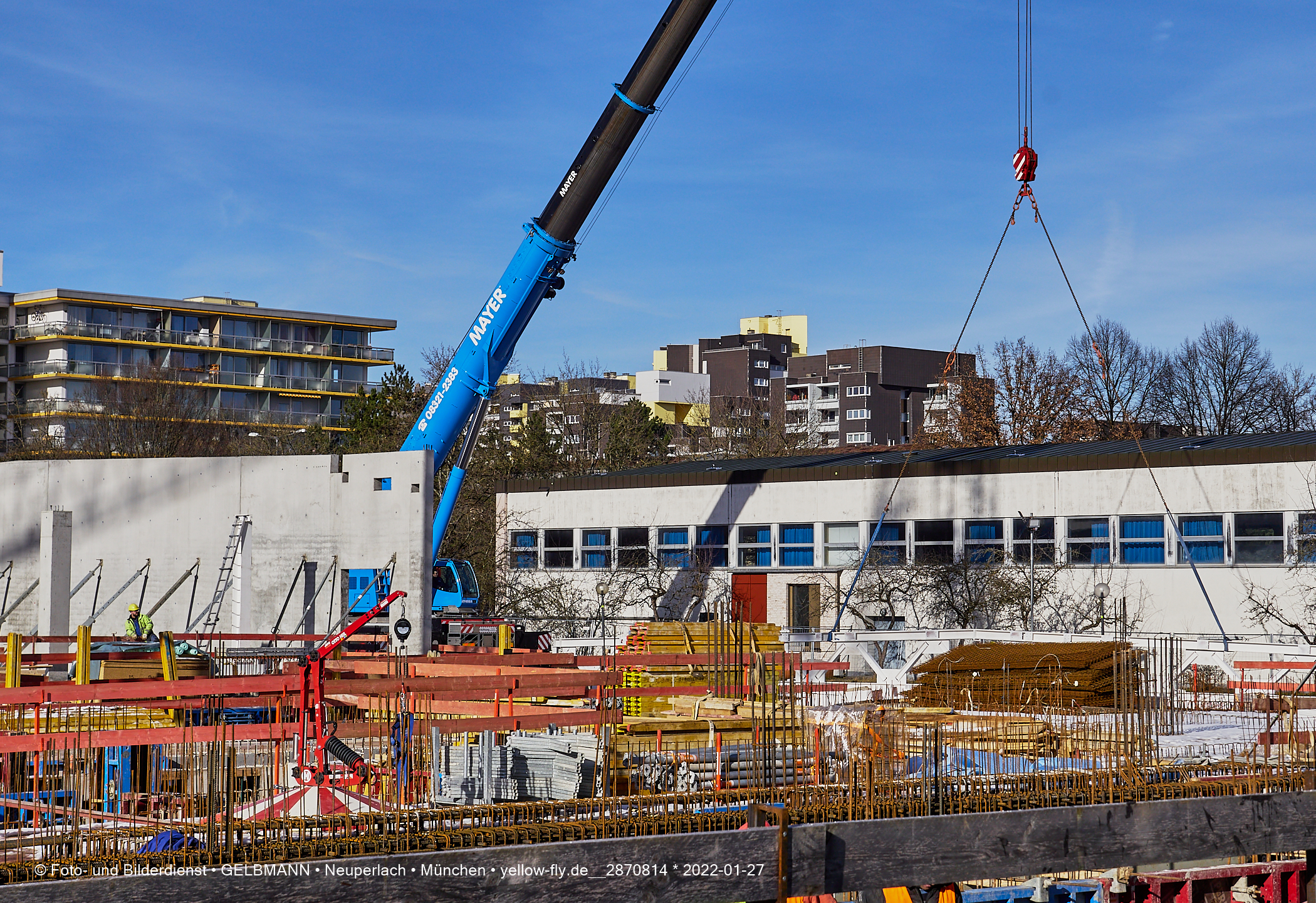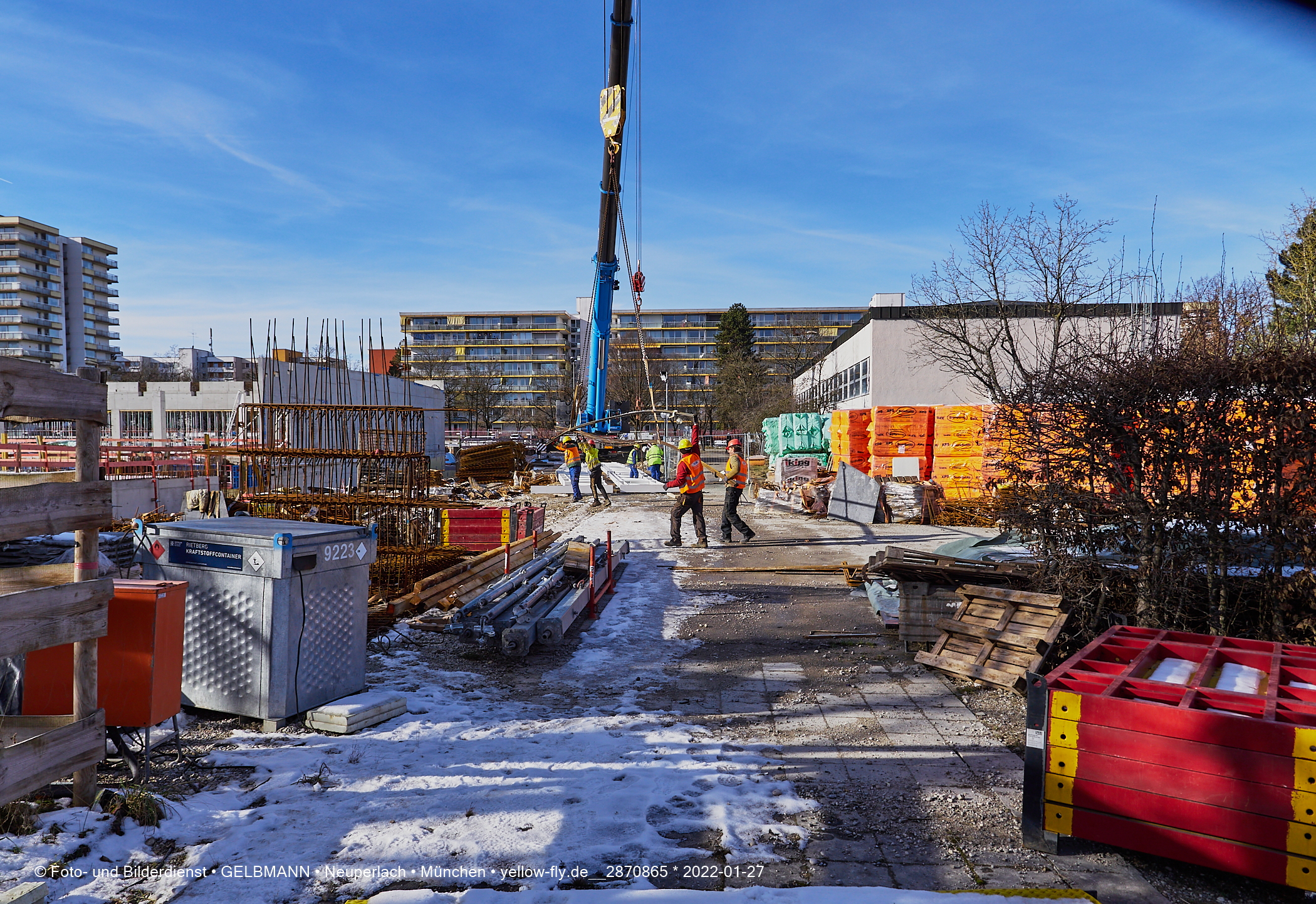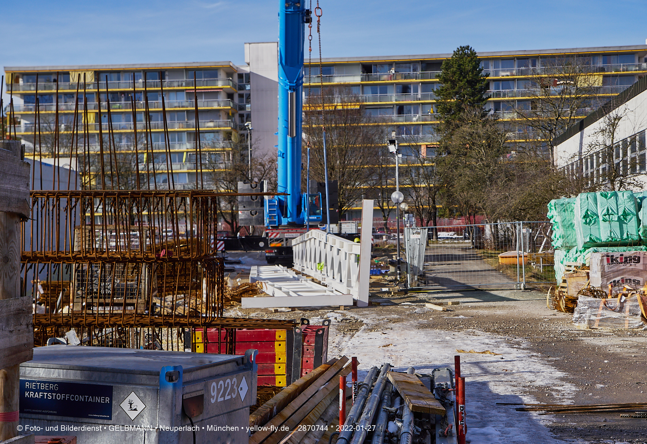 Durch die großen Wandplatten, welche von einem mobilen Karan an die entsprechenden Stellen gehoben werden, wächst die Sporthalle enorm schnell in die Höhe. Schon wird, wie in meinem nächsten Bericht vom 27./28.01.2022 zu sehen ist, an der Decke gearbeitet