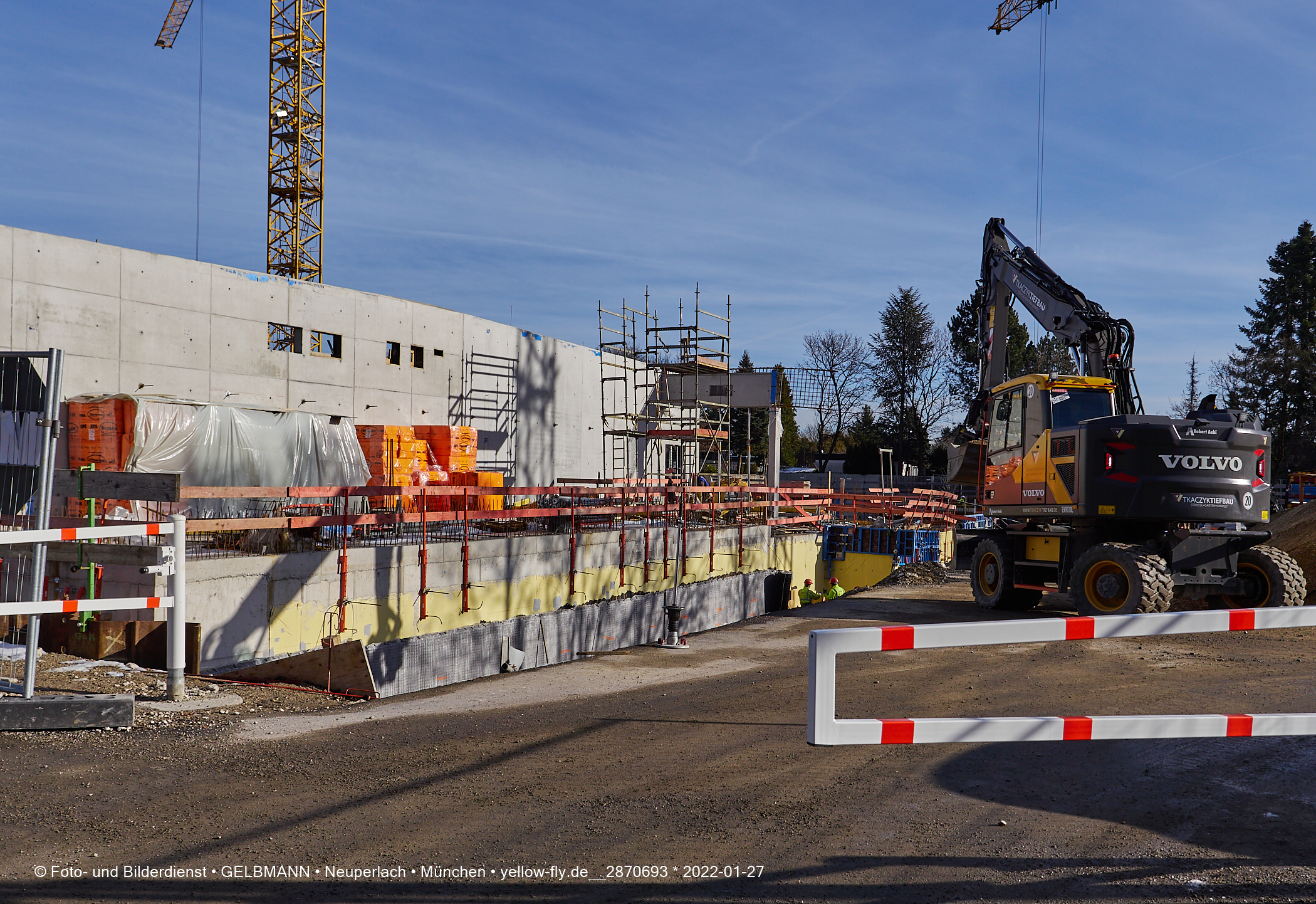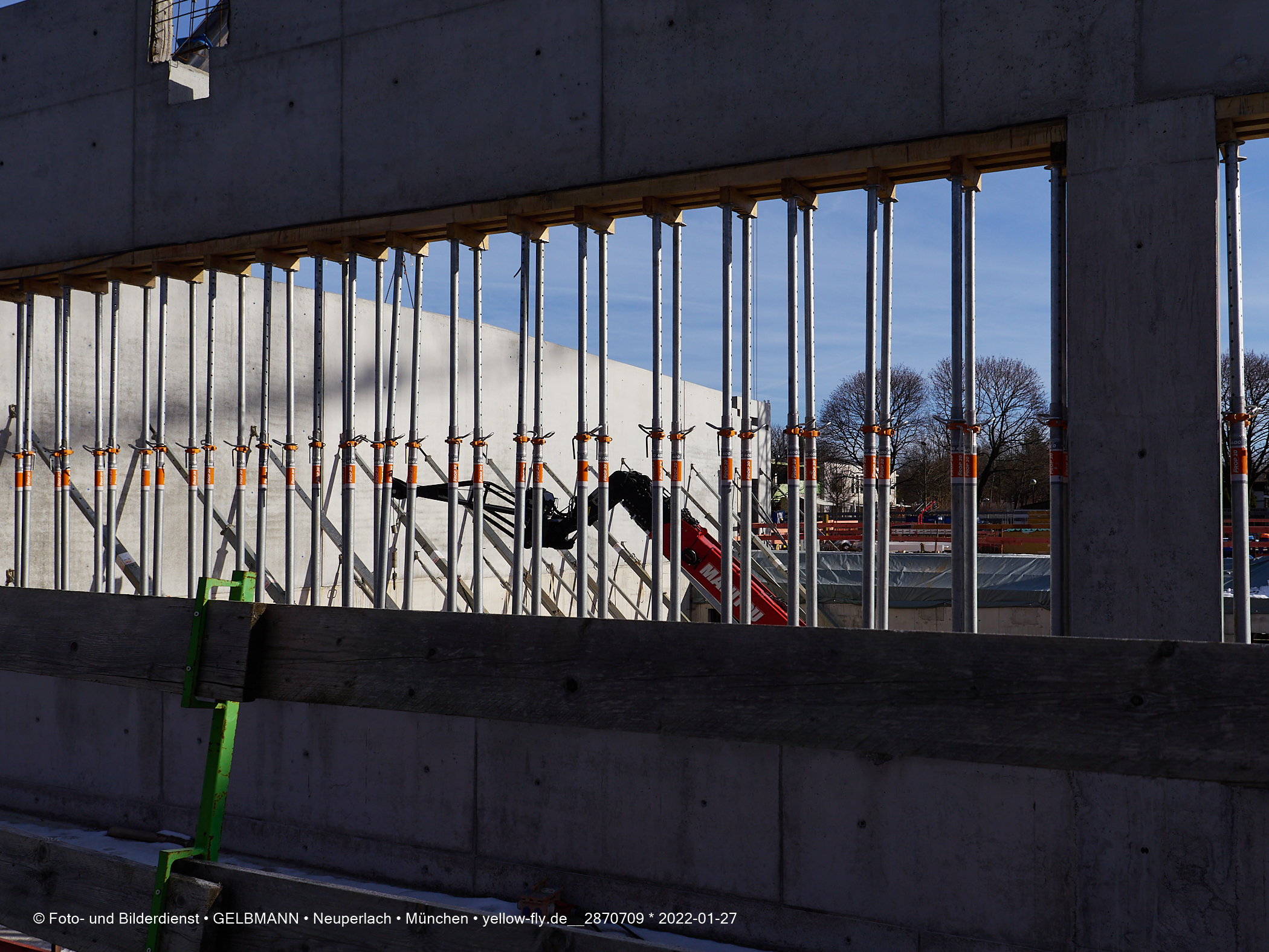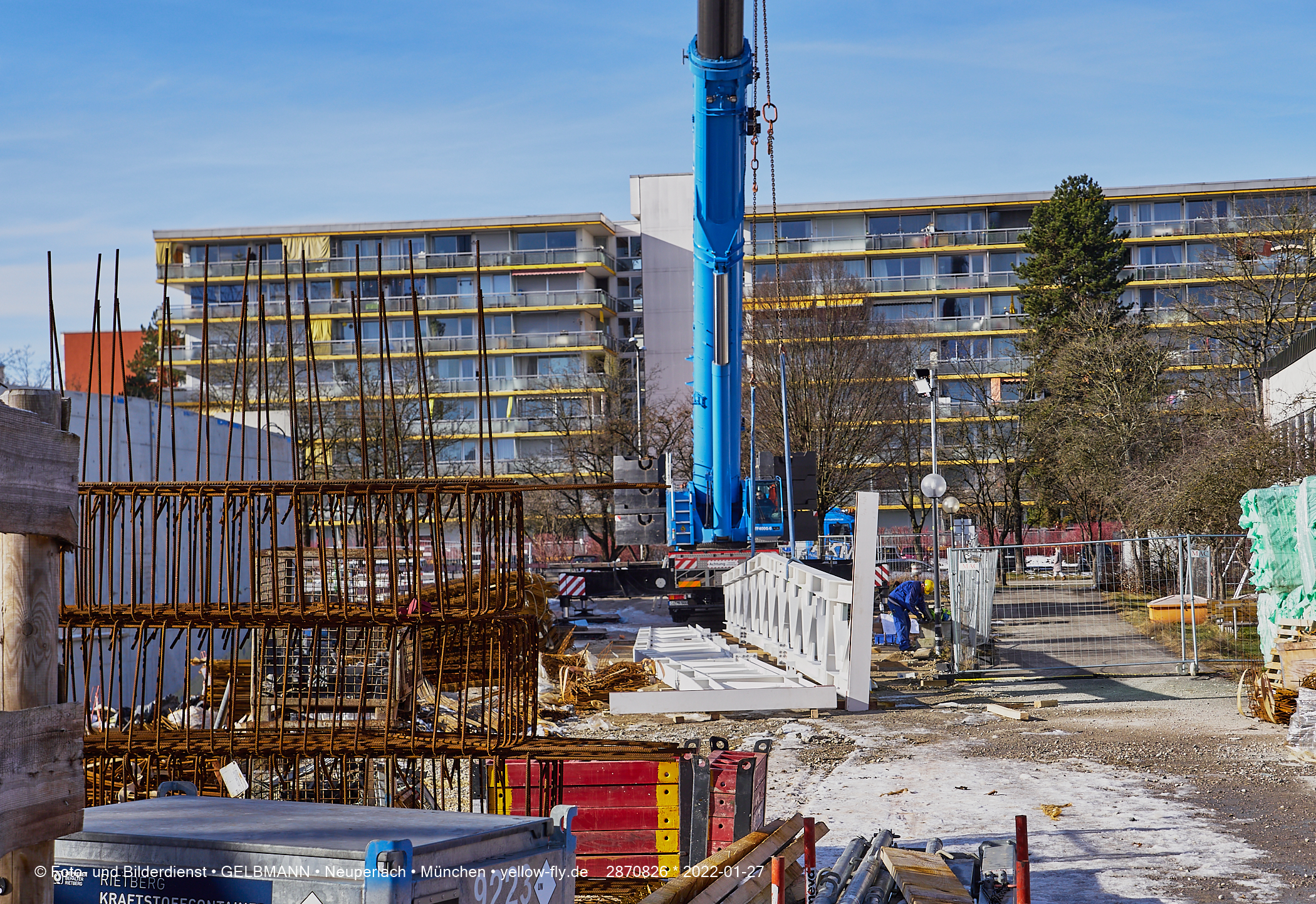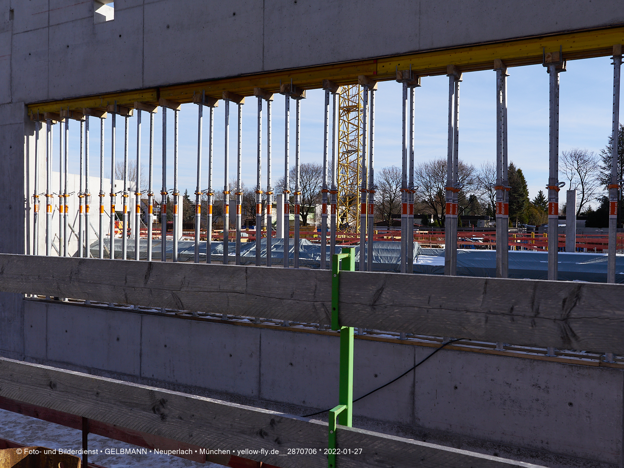 Durch die großen Wandplatten, welche von einem mobilen Karan an die entsprechenden Stellen gehoben werden, wächst die Sporthalle enorm schnell in die Höhe. Schon wird, wie in meinem nächsten Bericht vom 27./28.01.2022 zu sehen ist, an der Decke gearbeitet