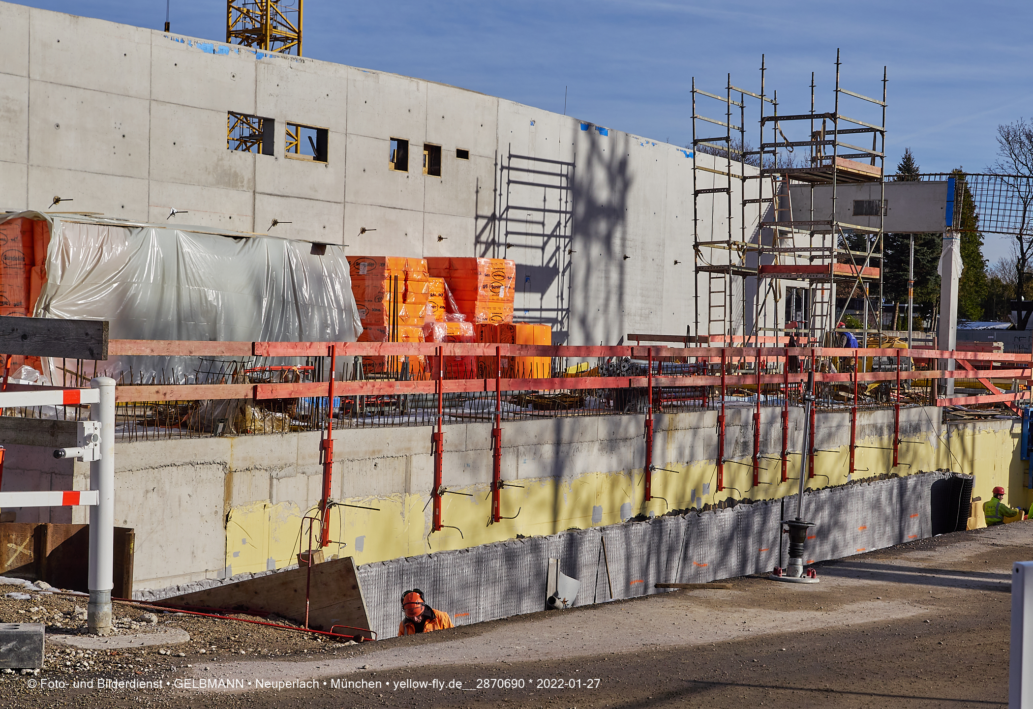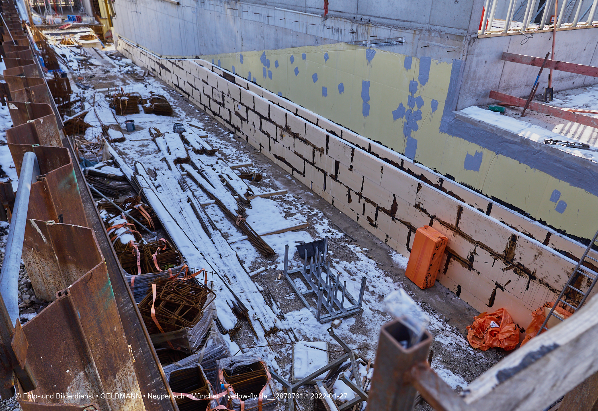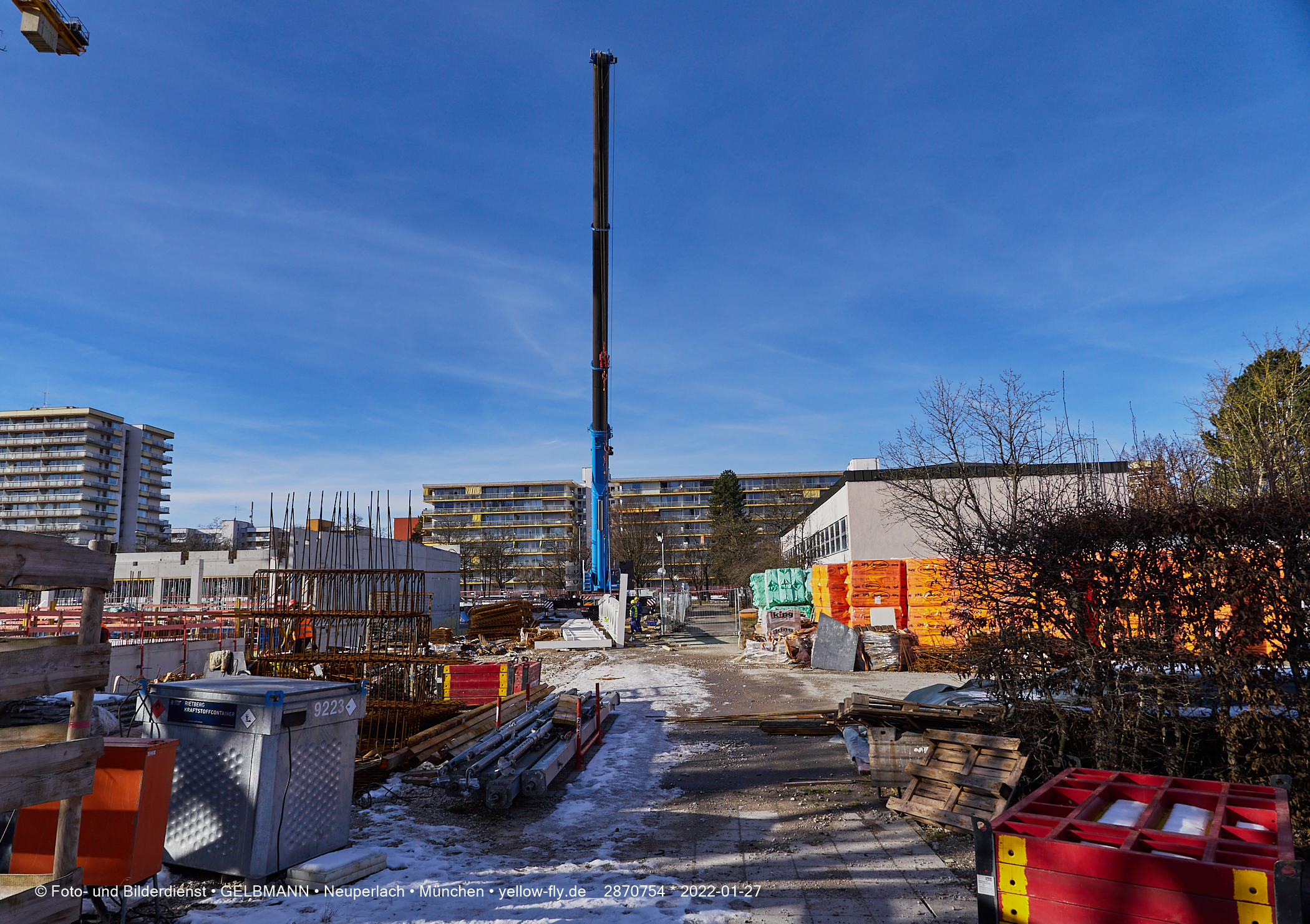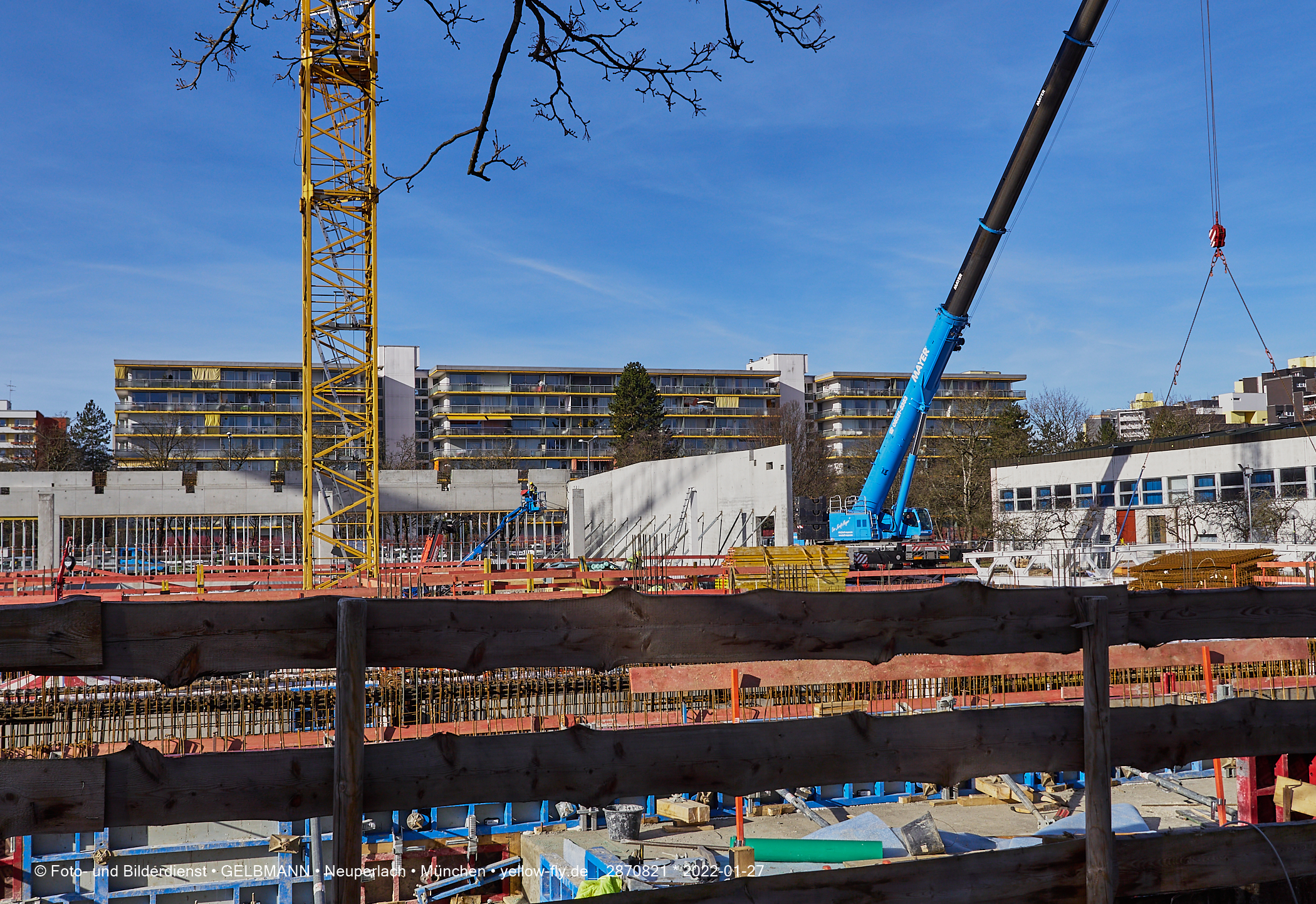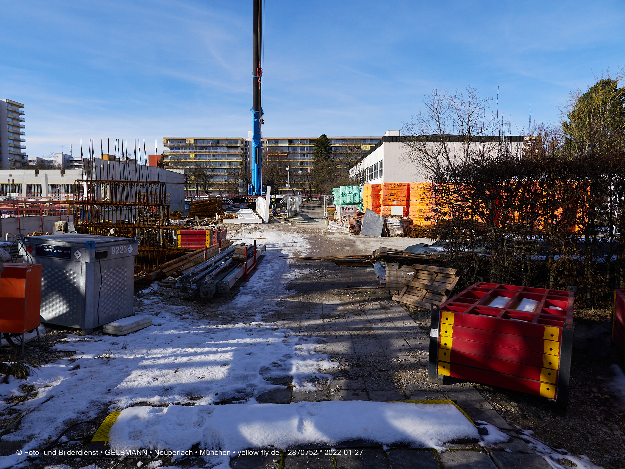 Durch die großen Wandplatten, welche von einem mobilen Karan an die entsprechenden Stellen gehoben werden, wächst die Sporthalle enorm schnell in die Höhe. Schon wird, wie in meinem nächsten Bericht vom 27./28.01.2022 zu sehen ist, an der Decke gearbeitet