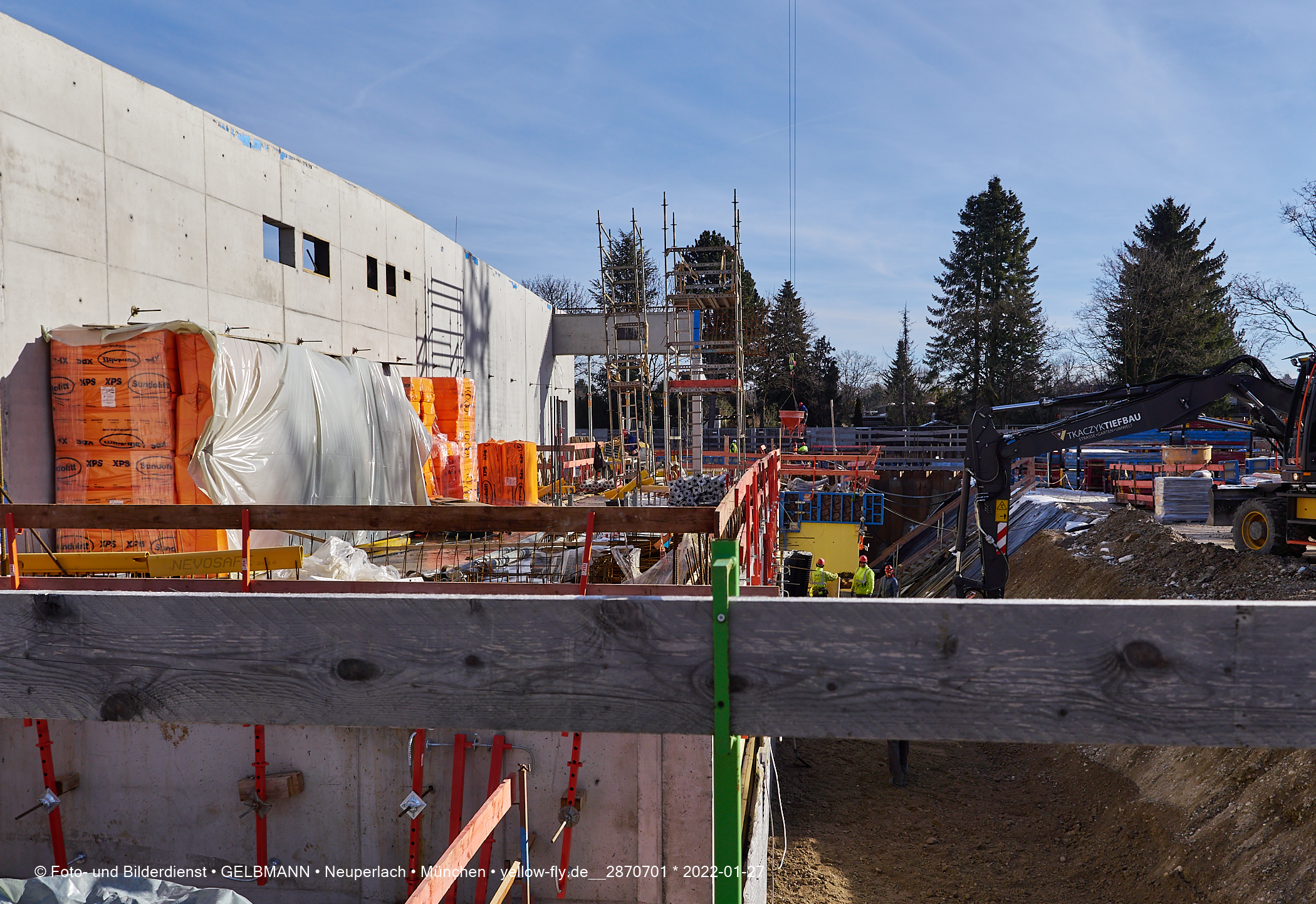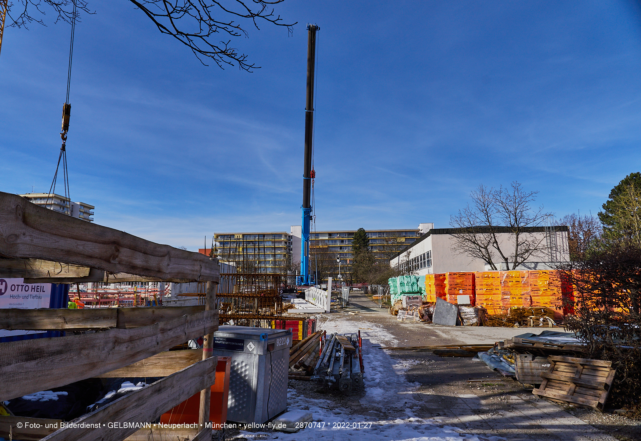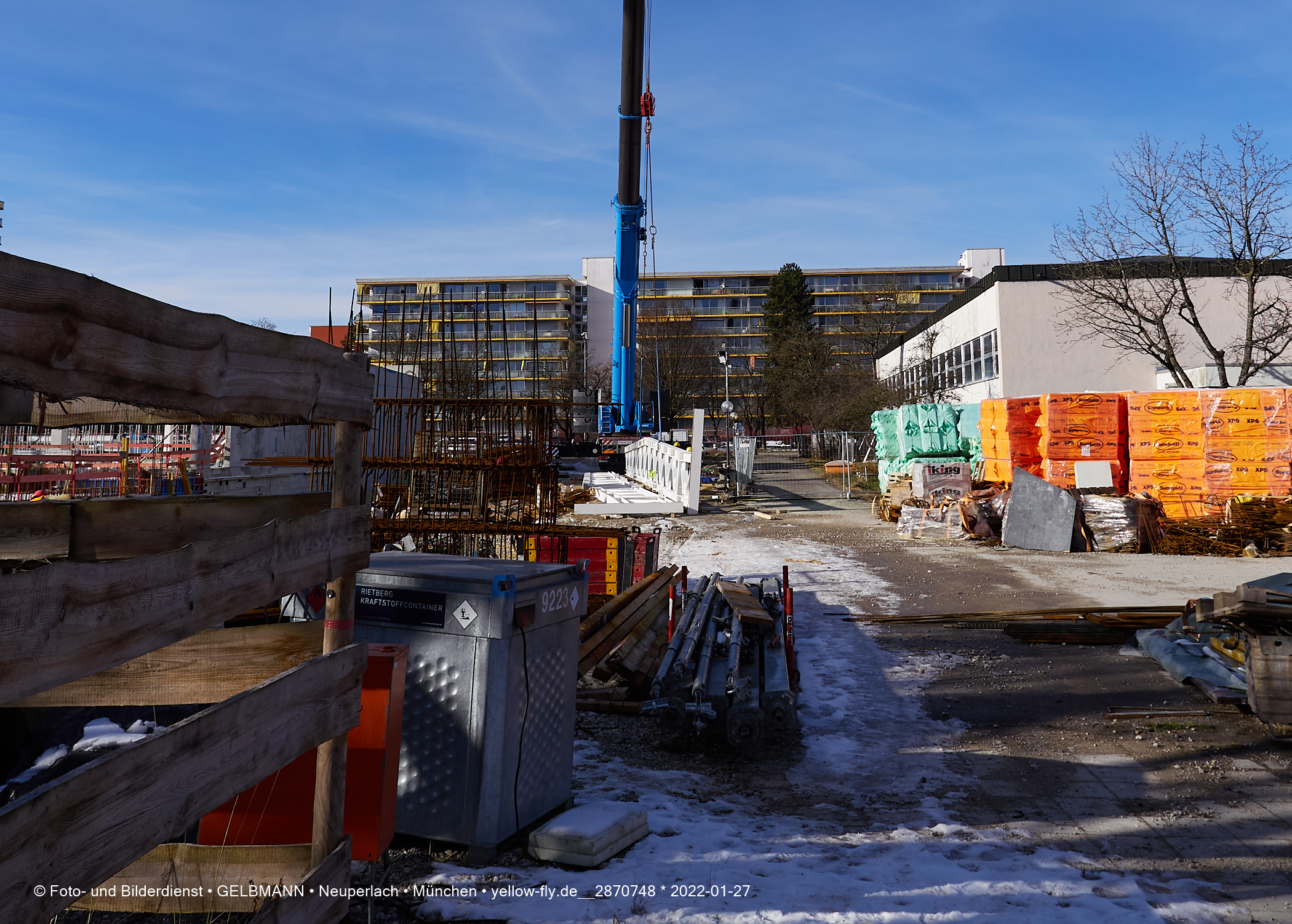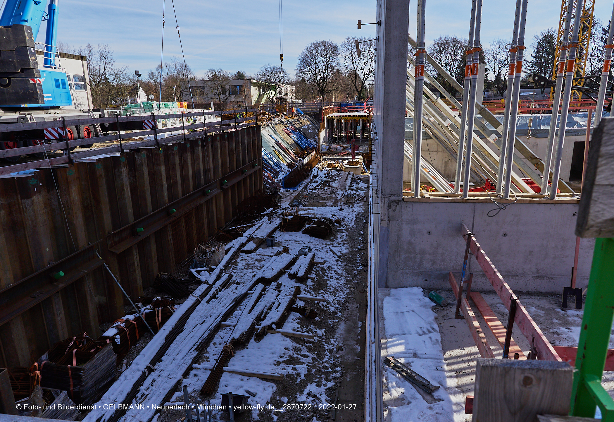 Durch die großen Wandplatten, welche von einem mobilen Karan an die entsprechenden Stellen gehoben werden, wächst die Sporthalle enorm schnell in die Höhe. Schon wird, wie in meinem nächsten Bericht vom 27./28.01.2022 zu sehen ist, an der Decke gearbeitet