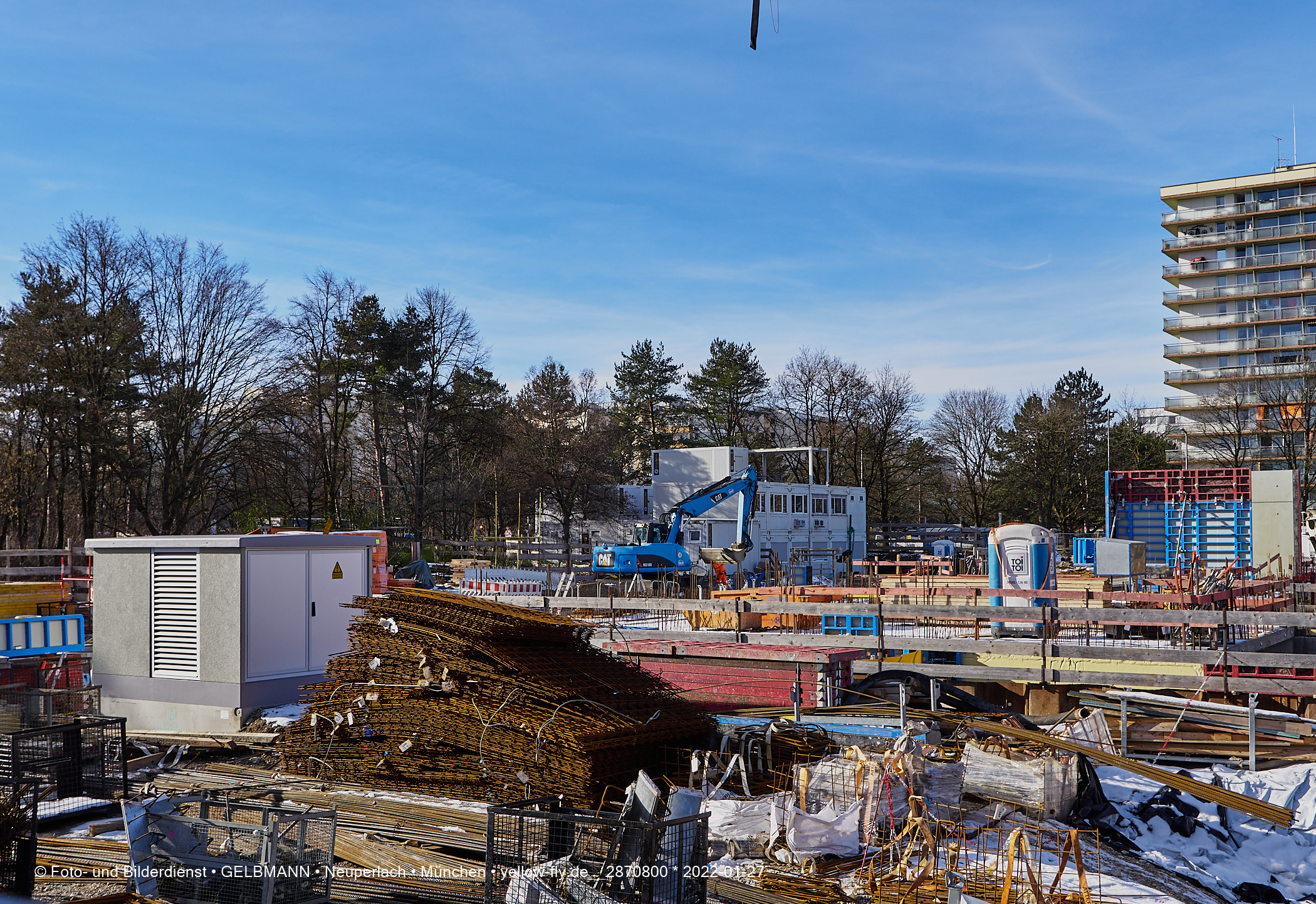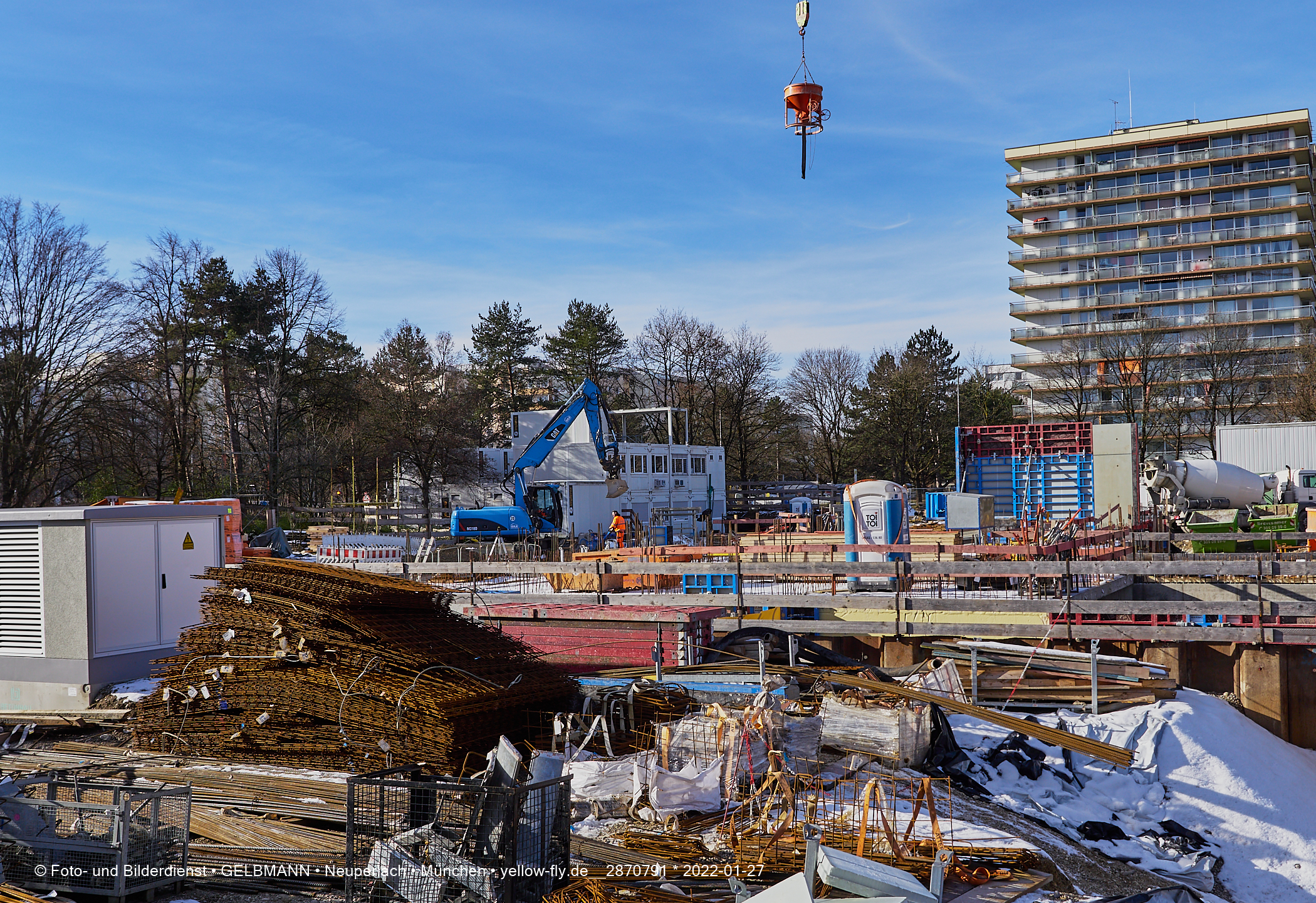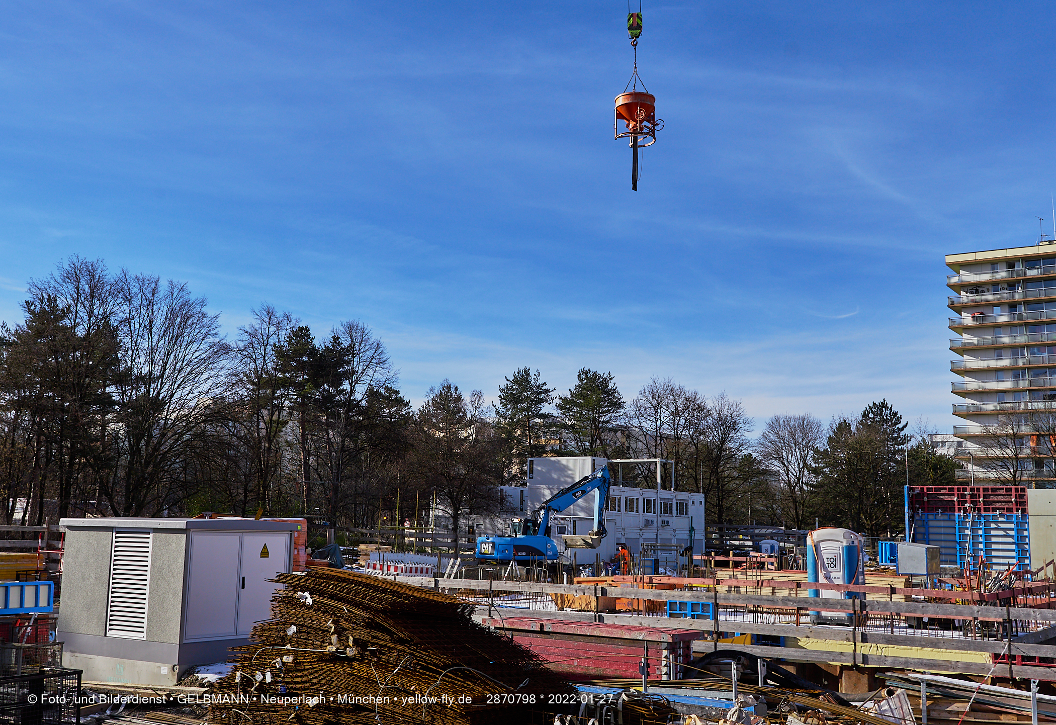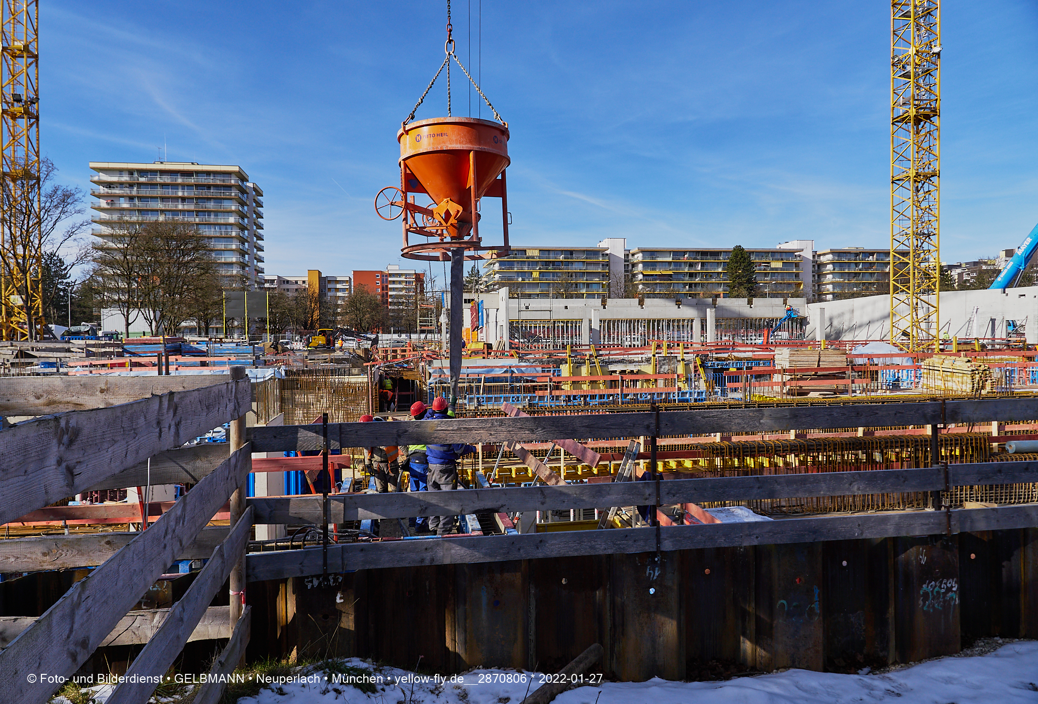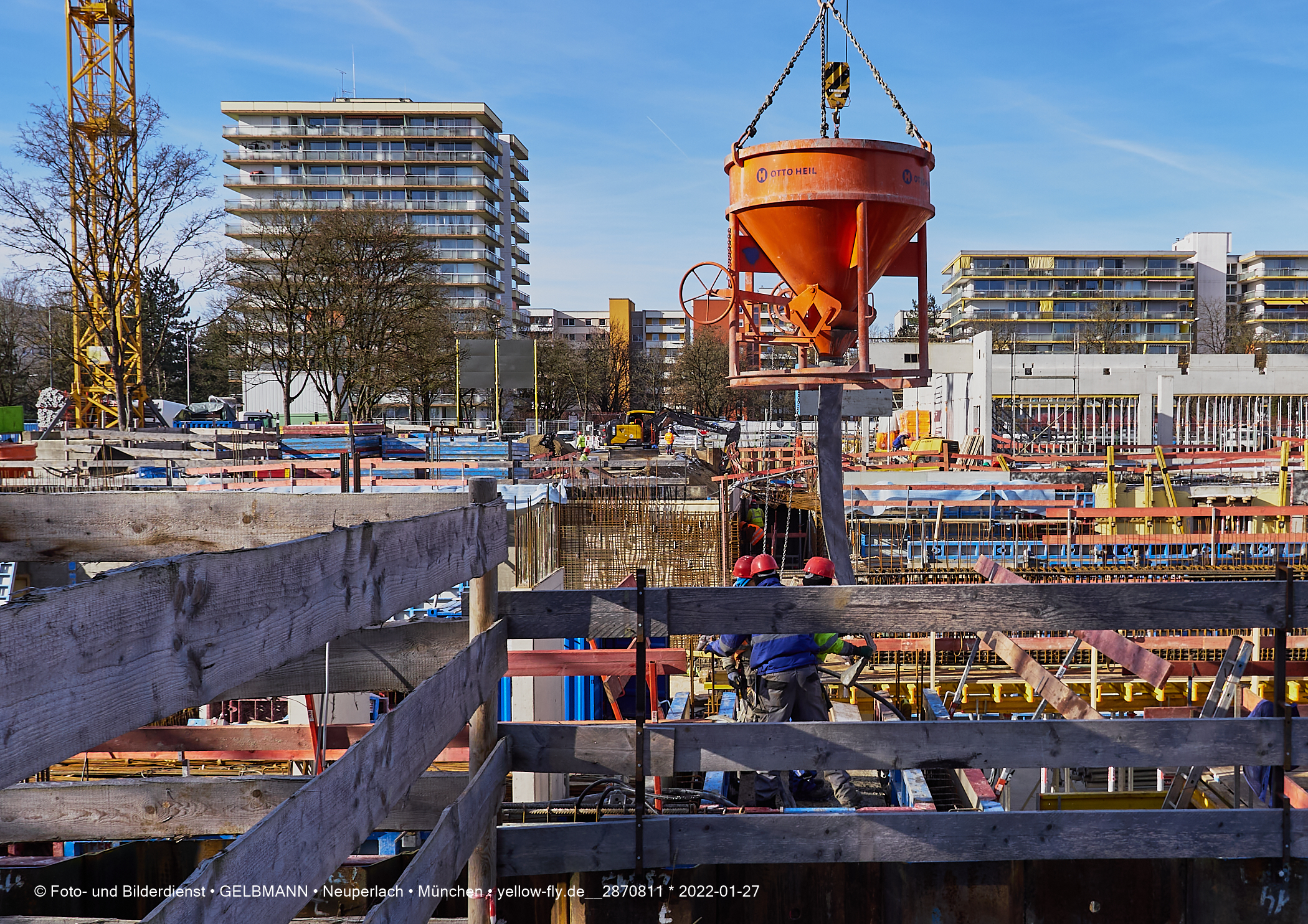 Durch die großen Wandplatten, welche von einem mobilen Karan an die entsprechenden Stellen gehoben werden, wächst die Sporthalle enorm schnell in die Höhe. Schon wird, wie in meinem nächsten Bericht vom 27./28.01.2022 zu sehen ist, an der Decke gearbeitet