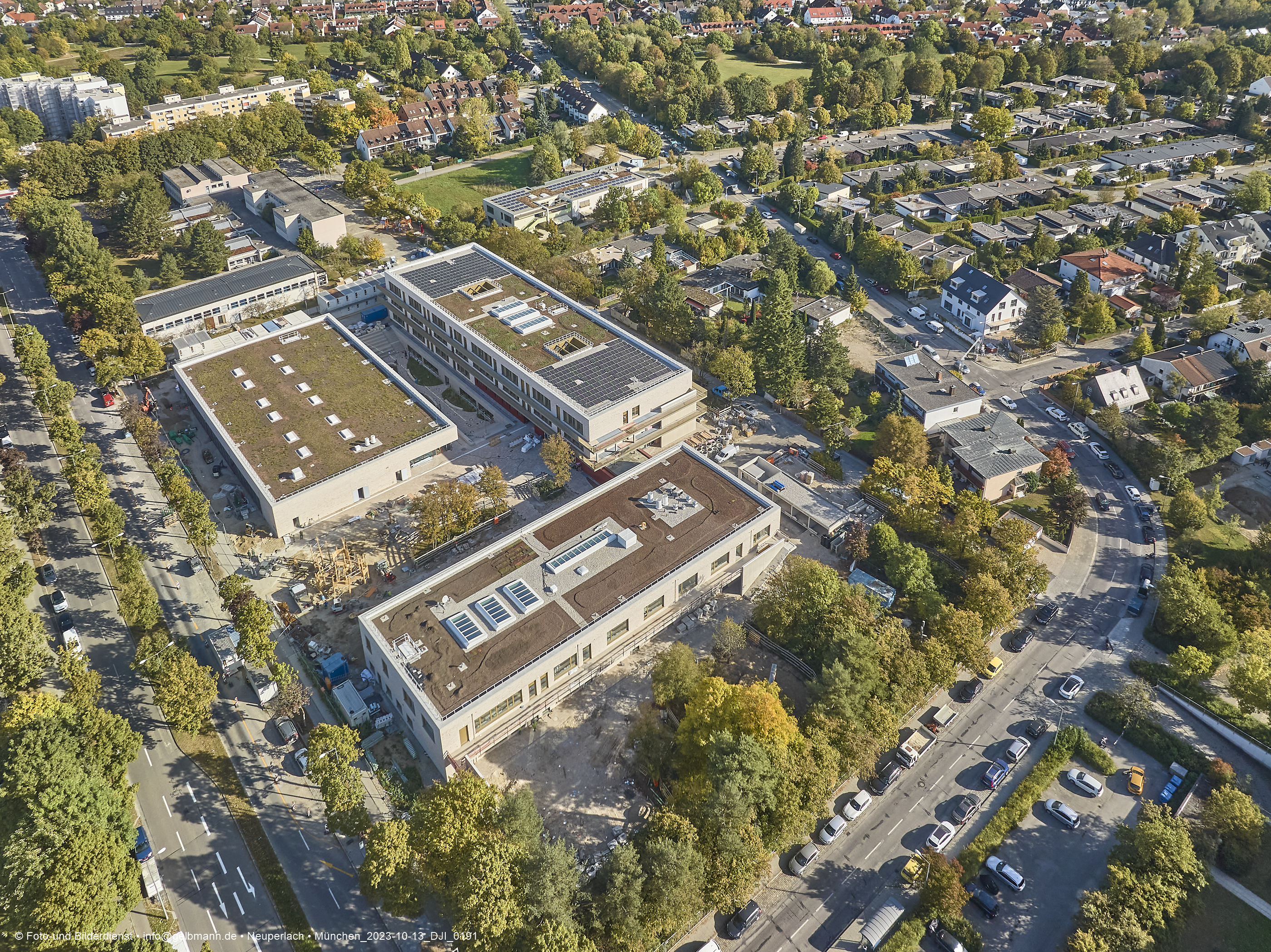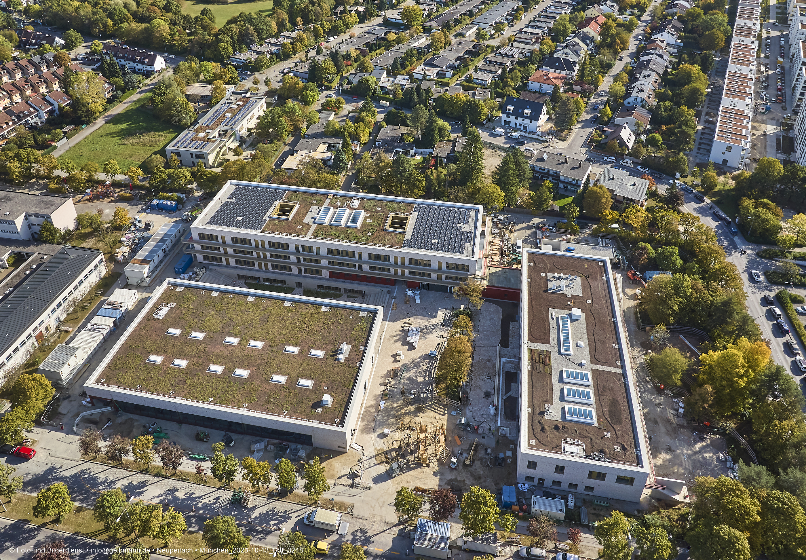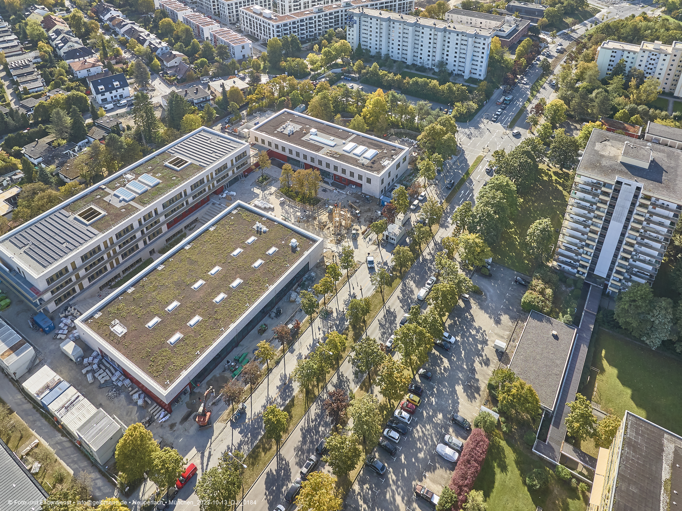 Aktuelle Luftbilder von der Baustelle zur Grundschule am Karl-Marx-Ring in Neuperlach. Immer wenigen Gerüstteile sind an dem Klinkerbau zu sehen.