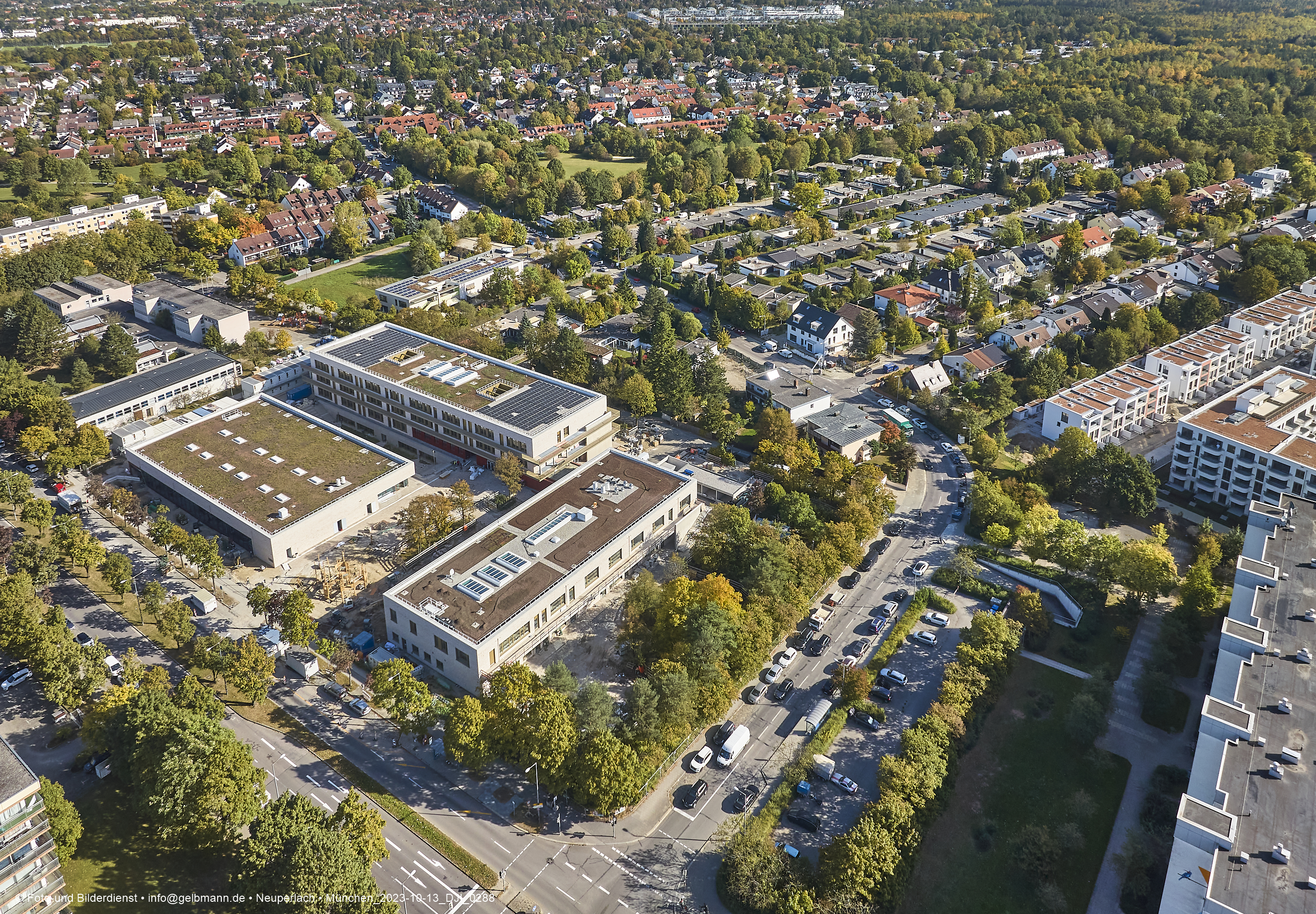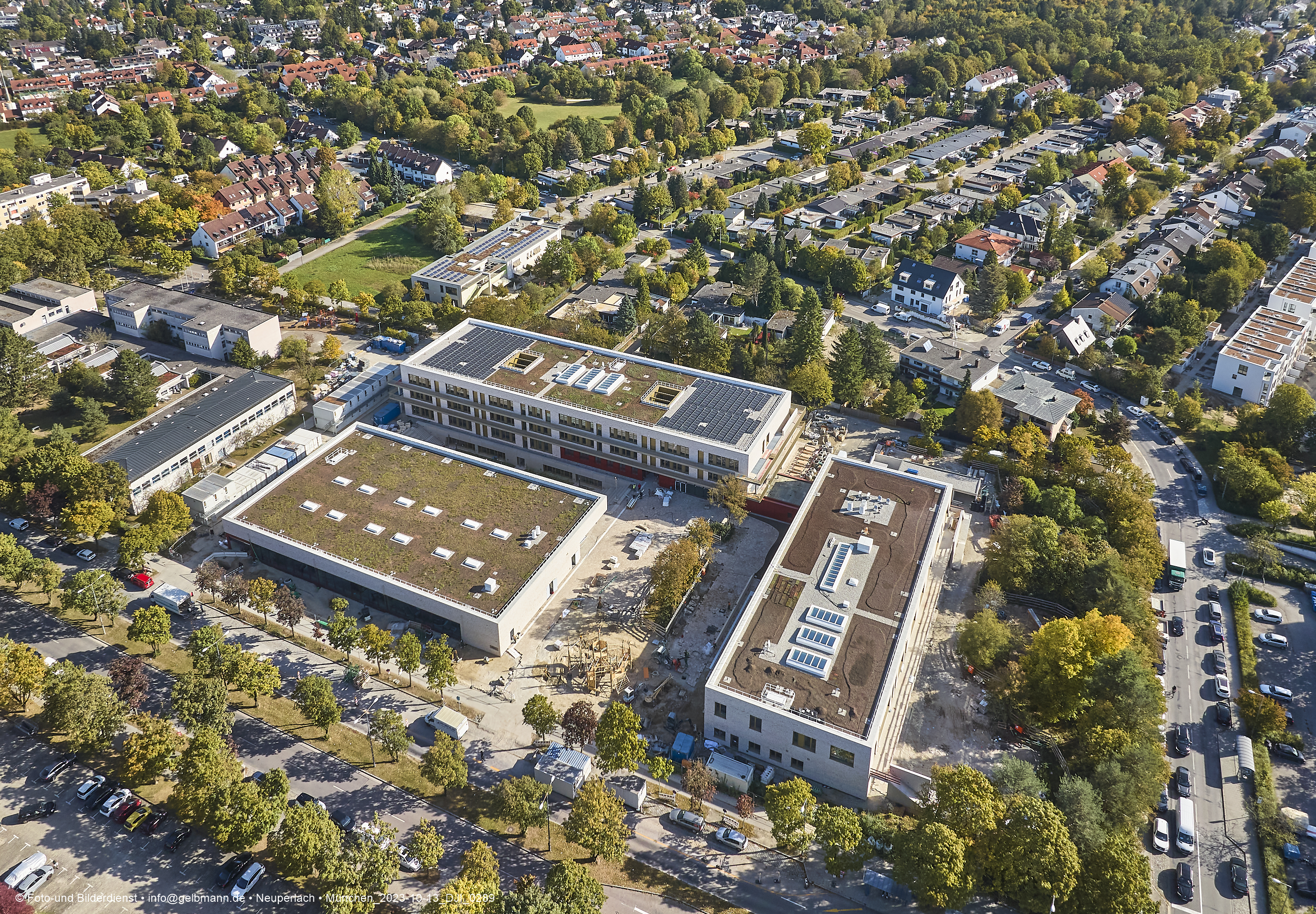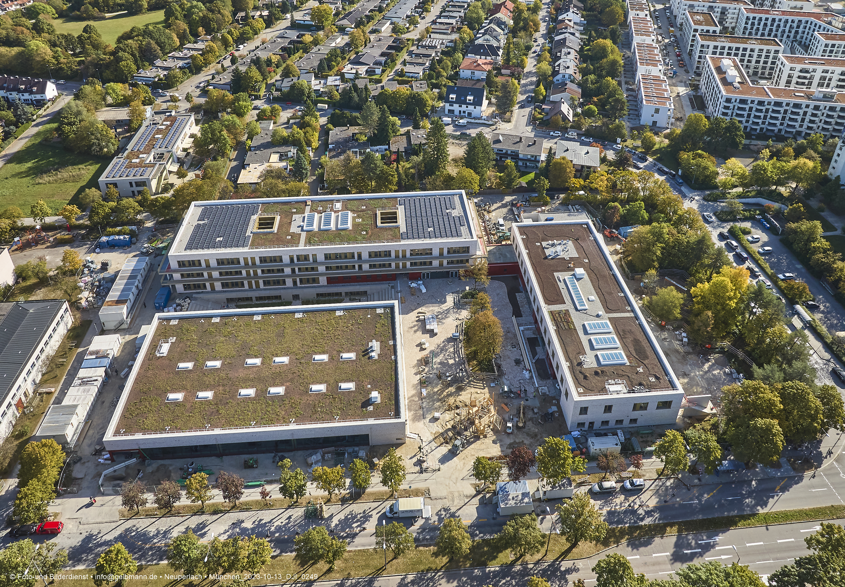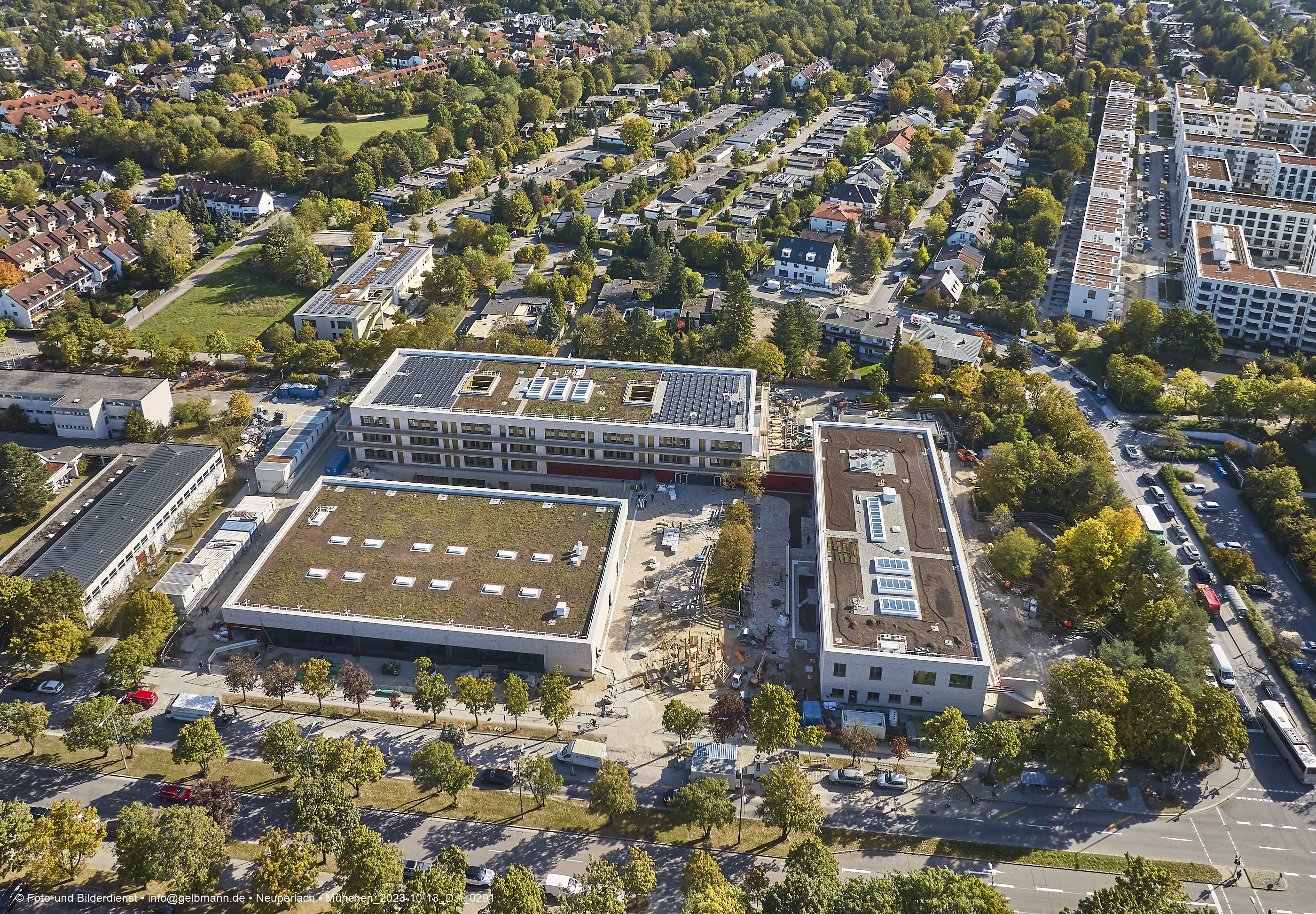 Aktuelle Luftbilder von der Baustelle zur Grundschule am Karl-Marx-Ring in Neuperlach. Immer wenigen Gerüstteile sind an dem Klinkerbau zu sehen.