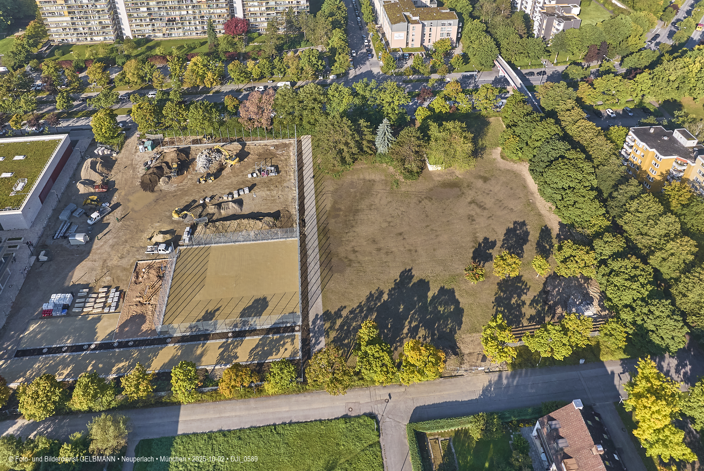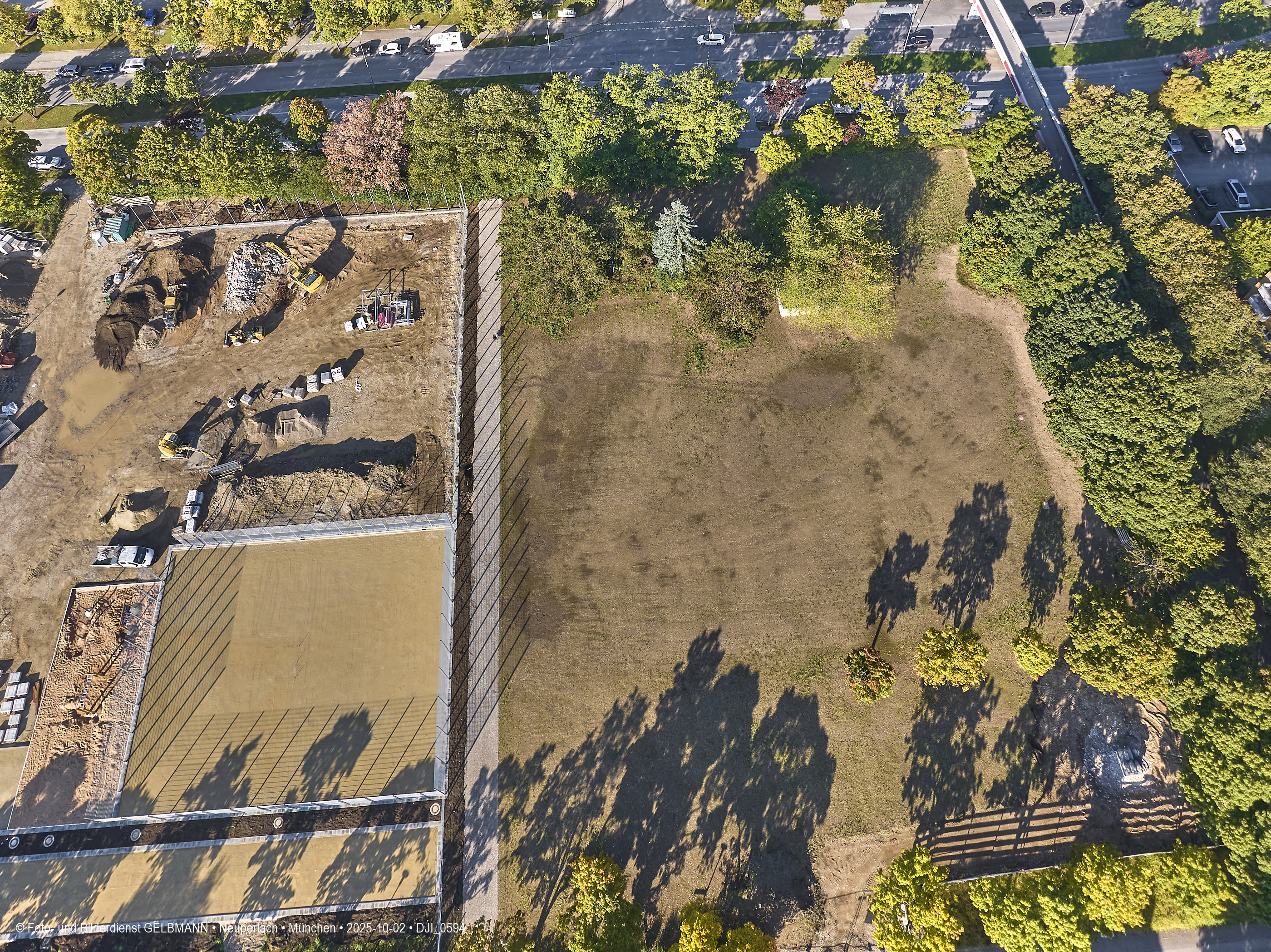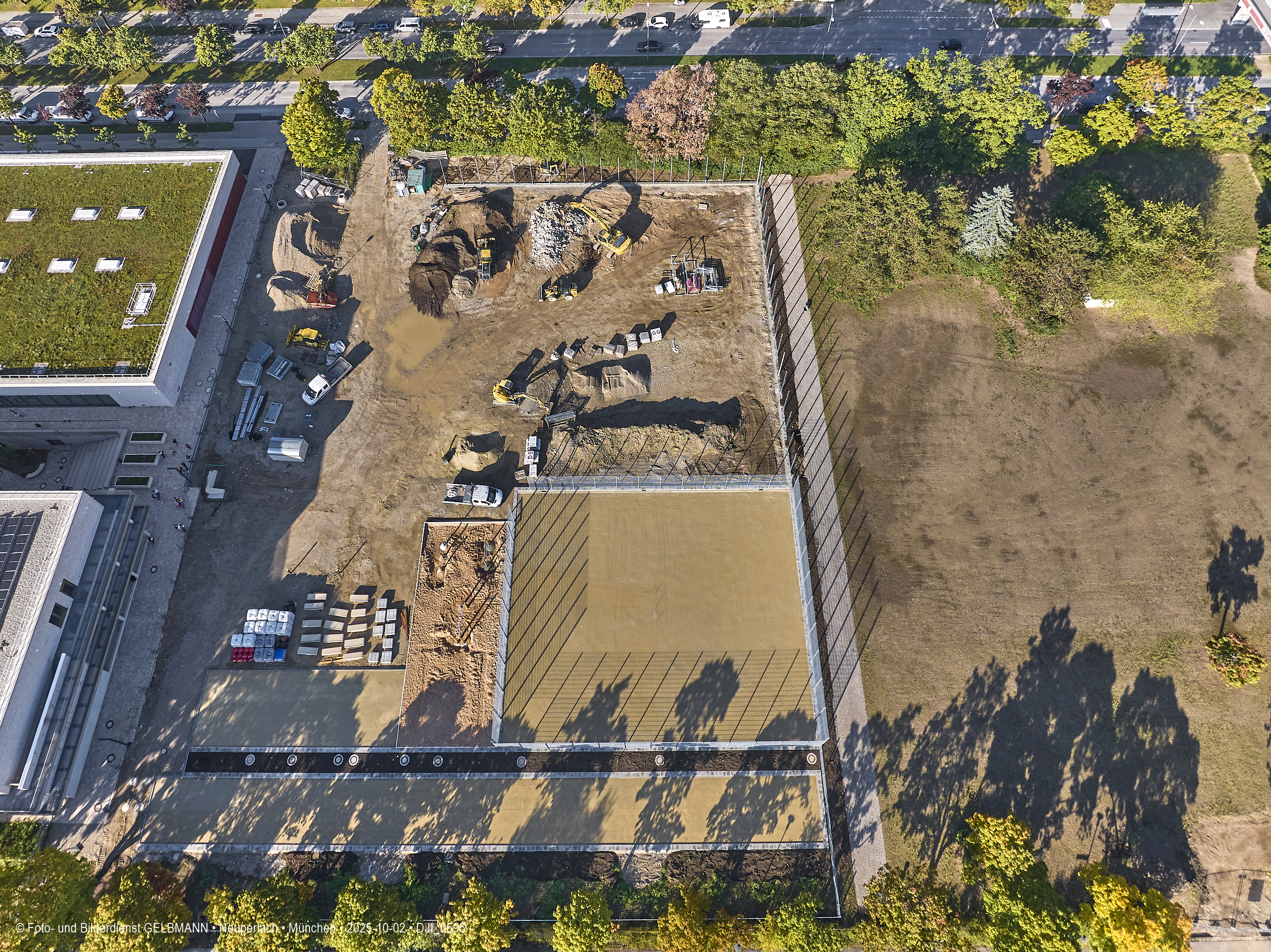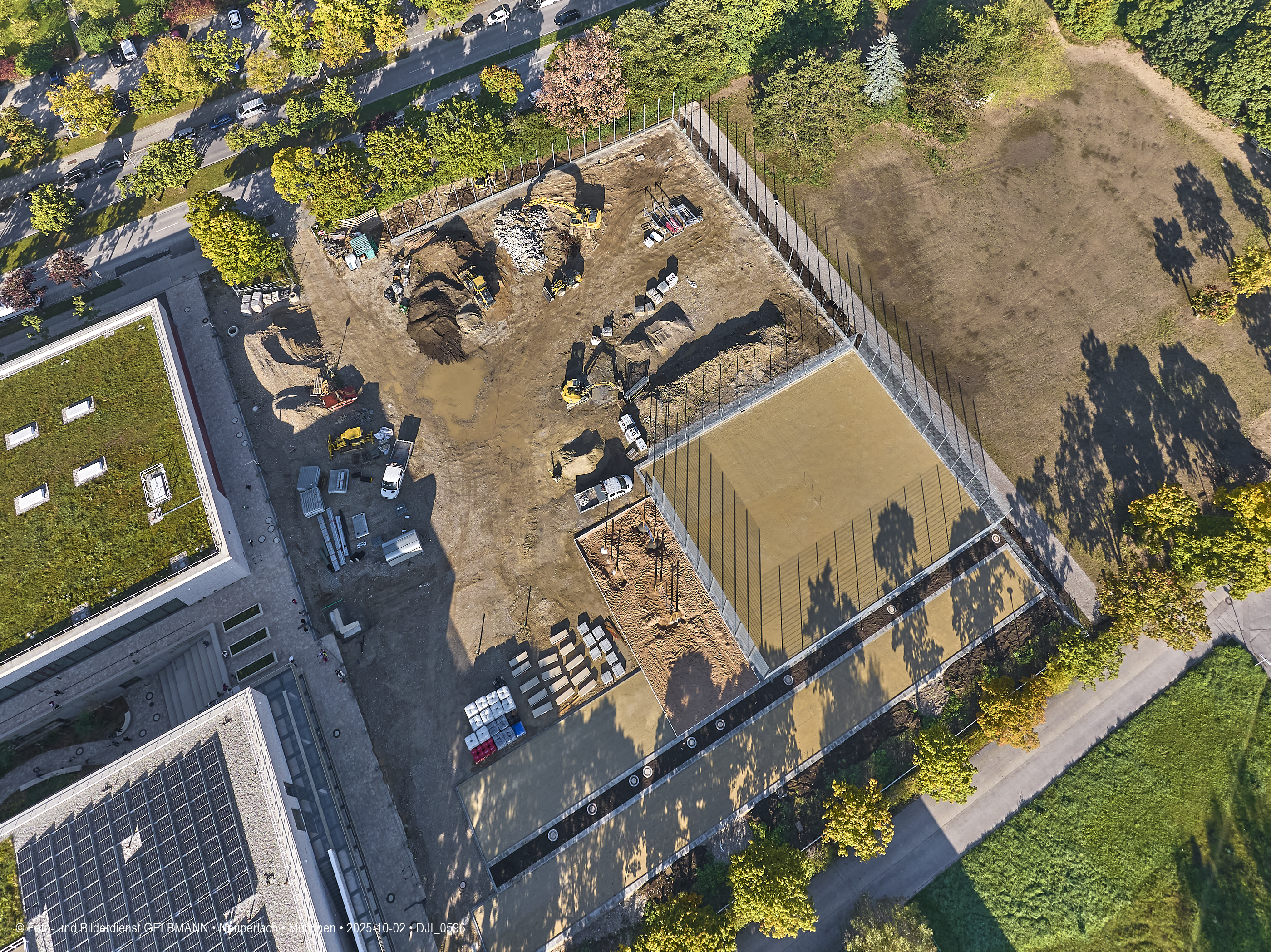 Ein kleiner Teil des neuen Sportplatzes bekommt einen Zaun. Aus der Luft ist dies gut zu sehen. Es sind verschiedene Sport-Areal für diverse Sportarten zu sehen.