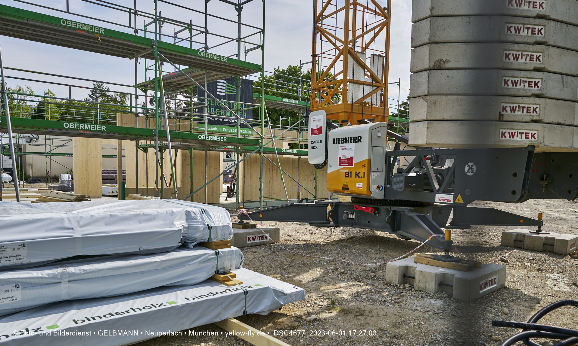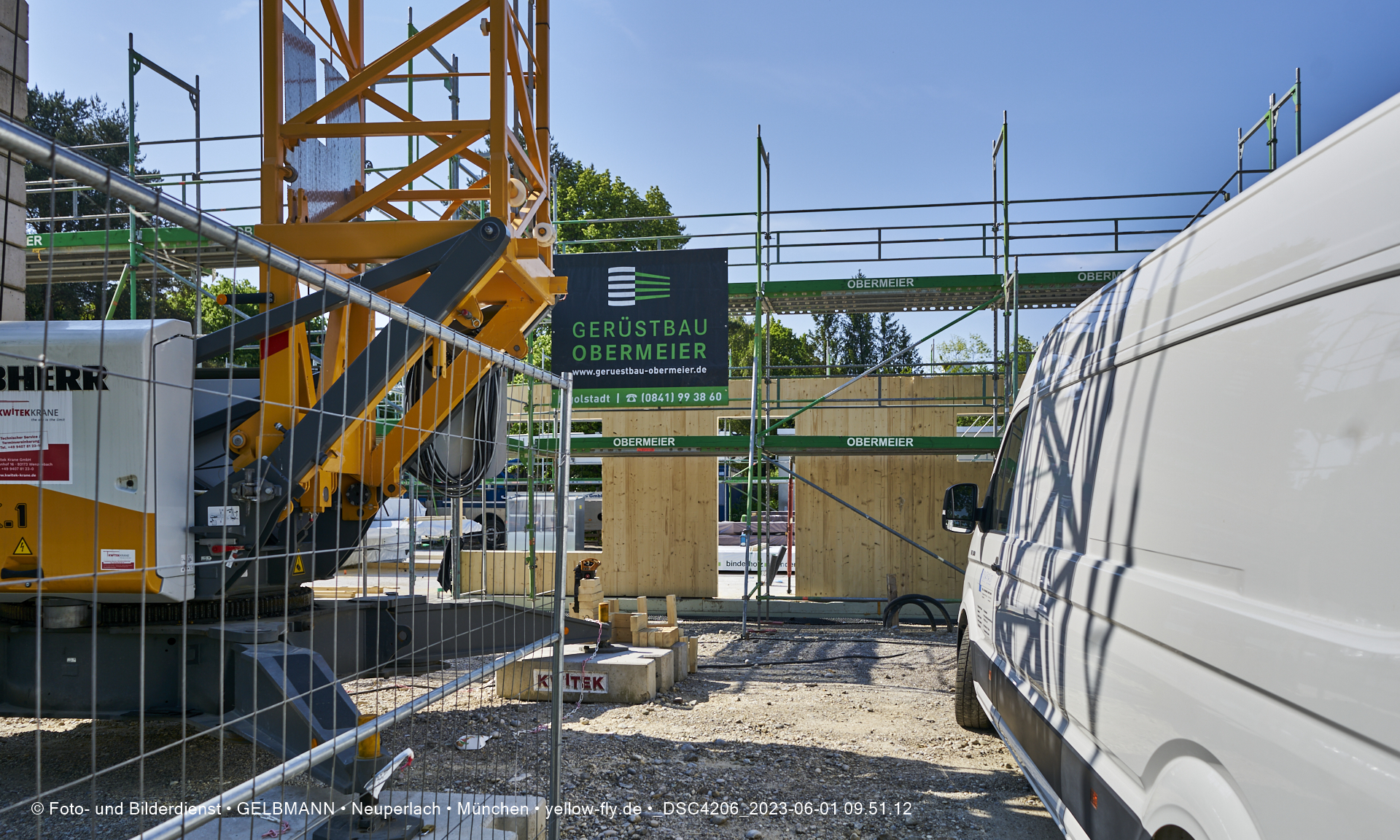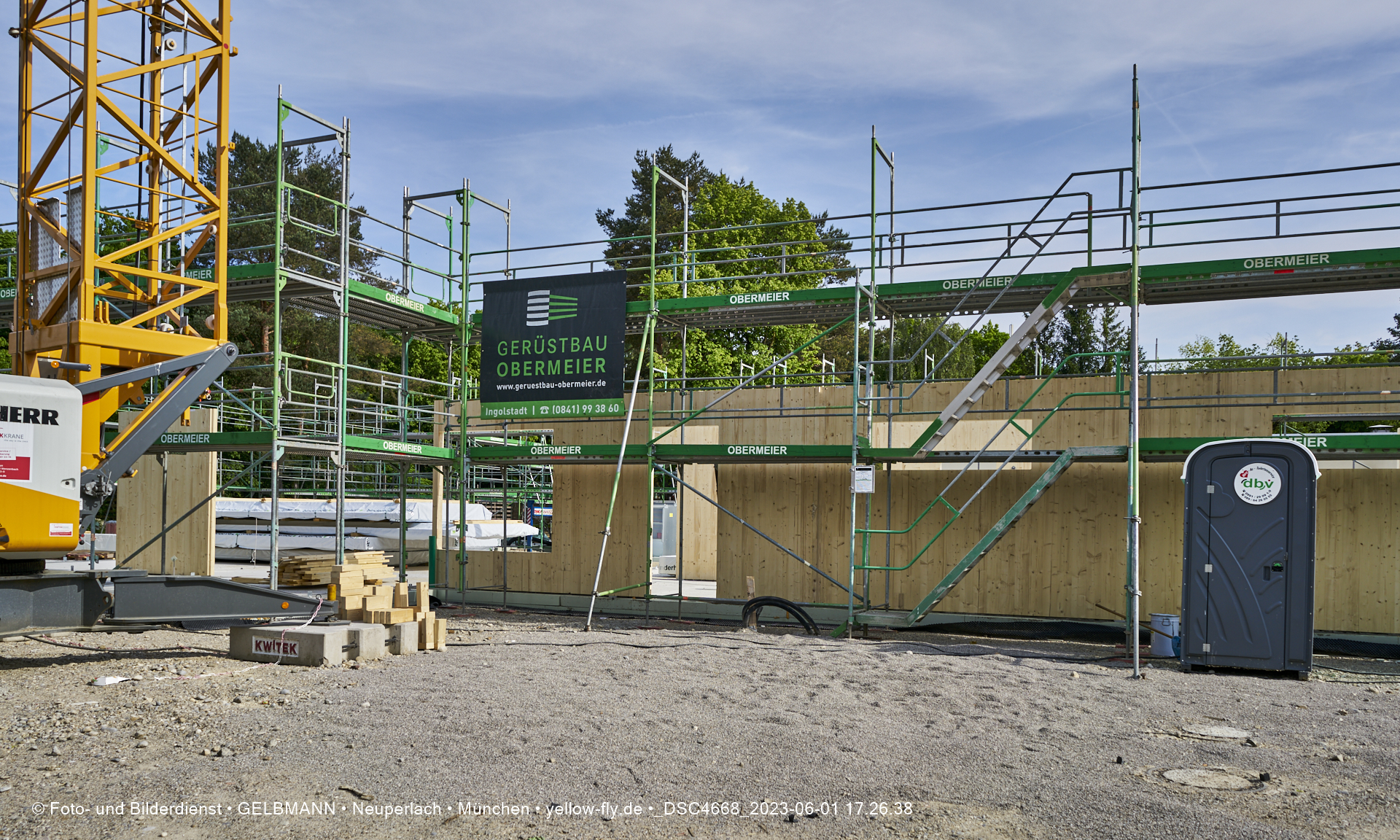 Daher ist auch schon das Gerüst aufgestellt worden, damit die Wandelemente von außen miteinander verbunden werden können.