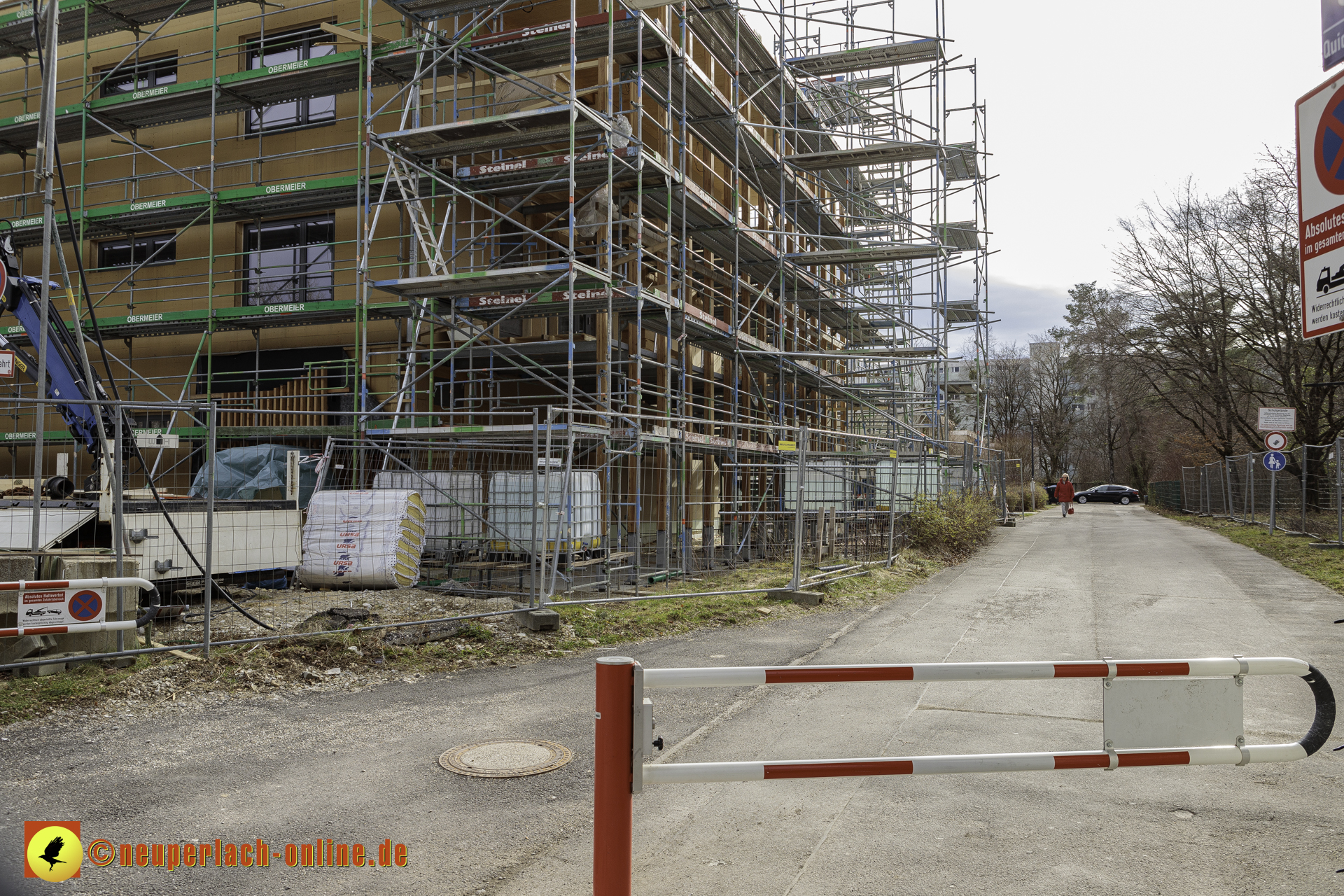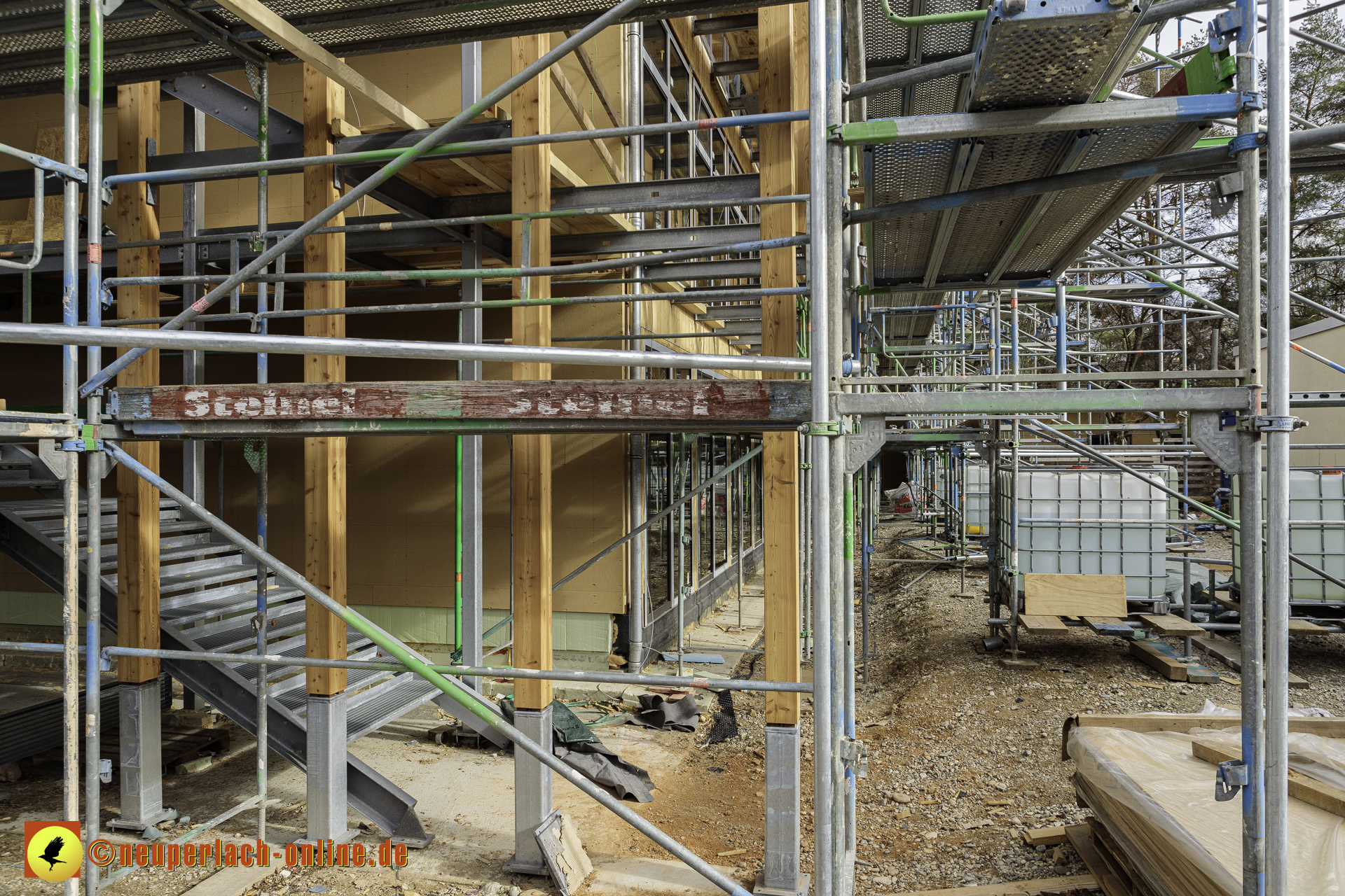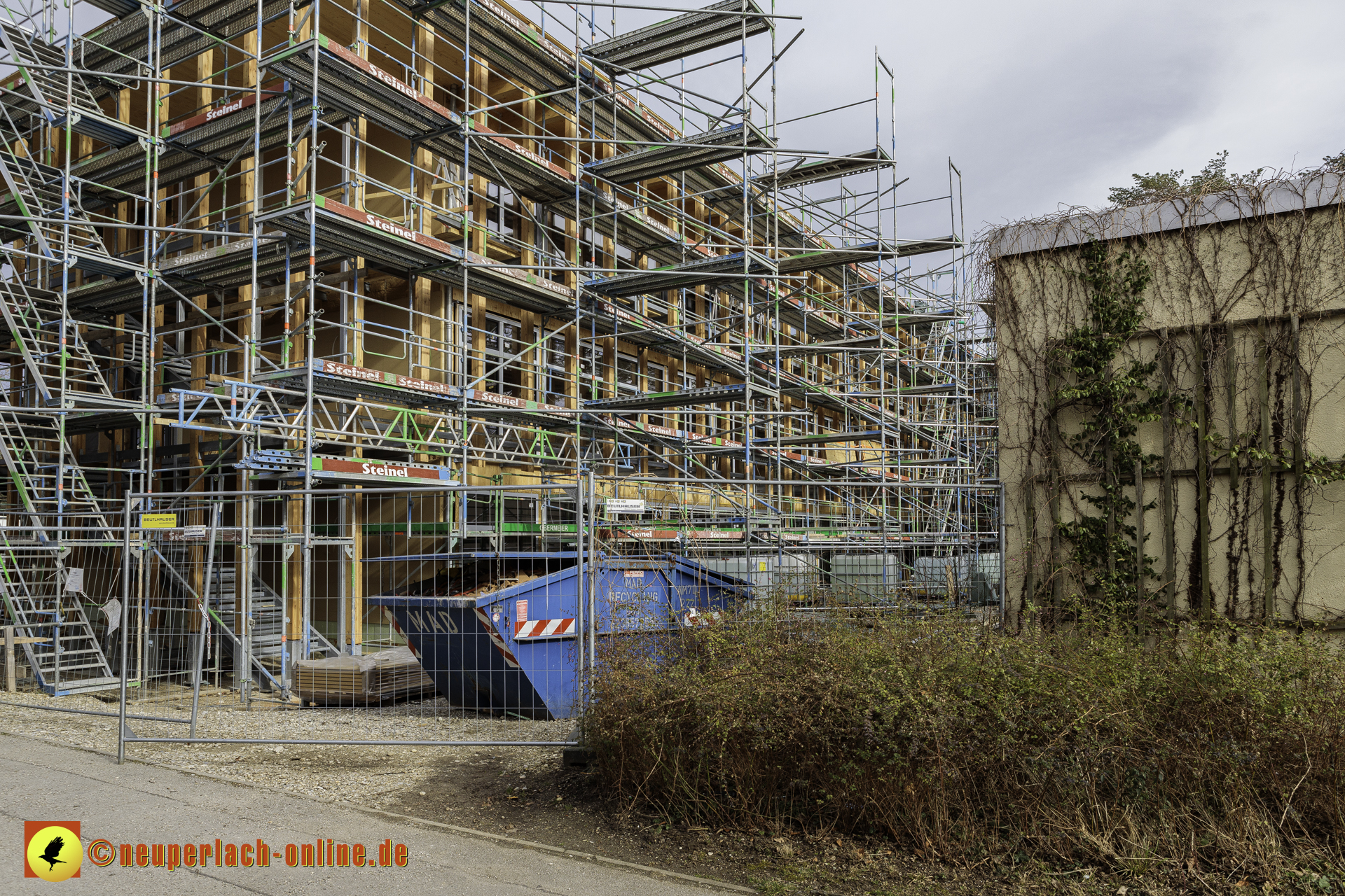 Diese Teile werden aus Fertigelementen zusammengesetzt. Daher ist auch schon das Gerüst aufgestellt worden, damit die Wandelemente von außen miteinander verbunden werden können. Was ich bisher sehen konnte, hat mir sehr gut gefallen.