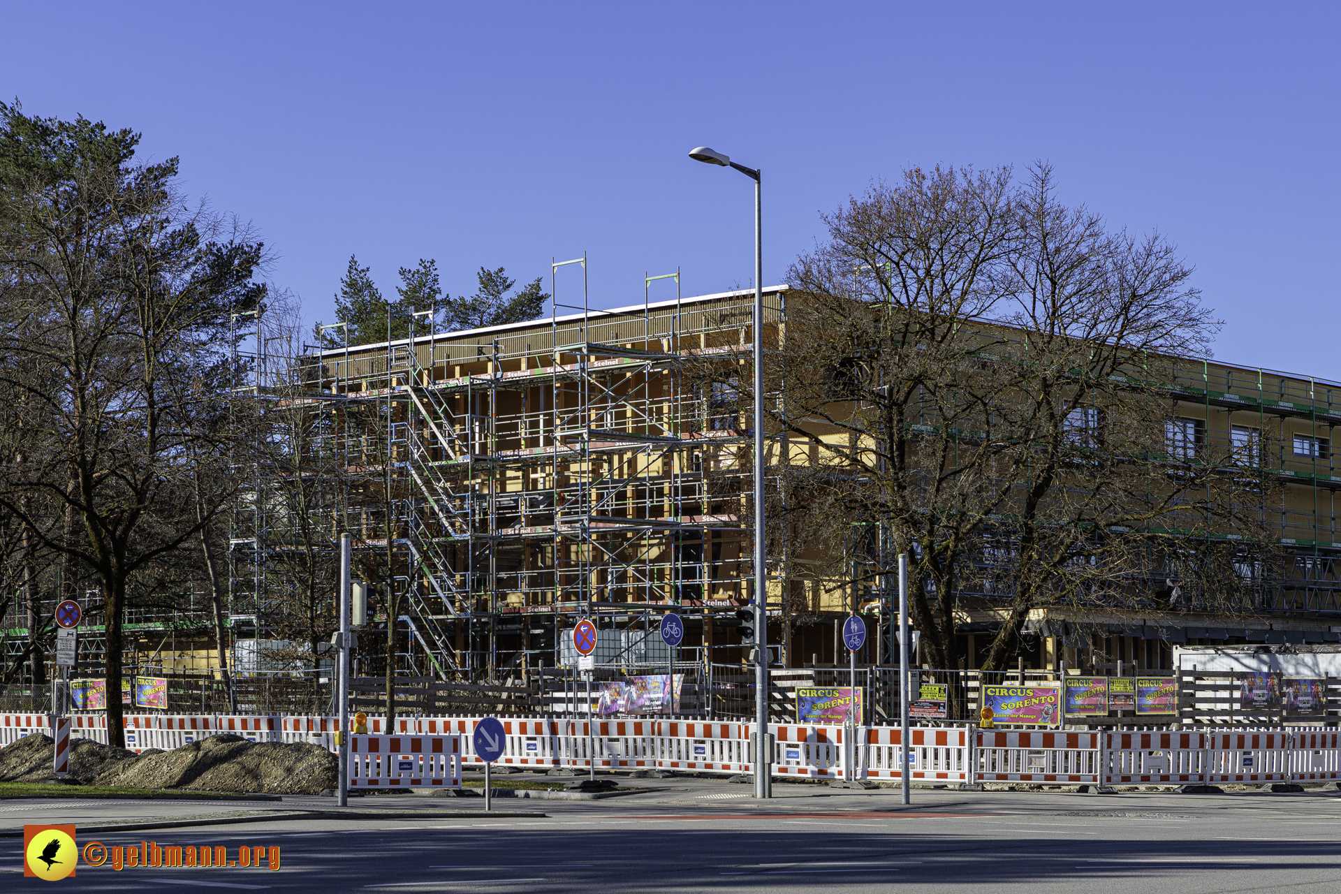 dort schon einige Holzwände. Ende August soll der Rohbau fertig an der Quiddestraße stehen.
