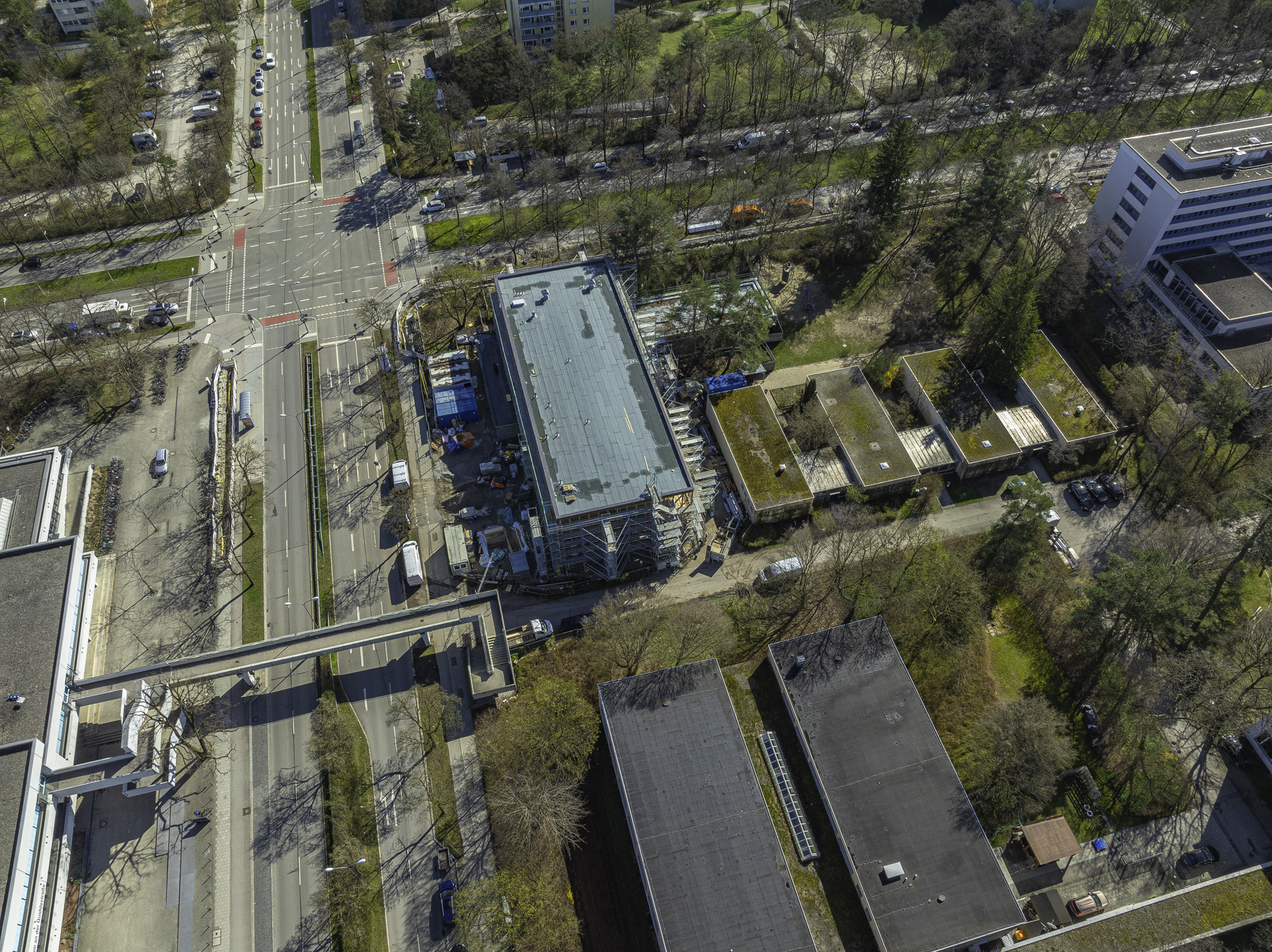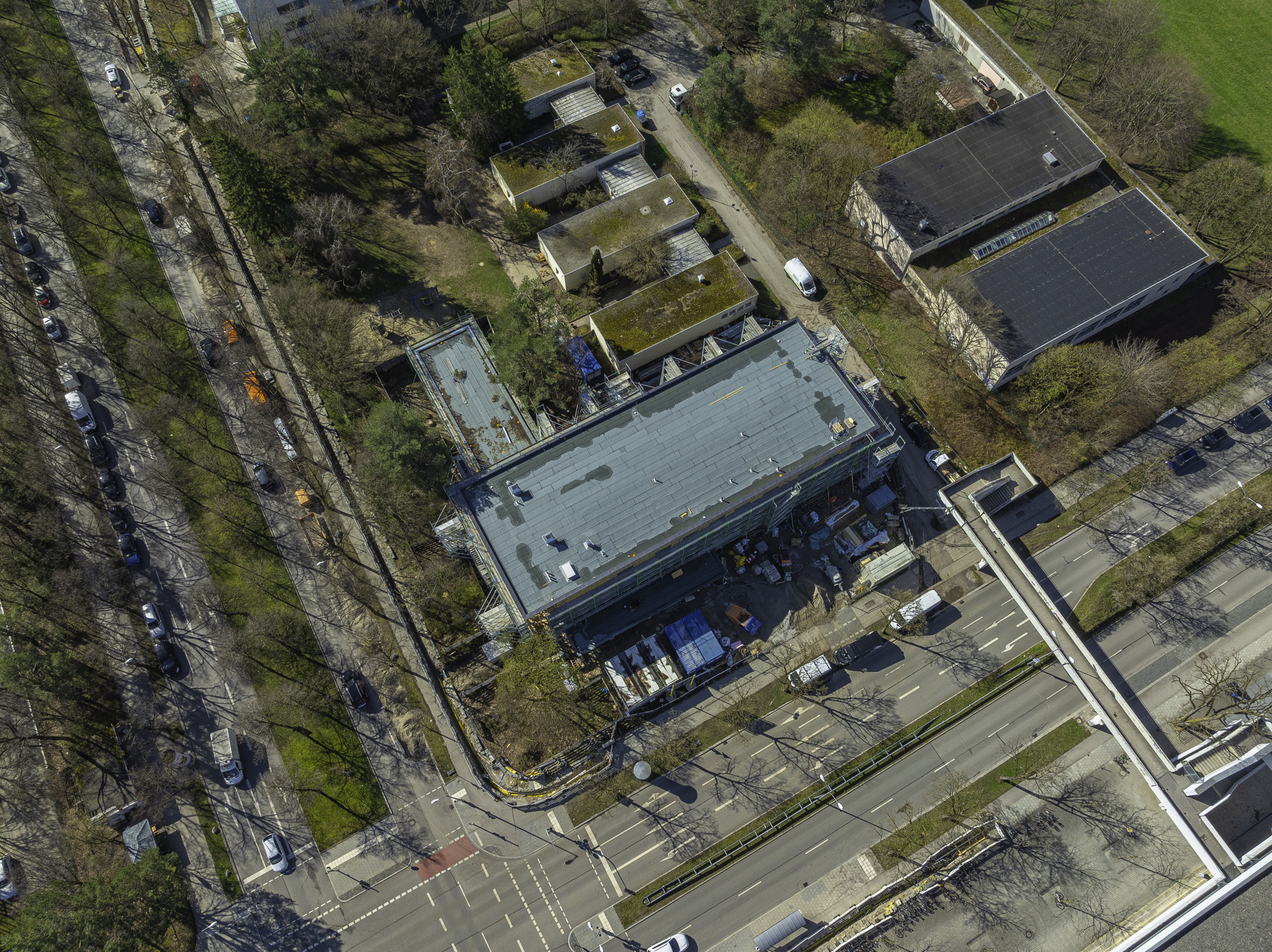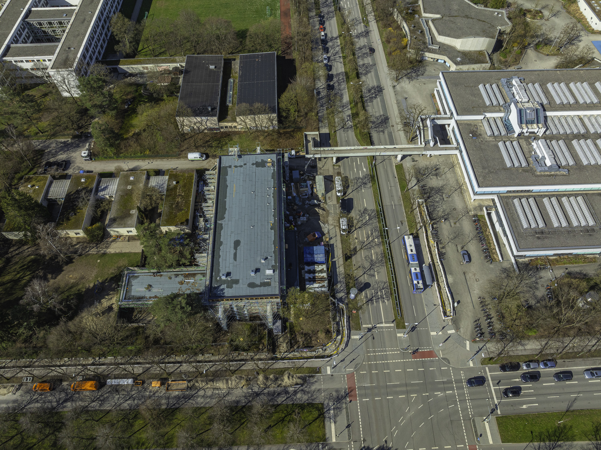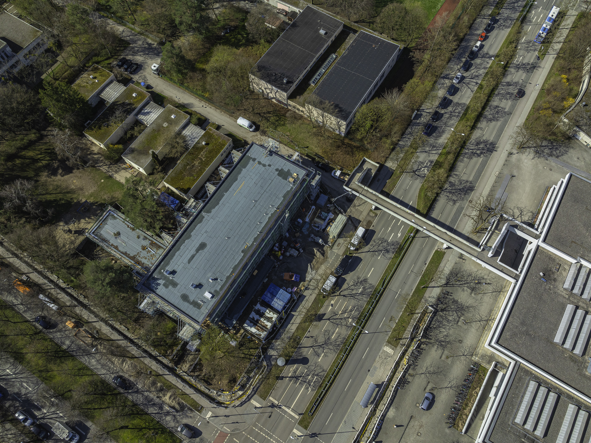 Nur aus der Luft ist der rasante Fortschritt der Wandaufstellung zu erkennen. An einigen Stellen ist das Dach schon über einige Räumen montiert.