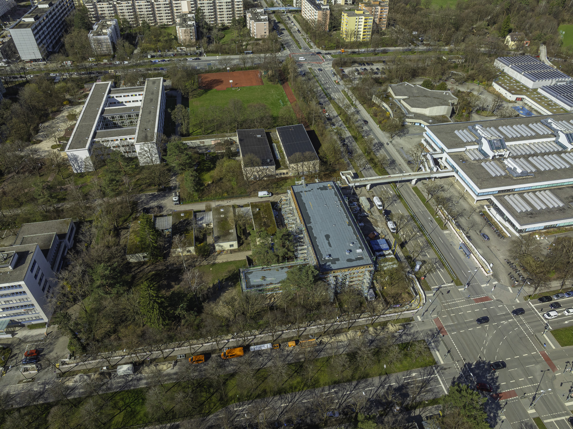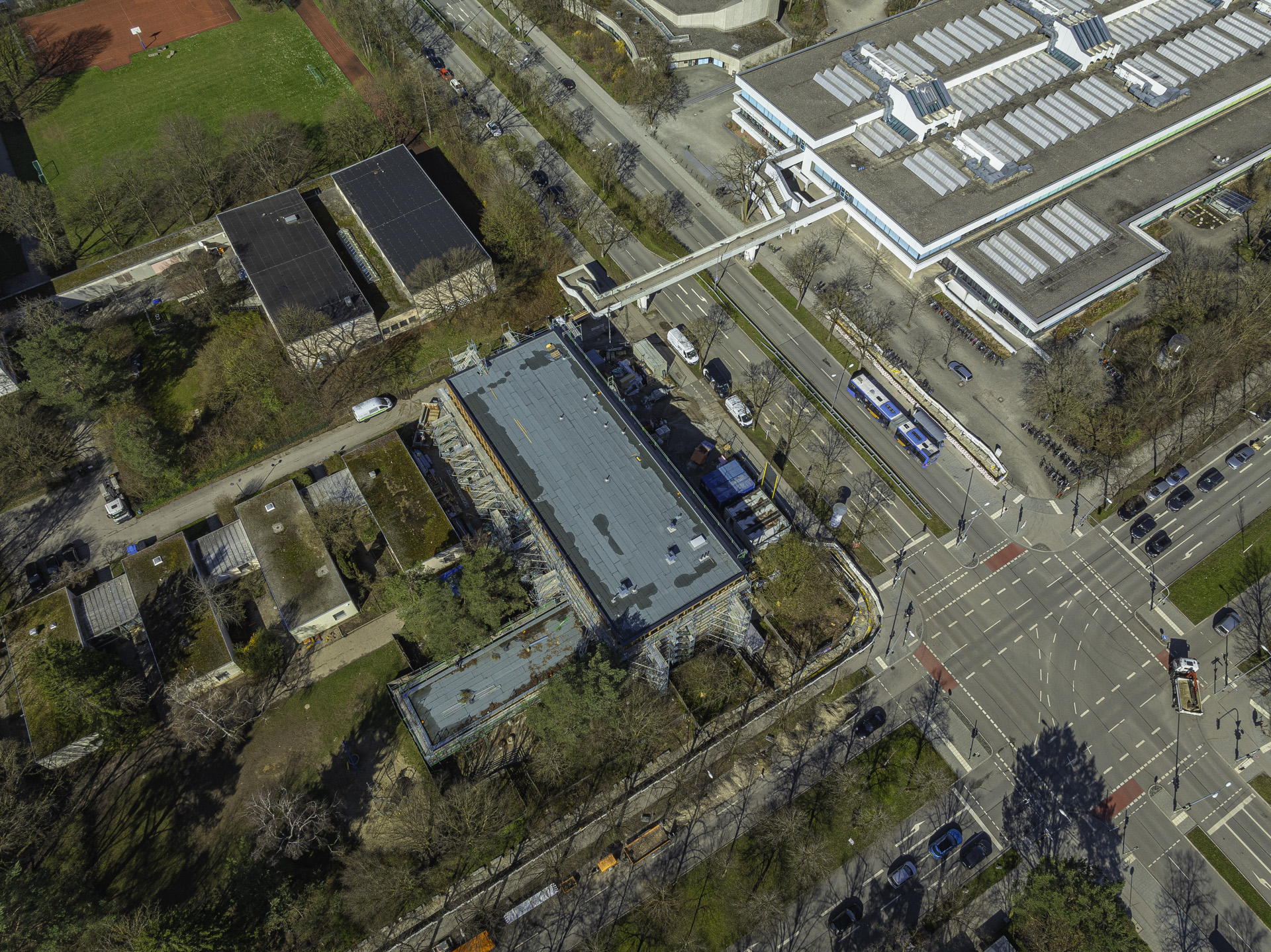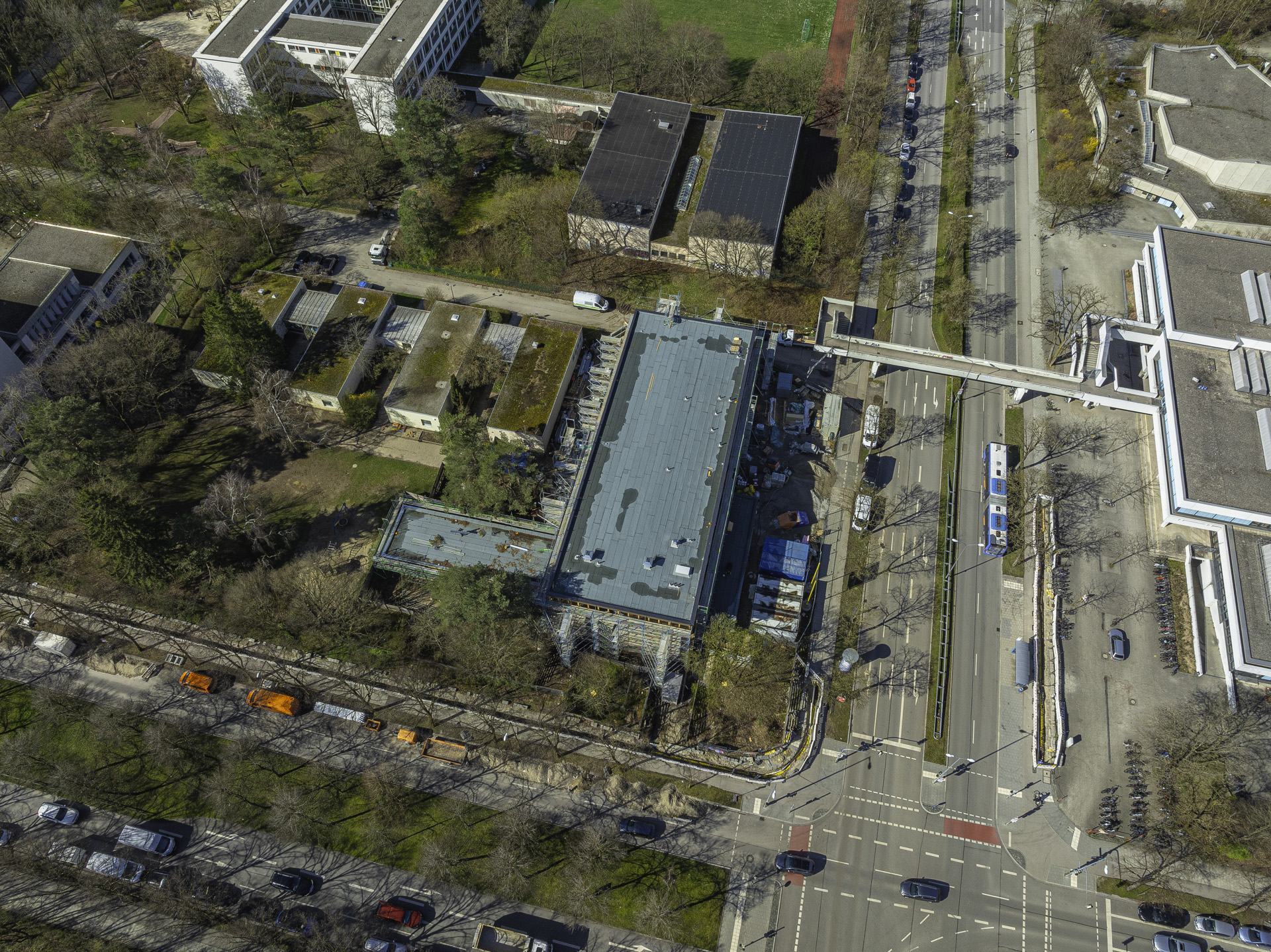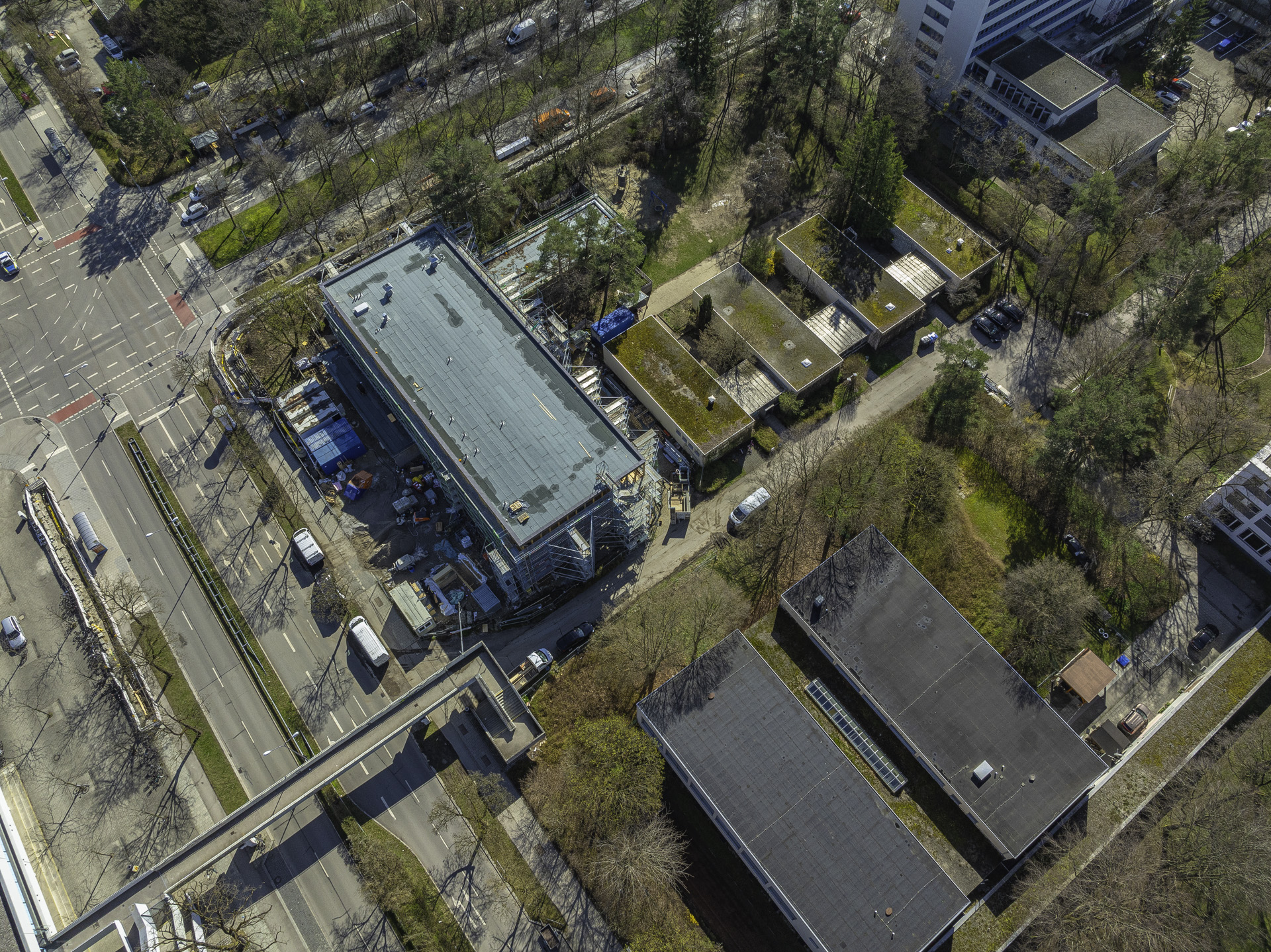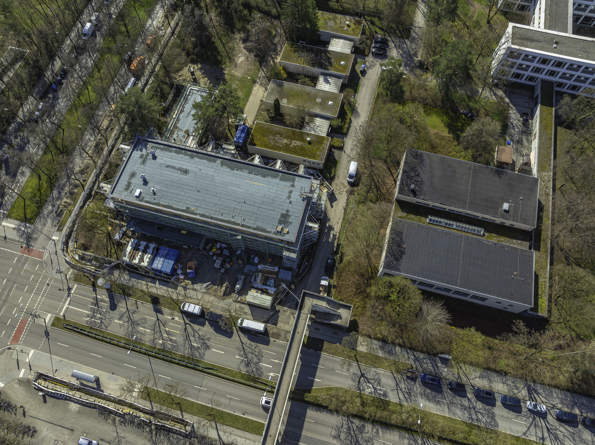 Nur aus der Luft ist der rasante Fortschritt der Wandaufstellung zu erkennen. An einigen Stellen ist das Dach schon über einige Räumen montiert.