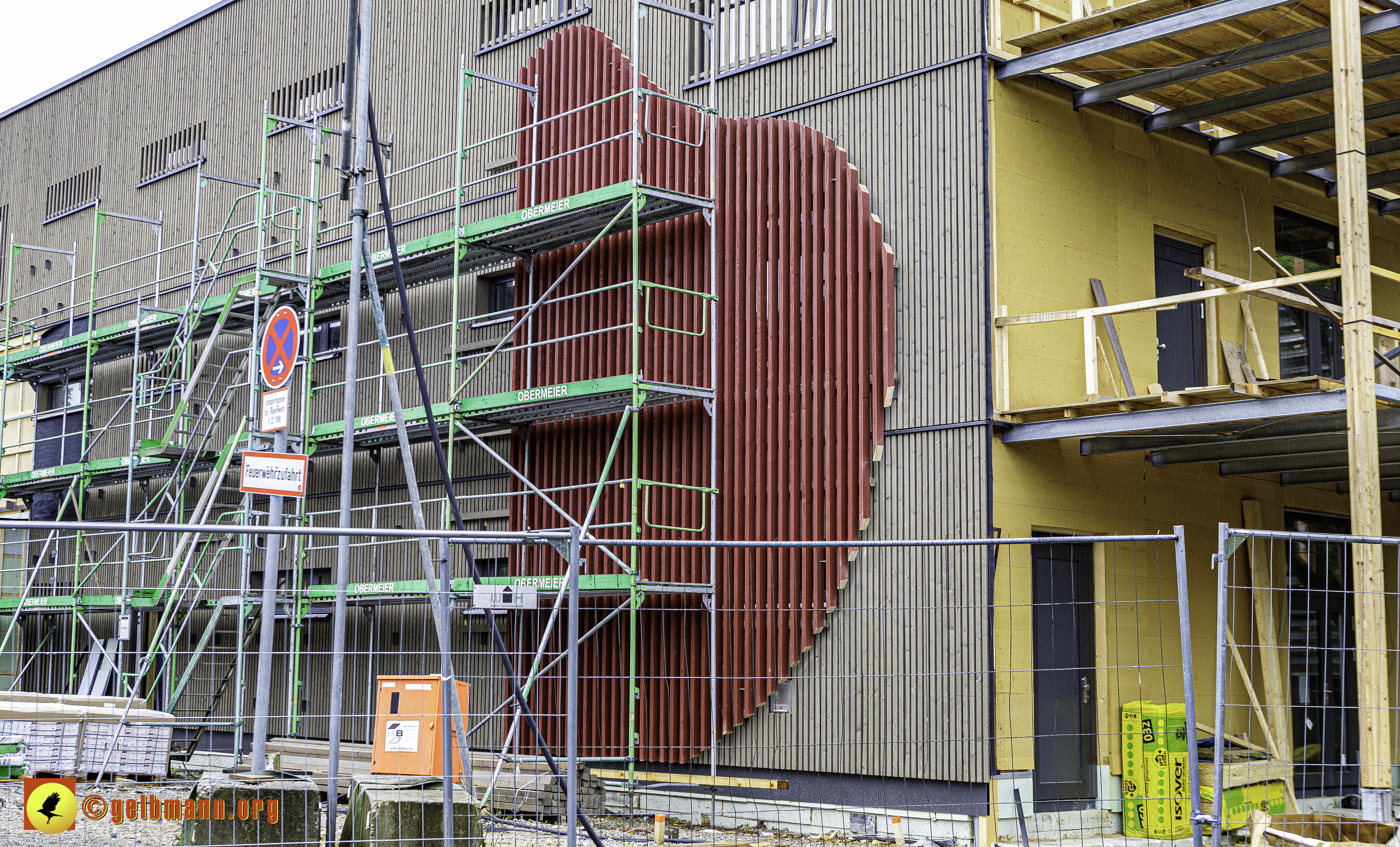 Daher ist auch schon das Gerüst aufgestellt worden, damit die Wandelemente von außen miteinander verbunden werden können.