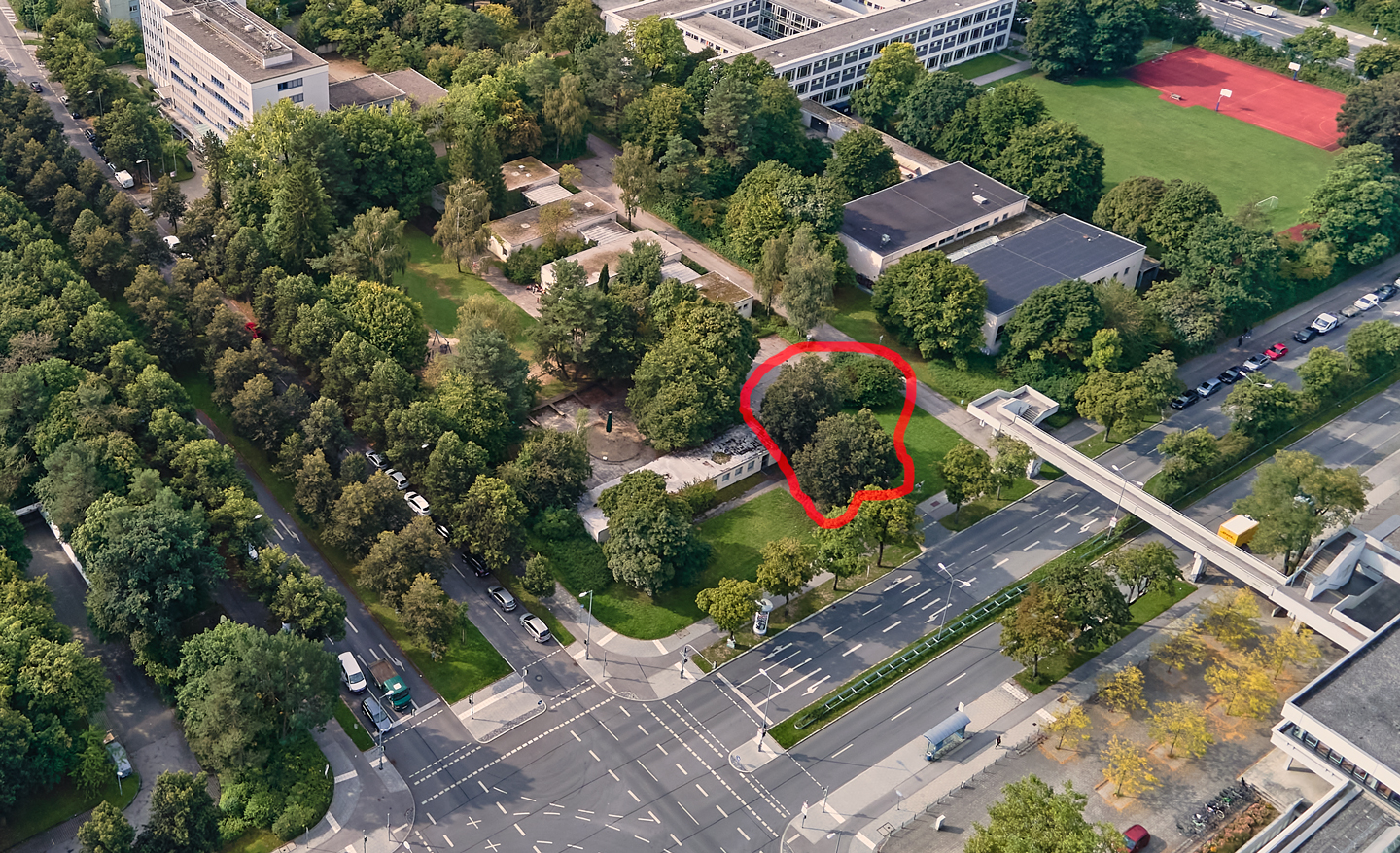 Die Vorbereitungen für den Abriss haben schon begonnen. Die Bäume rechts von dem Gebäude, in meinem Foto mit rotem Kreis, wurden schon entfernt.