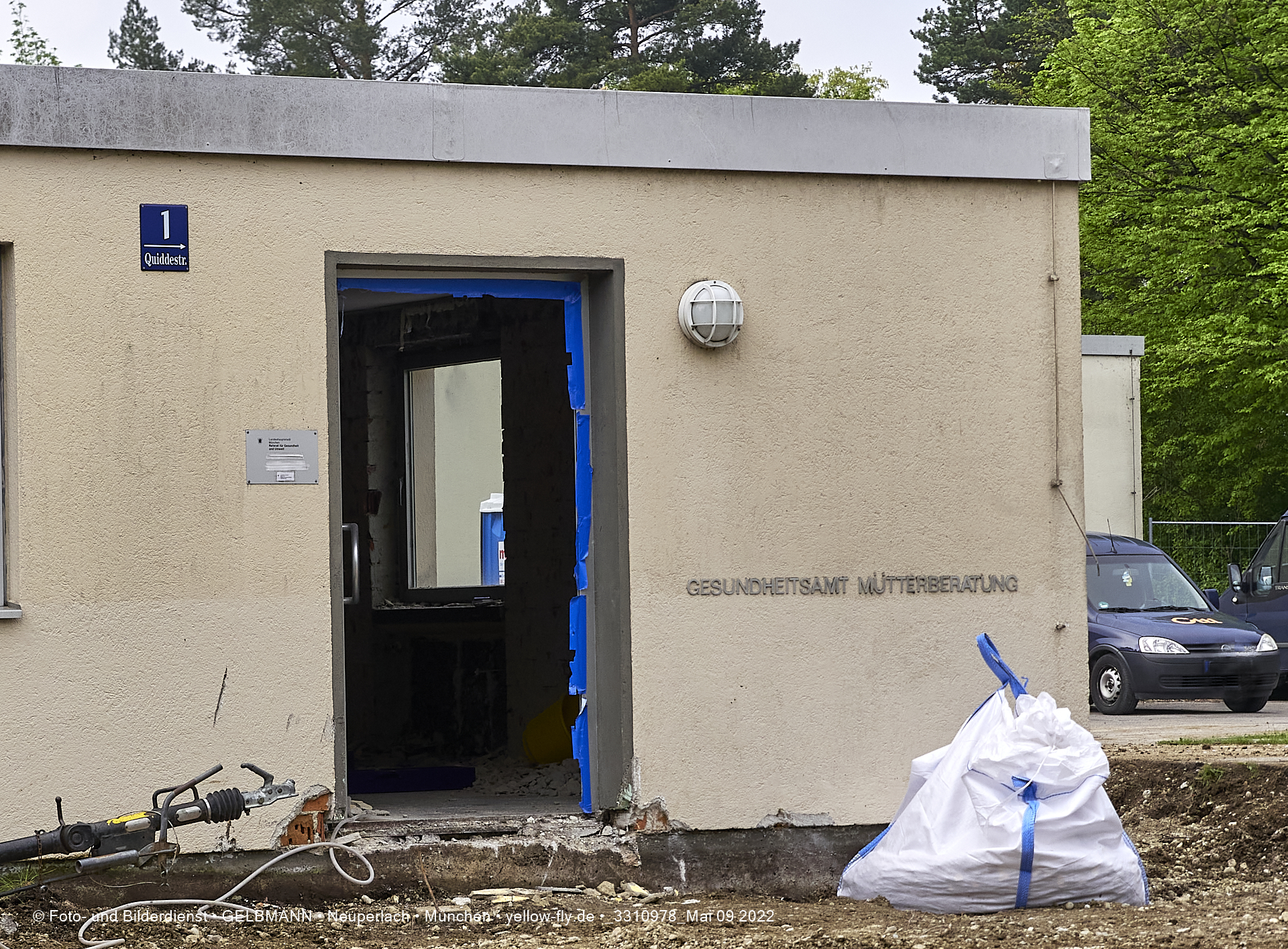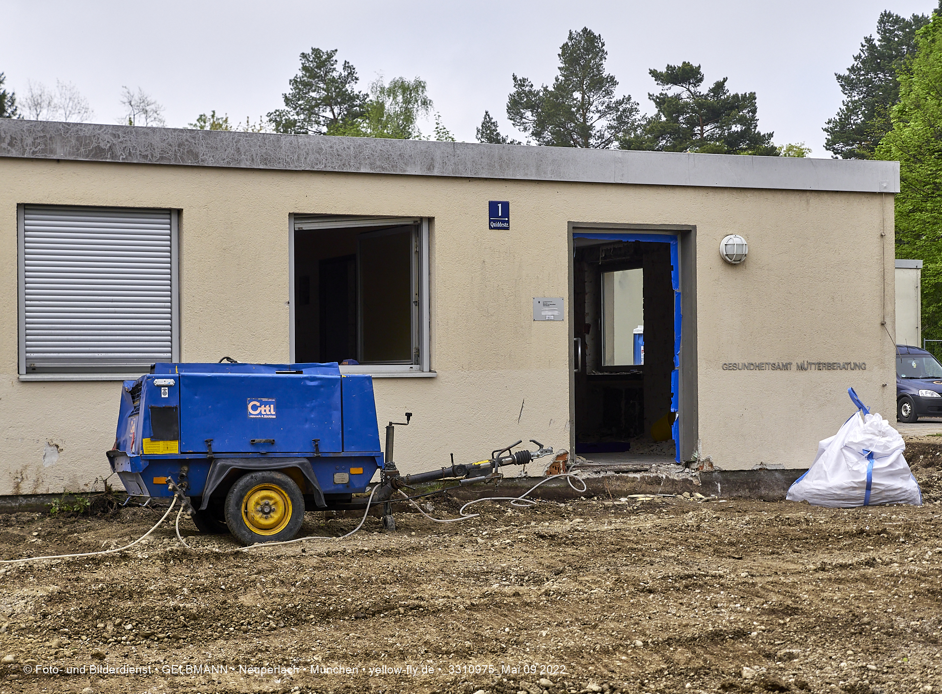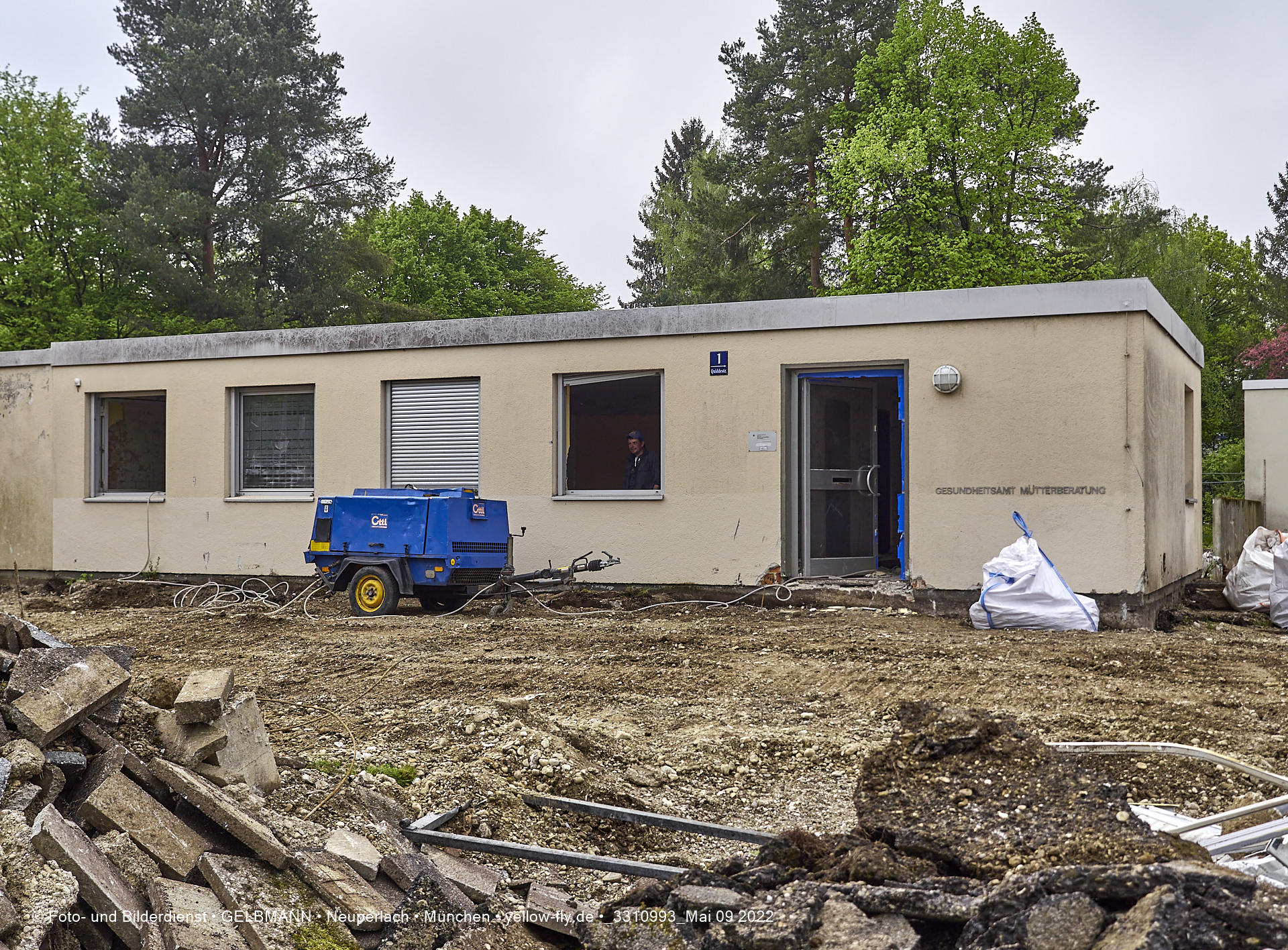 Abriss der Mütterberatung in München Neuperlach am 09.05.2022 Vor dem abzureisenden Flachbau der Mütterberatung in Neuperlach werden noch Erdarbeiten vom Bagger ausgeführt. Diverse Versorgungsleitungen müssen noch gekappt werden.