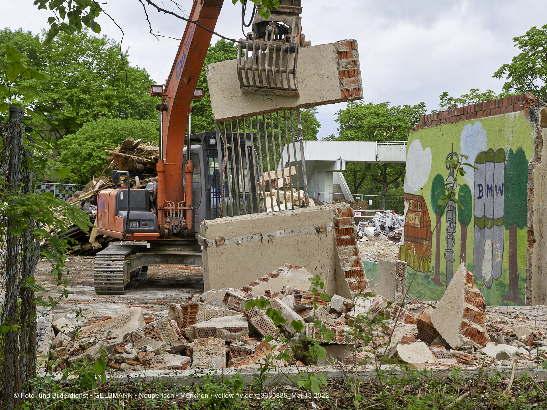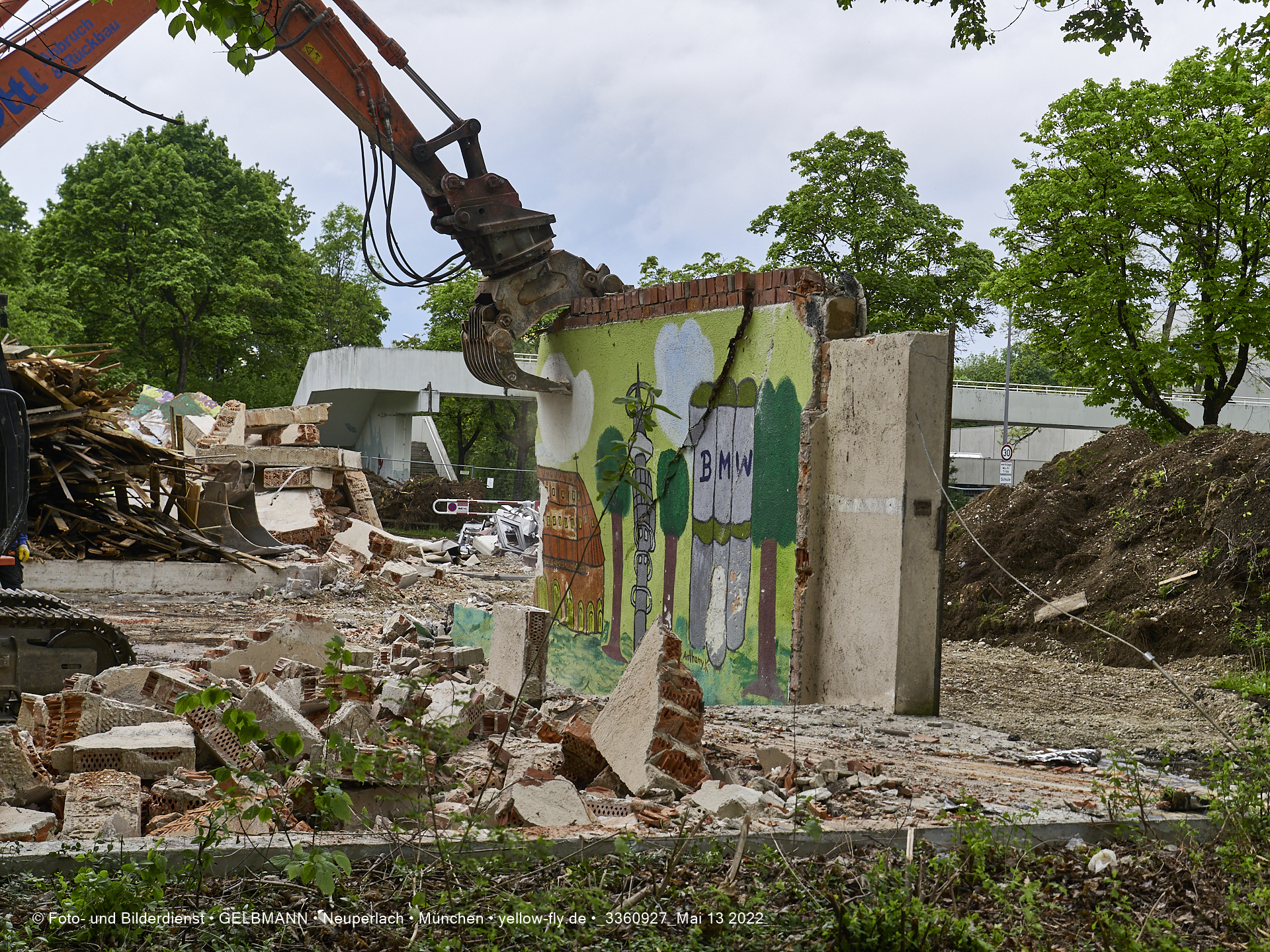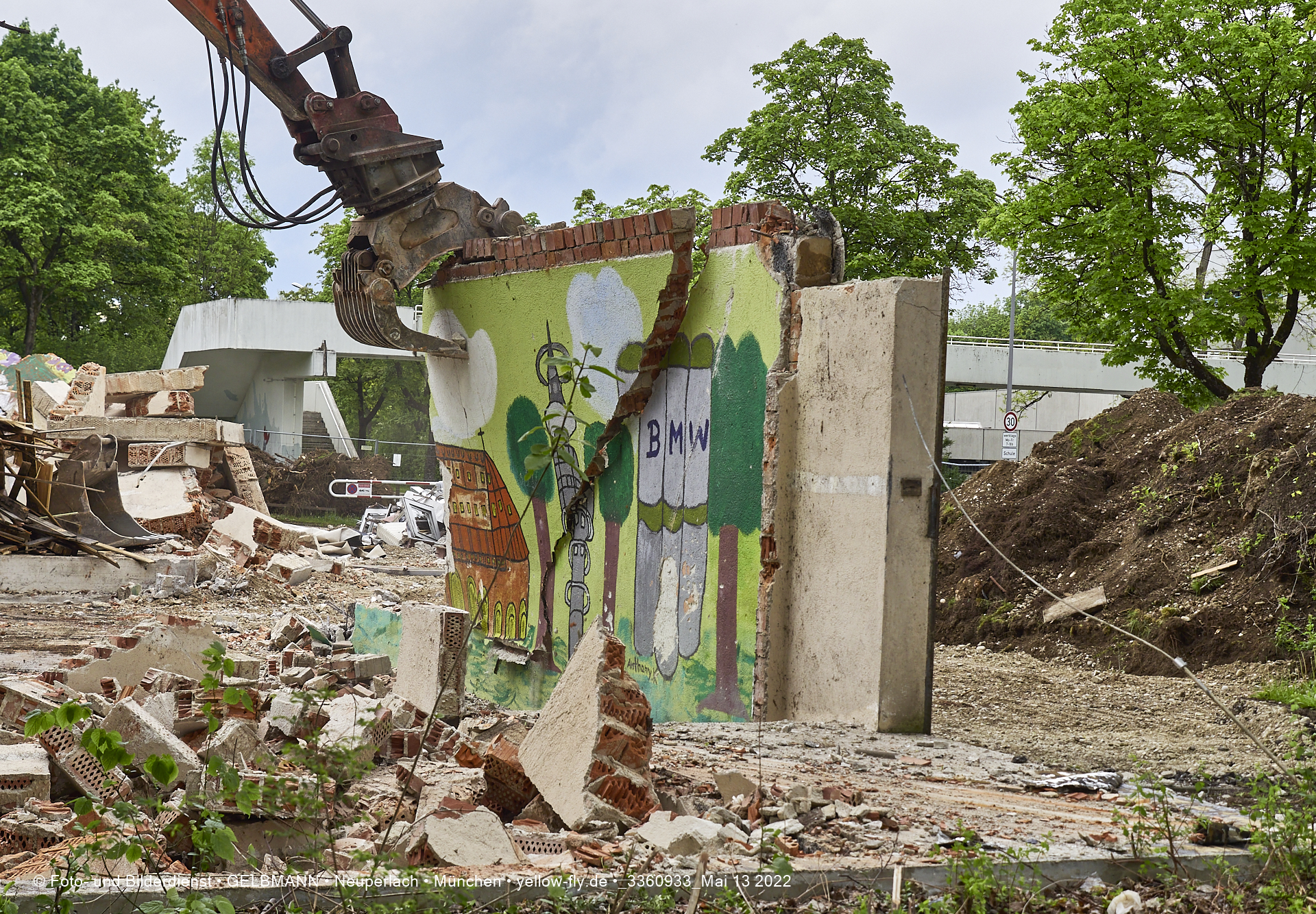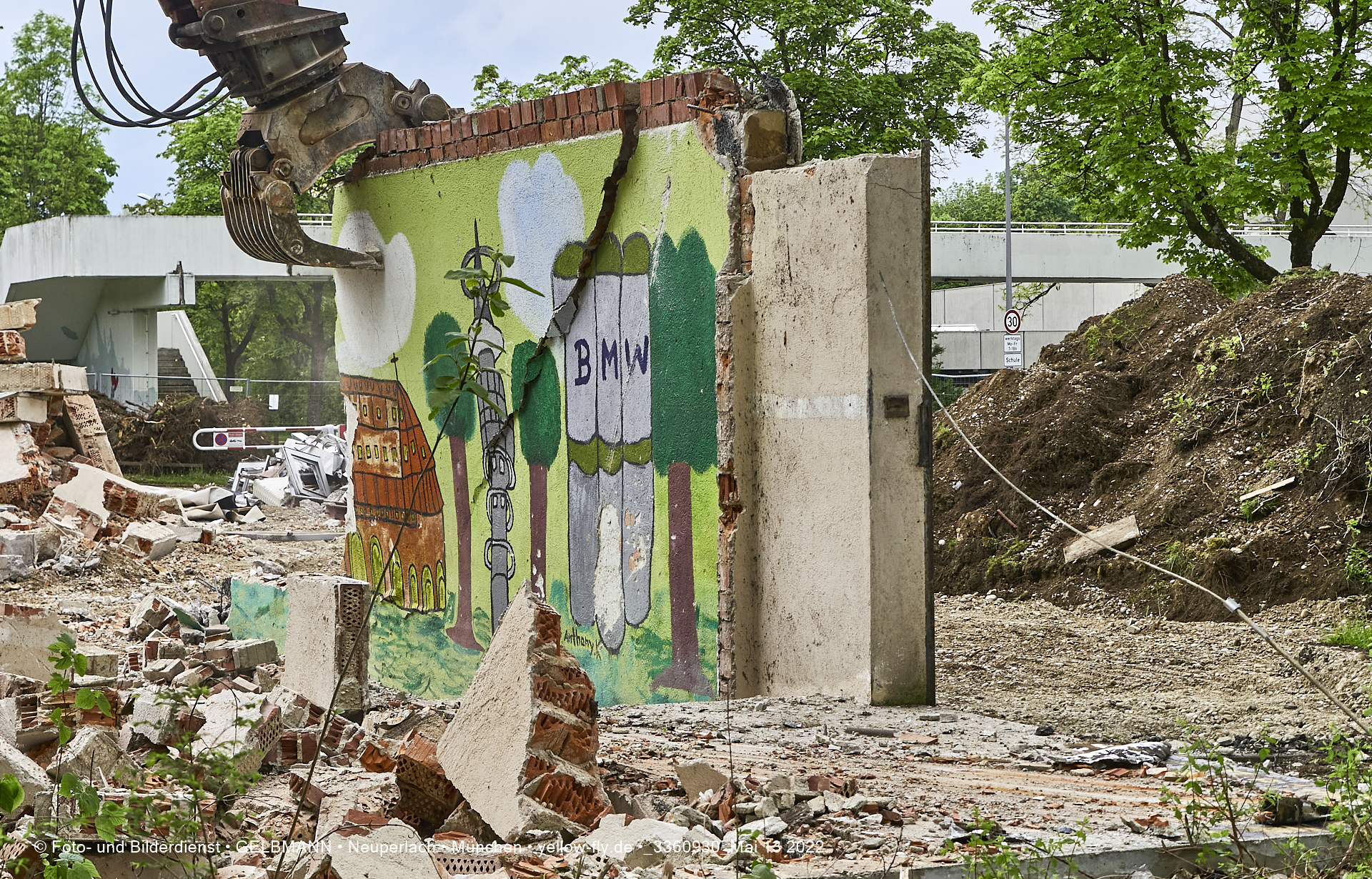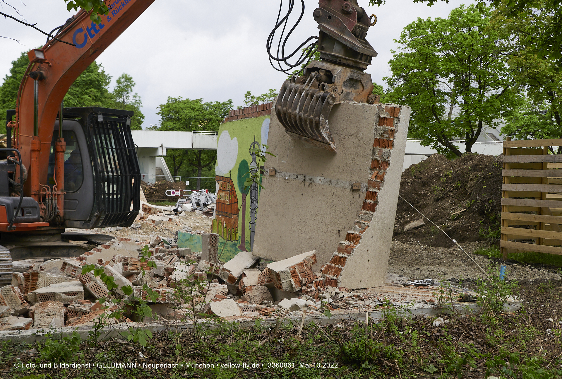 Heute am 13.05.2022 wird die letzte Mauer des ehemaligen Gebäudes der Mütterberatung in Neuperlach, Quiddestraße 1, eingerissen. Die mit einem schönen Graffiti vertierte Mauer versucht zuerst, sich zur Wehr zu setzte. Gegen den Bagger hat sie aber keine Chance.