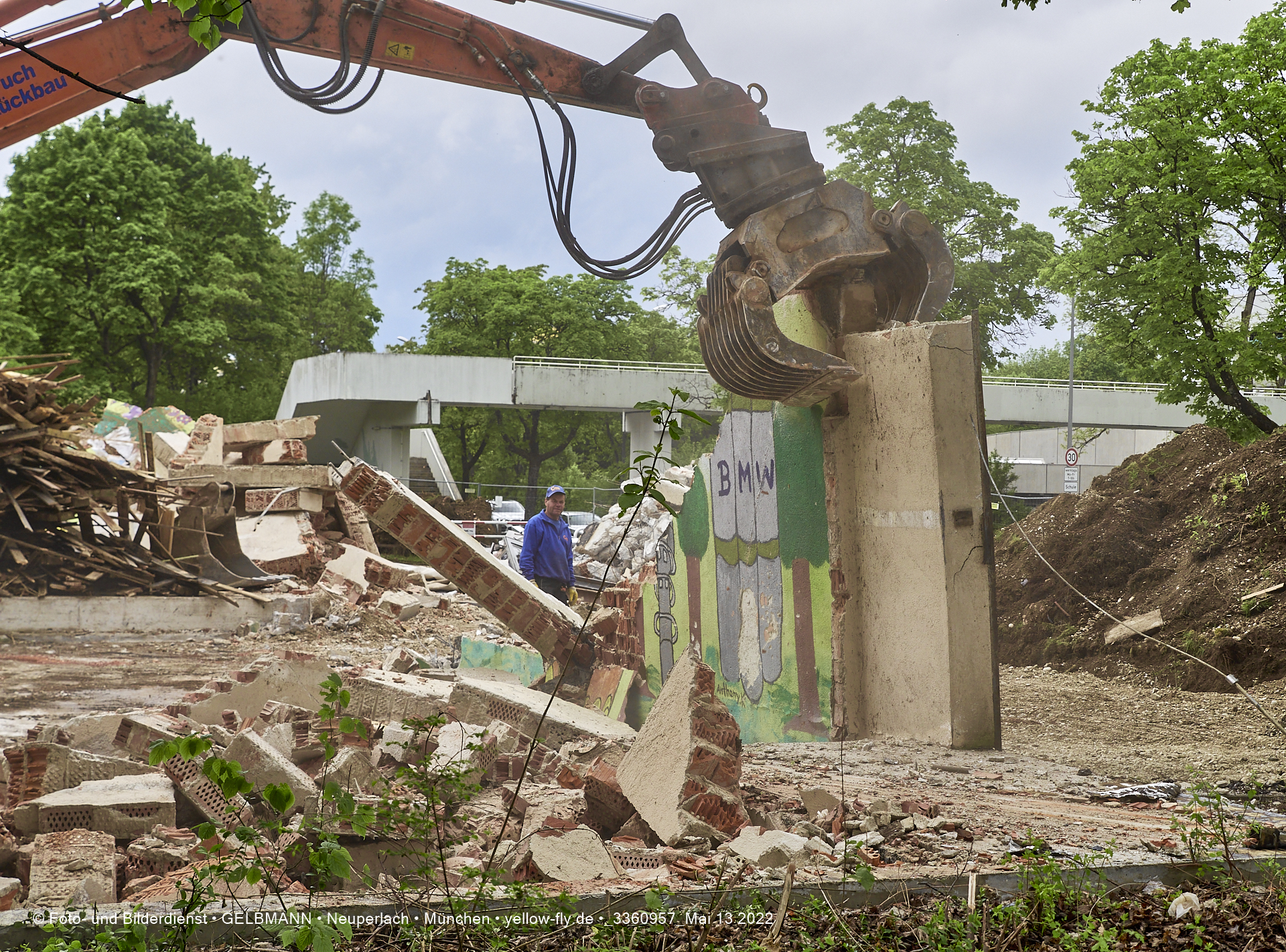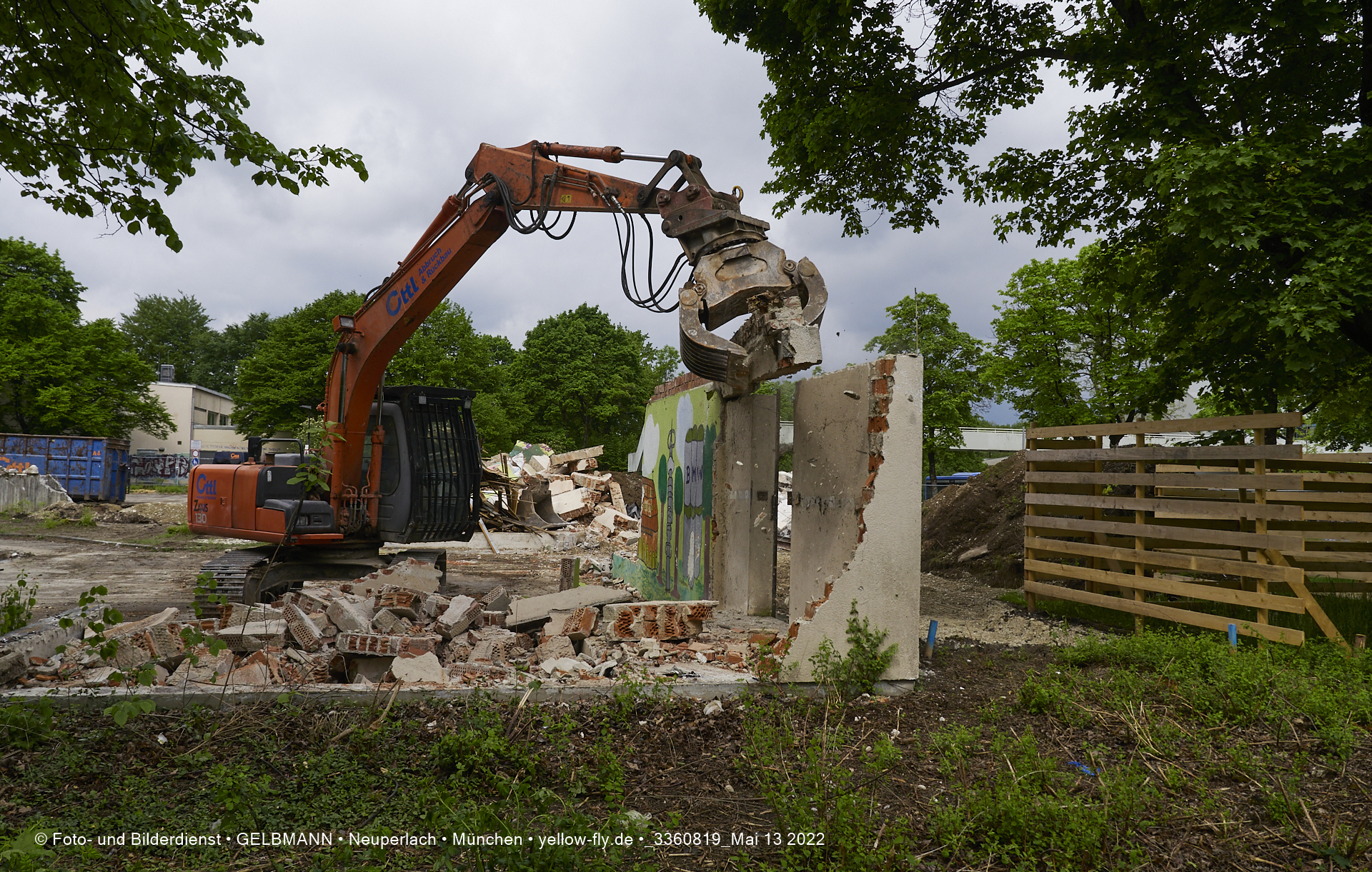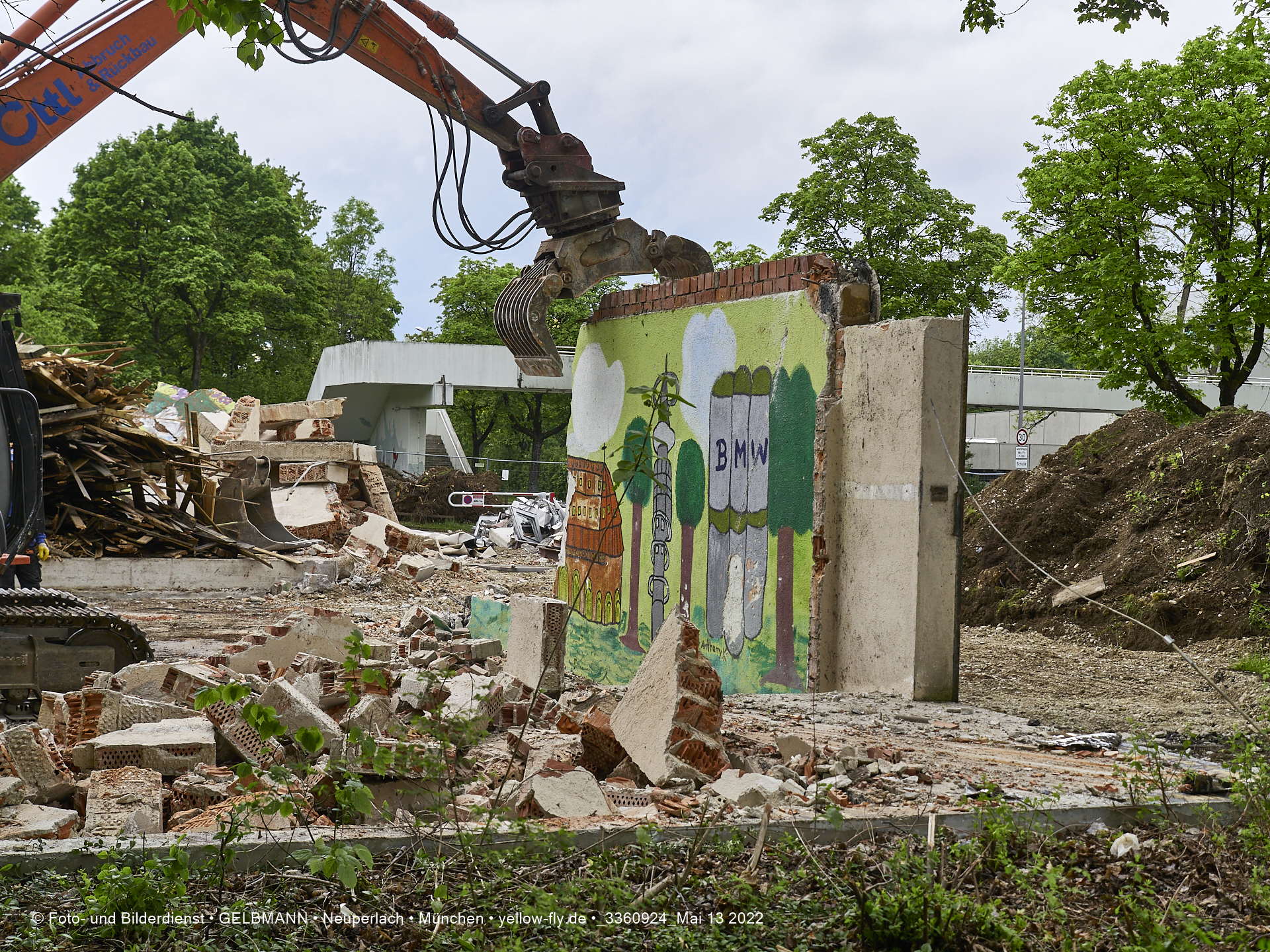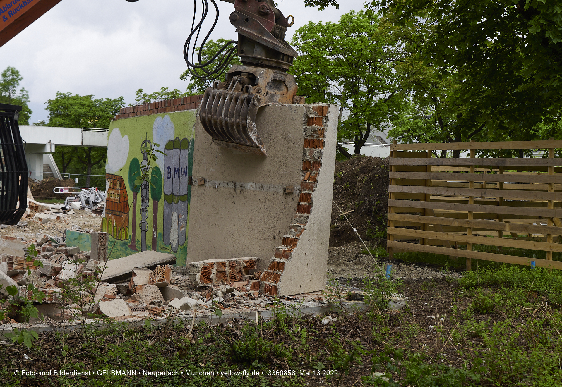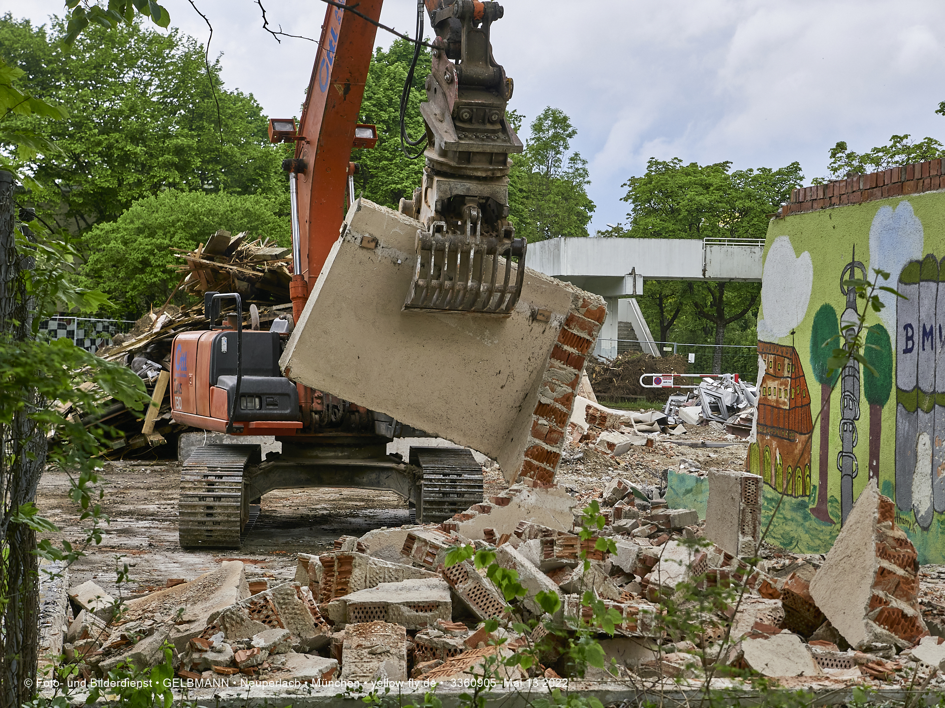 Heute am 13.05.2022 wird die letzte Mauer des ehemaligen Gebäudes der Mütterberatung in Neuperlach, Quiddestraße 1, eingerissen. Die mit einem schönen Graffiti vertierte Mauer versucht zuerst, sich zur Wehr zu setzte. Gegen den Bagger hat sie aber keine Chance.