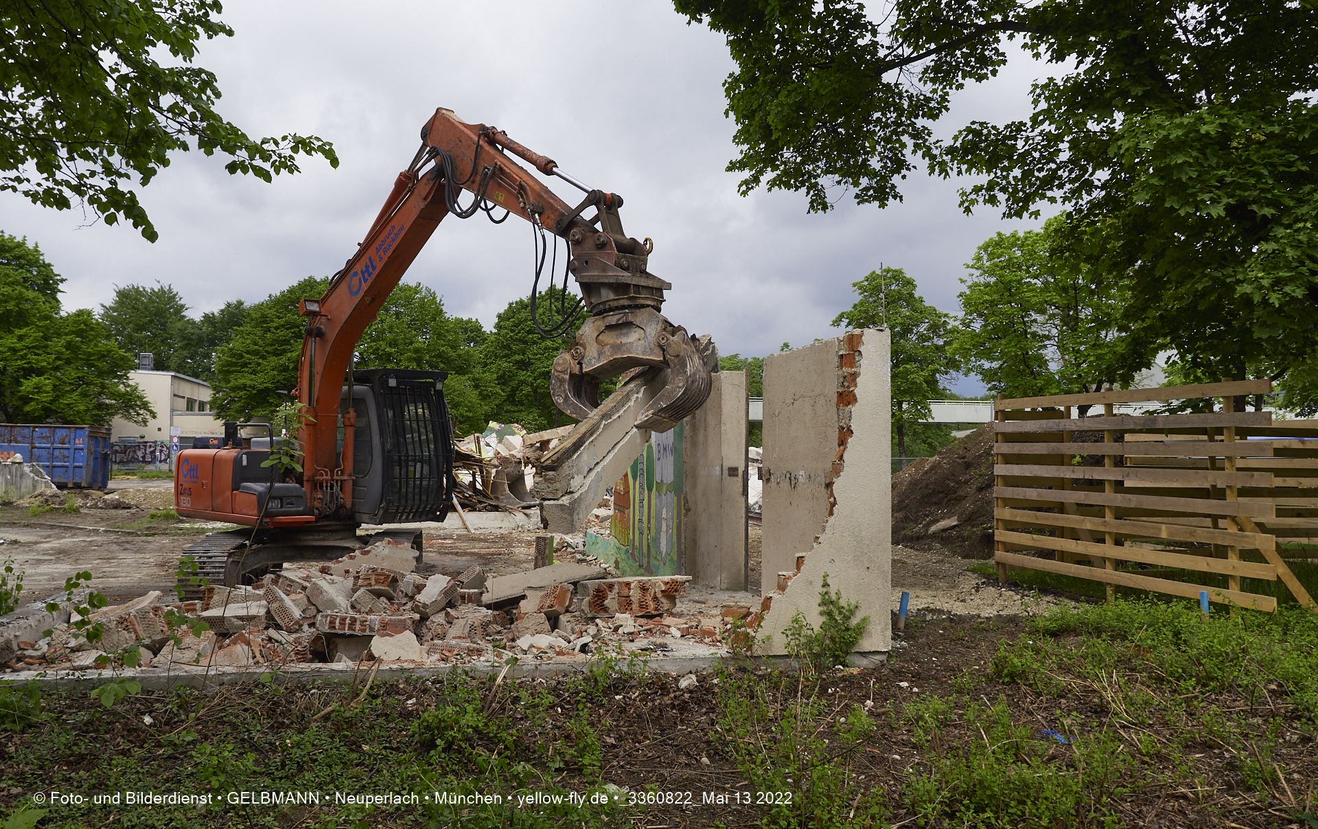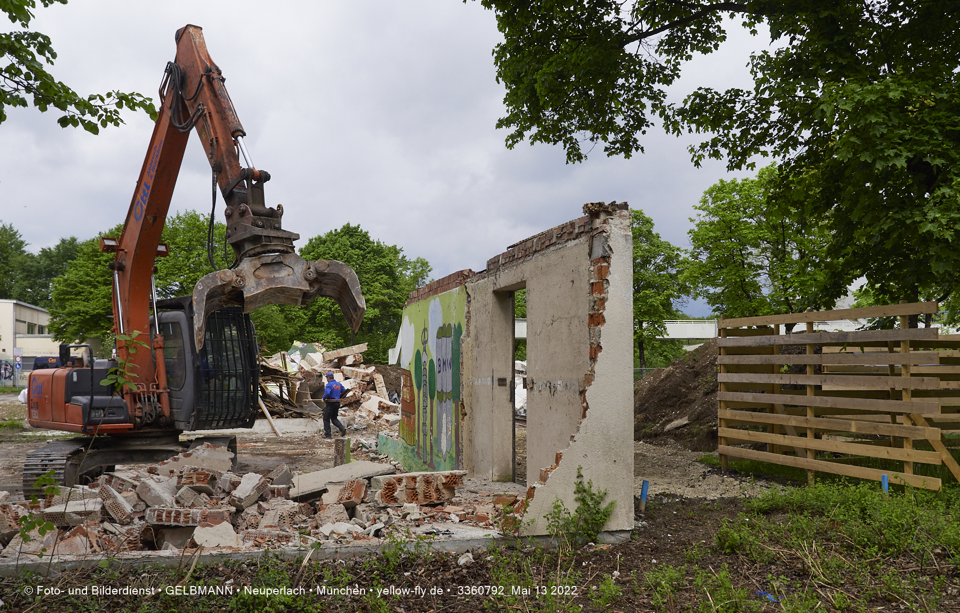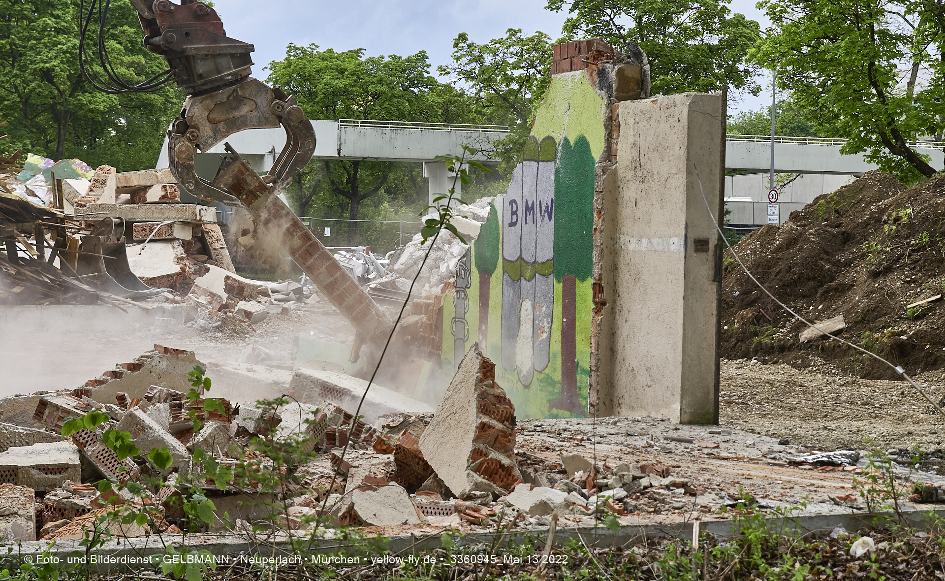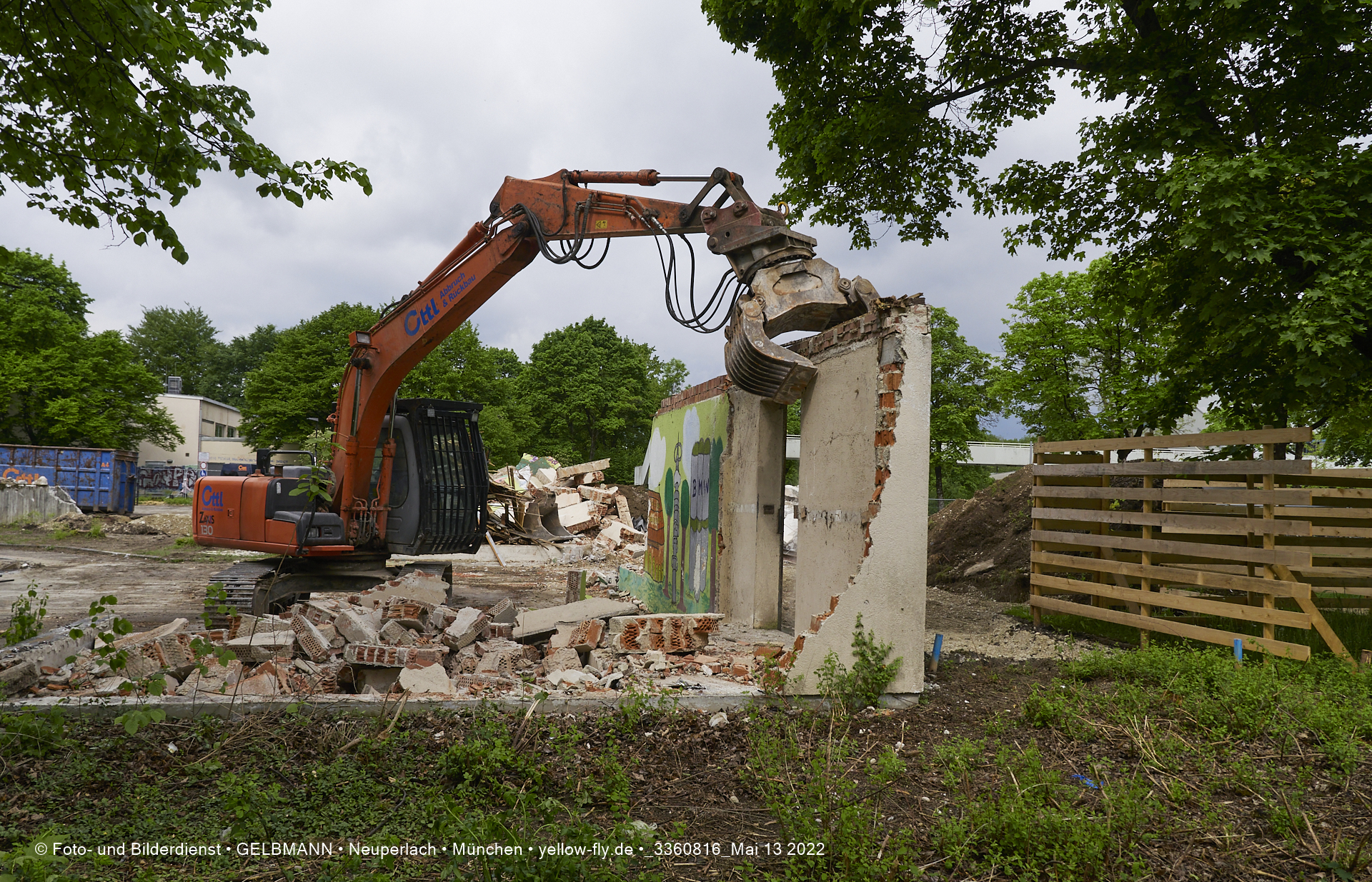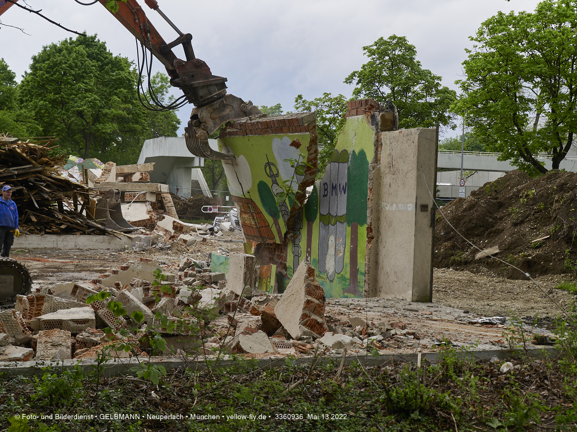 Heute am 13.05.2022 wird die letzte Mauer des ehemaligen Gebäudes der Mütterberatung in Neuperlach, Quiddestraße 1, eingerissen. Die mit einem schönen Graffiti vertierte Mauer versucht zuerst, sich zur Wehr zu setzte. Gegen den Bagger hat sie aber keine Chance.
