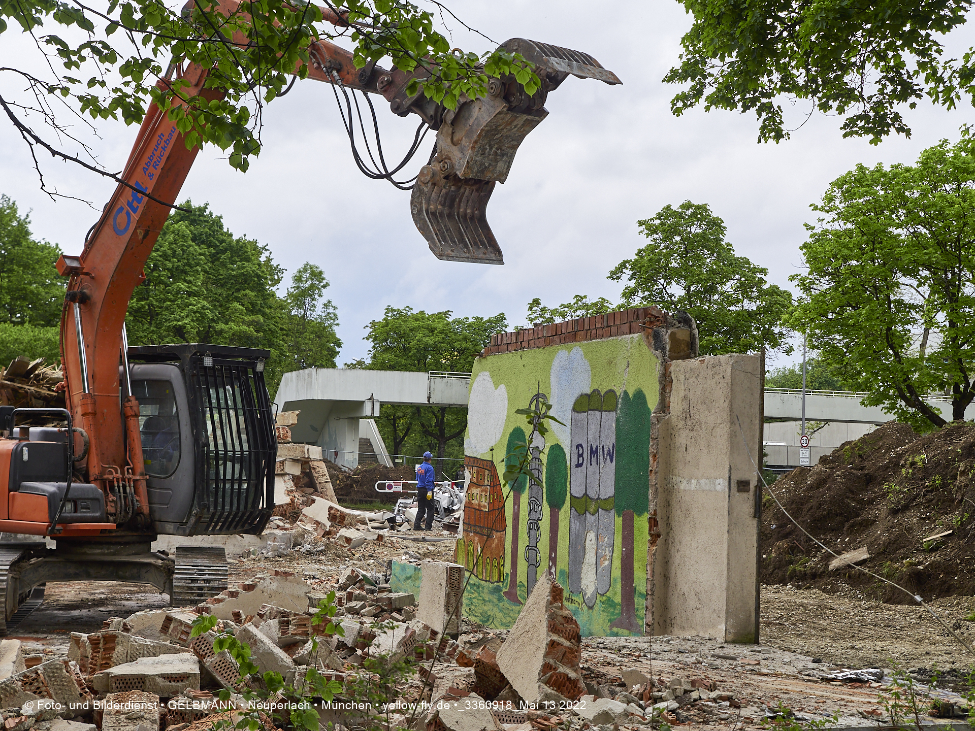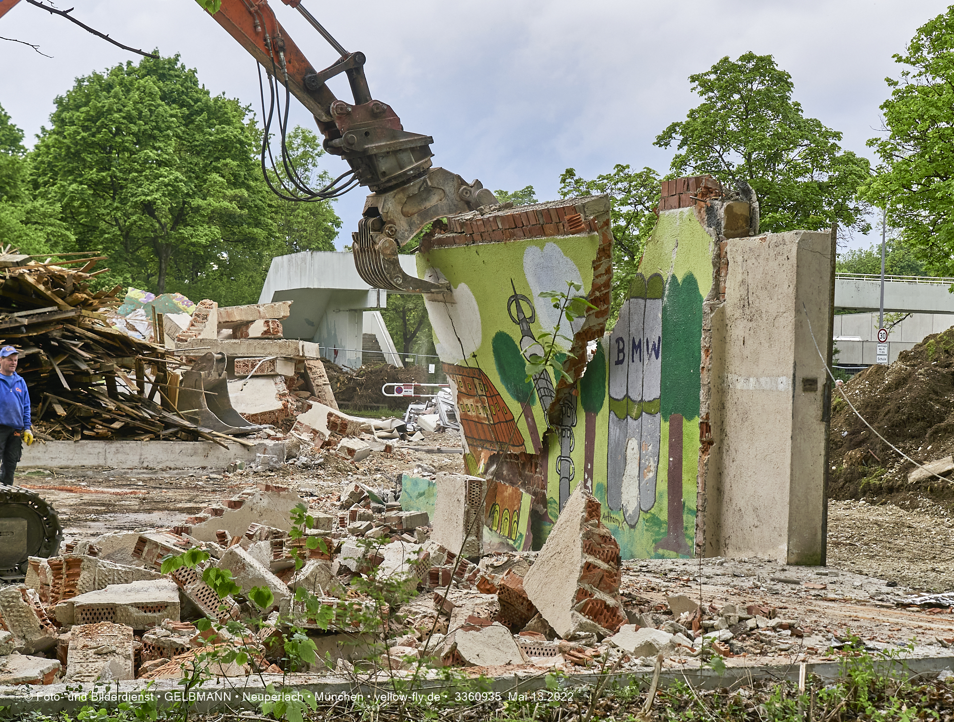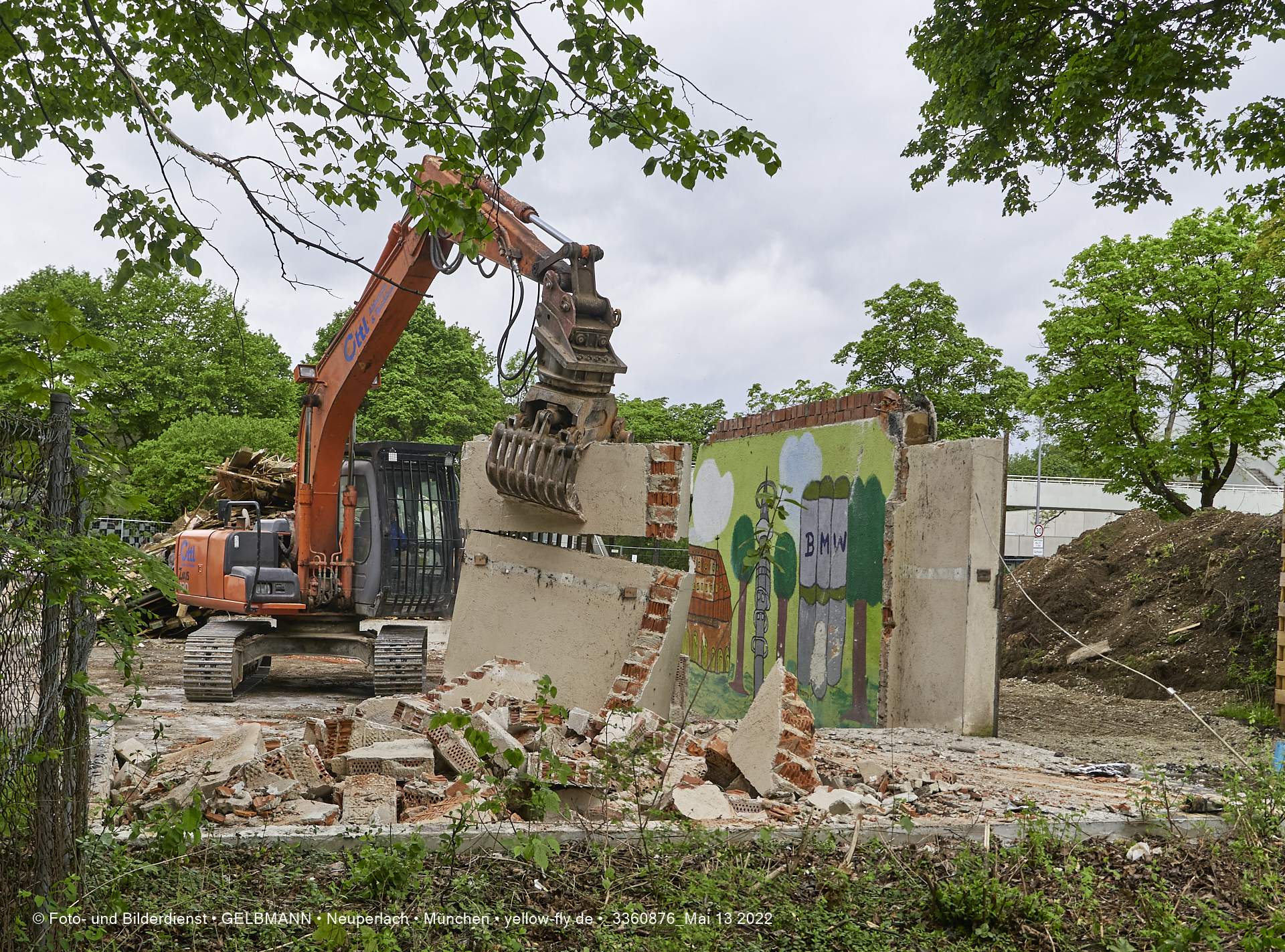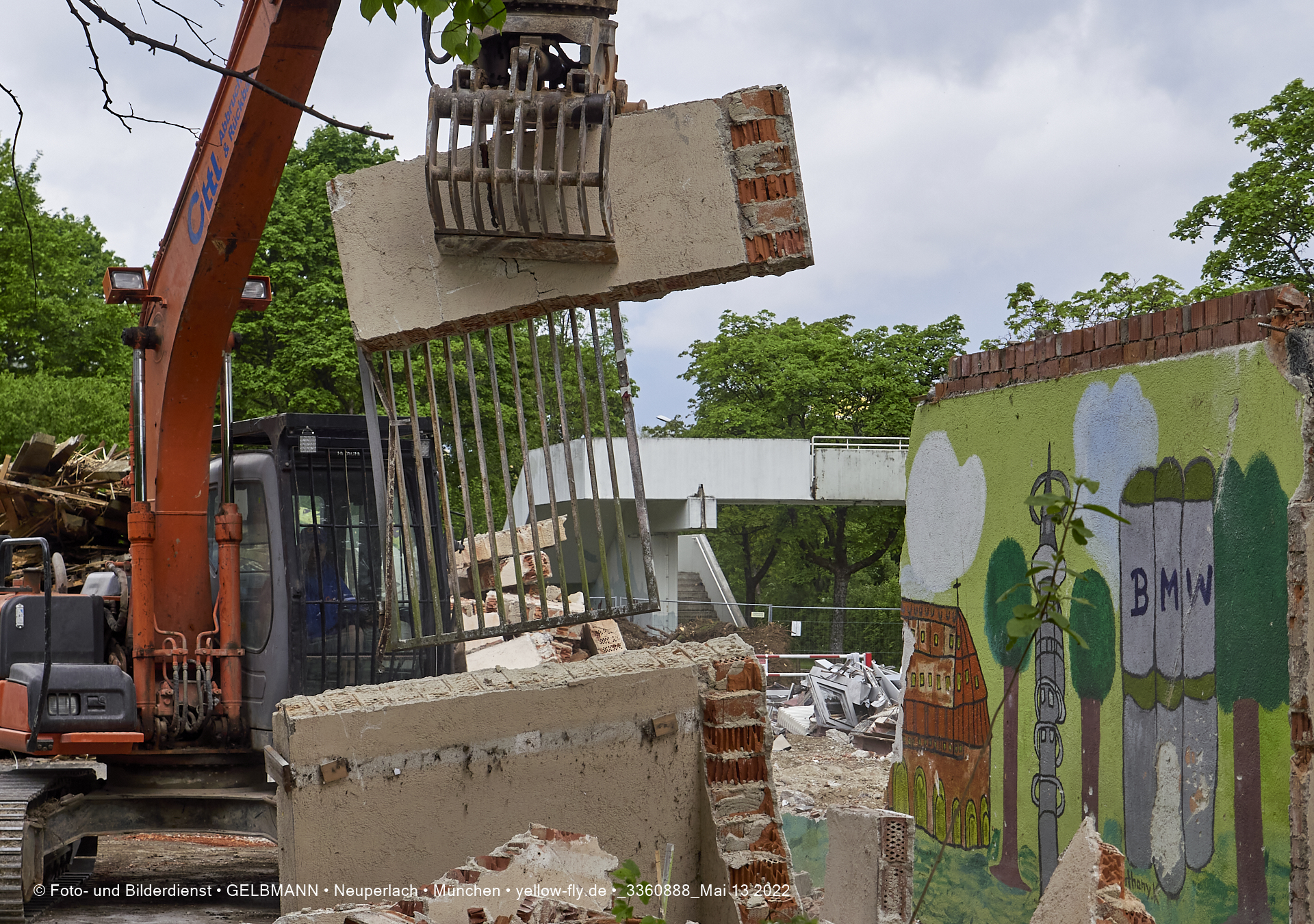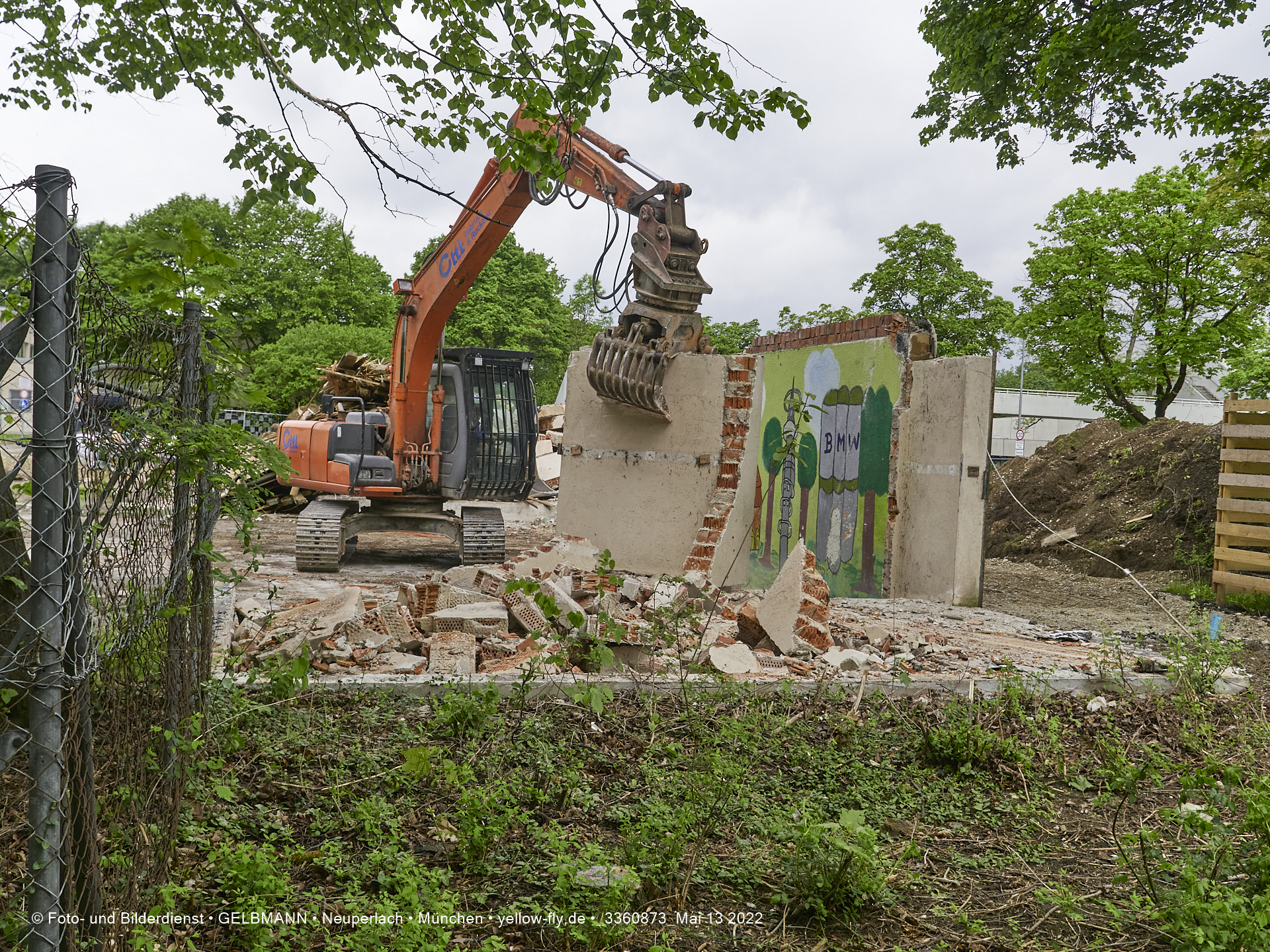 Heute am 13.05.2022 wird die letzte Mauer des ehemaligen Gebäudes der Mütterberatung in Neuperlach, Quiddestraße 1, eingerissen. Die mit einem schönen Graffiti vertierte Mauer versucht zuerst, sich zur Wehr zu setzte. Gegen den Bagger hat sie aber keine Chance.