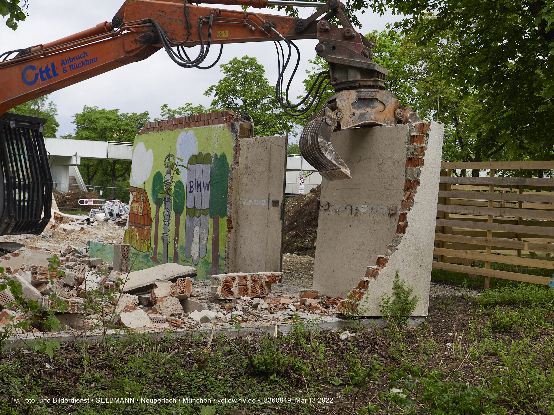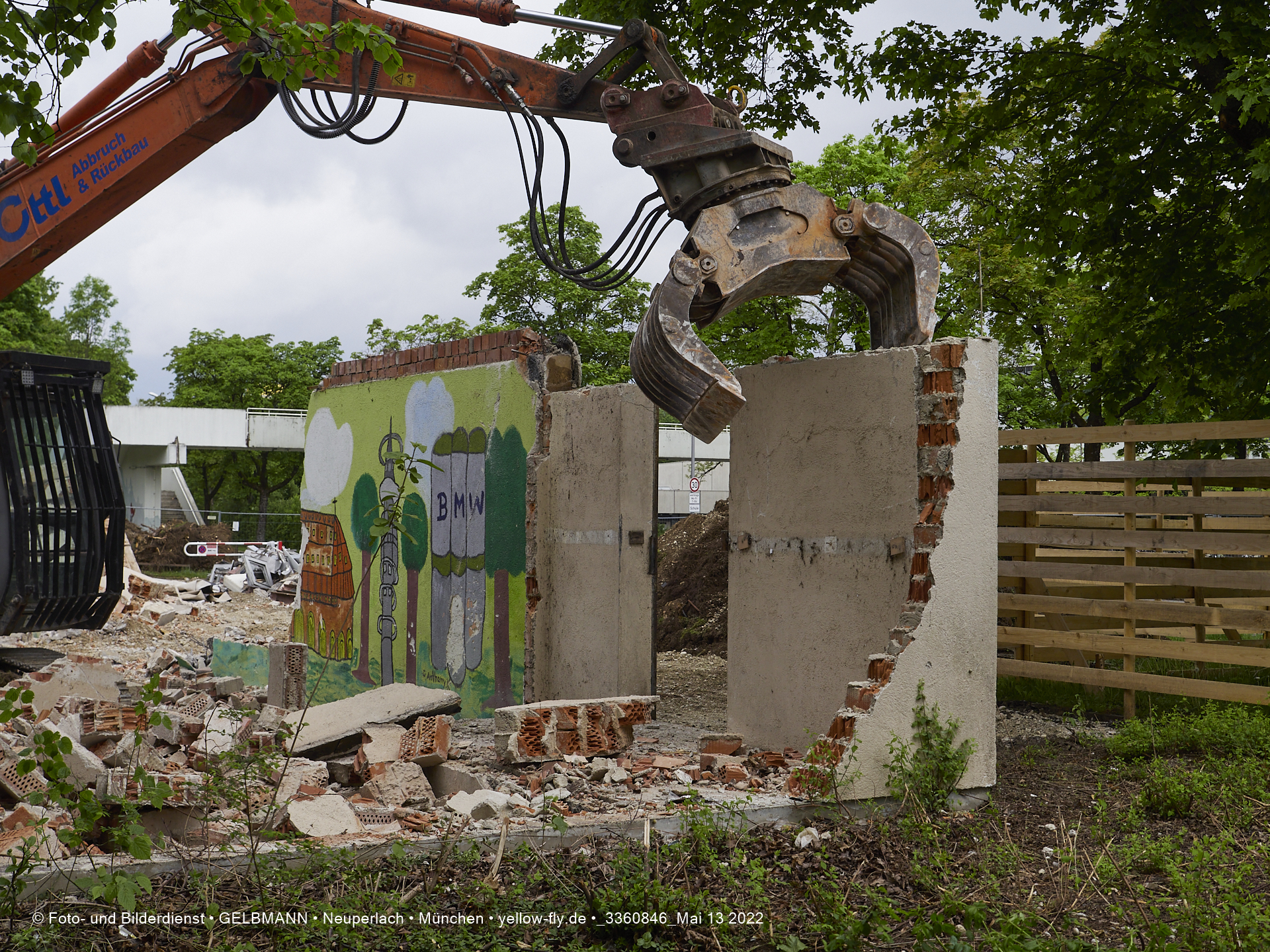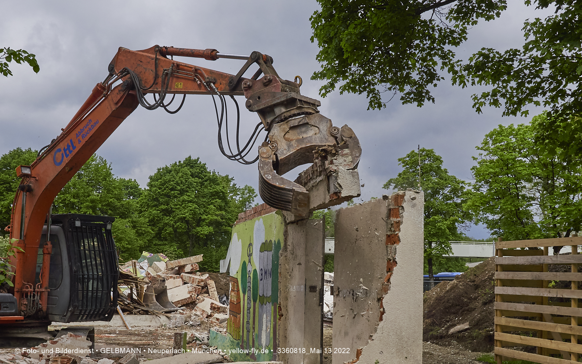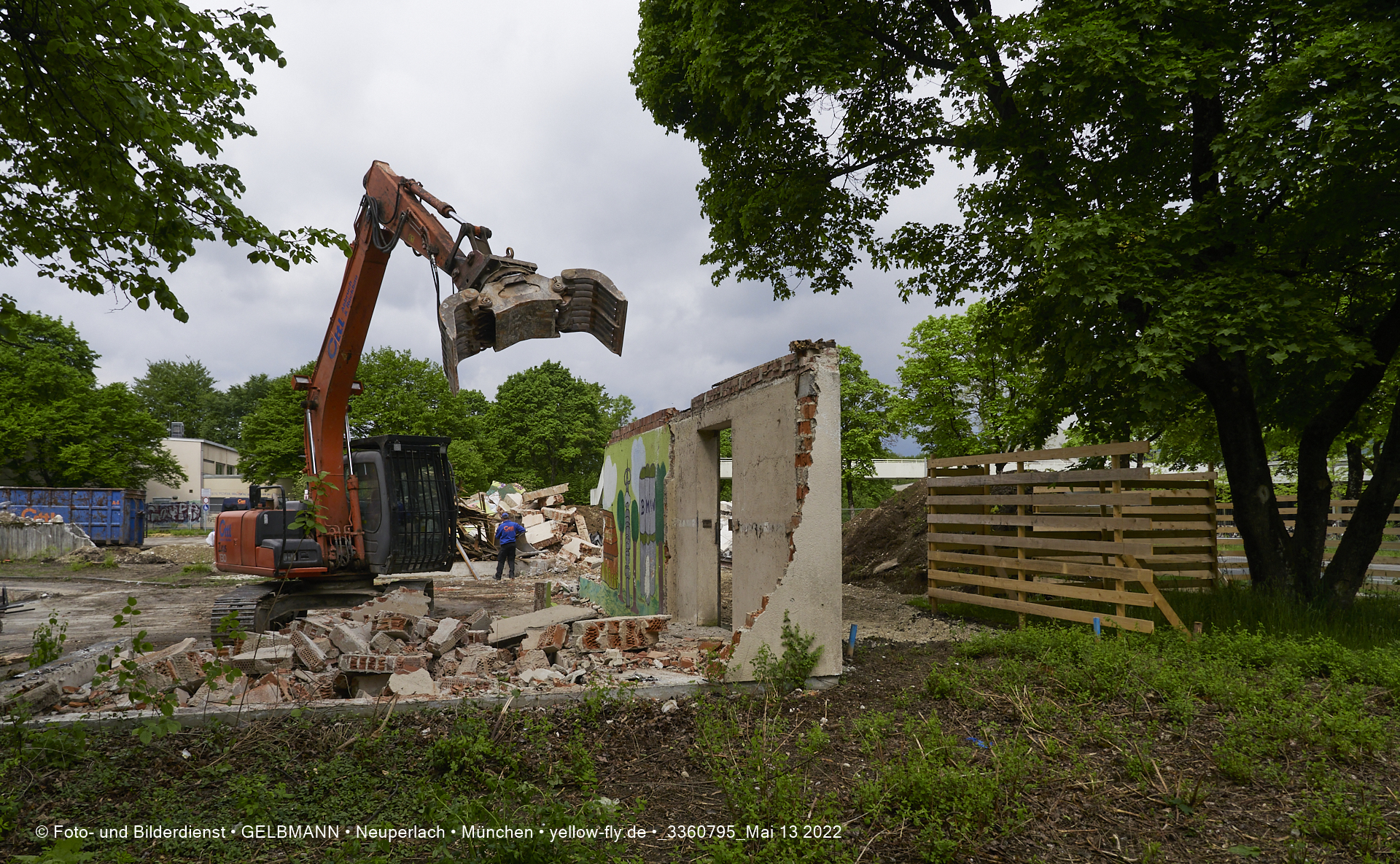 Heute am 13.05.2022 wird die letzte Mauer des ehemaligen Gebäudes der Mütterberatung in Neuperlach, Quiddestraße 1, eingerissen. Die mit einem schönen Graffiti vertierte Mauer versucht zuerst, sich zur Wehr zu setzte. Gegen den Bagger hat sie aber keine Chance.