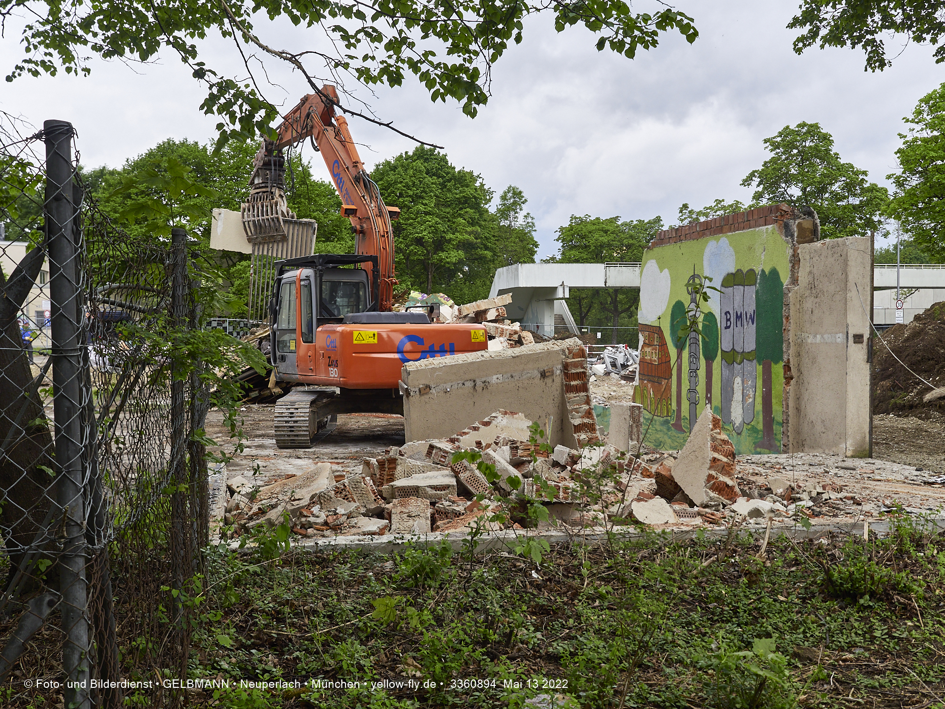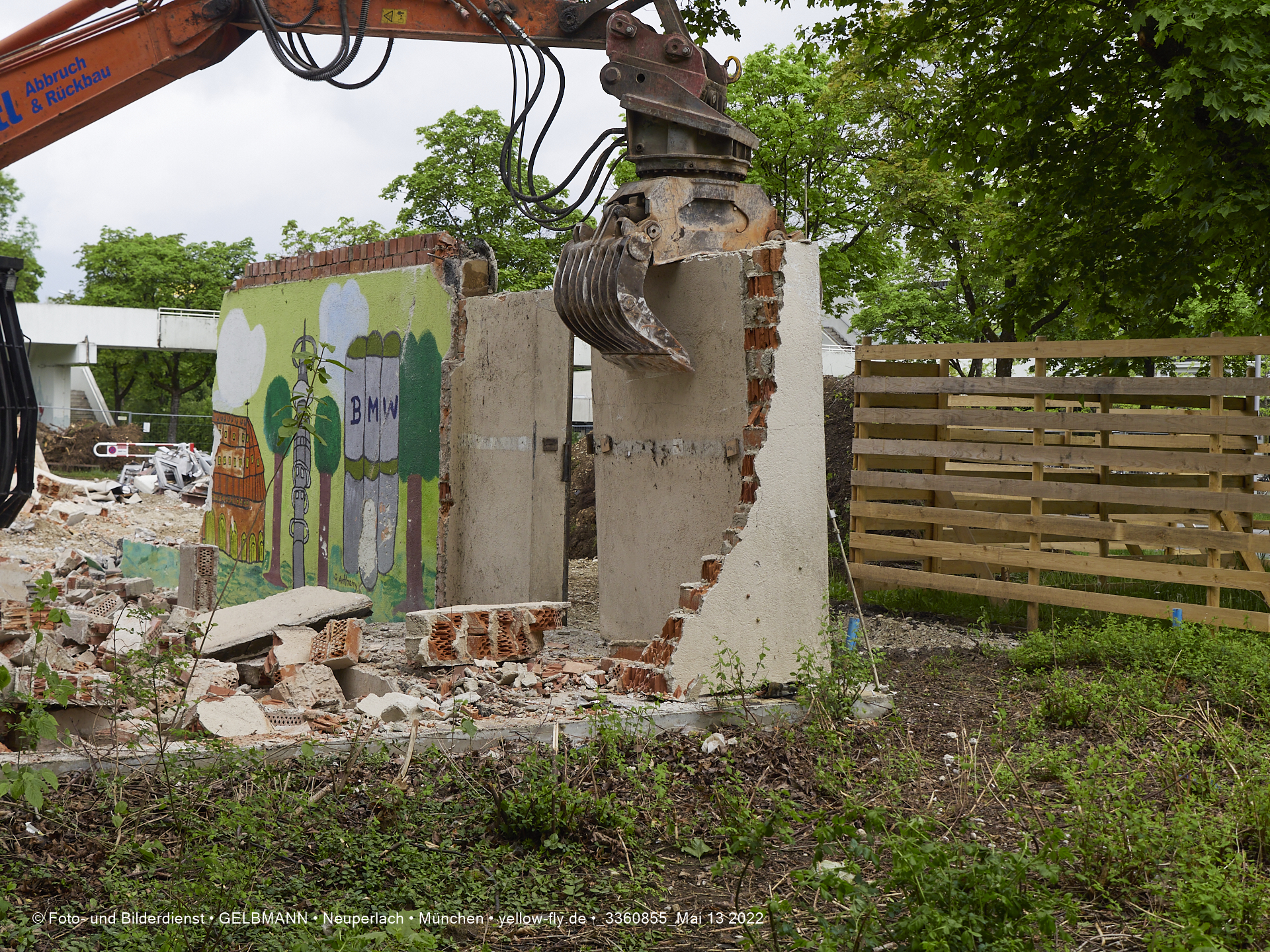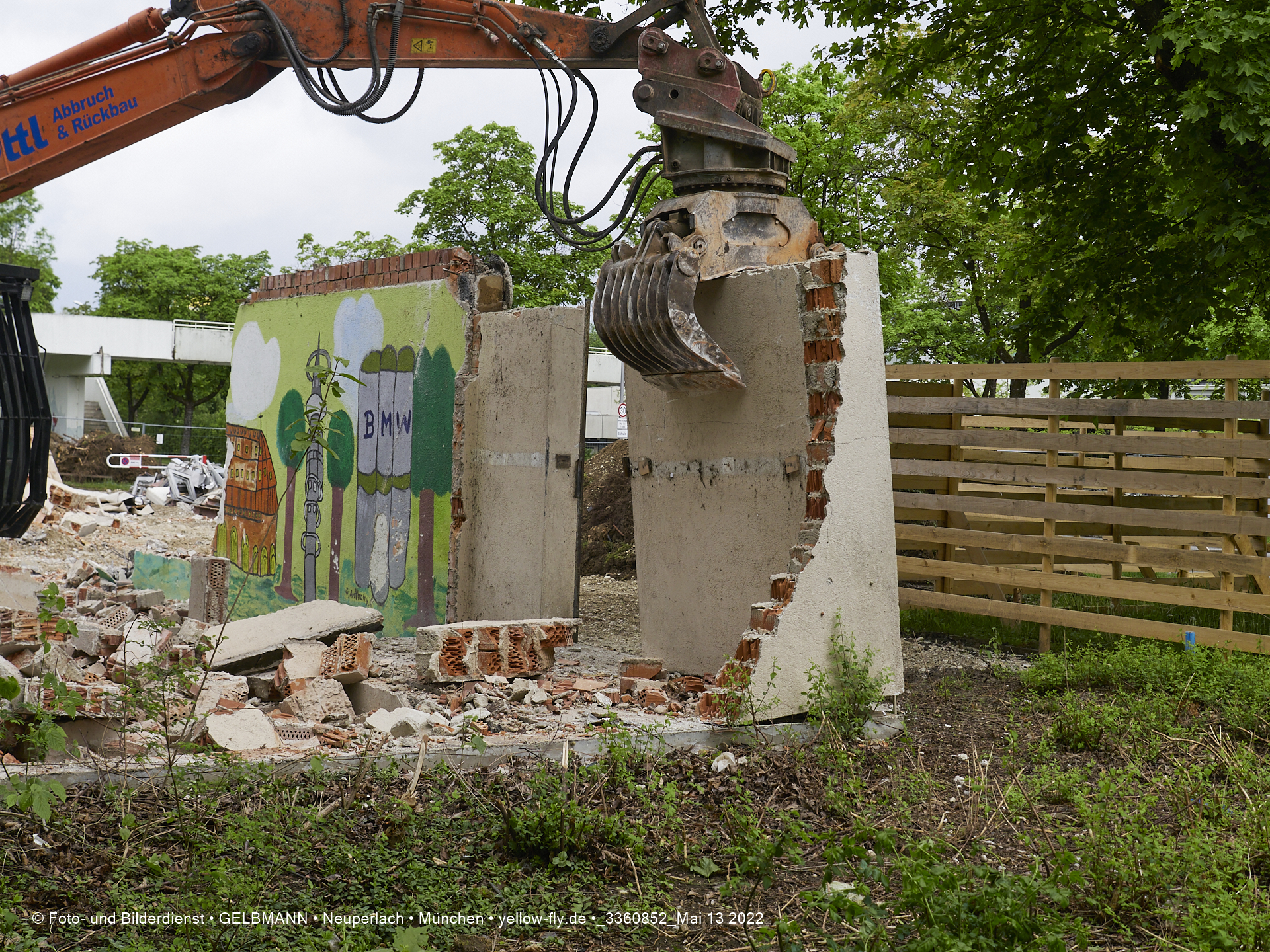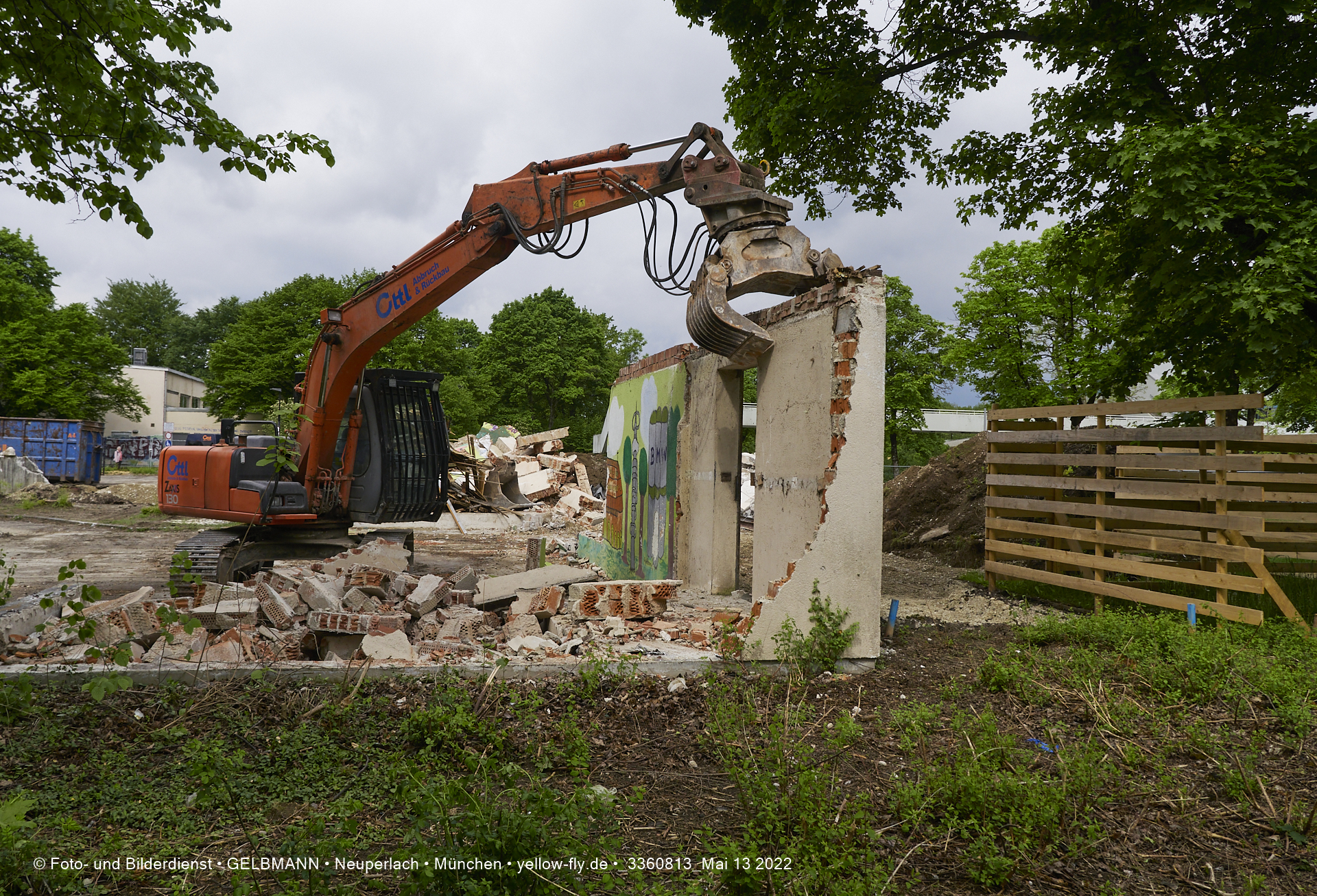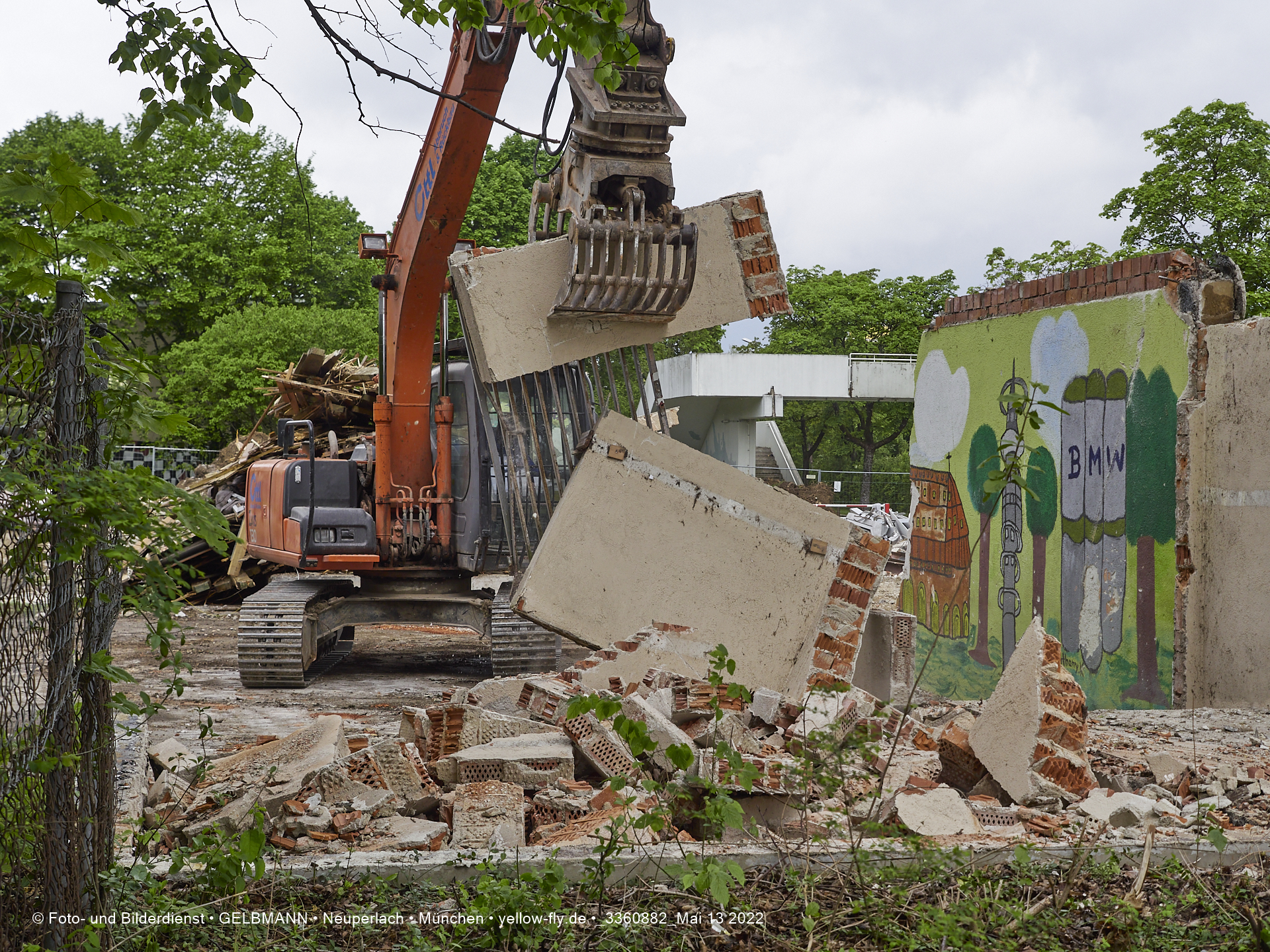 Heute am 13.05.2022 wird die letzte Mauer des ehemaligen Gebäudes der Mütterberatung in Neuperlach, Quiddestraße 1, eingerissen. Die mit einem schönen Graffiti vertierte Mauer versucht zuerst, sich zur Wehr zu setzte. Gegen den Bagger hat sie aber keine Chance.