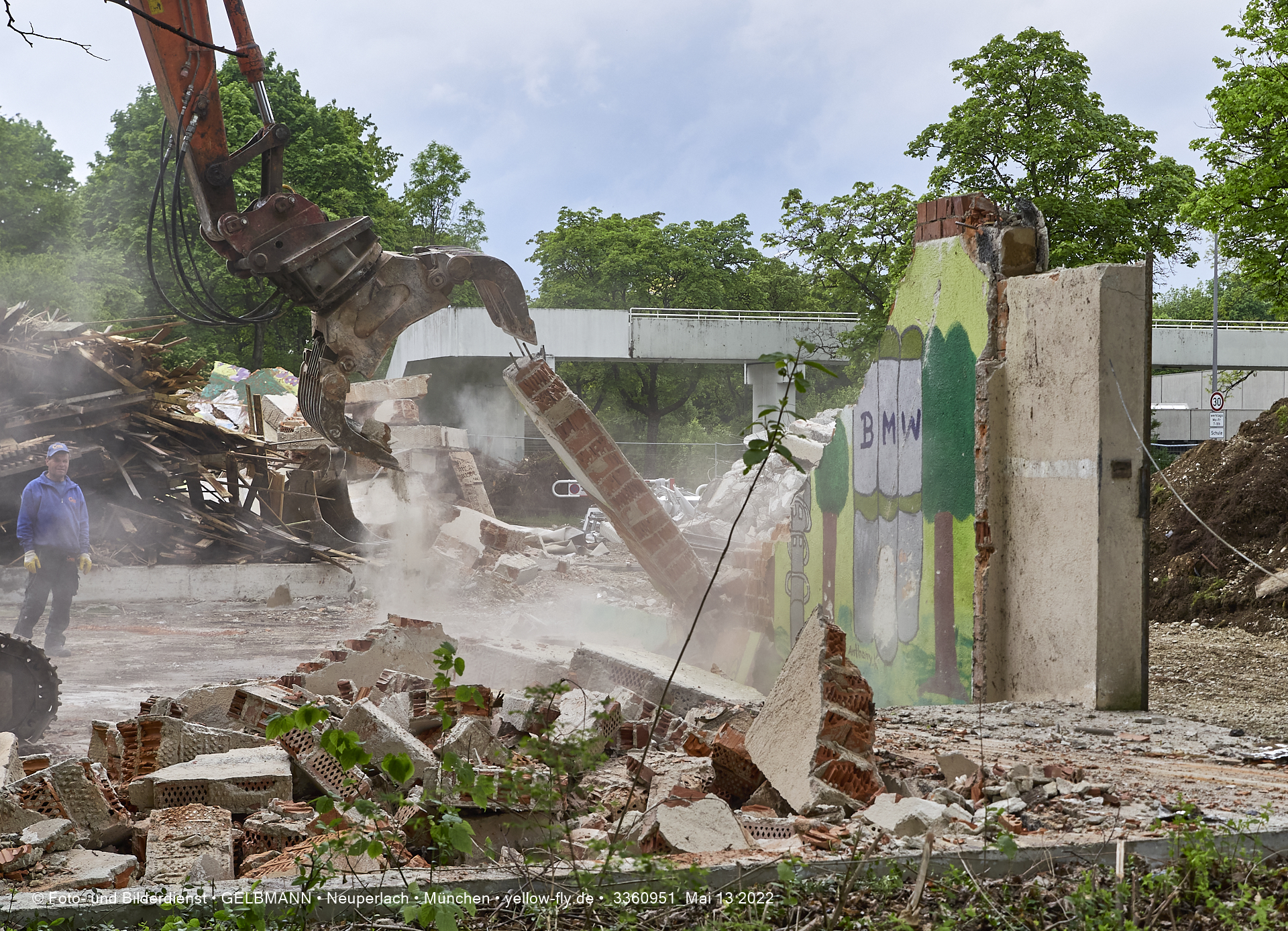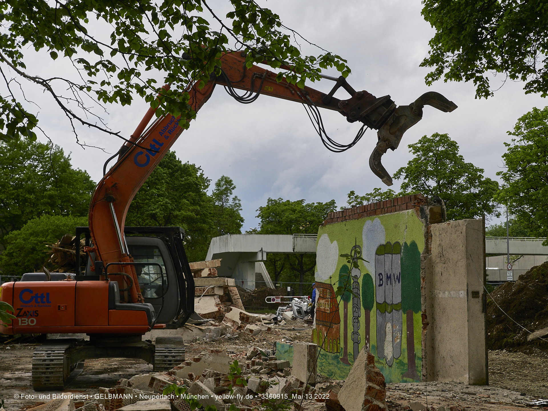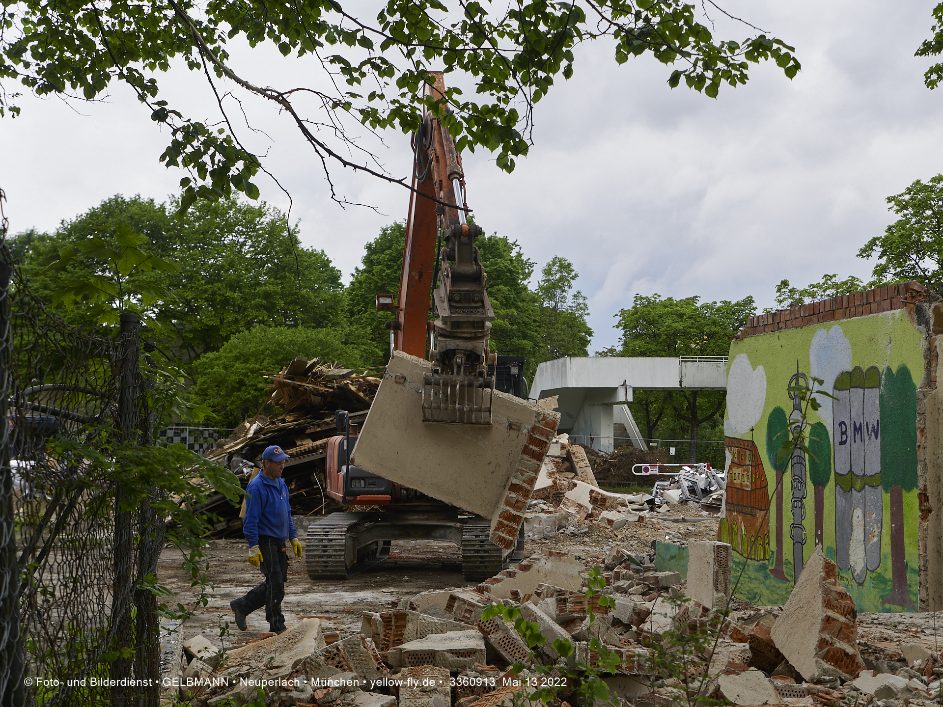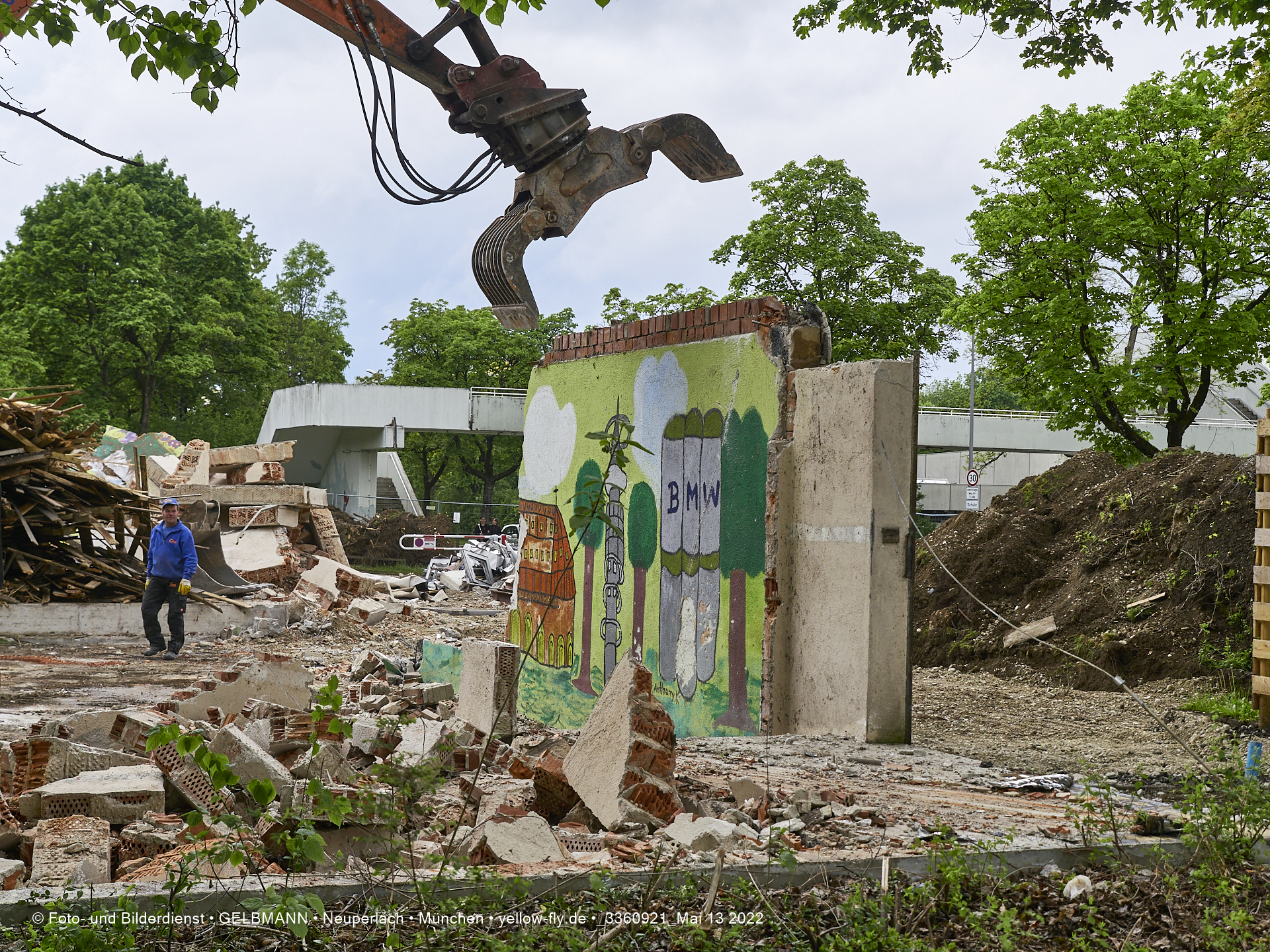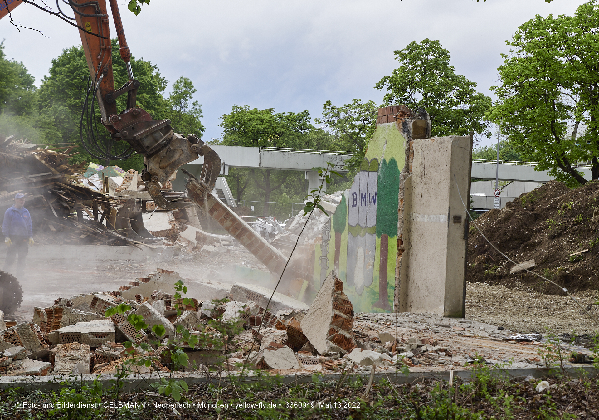 Heute am 13.05.2022 wird die letzte Mauer des ehemaligen Gebäudes der Mütterberatung in Neuperlach, Quiddestraße 1, eingerissen. Die mit einem schönen Graffiti vertierte Mauer versucht zuerst, sich zur Wehr zu setzte. Gegen den Bagger hat sie aber keine Chance.