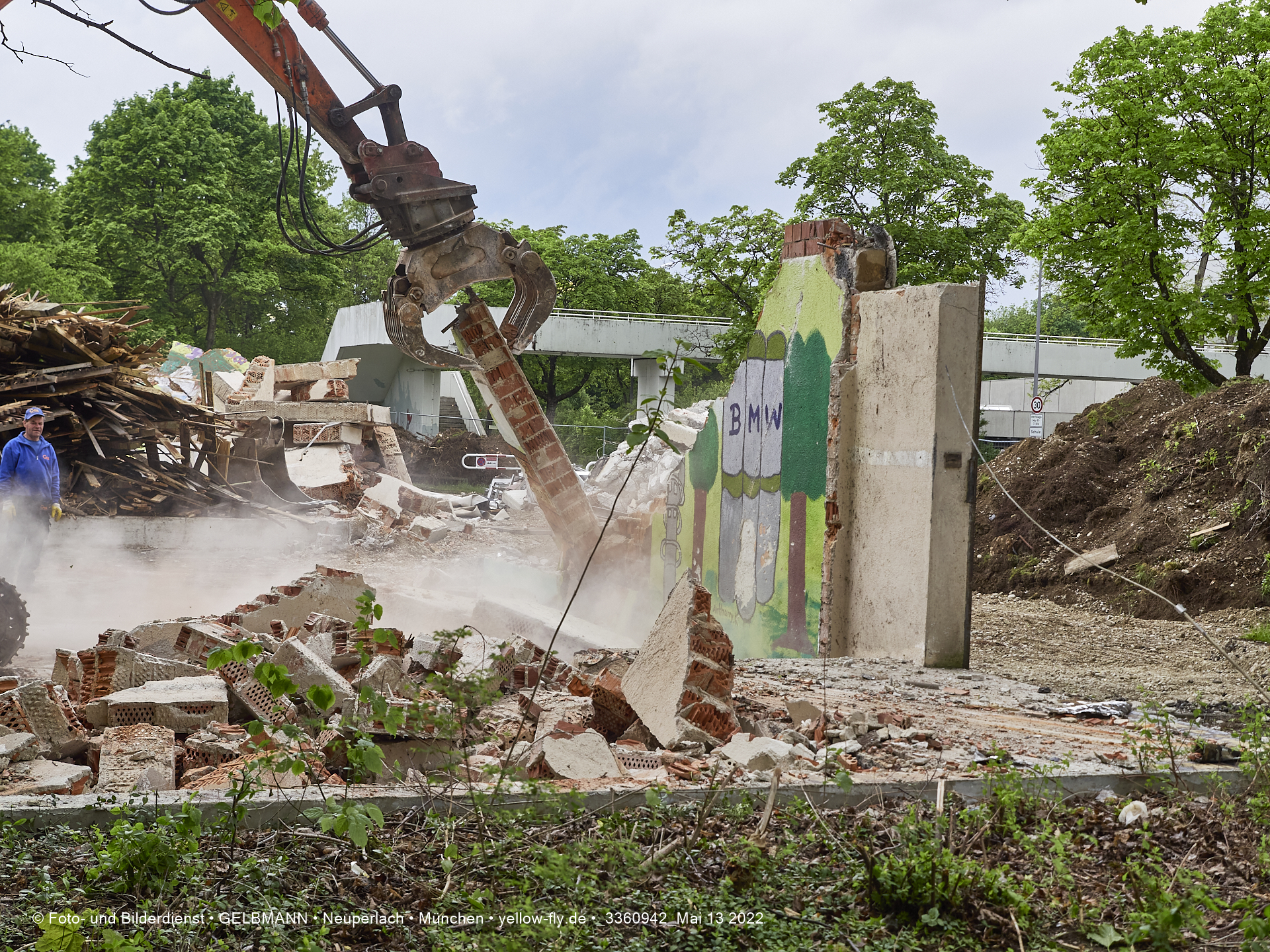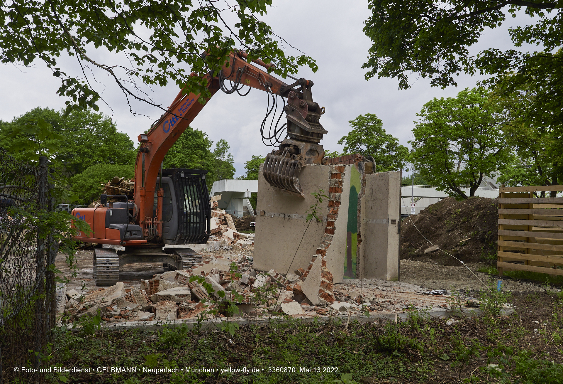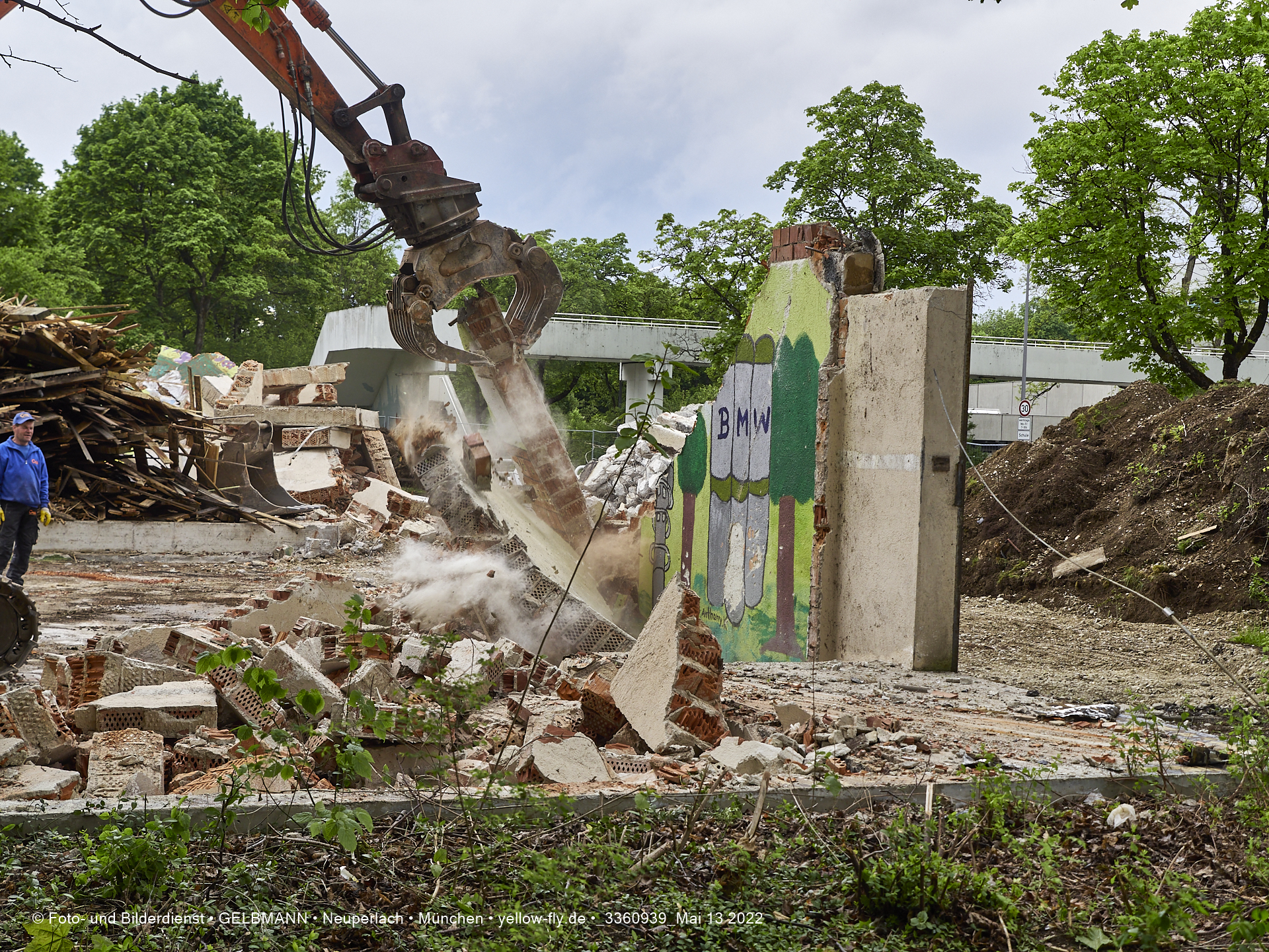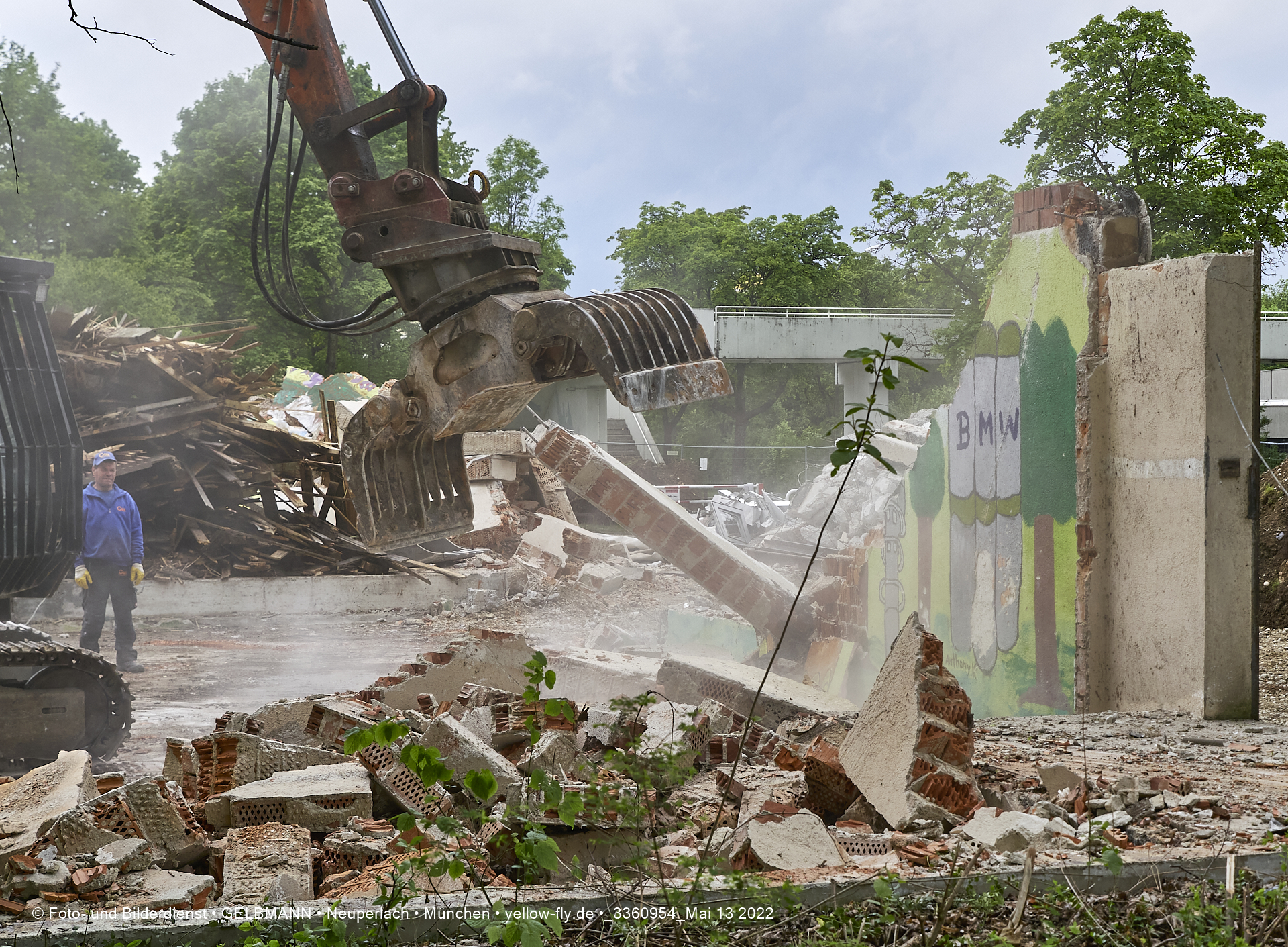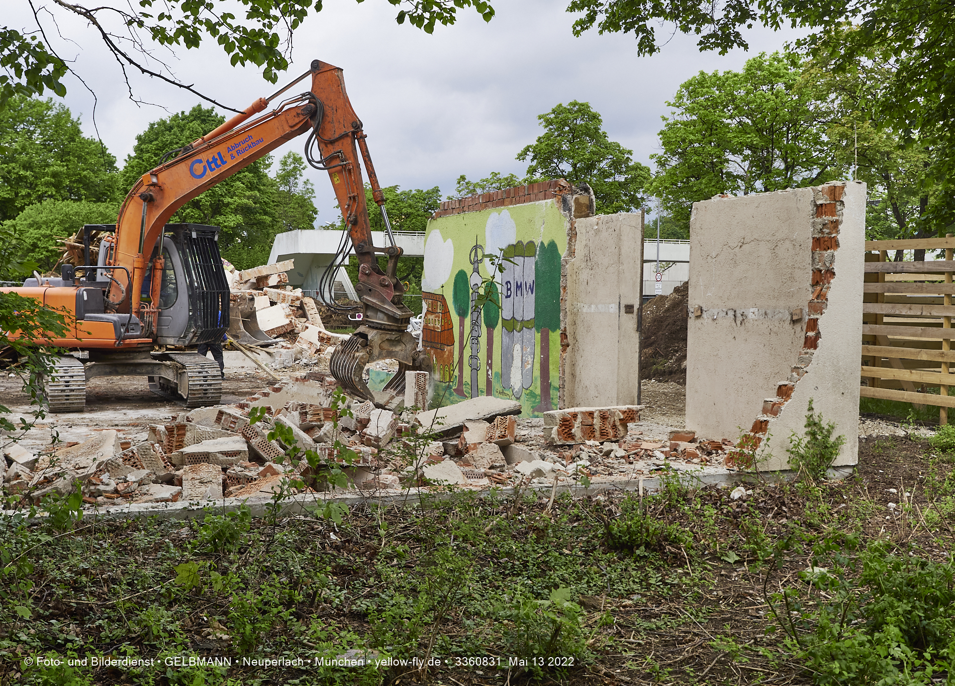 Heute am 13.05.2022 wird die letzte Mauer des ehemaligen Gebäudes der Mütterberatung in Neuperlach, Quiddestraße 1, eingerissen. Die mit einem schönen Graffiti vertierte Mauer versucht zuerst, sich zur Wehr zu setzte. Gegen den Bagger hat sie aber keine Chance.