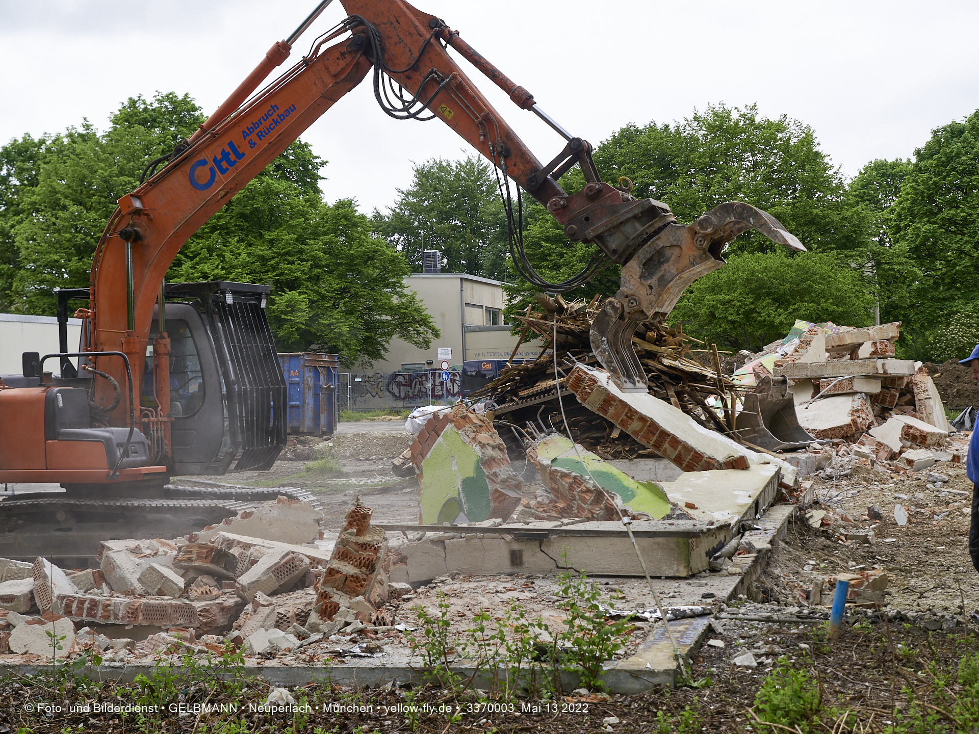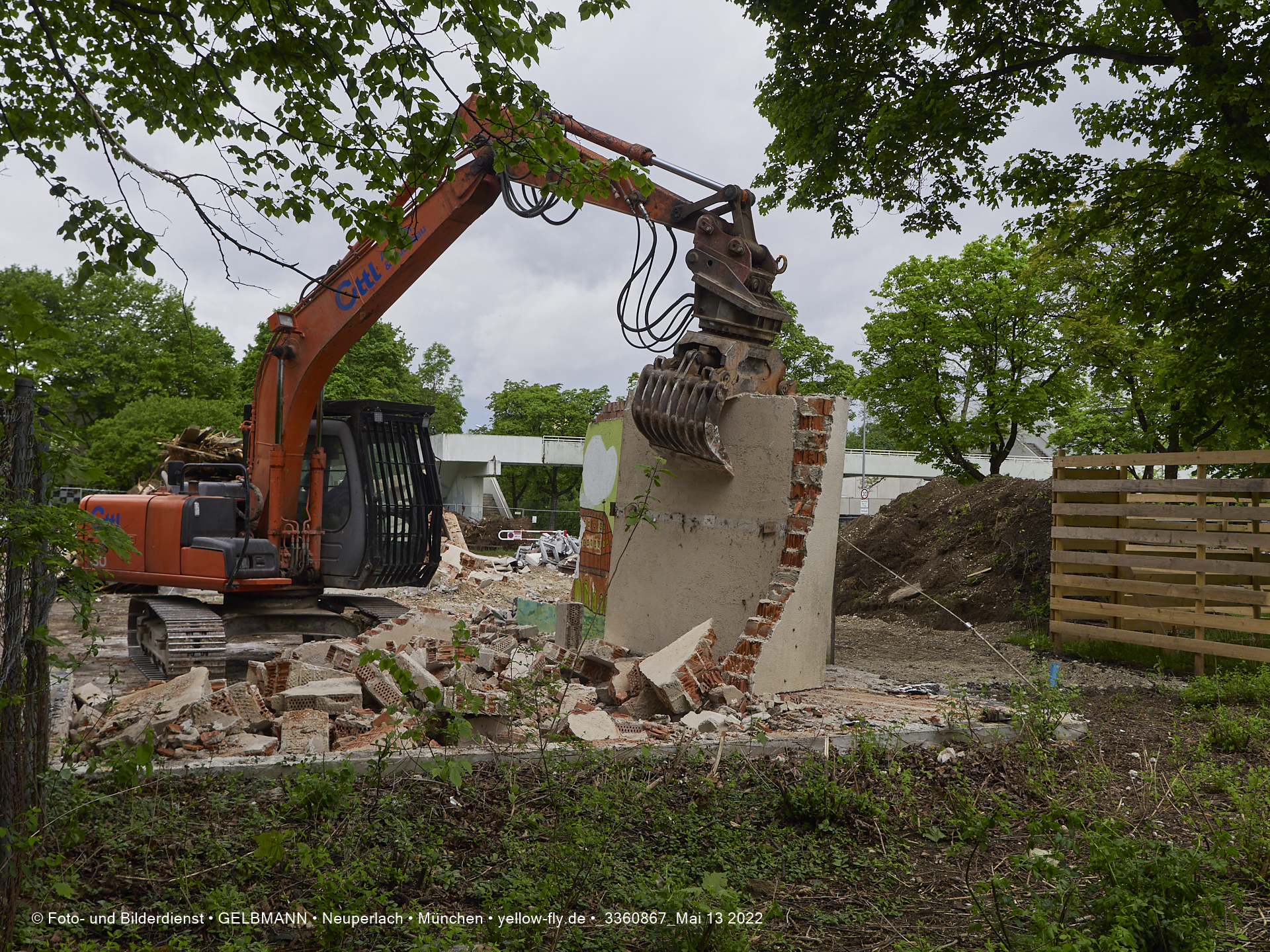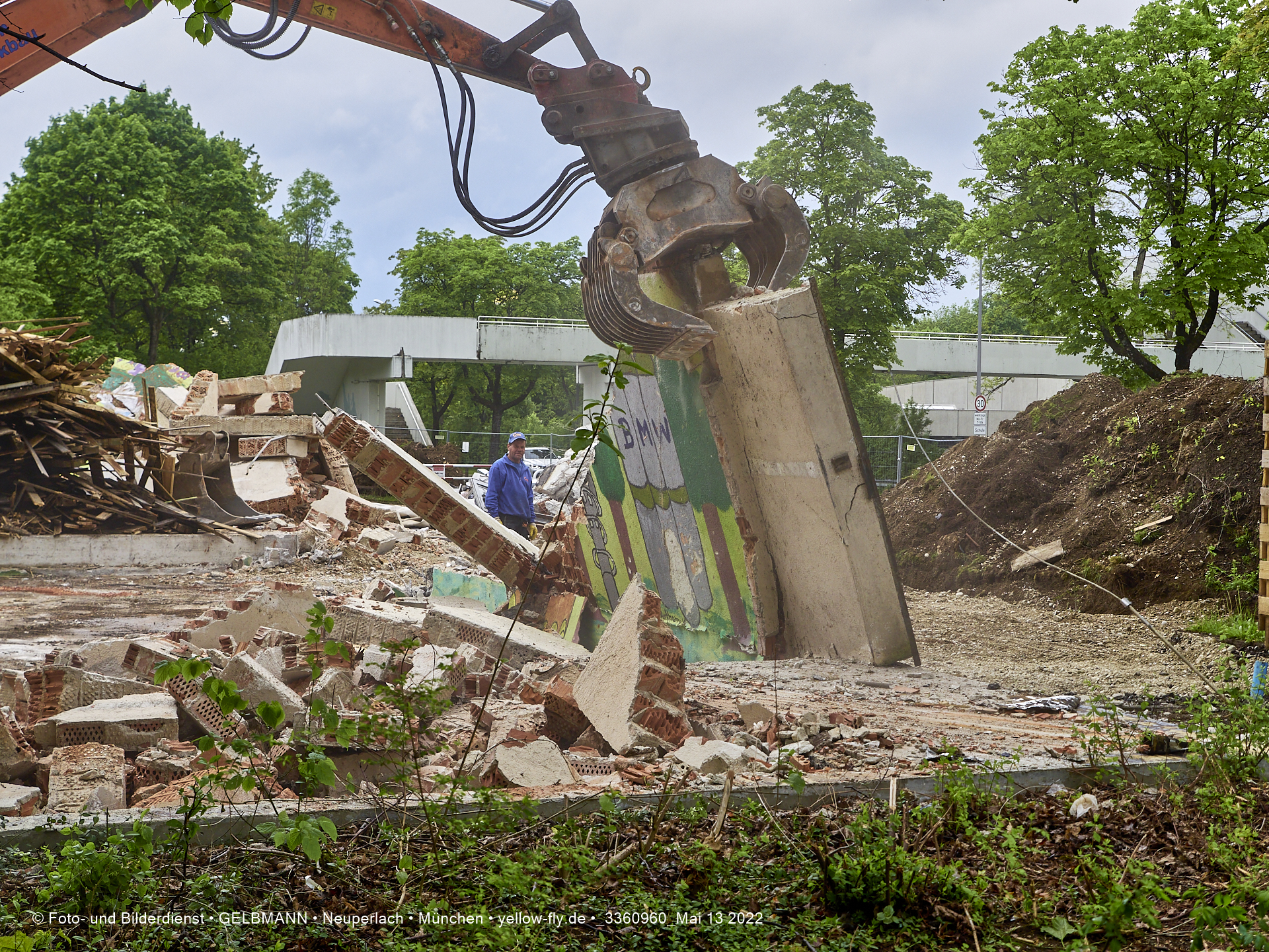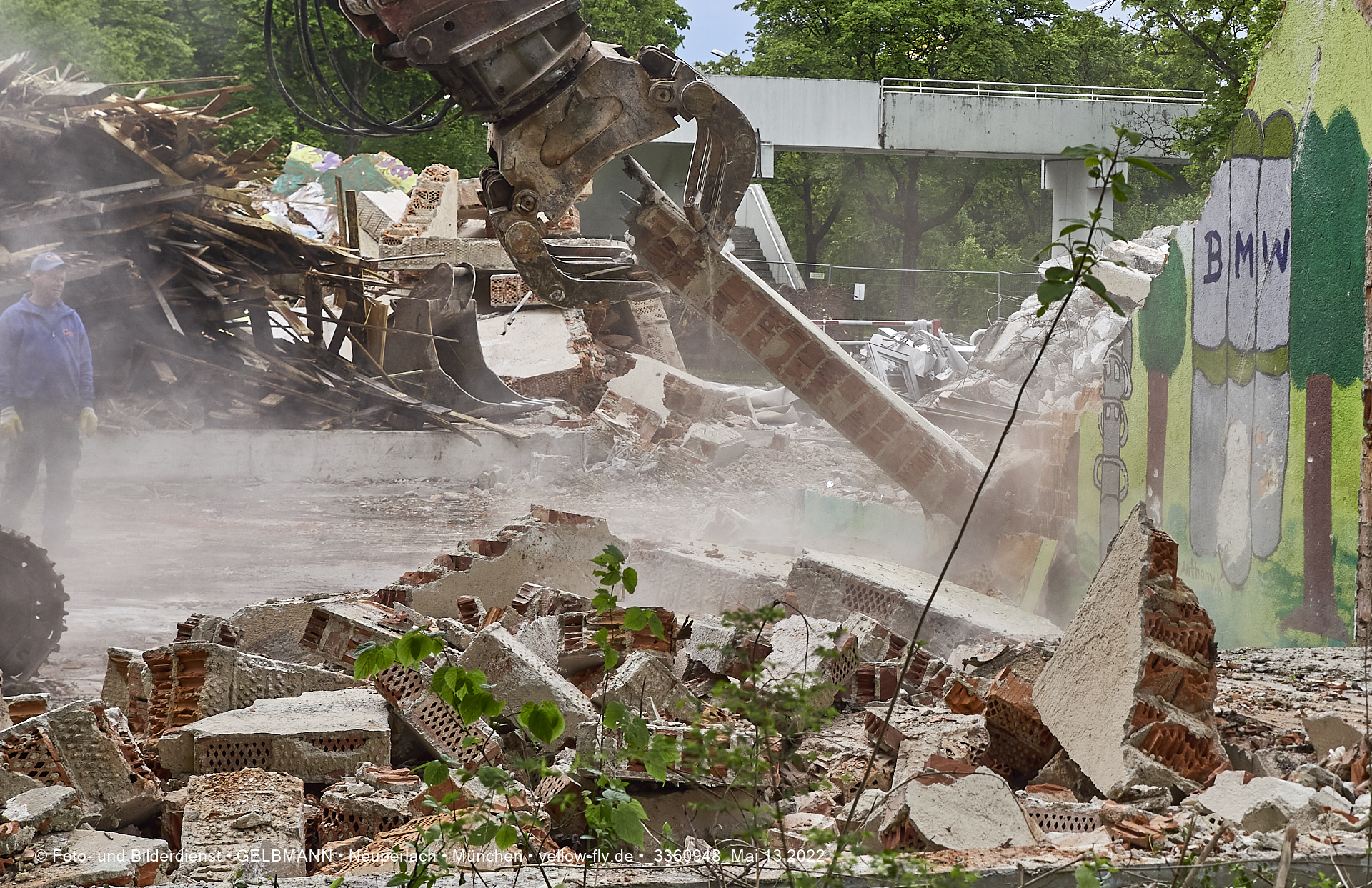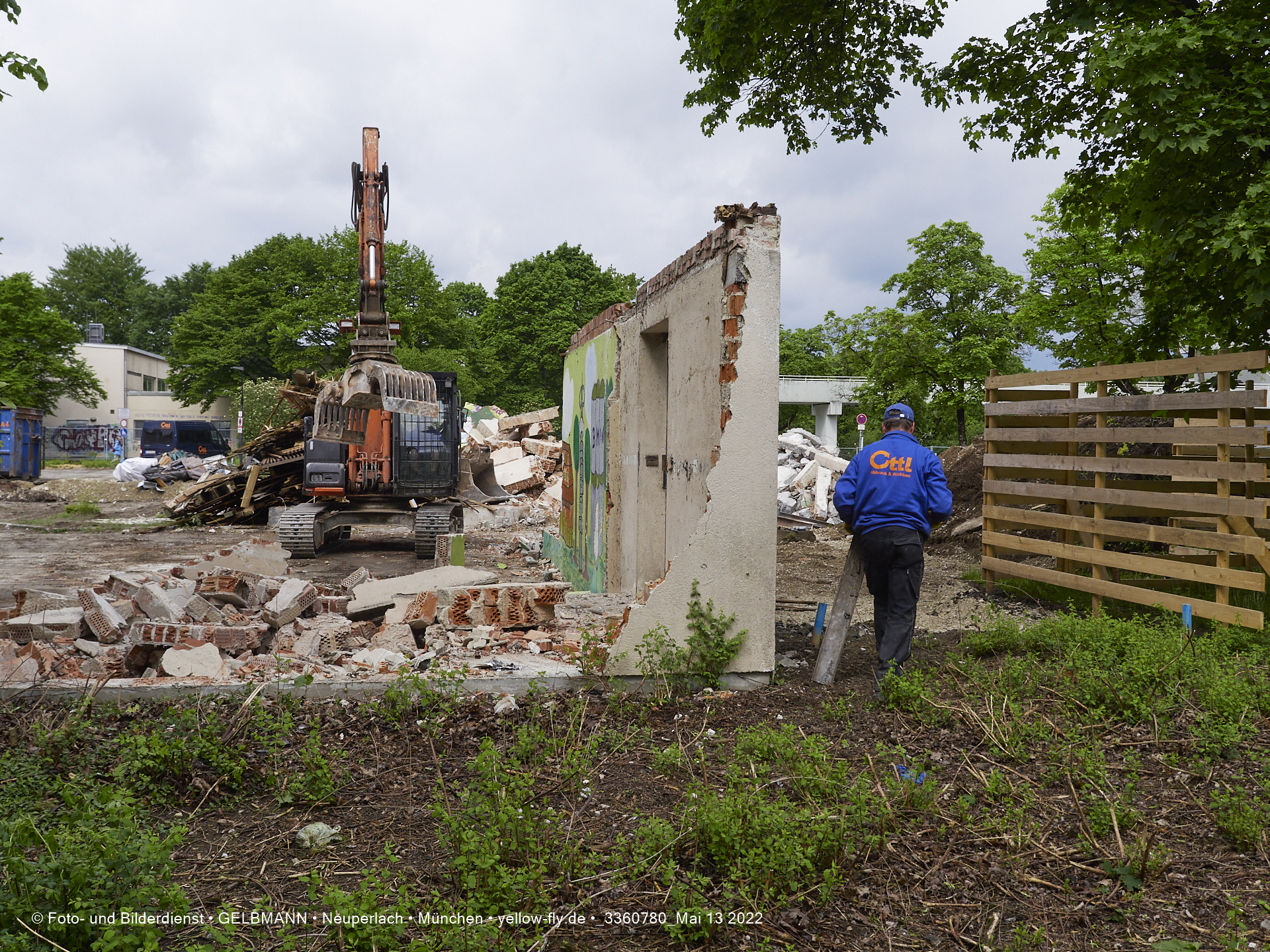 Heute am 13.05.2022 wird die letzte Mauer des ehemaligen Gebäudes der Mütterberatung in Neuperlach, Quiddestraße 1, eingerissen. Die mit einem schönen Graffiti vertierte Mauer versucht zuerst, sich zur Wehr zu setzte. Gegen den Bagger hat sie aber keine Chance.