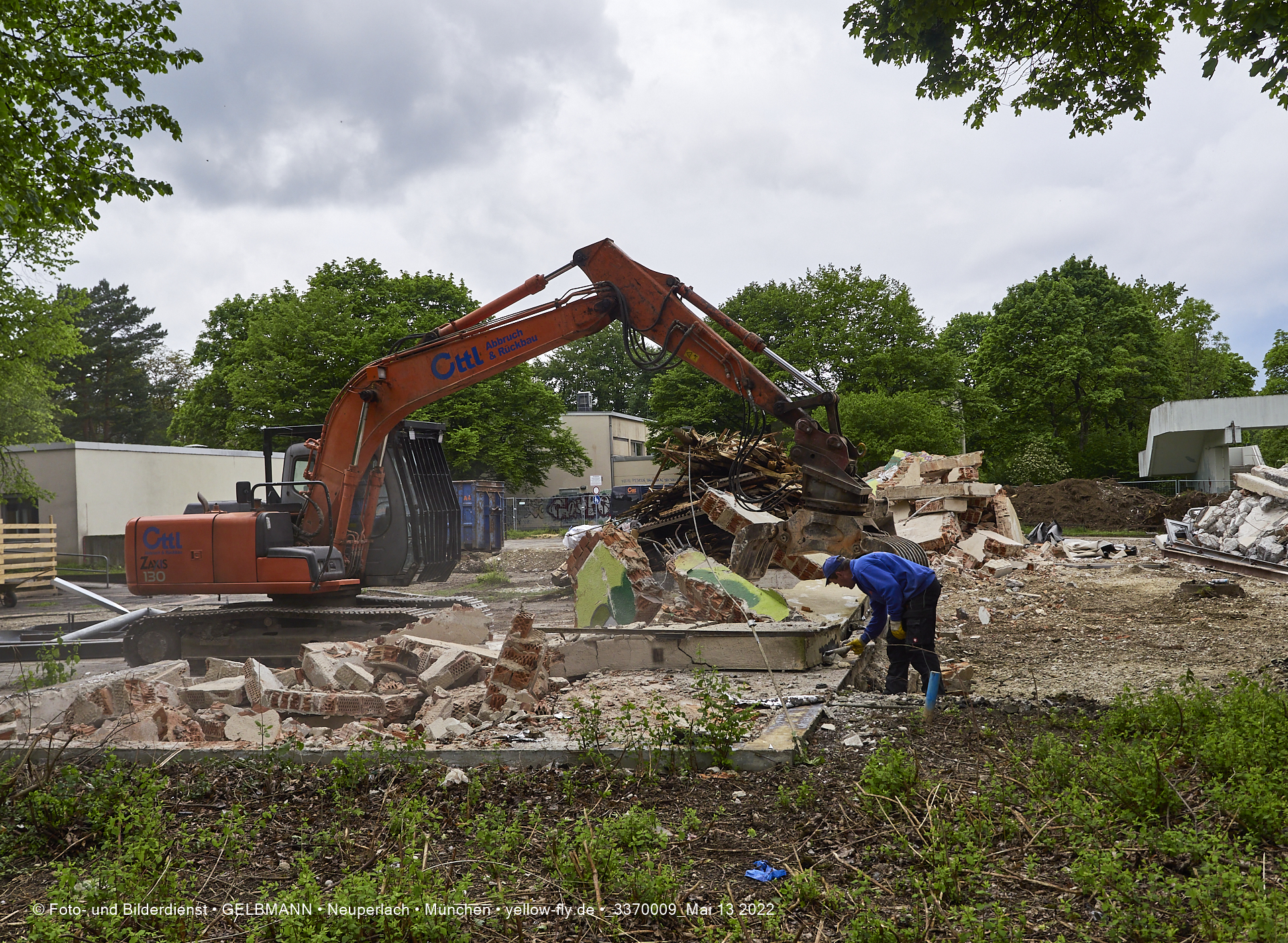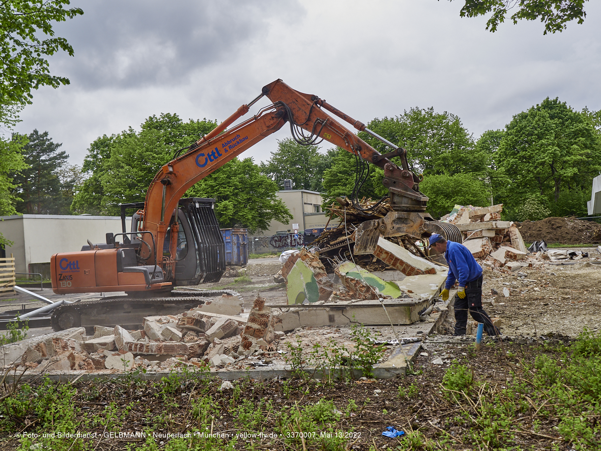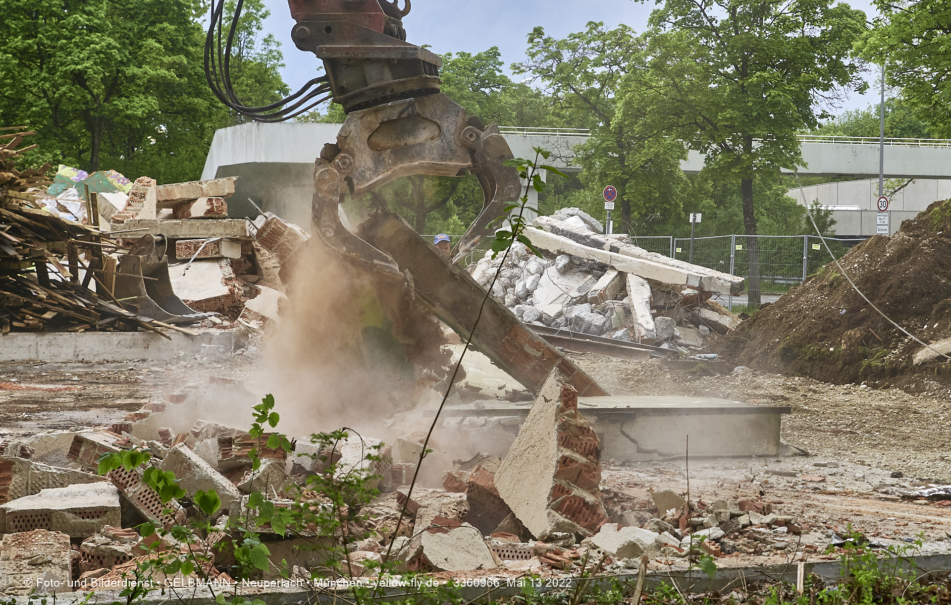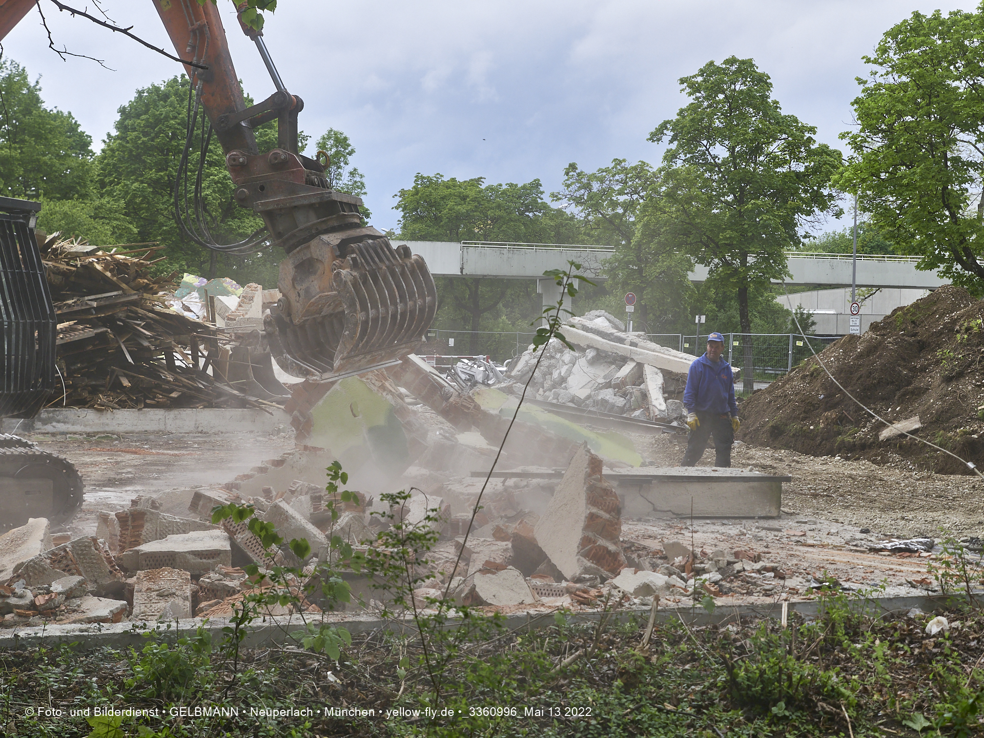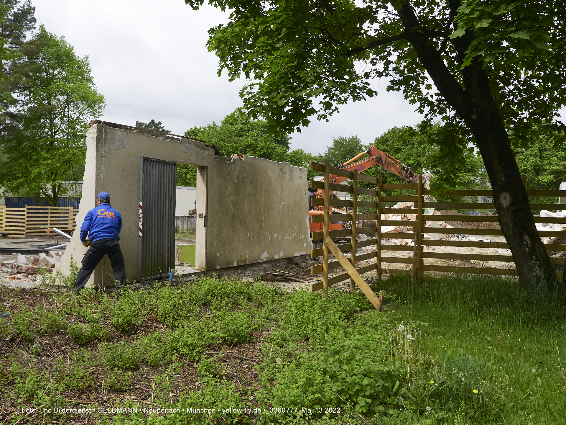 Heute am 13.05.2022 wird die letzte Mauer des ehemaligen Gebäudes der Mütterberatung in Neuperlach, Quiddestraße 1, eingerissen. Die mit einem schönen Graffiti vertierte Mauer versucht zuerst, sich zur Wehr zu setzte. Gegen den Bagger hat sie aber keine Chance.