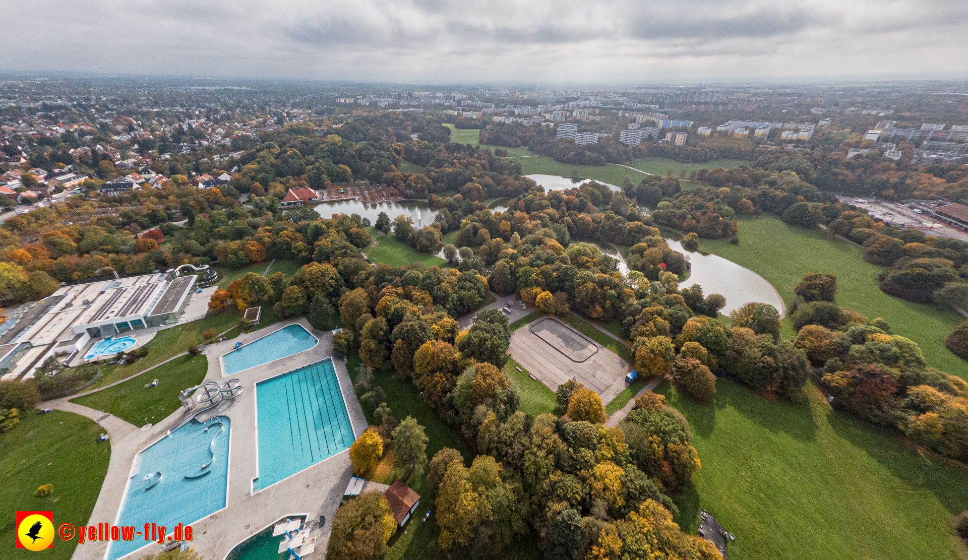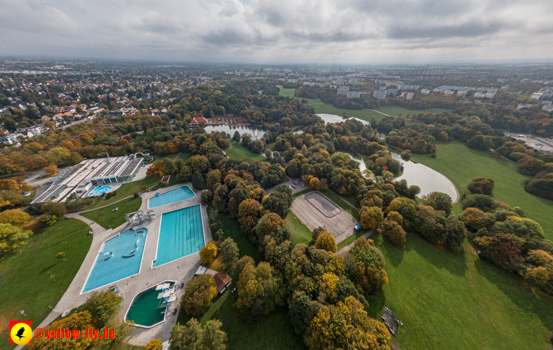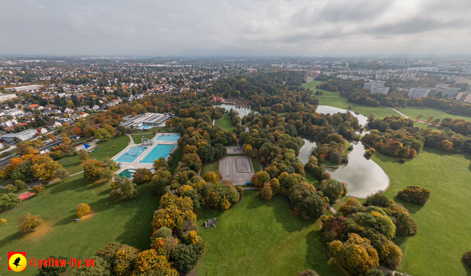 Kein Gedränge mehr am Pool. Jetzt hat man, hätte man, genügend Platz im Michaelibad in Neuperlach. Bei leicht diesigem Wetter versuche ich noch einige gelbe Bäume einzufangen. Bei nächsten Regen oder Sturm ist diese Blätterpracht verschwunden. Der Ostparksee und der Biergarten im Hintergrund