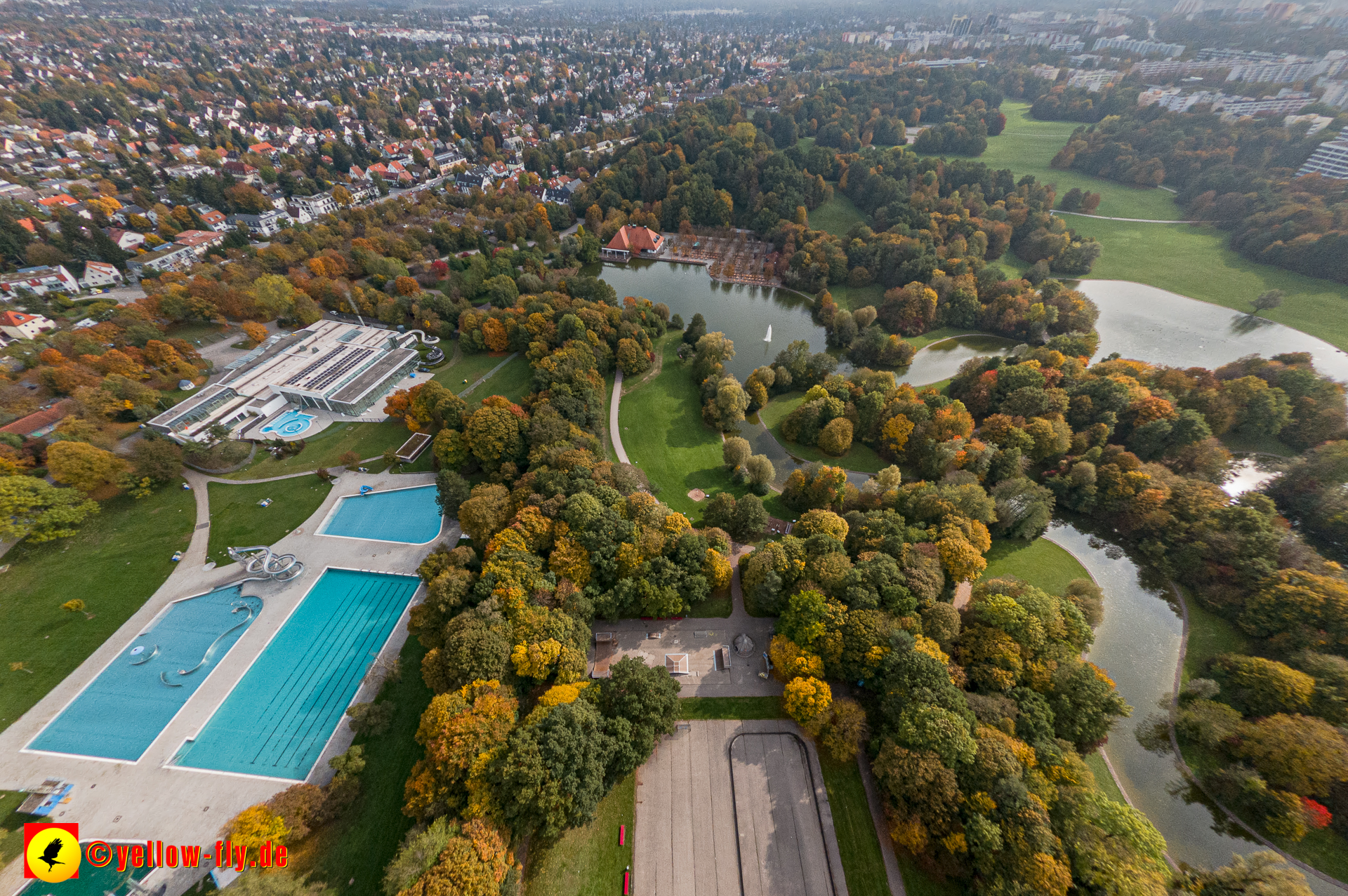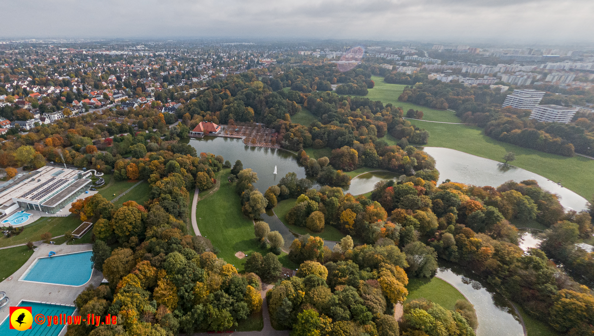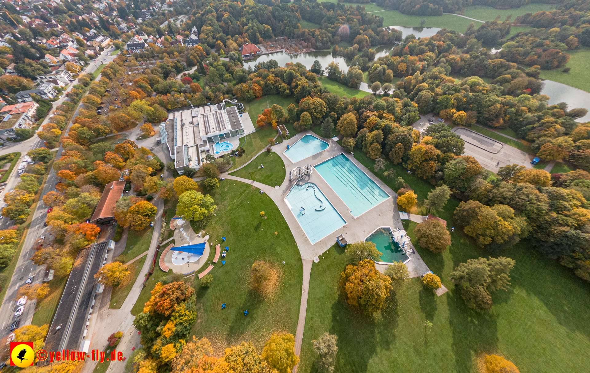 Kein Gedränge mehr am Pool. Jetzt hat man, hätte man, genügend Platz im Michaelibad in Neuperlach. Bei leicht diesigem Wetter versuche ich noch einige gelbe Bäume einzufangen. Bei nächsten Regen oder Sturm ist diese Blätterpracht verschwunden. Der Ostparksee und der Biergarten im Hintergrund