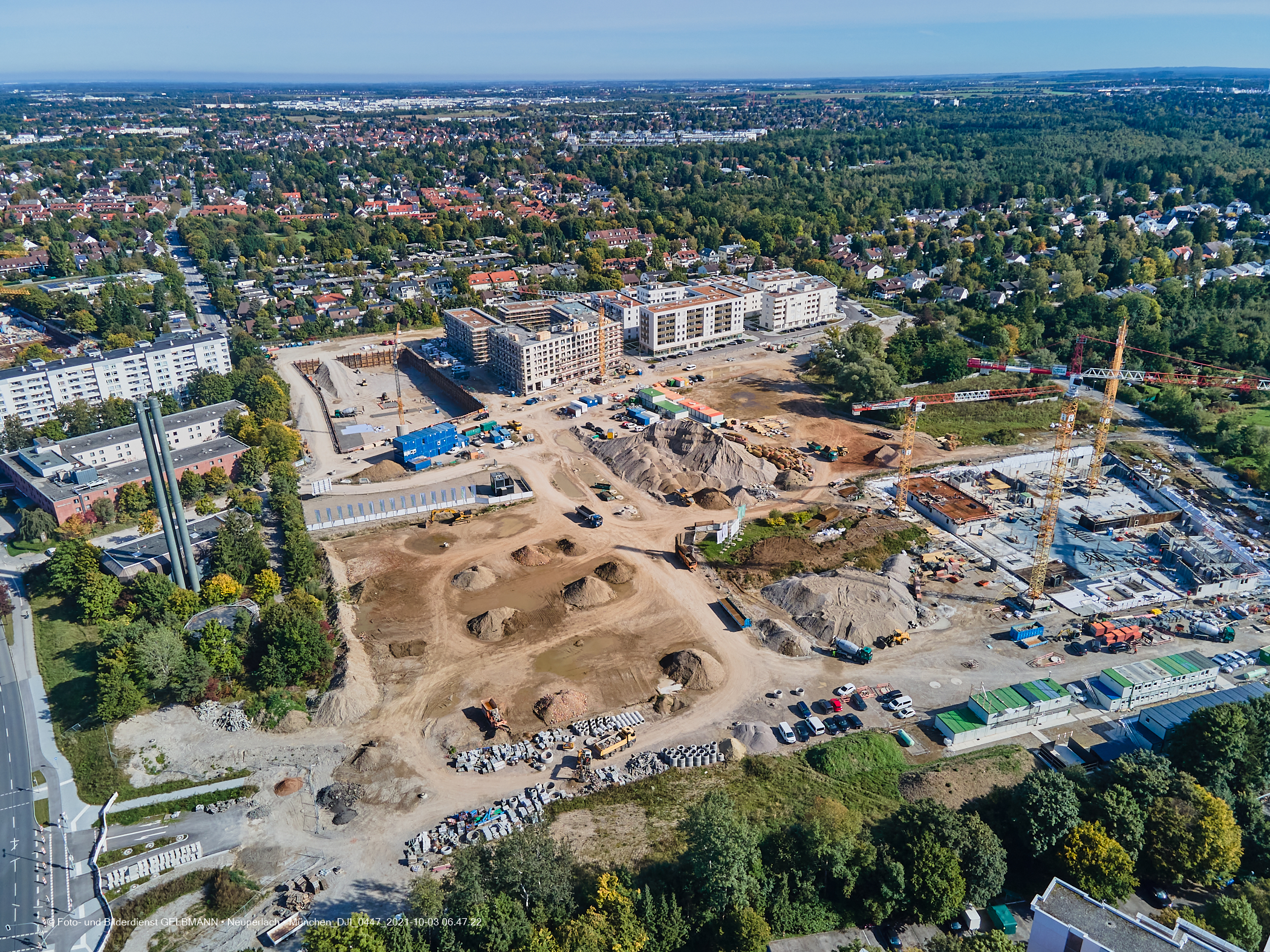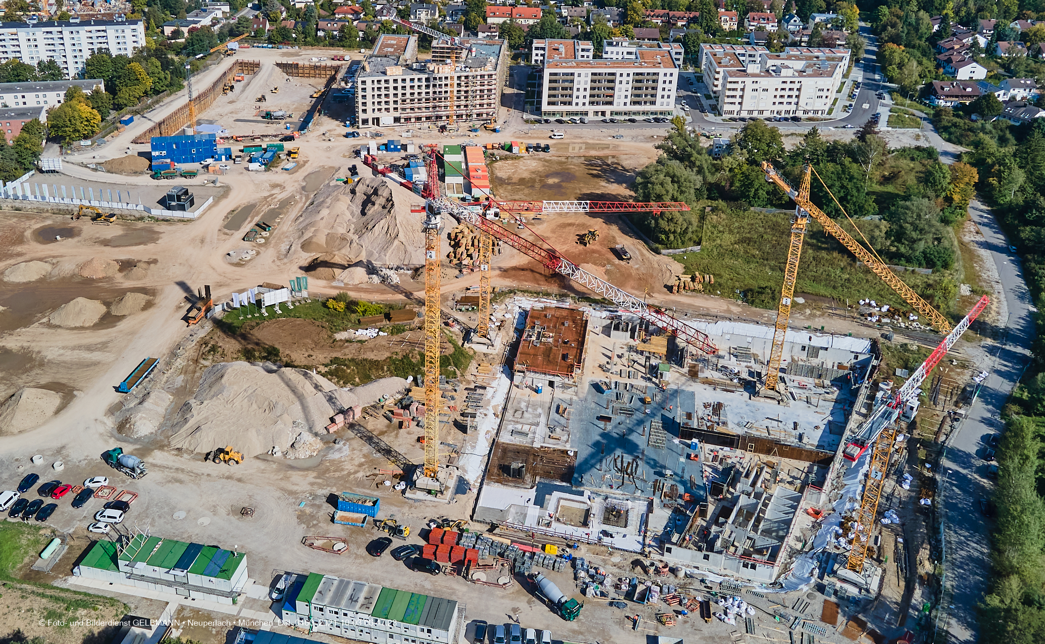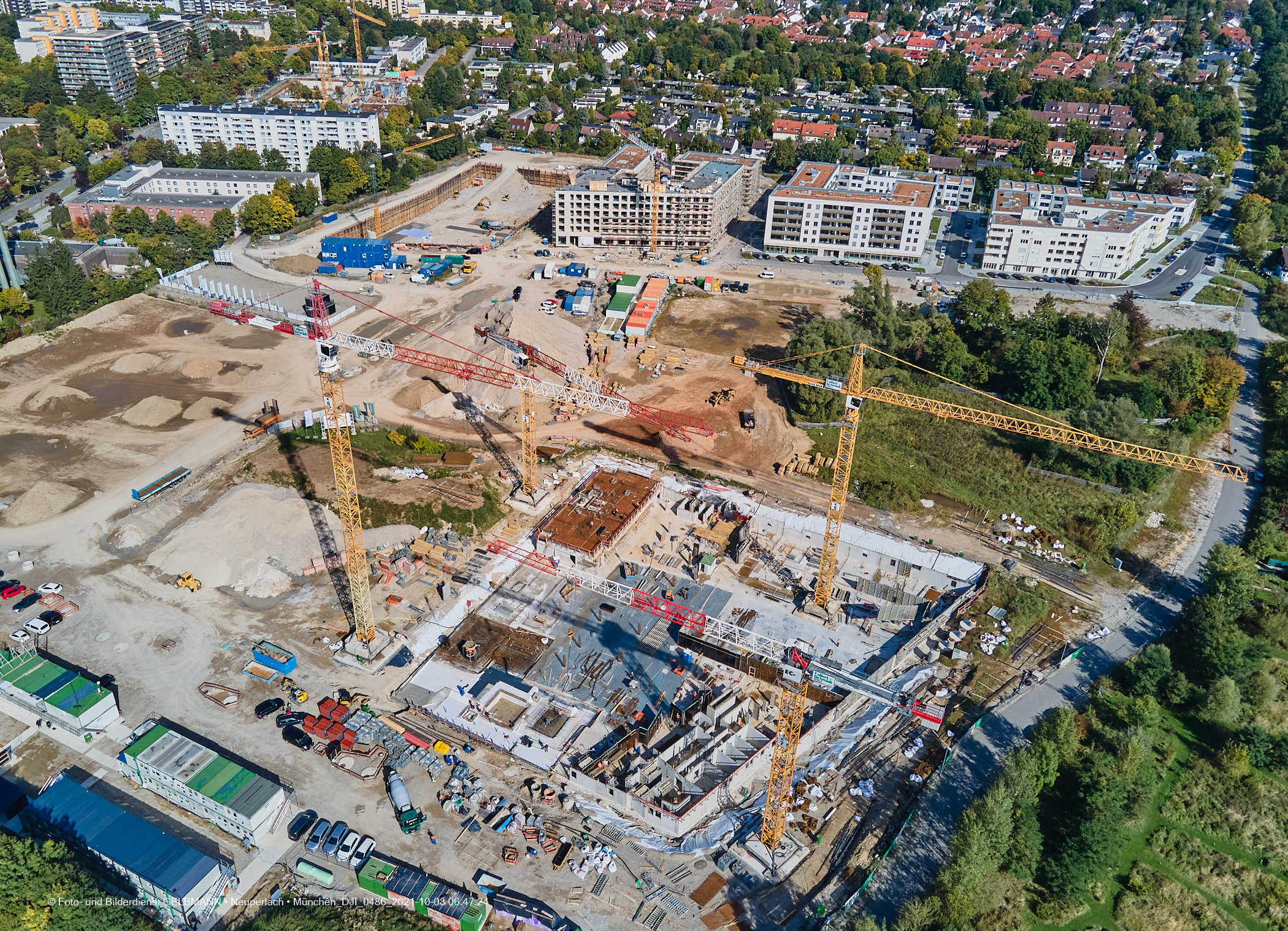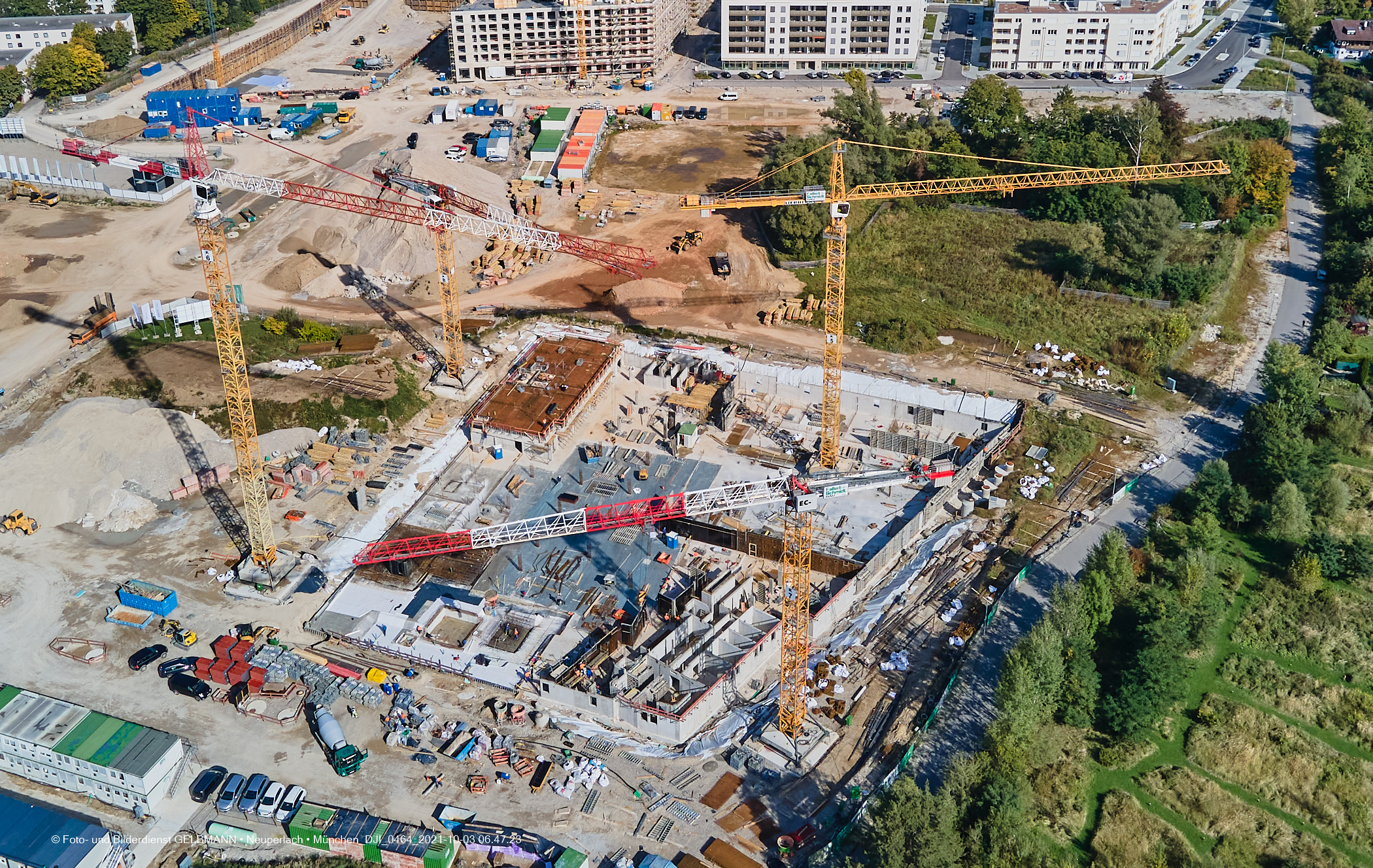 Auf der Baustelle Pandionverde die ersten Wände hochgezogen. So langsam erkennt man, was da entstehen soll. An der Baugrube im Alexisquartier, „Das Duett”, wurde vorerst ein kleiner Kran aufgestellt, der in die Baugrube das notwendie Material gebracht werden kann. Die beiden großen Kräne folgen noch. .
